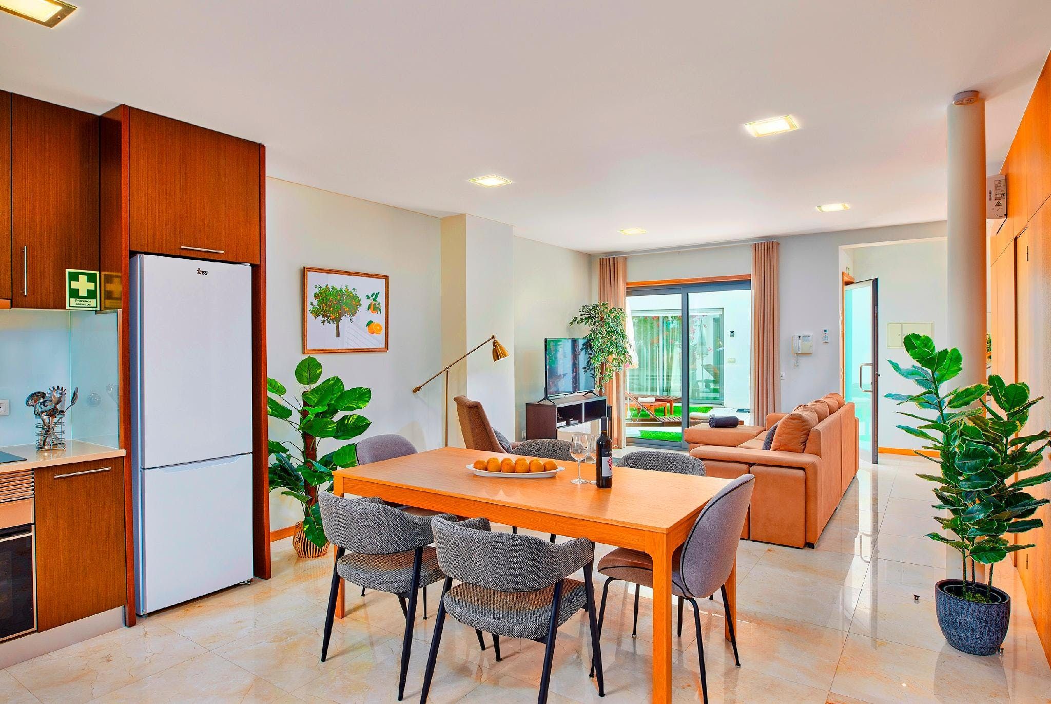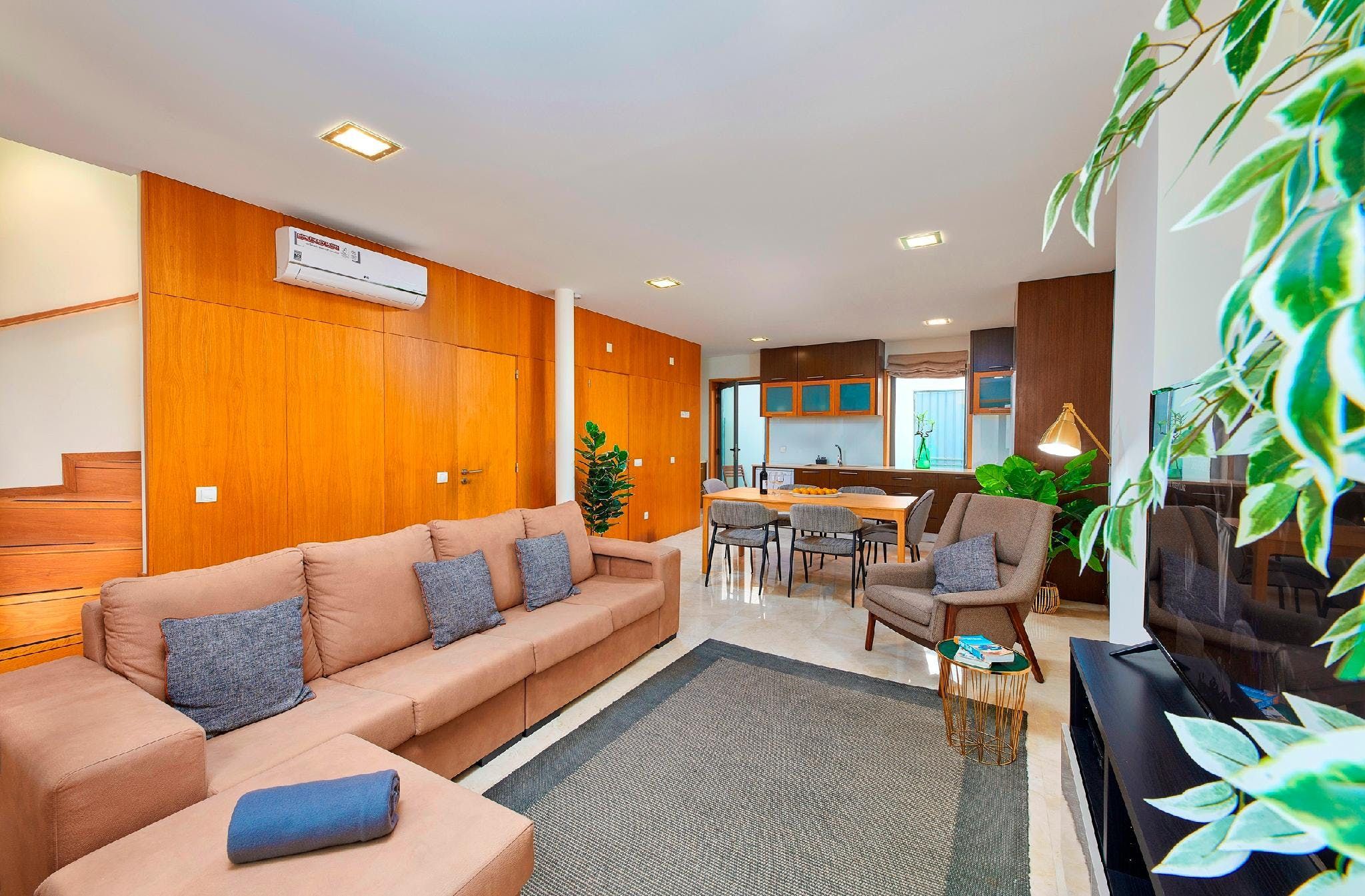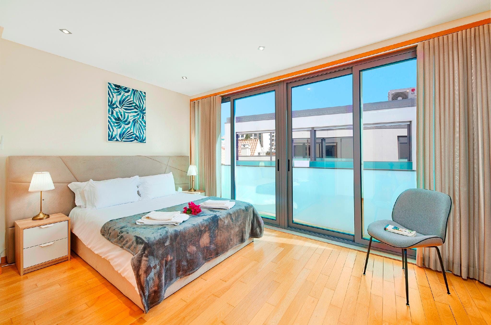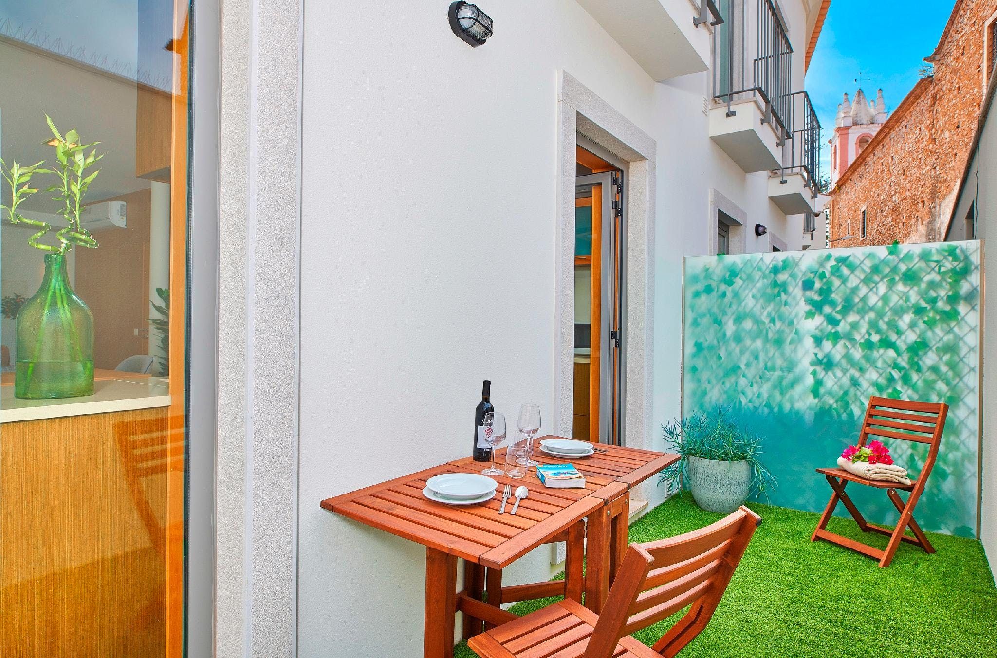 Downstairs, the free-flowing living space leading out onto a charming private courtyard with views of the neighbouring church is made for socialising. Get together for a sunny alfresco breakfast of expressos and Pastel de Natas on the veranda, then pad over to the shared terraces for a dip in that sparkling pool surrounded by tumbling bougainvillaea and fragrant citrus trees.