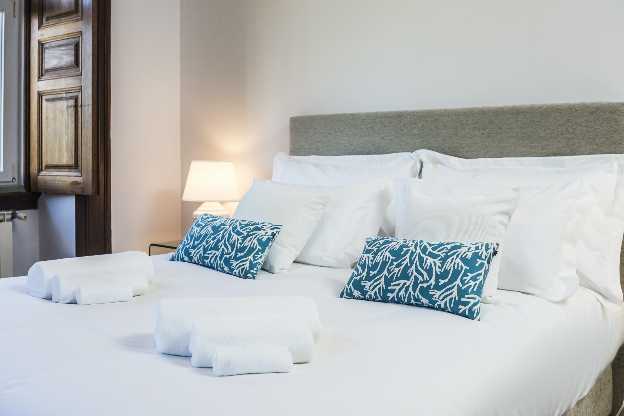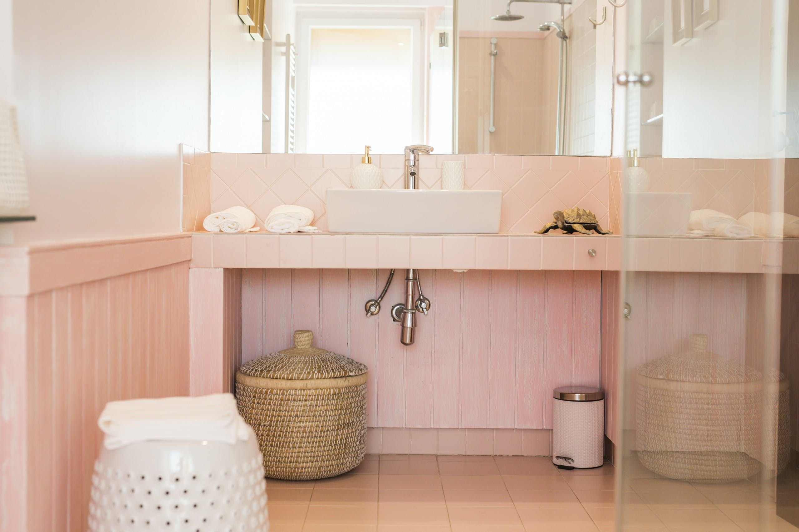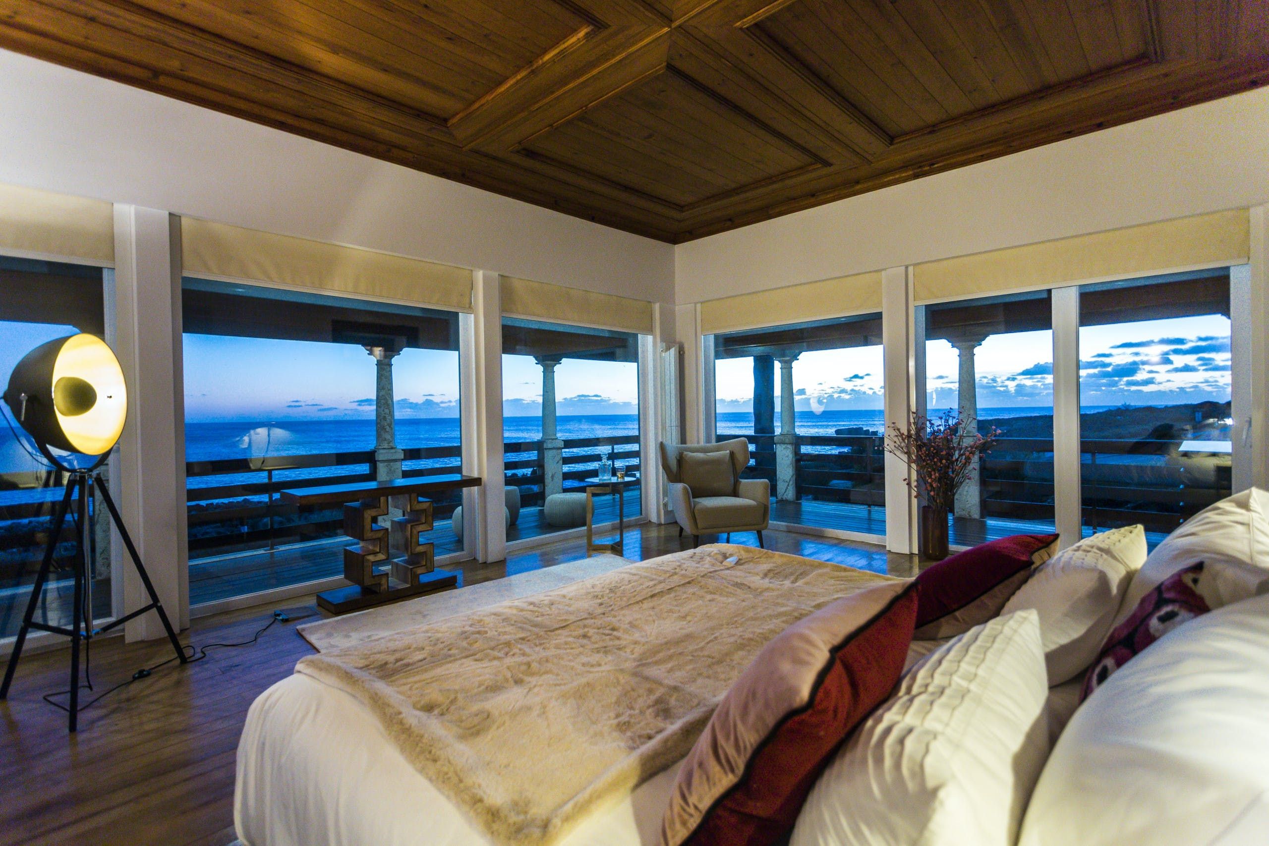 The wraparound balcony boasts grand, pointed archways, stone colonnades and comfy outdoor seating, and is a lavish place to enjoy a glass of champagne or two when the sun sets. The six bedrooms are laid out across the first floor, with one in the converted attic. They have been designed with every comfort in mind, and five come with an en suite – we love the Wes Anderson worthy pink and mustard bathrooms. The main bedroom is the jewel in the crown of this home. With its wraparound glass windows, you’ll wake up every morning to panoramic views of the ocean. Step out onto the balcony first thing and you will feel all is right with the world.