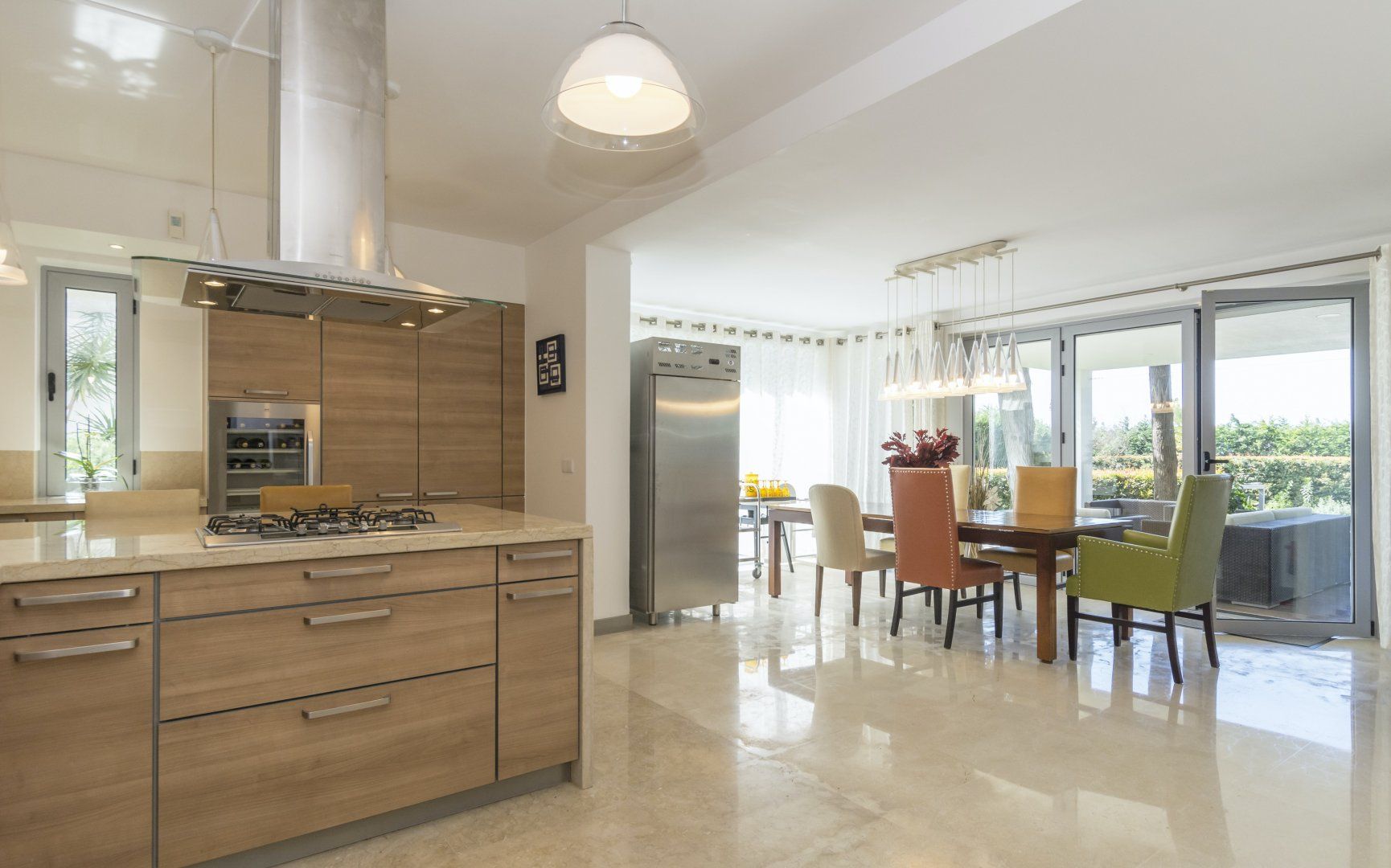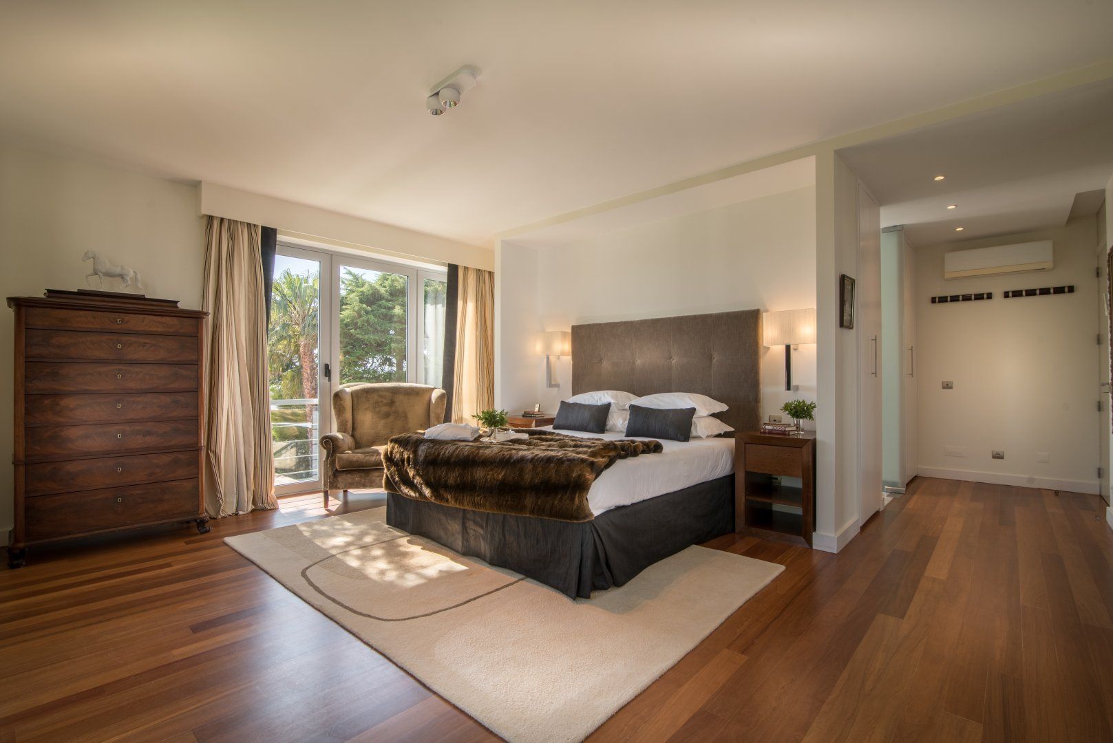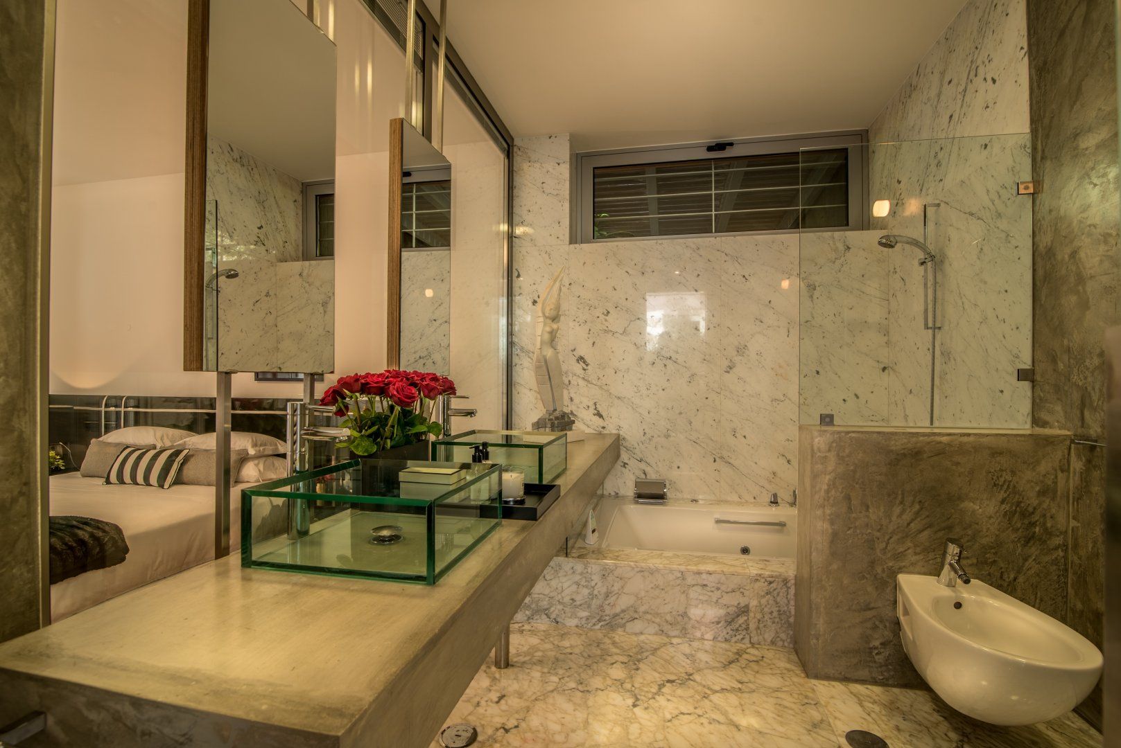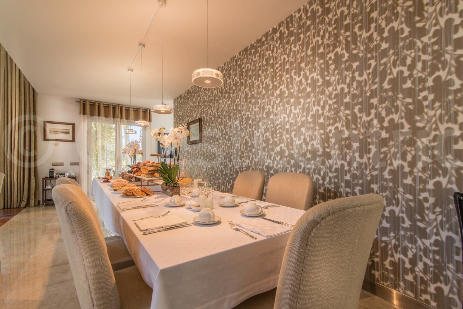 The cutting angles of this modern villa are softened on all sides by lush botanical foliage filling the grounds. A covered terrace set with a cluster of dining tables is illuminated by huge Moroccan lamps at twilight and boasts a built-in barbecue of steel and concrete. Sofas and loungers are strewn across the immaculate lawn, and you can choose to soak up the sun, or lounge in the shade of the pool terrace after a dip in the cooling turquoise water.