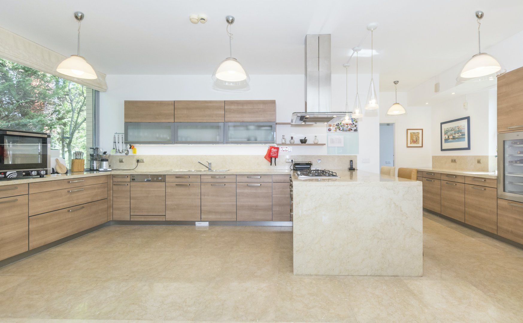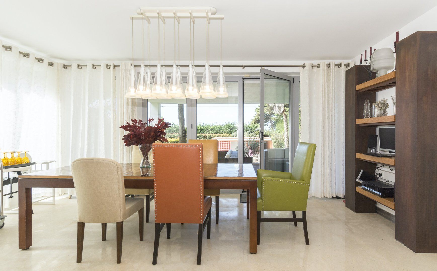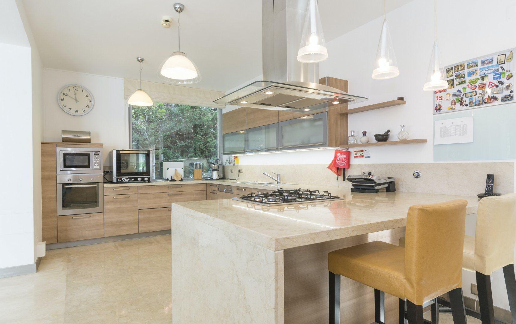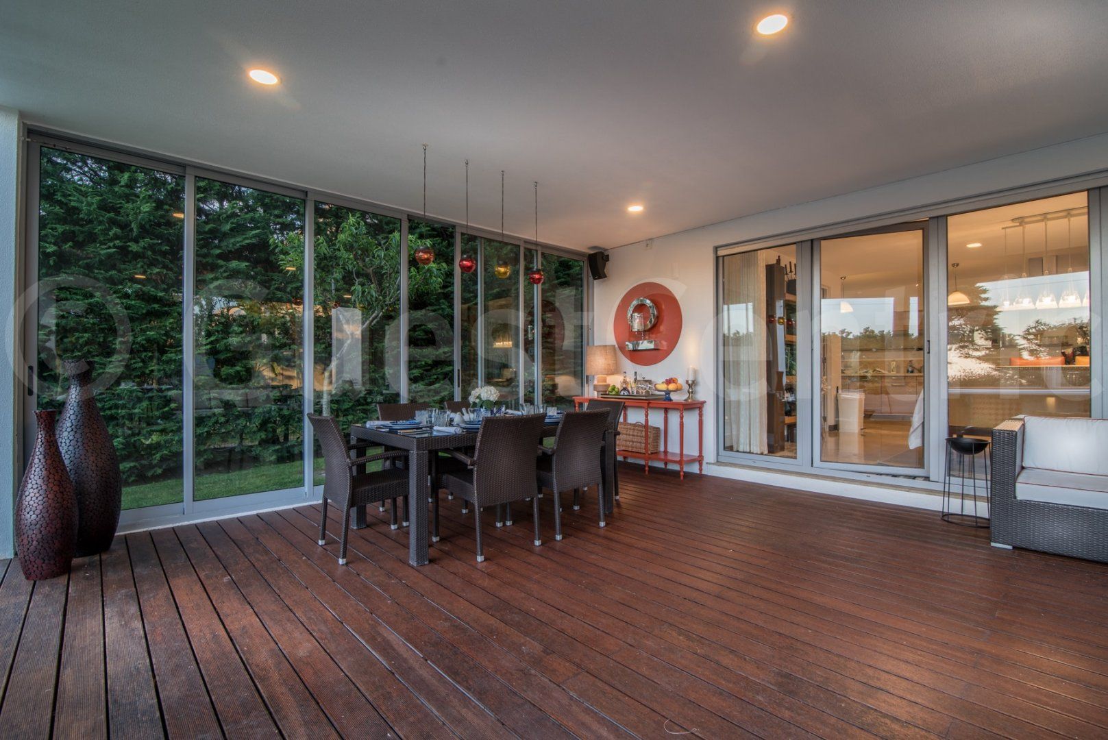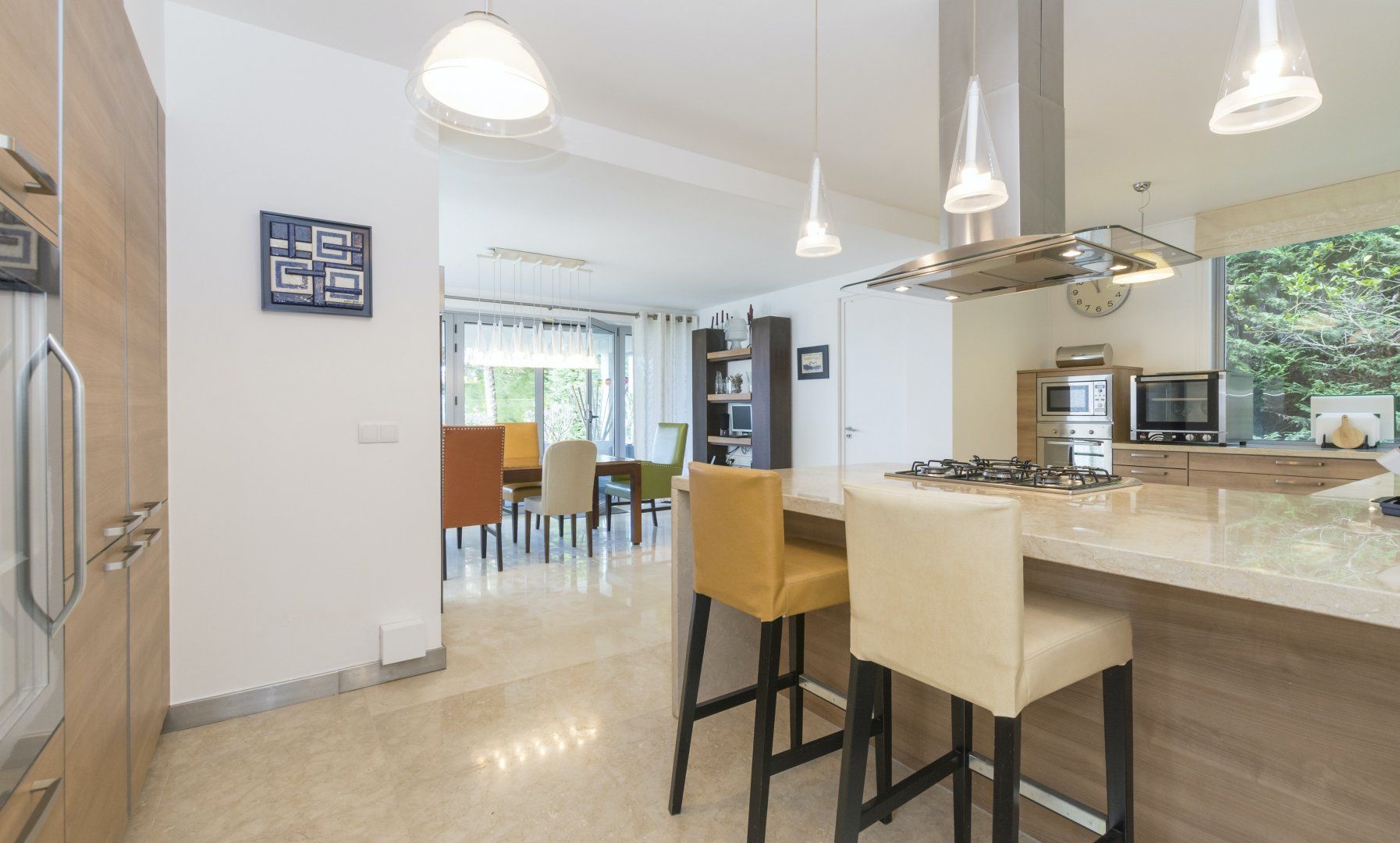 The cutting angles of this modern villa are softened on all sides by lush botanical foliage filling the grounds. A covered terrace set with a cluster of dining tables is illuminated by huge Moroccan lamps at twilight and boasts a built-in barbecue of steel and concrete. Sofas and loungers are strewn across the immaculate lawn, and you can choose to soak up the sun, or lounge in the shade of the pool terrace after a dip in the cooling turquoise water.