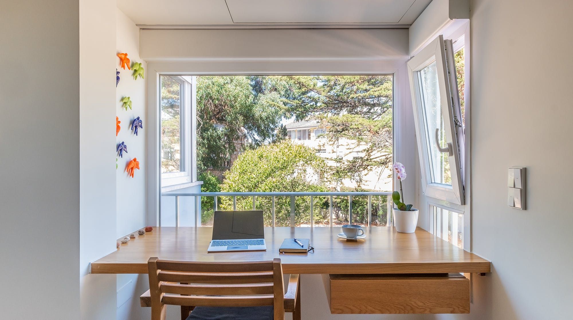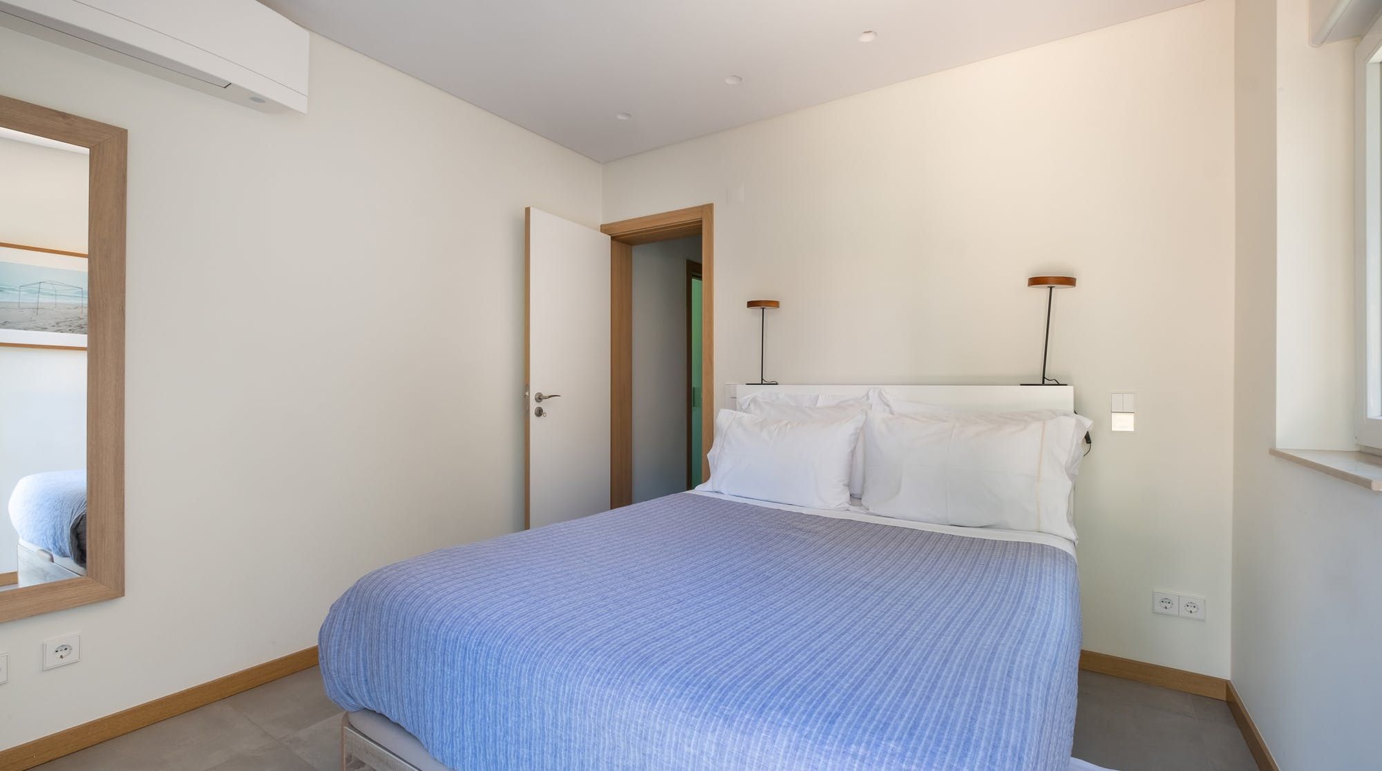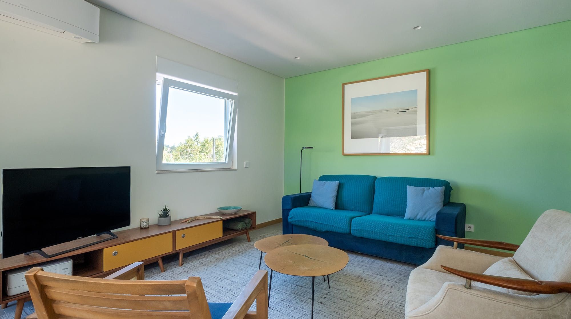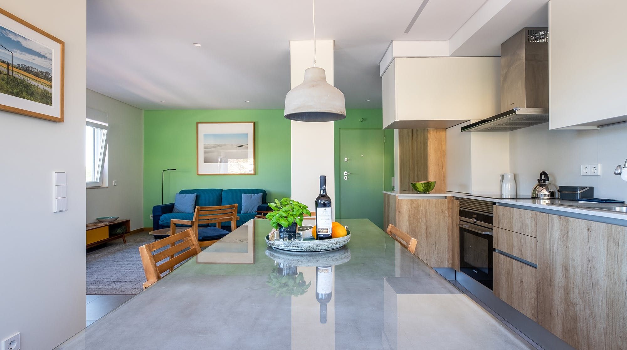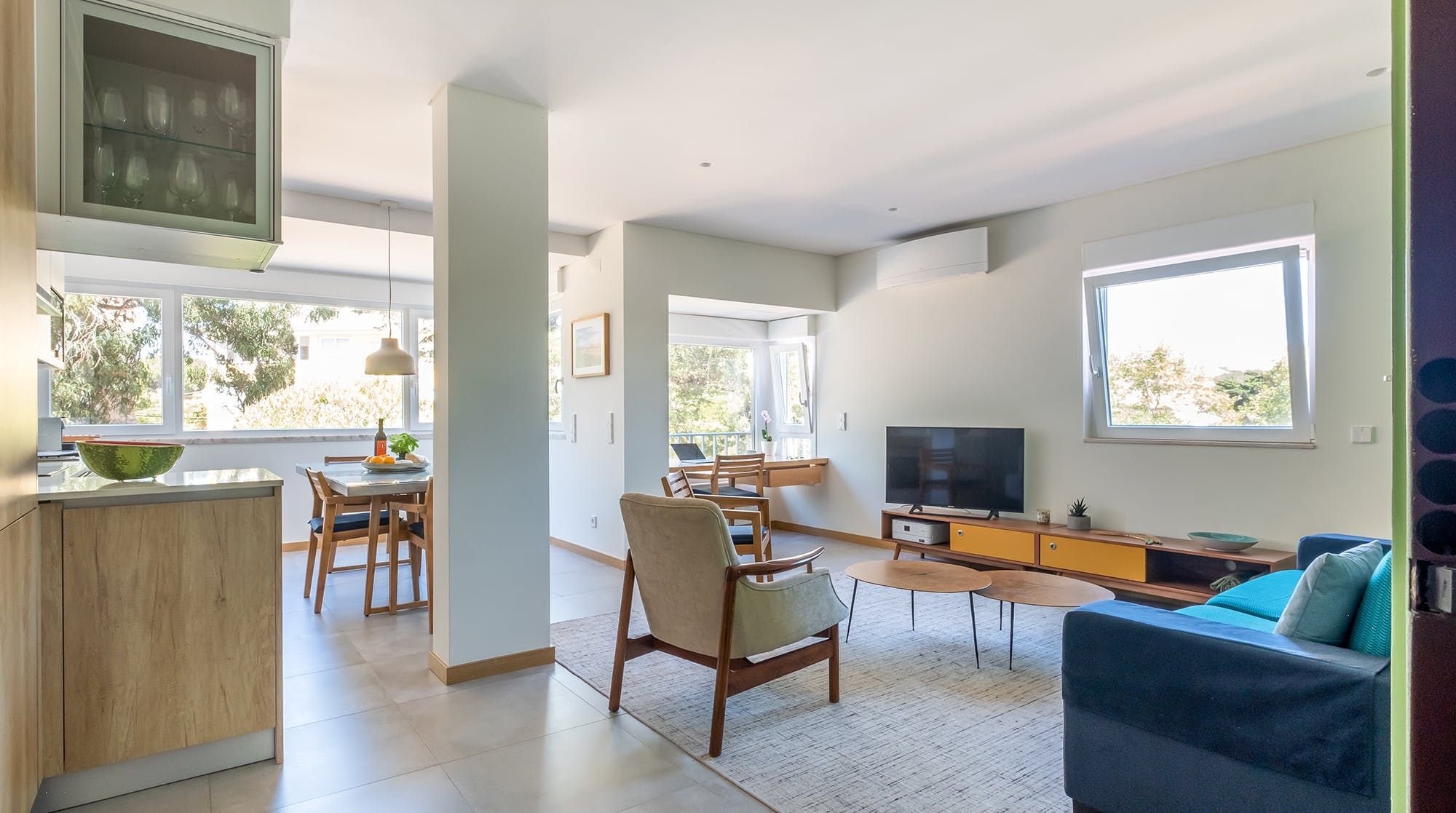 It’s the little details that set this home apart from the rest – the wine fridge in the kitchen to keep your vinho verde’s crisp and cool, the bespoke desk in the window for working remotely, and hand-picked utensils and crockery in the kitchen. True to Portuguese tradition, the kitchen is a bright spot, thanks to corner windows looking out over the tree-filled shared garden. Open-plan, the living room is equally as bright and sunny during the day.