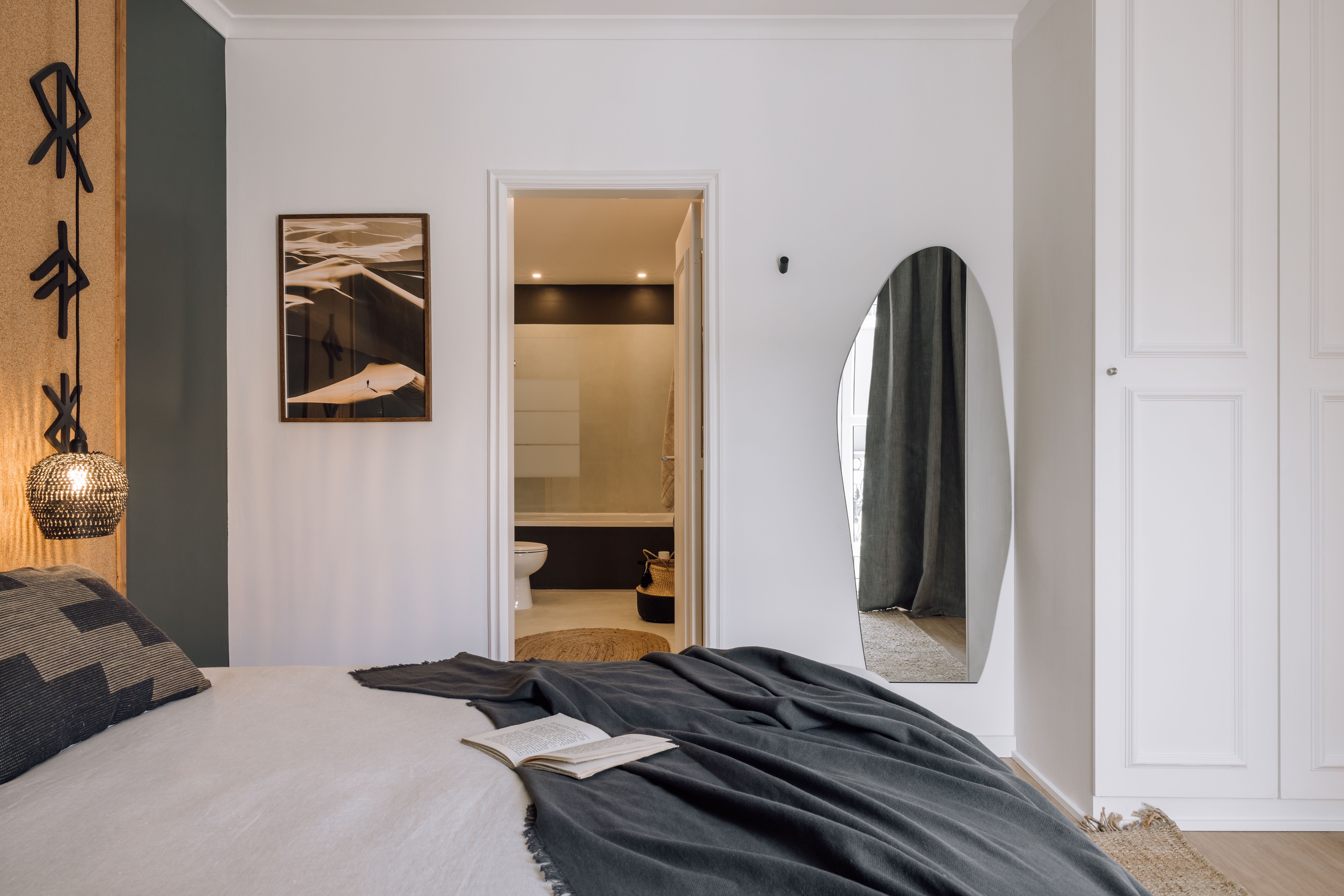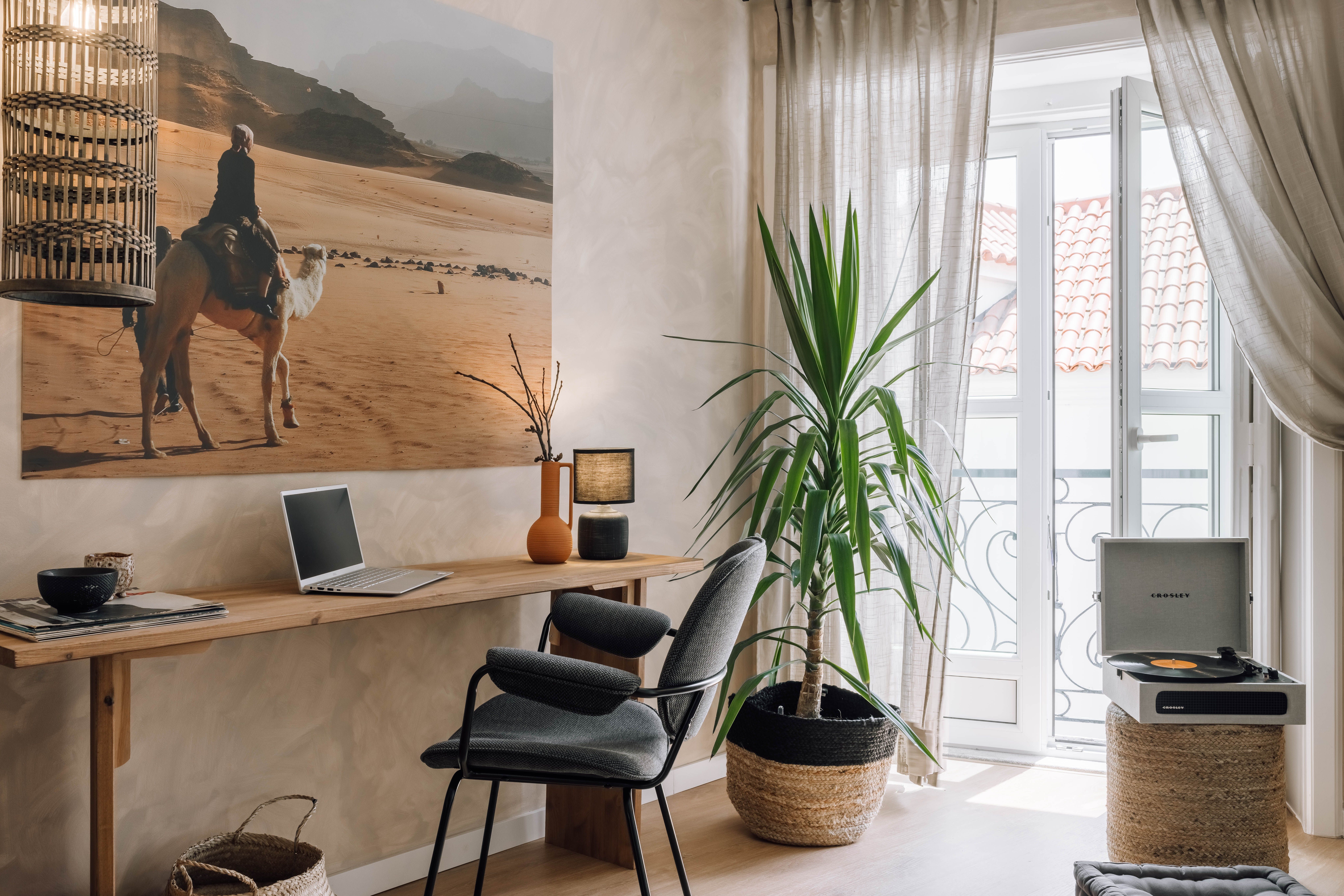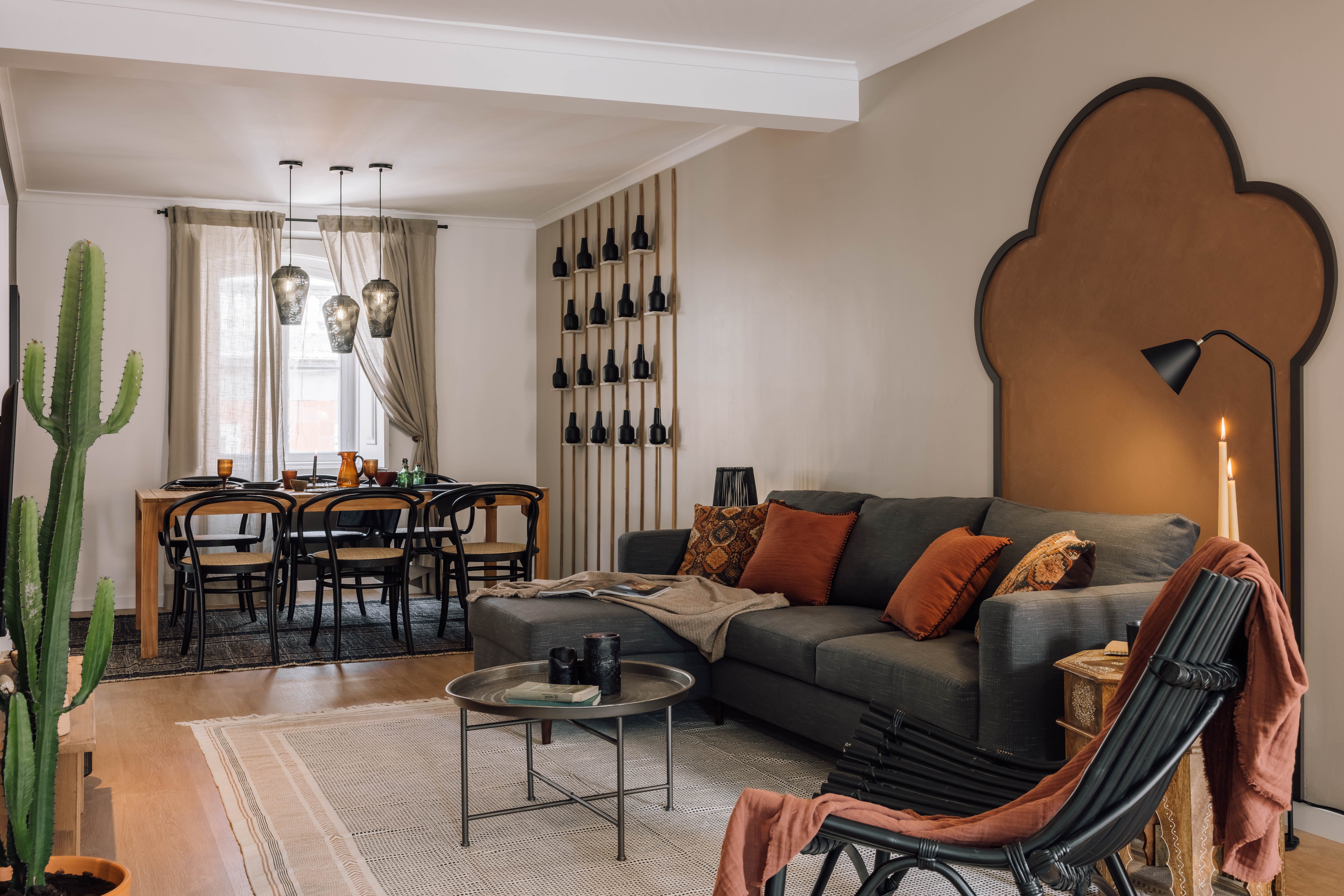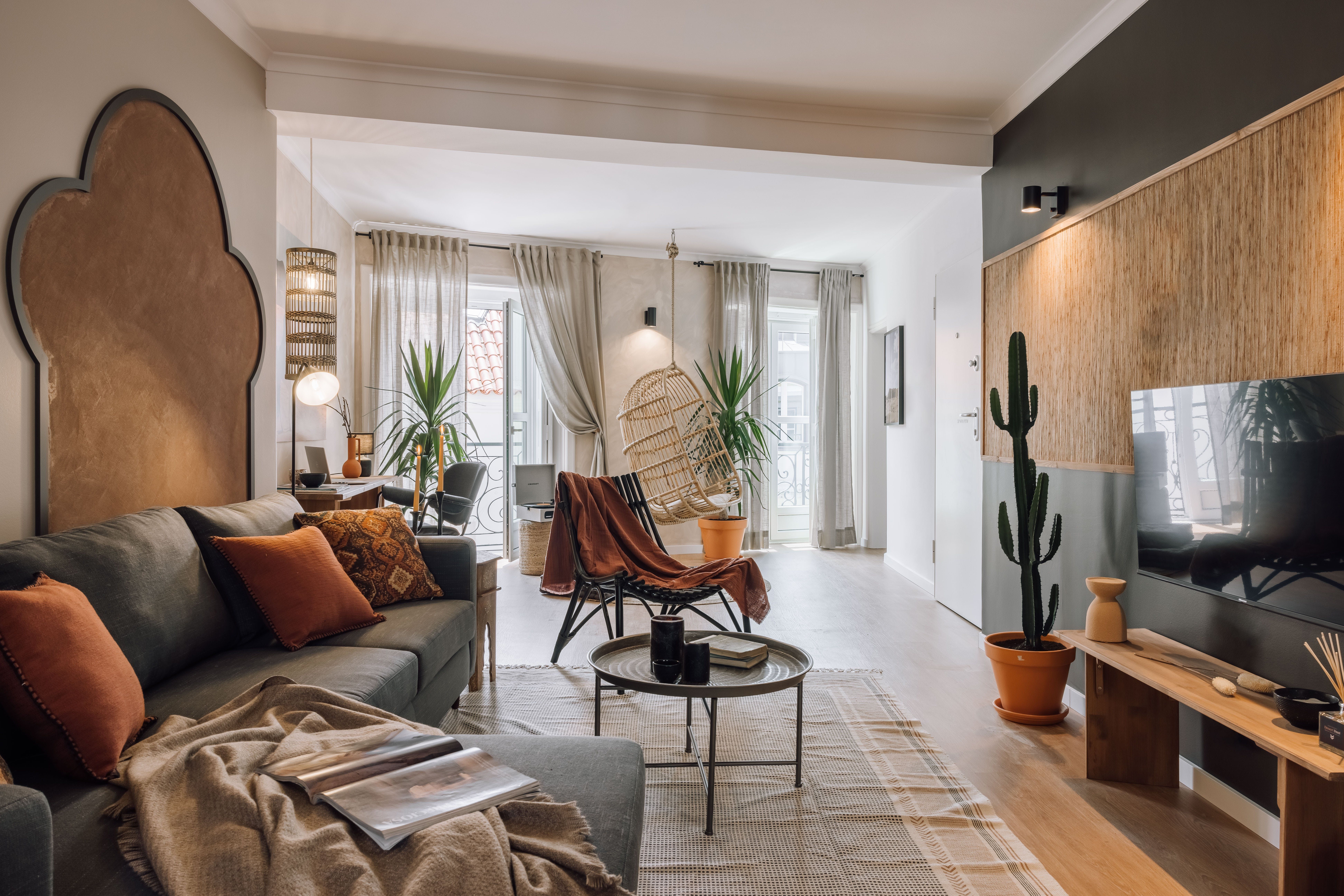 Although this apartment sits in the middle of Lisbon, you'll note that there are a lot of influences from the continent just across the Mediterranean Sea, be it the Arabian arches, the hieroglyphic scrolls or the potted cacti. At the same time, Scandi trends are also detectable in the wooden surfaces, mid-century furnishings and preference for clean lines.