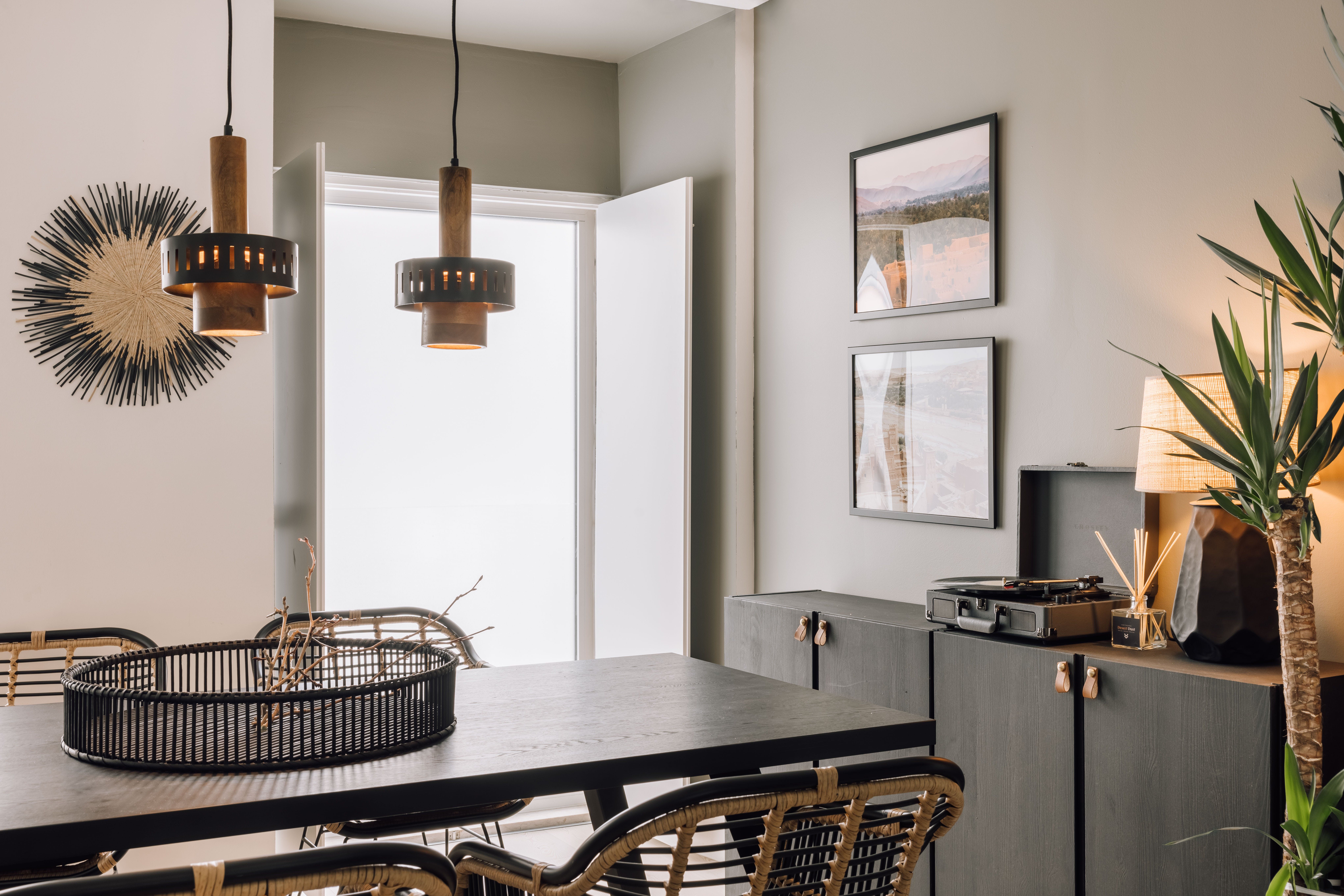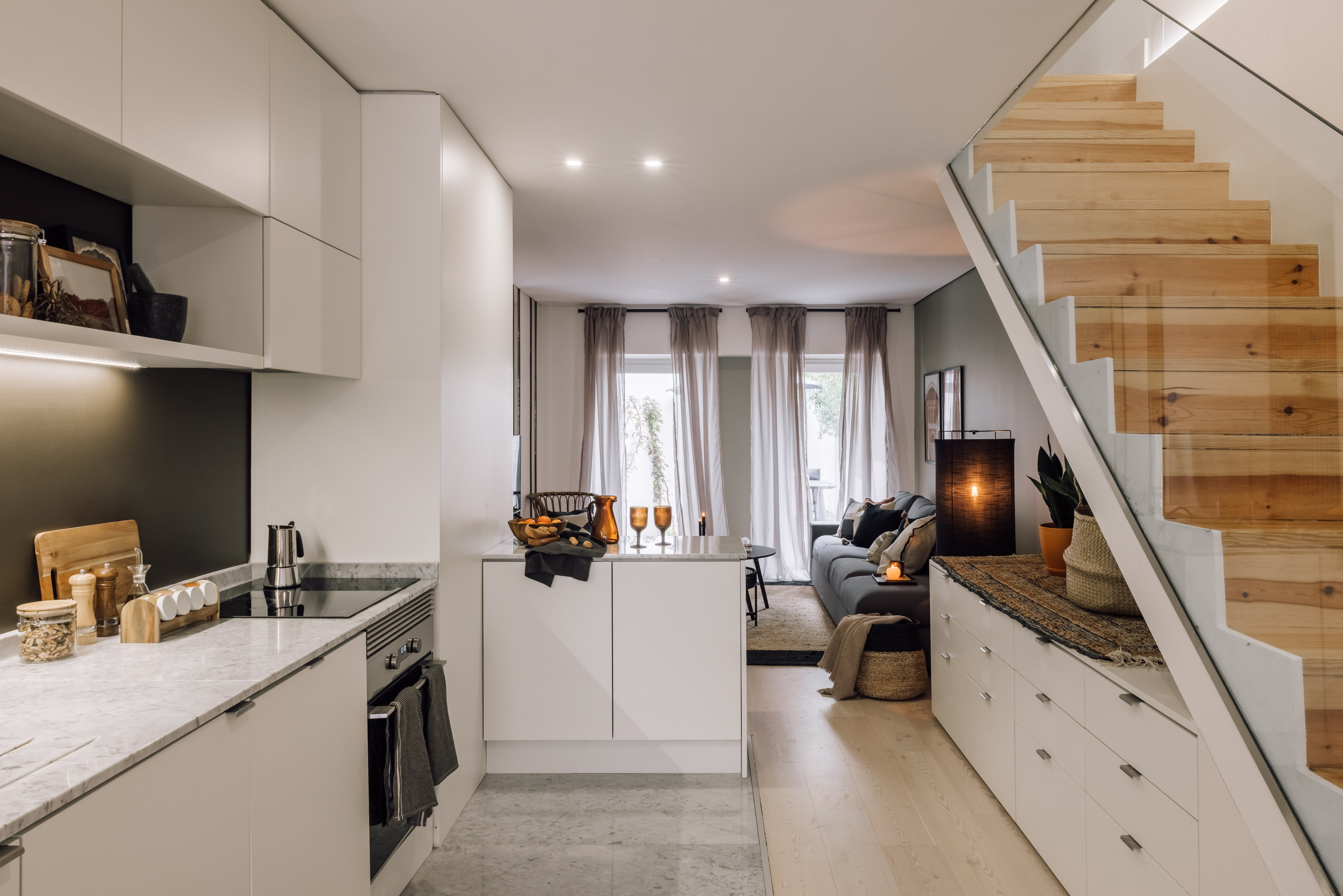 We're completely in awe of this home's thoughtful design aesthetic. You'll find it nestled in a cluster of pastel-hued buildings, oozing charm from the offset. Inside, it's a timeless canvas of high ceilings and wooden flooring, swathed in a soothing colour palette of earthy neutrals. We love the open-plan living space, lavishly adorned with a cosy lounge, large dining table and sleek, fully-equipped kitchen.