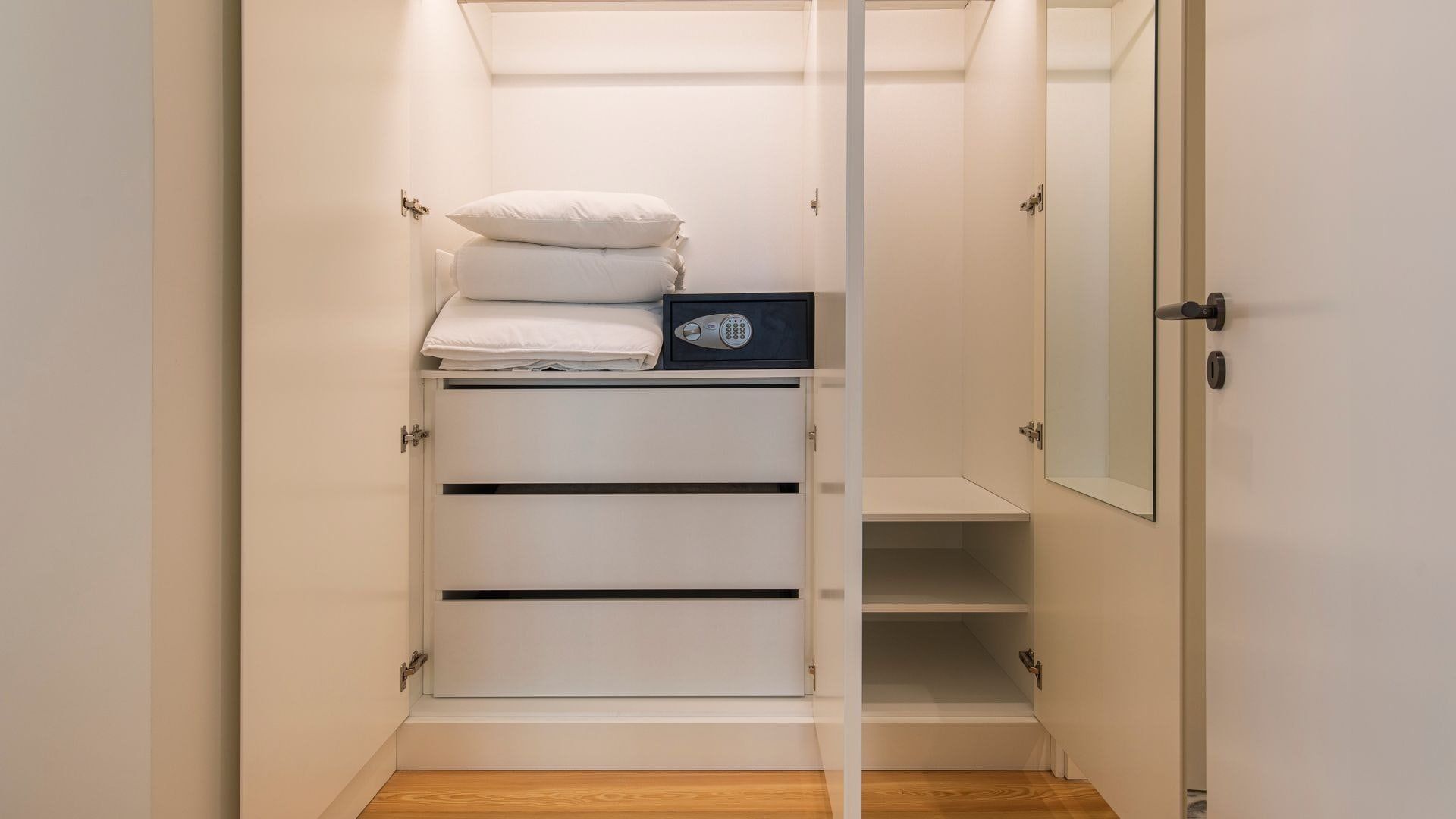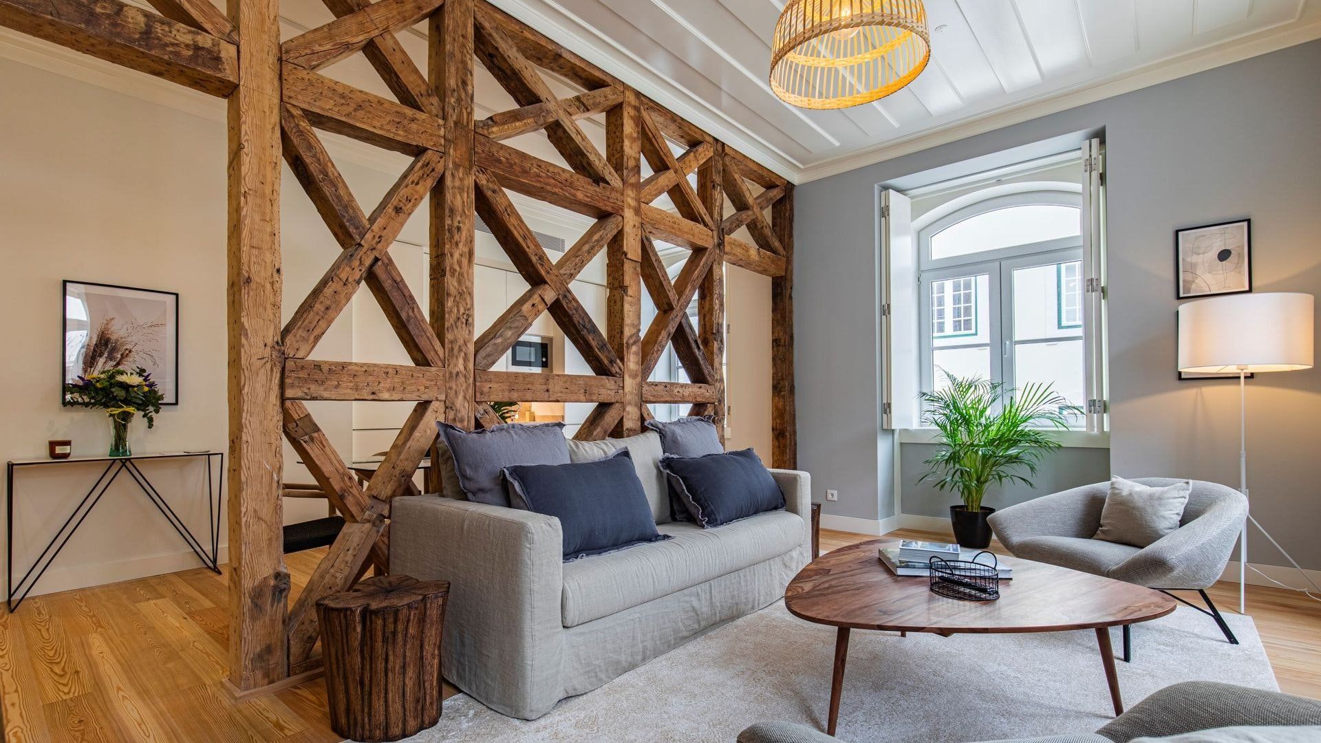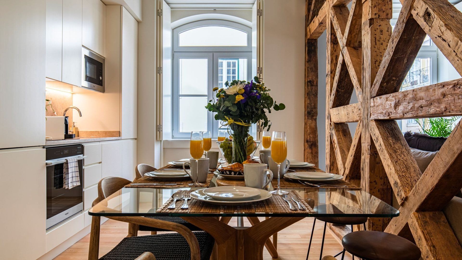 We love the open plan kitchen and lounge, thoughtfully separated by a latticed wall of exposed beams, inviting natural light to fill the space. The fully-fitted kitchen offers everything you need for cooking up a feast, including a microwave, refrigerator, dishwasher and coffee maker. Spend mornings gathered around the six-seater dining table, tucking into breakfast as you plan the day's itinerary. If you can bear to leave this peaceful pad, you're just a four-minute stroll away from the triumphal Rua August Arch. Plus, the medieval sites of Lisbon Cathedral, São Jorge Castle and the Carmo Convent are all reachable within ten minutes on foot.