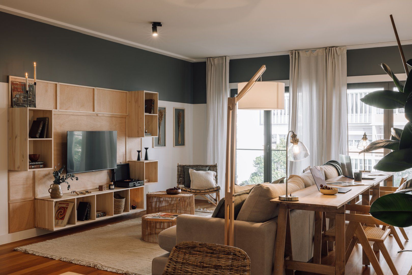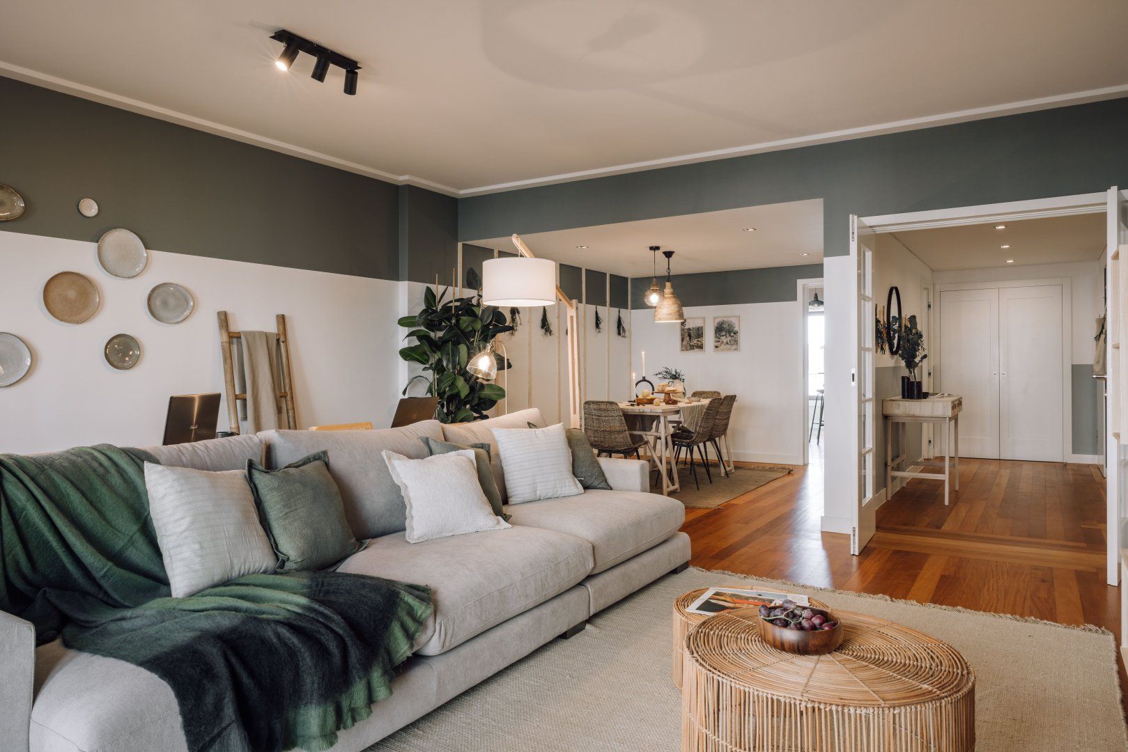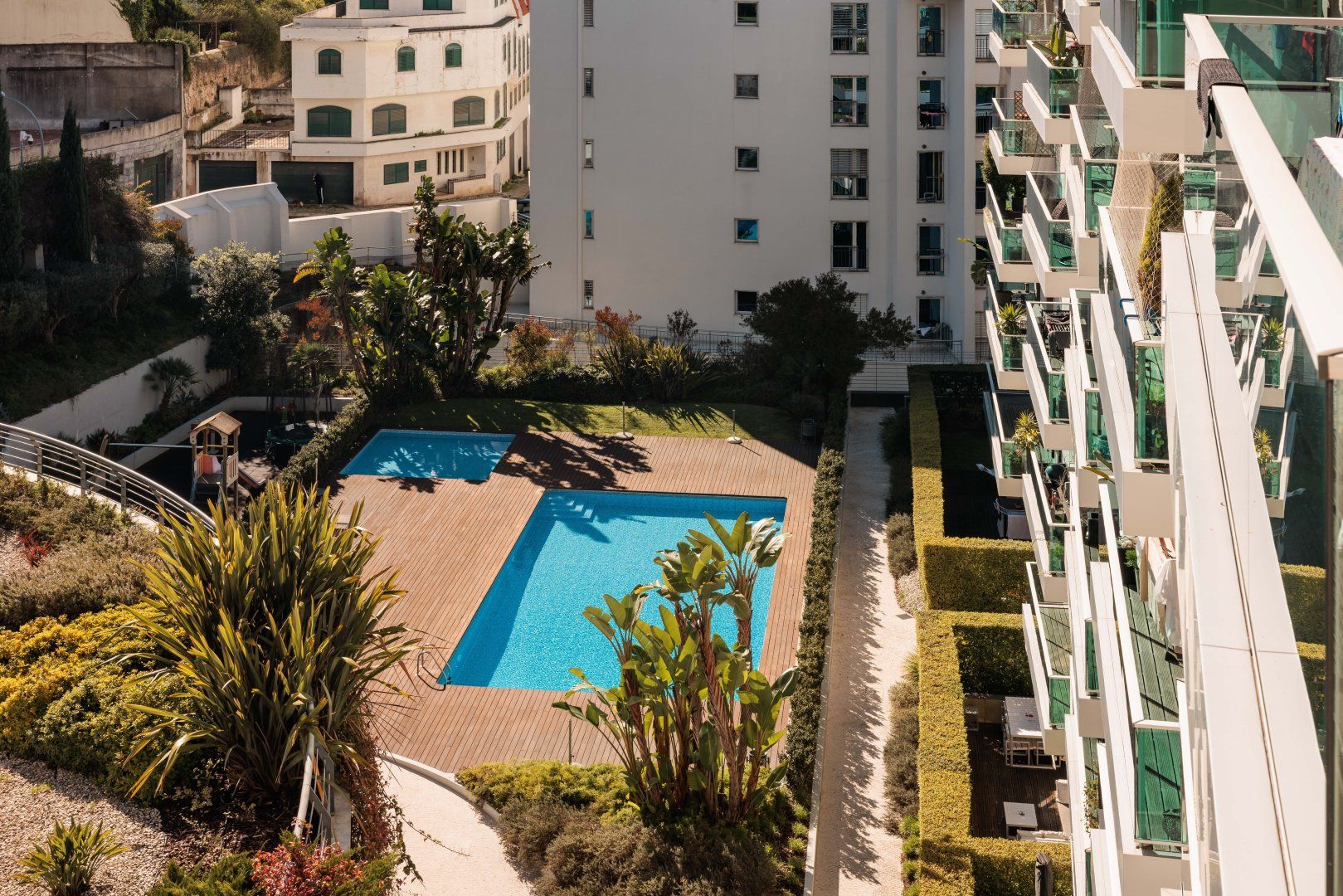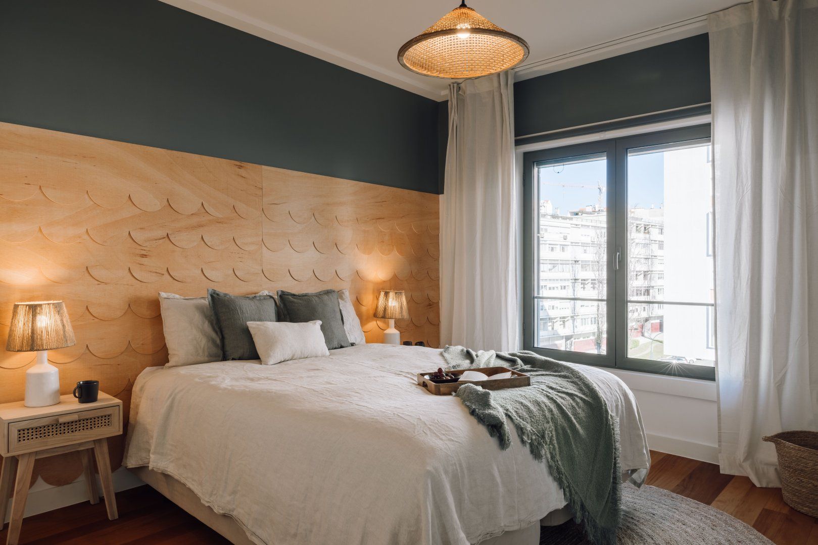 This attractive apartment is a dreamy base in Lisbon. It’s in the residential neighbourhood of Lapa, which is at the centre of lots of green spaces. The home itself is pretty and green, too, with lots of plants and woven grass decor. The apartment’s large glass doors open onto a Juliet balcony, making the space feel even more bright and welcoming. Best of all, you’ll have access to a communal swimming pool and gym.