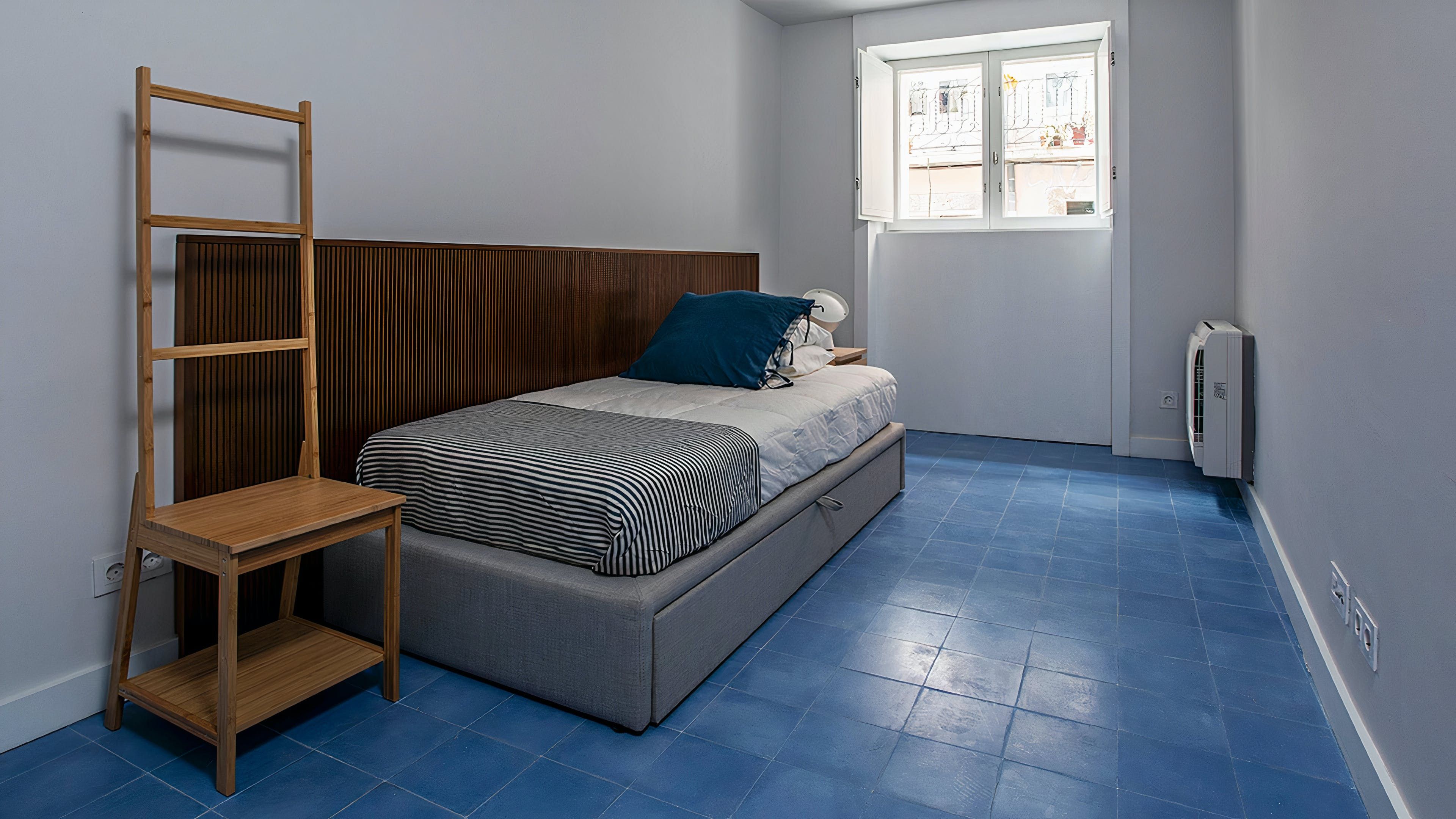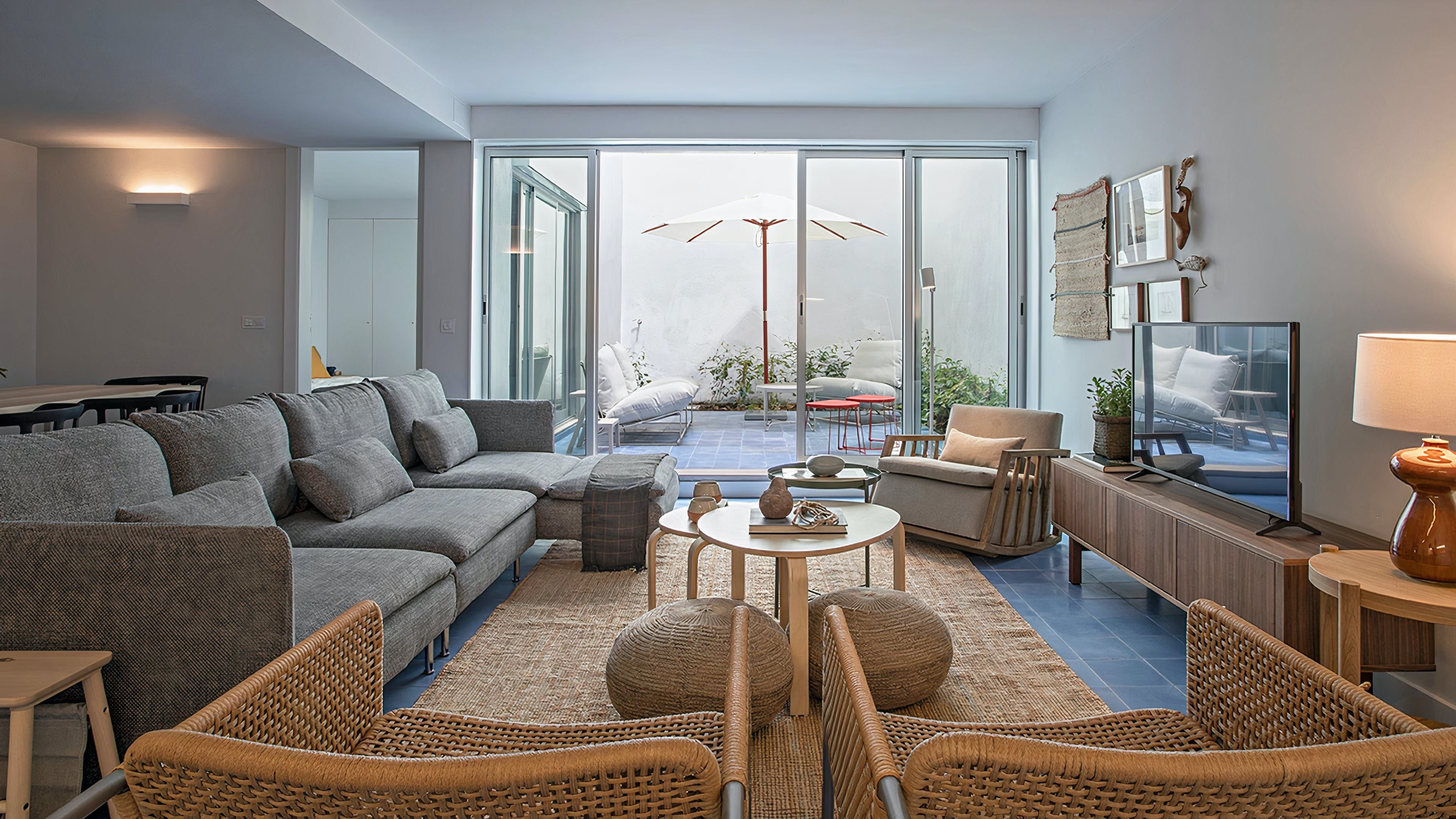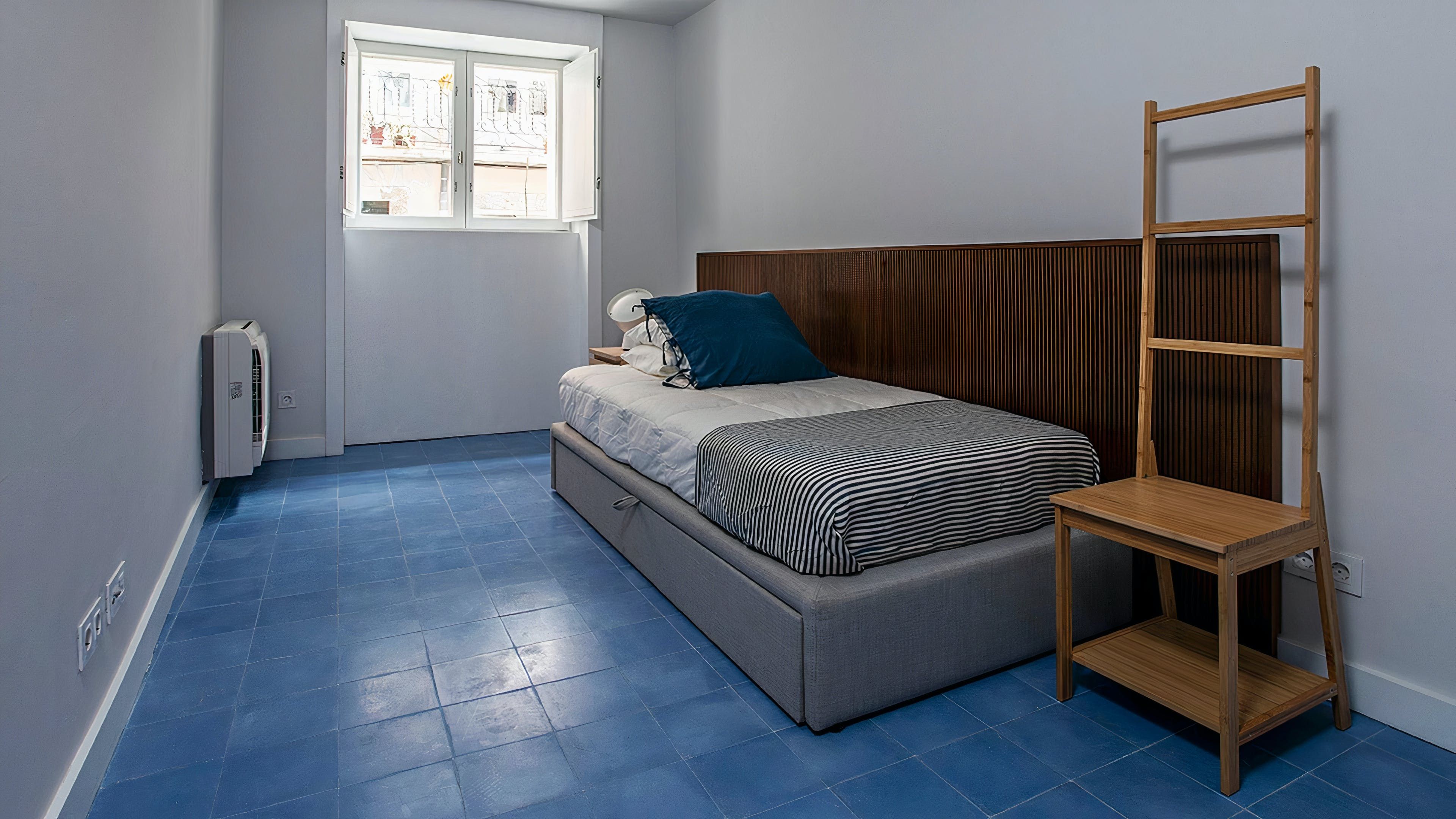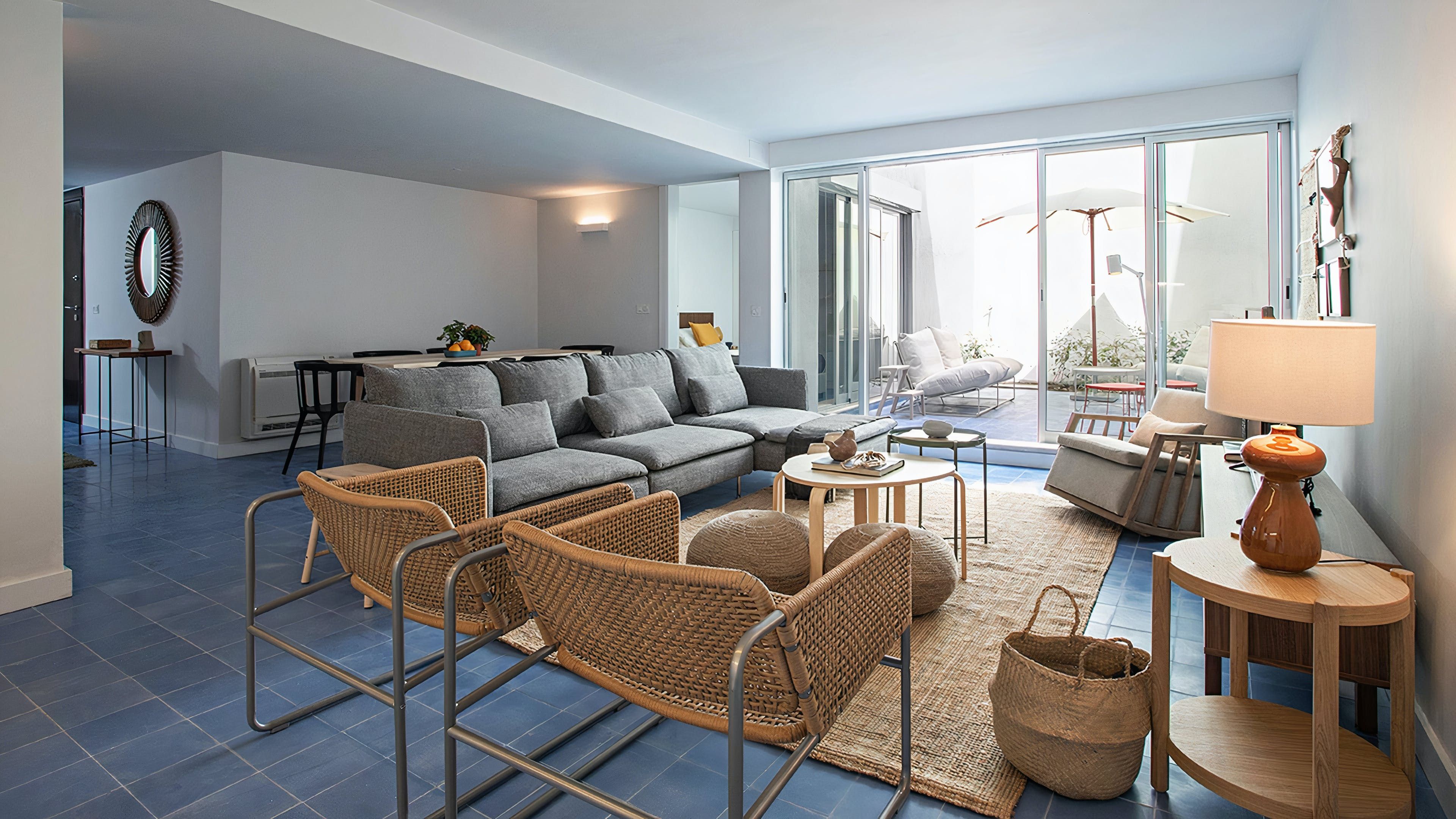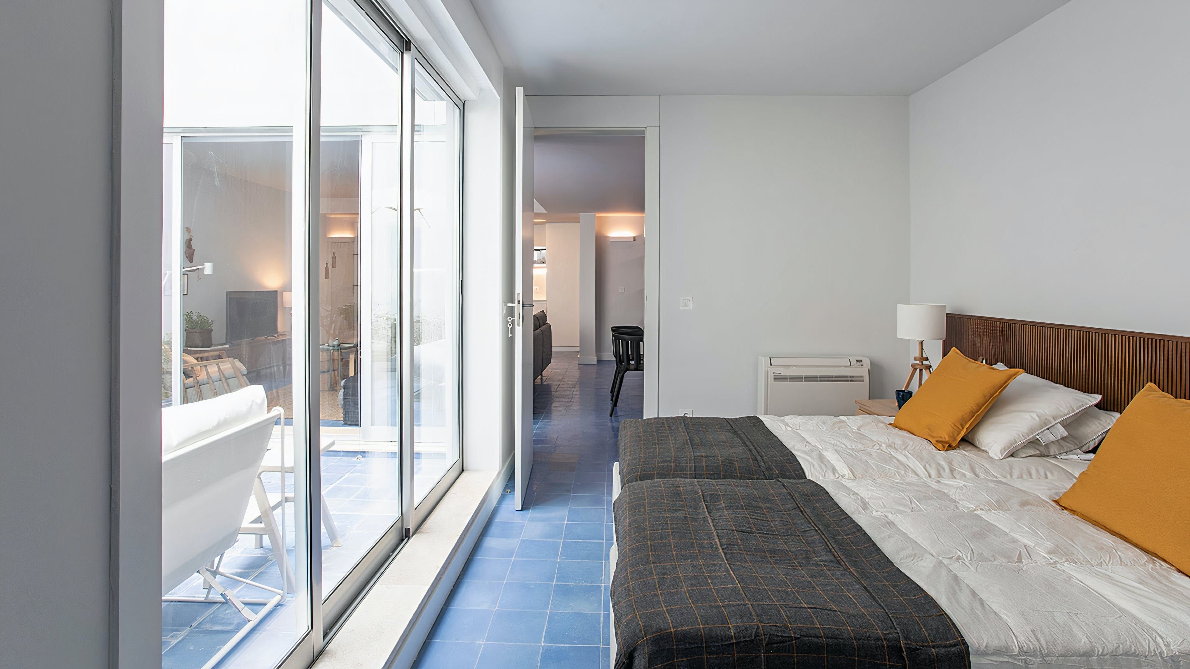 Over in the bedrooms, the designers have kept the spaces pared-back and contemporary – with just those Portuguese ceramic floor tiles adding a pop of colour and beautifully mirroring the blue skies outside. We'll let you decide who lucks out on that king-size bedroom with en-suite and direct access to the pretty courtyard.