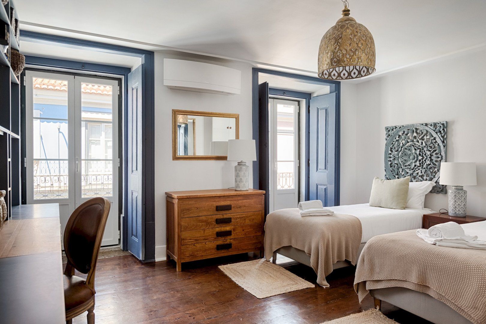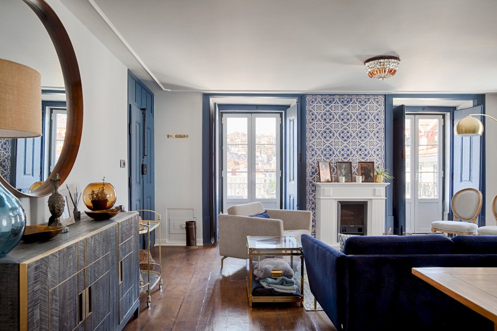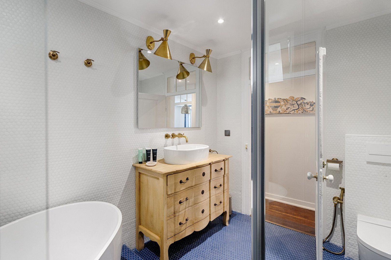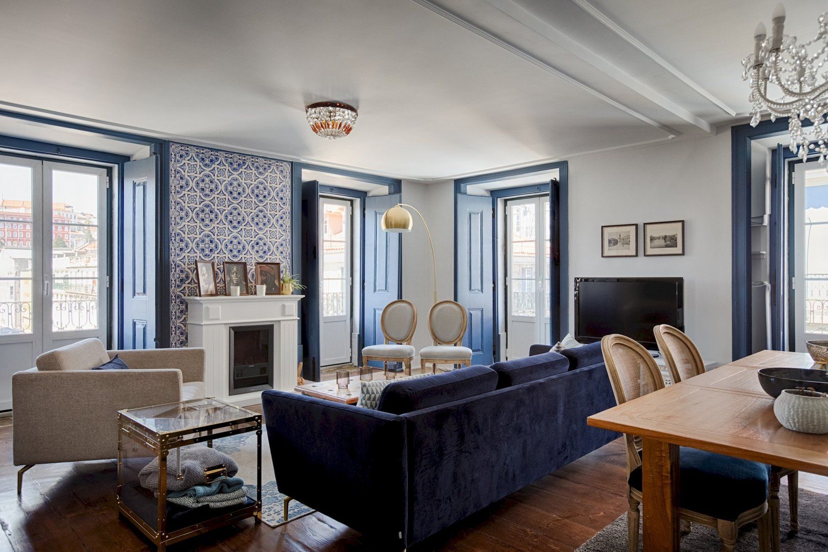 Perch by the living room’s Juliet balconies with your morning coffee as you watch the hustle and bustle of Baixa life below, or gather together at the elegant dining table for an evening banquet while the city lights twinkle just outside. We love the decorative details – from the intricate fireplace to the azulejo wallpaper, dazzling chandelier, and beautiful blue-coloured velvet sofa. The bedrooms are just as light, with dedicated desk spaces for those visiting on business, and there's even a swanky freestanding tub to soak in at the end of a long day spent sightseeing.
