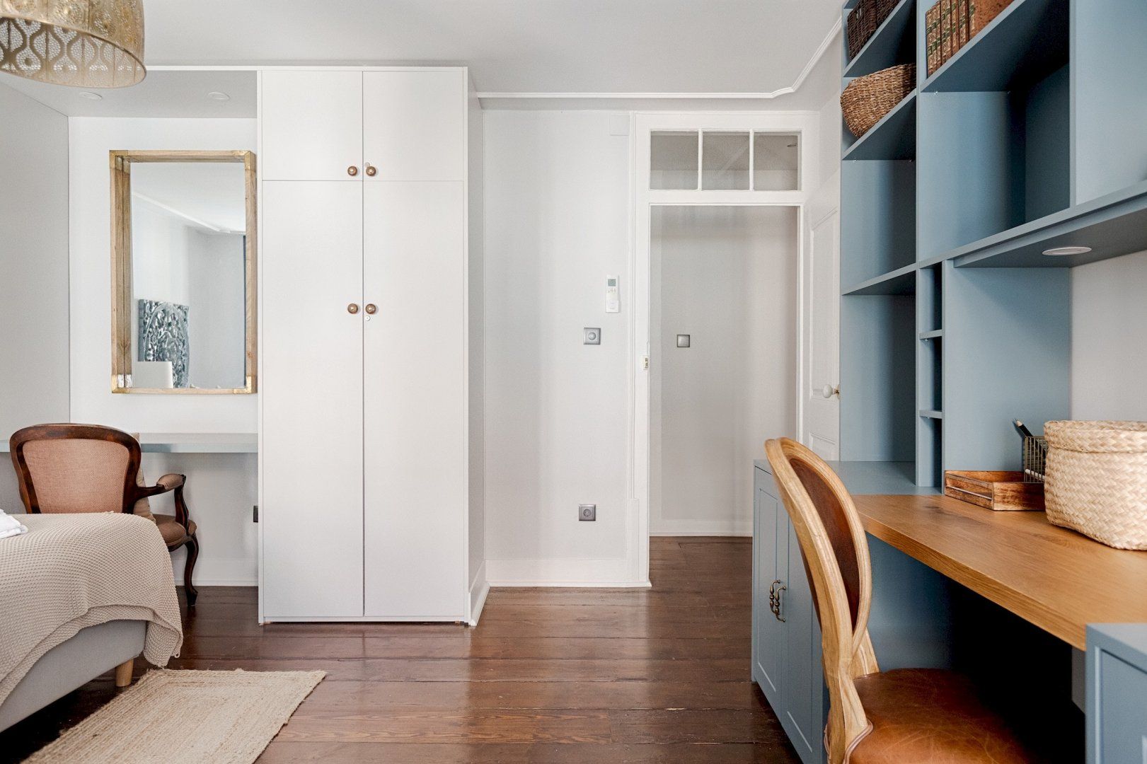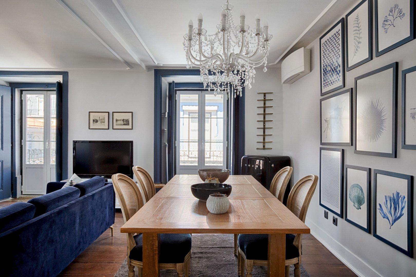 Peering over the historical Praça da Figueira, this family-size penthouse welcomes you to unwind and explore this beautiful city in style. Housed in a century-old building, the refurbished apartment is modern and comfortable with a calming blue colour palette running throughout and appealing artwork adorning the walls. It's bright and open, thanks to the tall balcony doors that wrap around the cosy living space, inviting the natural sunlight to illuminate this gorgeous home. Just outside, the cultural delights of Chiado, Carmo Convent and Rua Augusta await.