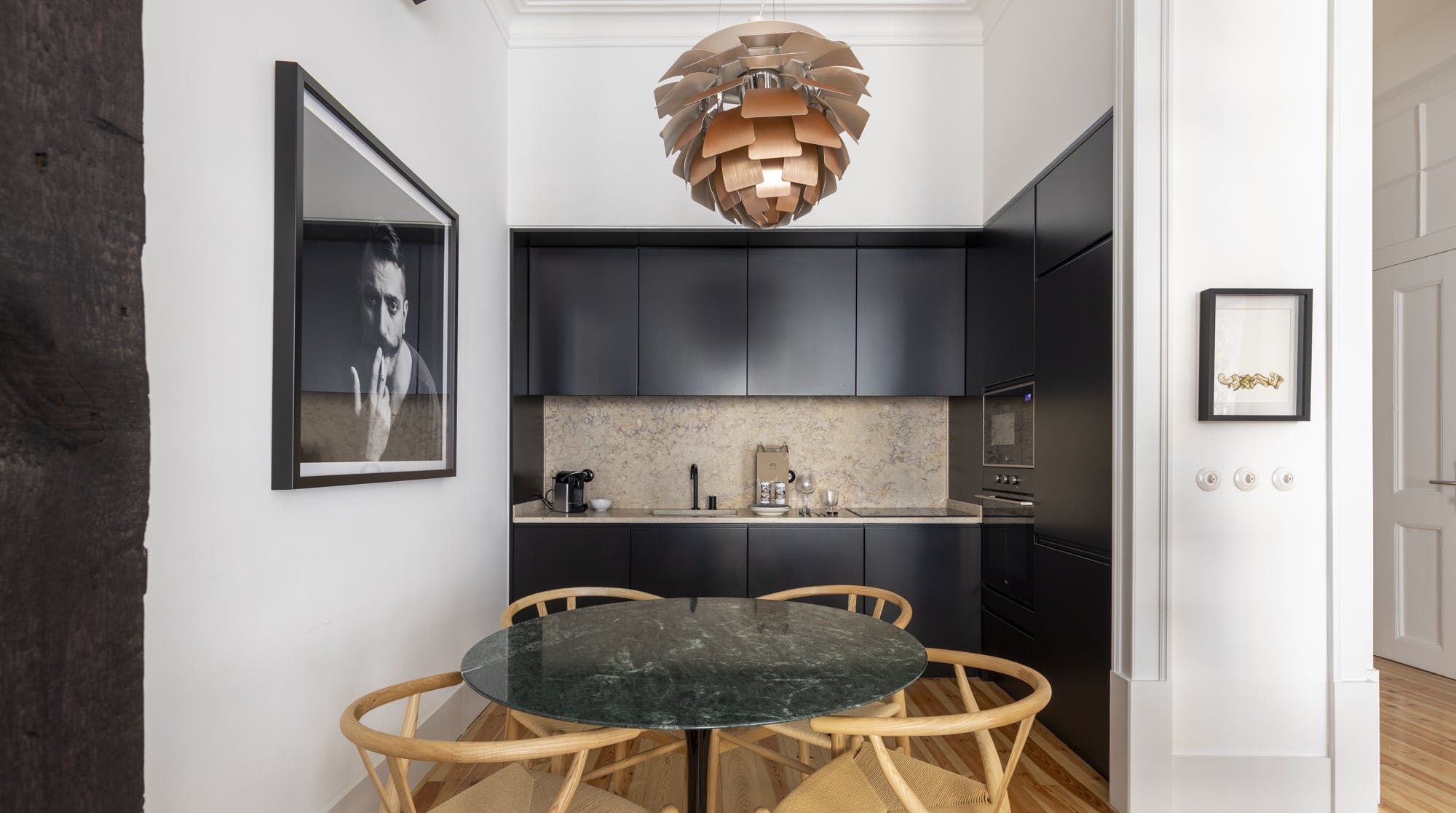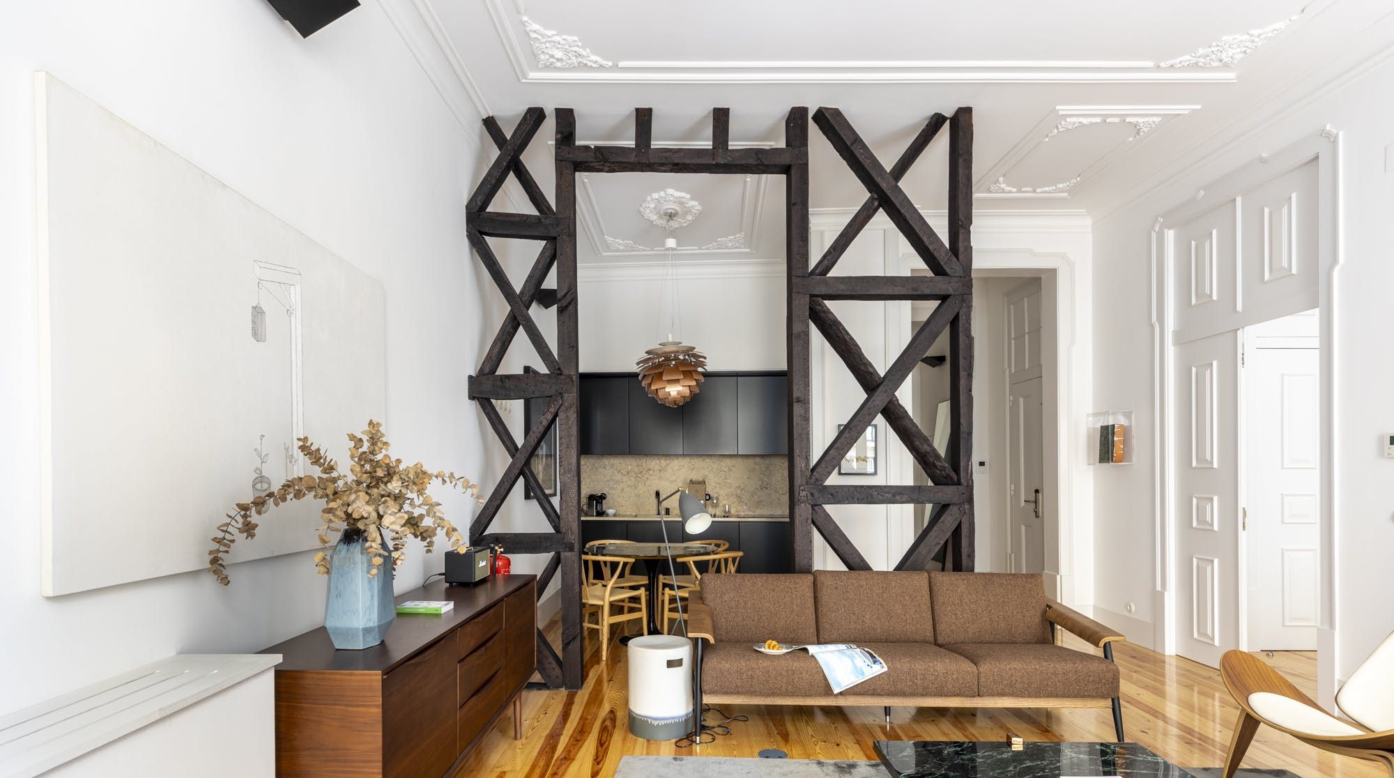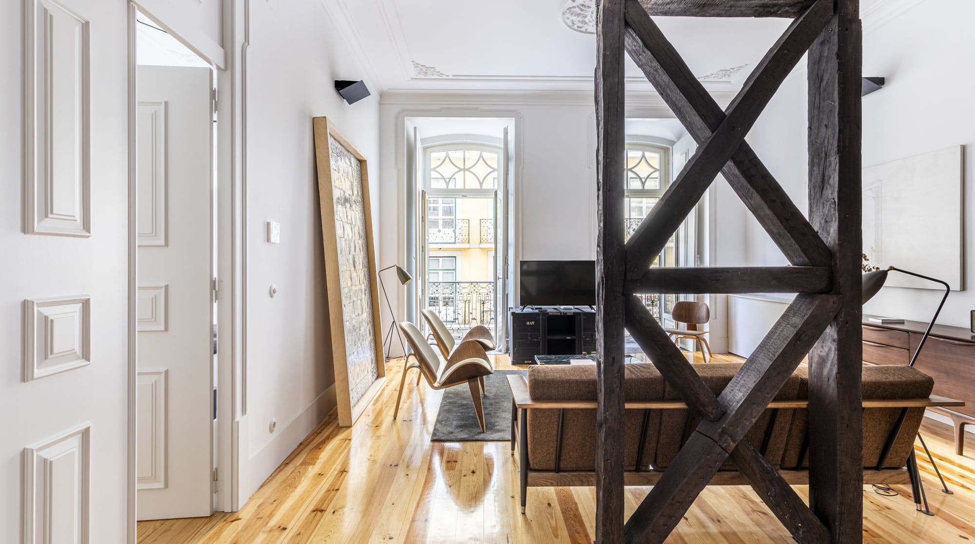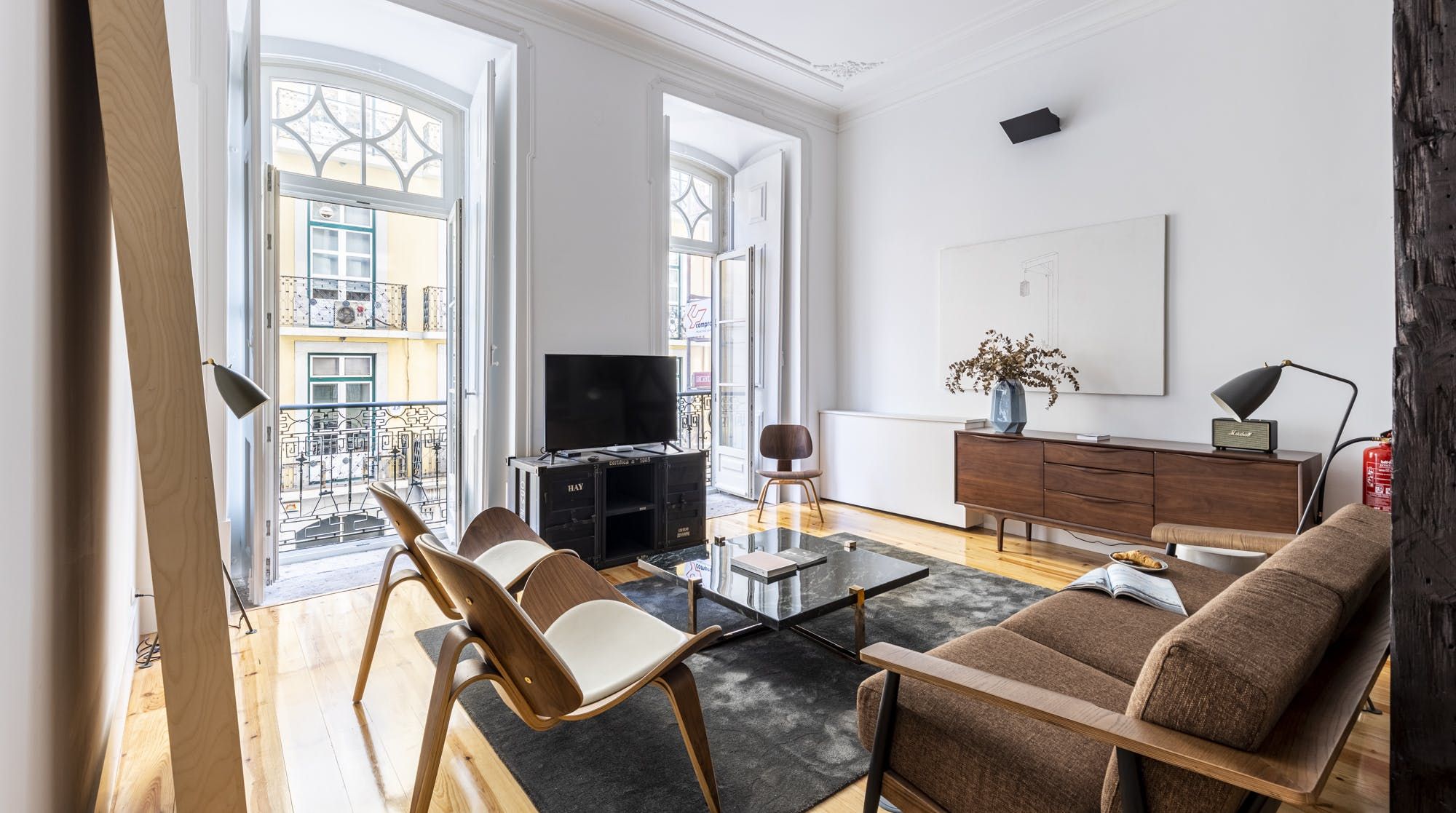 This beautifully bright apartment between Lisbon's Chiado and Alfama neighbourhoods has it all – a great location and a blend of modern styling and character features. Summing up this historic part of Lisbon perfectly, it's in a typical Pombalina building – freshly renovated with impeccable attention to detail. If local period architecture is of interest to you, you'll love the high, ornately decorated ceilings, the tall windows and the traditional narrow balcony with wrought iron railings. And it's not too hard to spot the building's defining feature – the Pombalina wooden cage built in to strengthen the stone buildings after the great earthquake of the 1750s. Bright and smartly designed, this charming home has been reimagined for the 21st century, with a cool black kitchen, mid-century modern furniture and tasteful wall art. Comfortable and welcoming, you'll spend your mornings sipping coffee, watching the street come to life from your balcony. The two bedrooms are pared-back yet elegantly dressed, while the two spa-like bathrooms with their rainfall showers are a treat to wake up to each morning. Outside of your home, both the Santa Justa Lift and Praça do Comércio are a seven-minute walk away, São Jorge Castle is walkable in eight and Lisbon Cathedral is a mere three minutes on foot from your door. With the Mercado da Baixa a six-minute stroll away too for fresh produce as well as countless restaurants, shops and bars in your neighbourhood, you've got everything you need for a fun, culture-filled stay.
