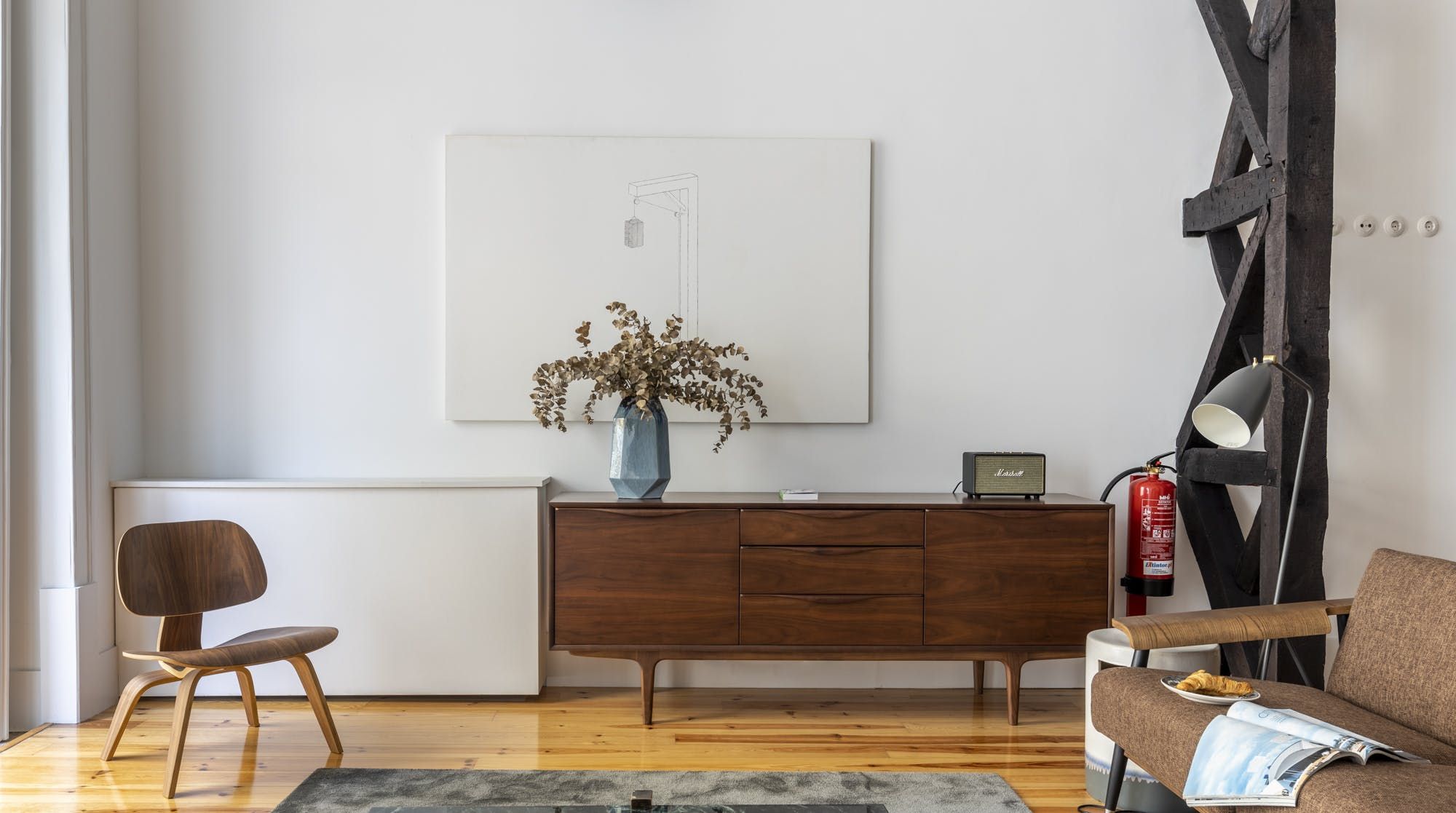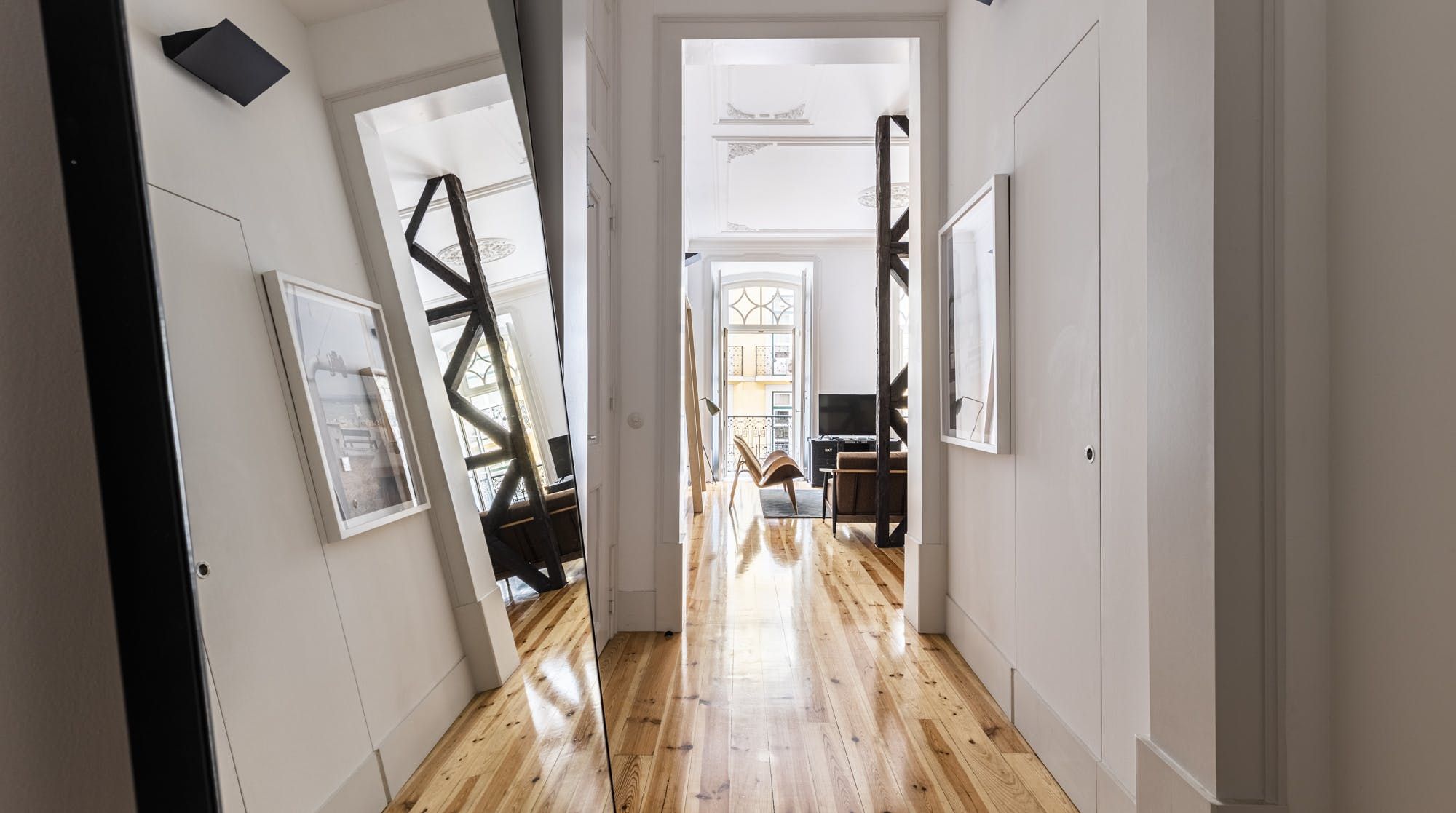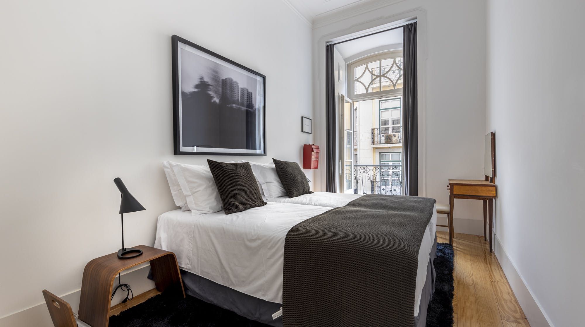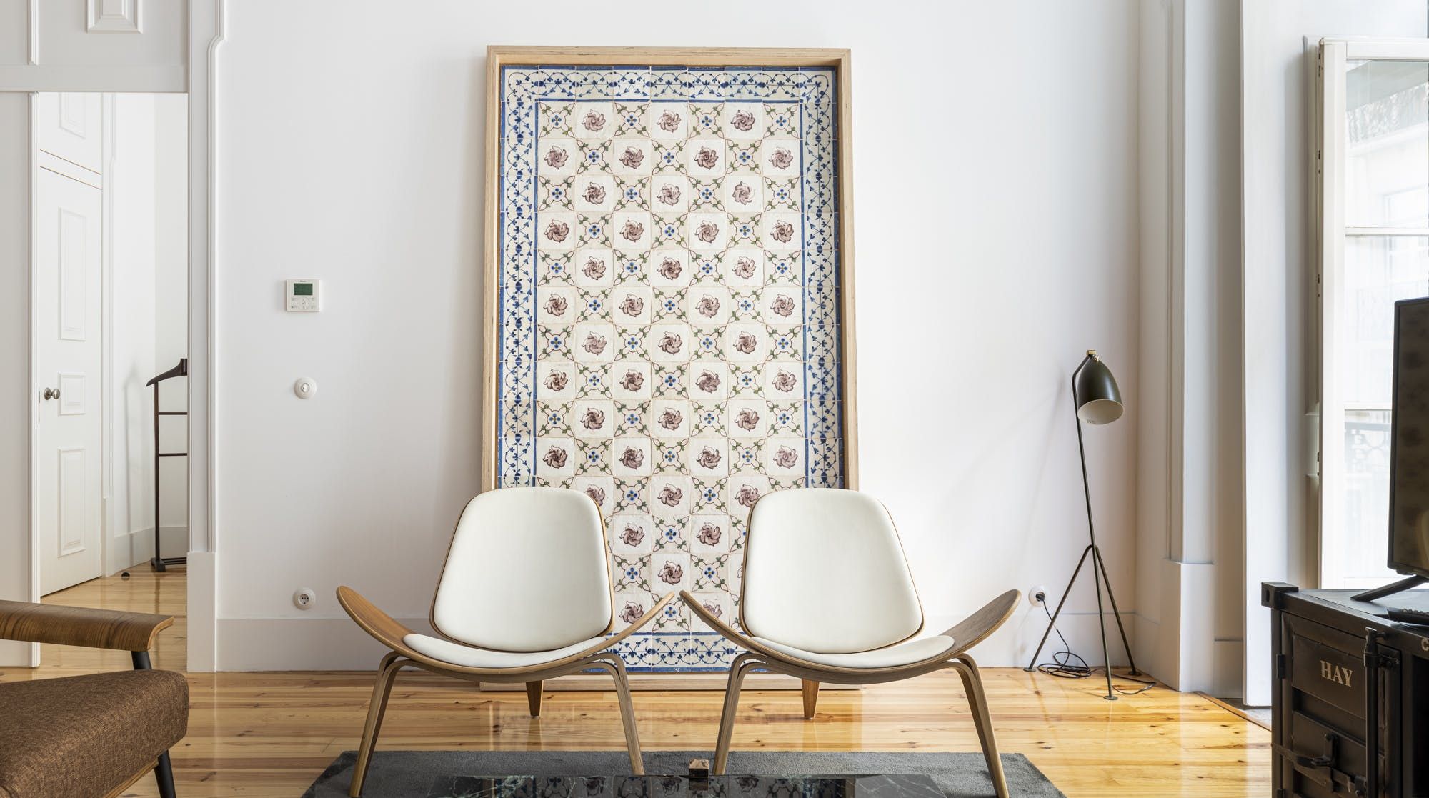 This beautifully bright apartment between Lisbon's Chiado and Alfama neighbourhoods has it all – a great location and a blend of modern styling and character features. Summing up this historic part of Lisbon perfectly, it's in a typical Pombalina building – freshly renovated with impeccable attention to detail. If local period architecture is of interest to you, you'll love the high, ornately decorated ceilings, the tall windows and the traditional narrow balcony with wrought iron railings. And it's not too hard to spot the building's defining feature – the Pombalina wooden cage built in to strengthen the stone buildings after the great earthquake of the 1750s. Bright and smartly designed, this charming home has been reimagined for the 21st century, with a cool black kitchen, mid-century modern furniture and tasteful wall art. Comfortable and welcoming, you'll spend your mornings sipping coffee, watching the street come to life from your balcony. The two bedrooms are pared-back yet elegantly dressed, while the two spa-like bathrooms with their rainfall showers are a treat to wake up to each morning. Outside of your home, both the Santa Justa Lift and Praça do Comércio are a seven-minute walk away, São Jorge Castle is walkable in eight and Lisbon Cathedral is a mere three minutes on foot from your door. With the Mercado da Baixa a six-minute stroll away too for fresh produce as well as countless restaurants, shops and bars in your neighbourhood, you've got everything you need for a fun, culture-filled stay.