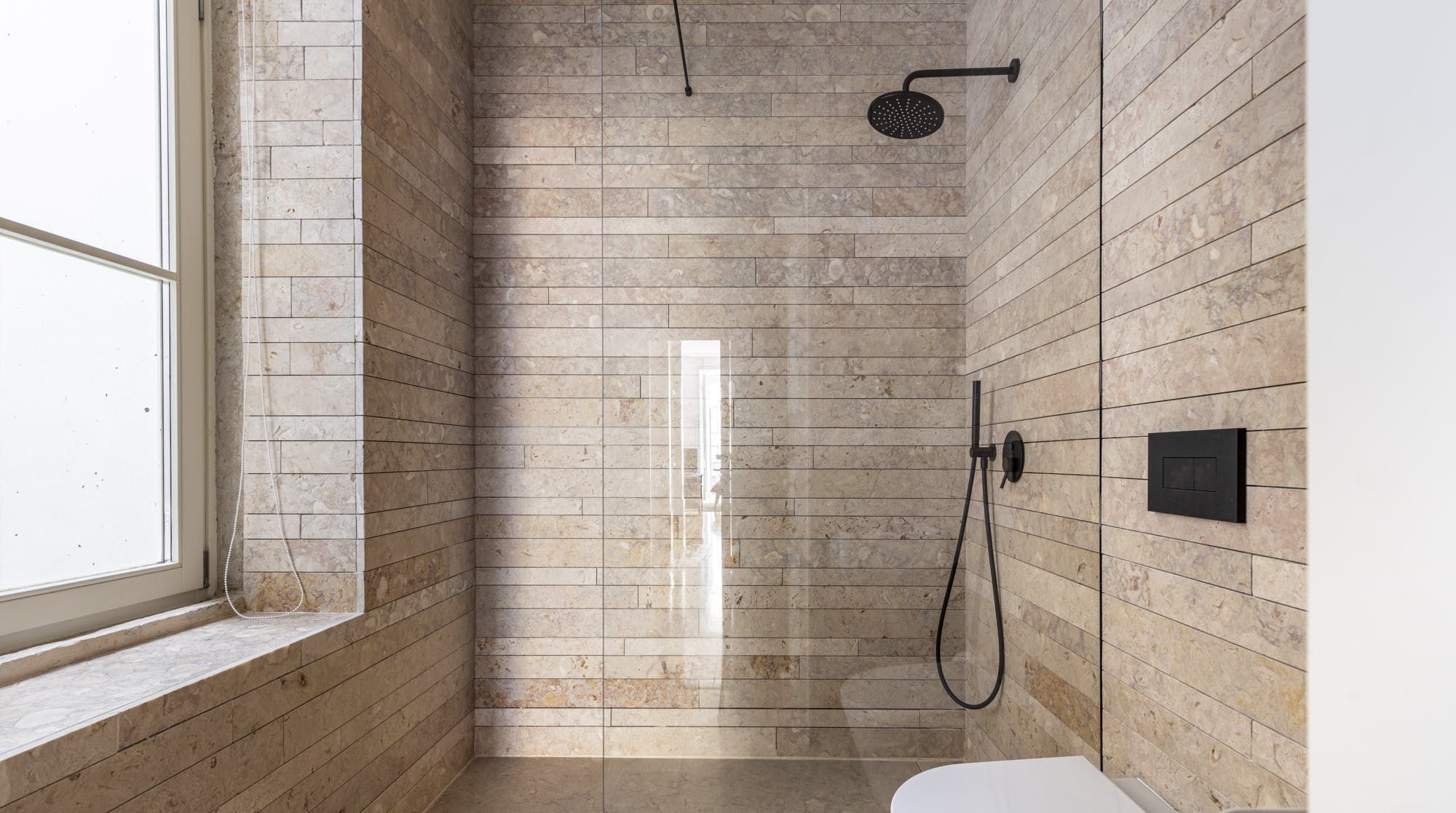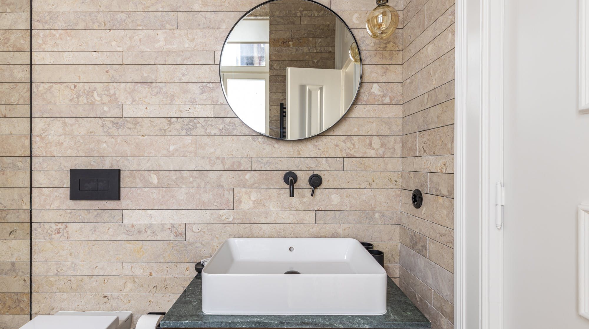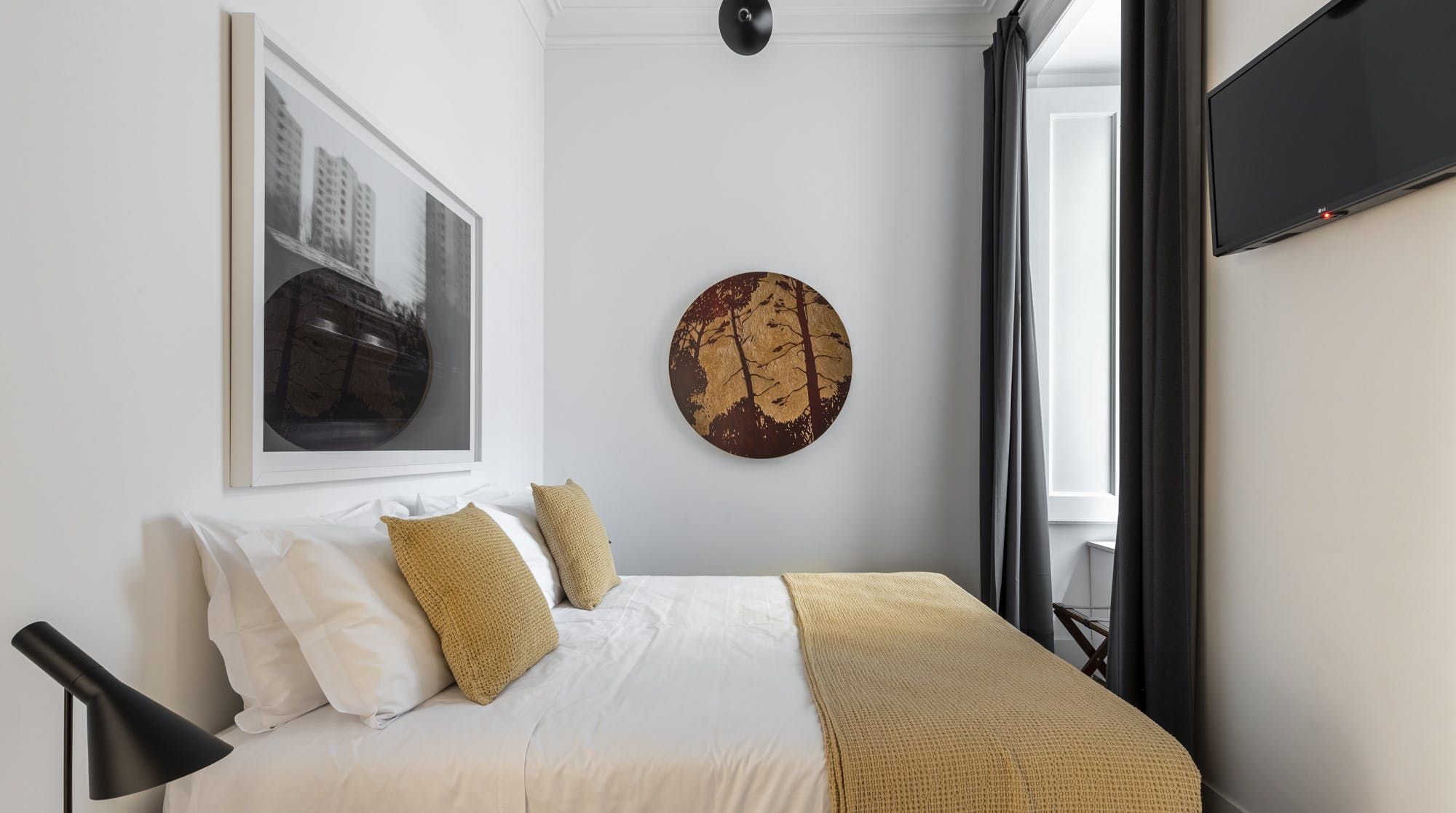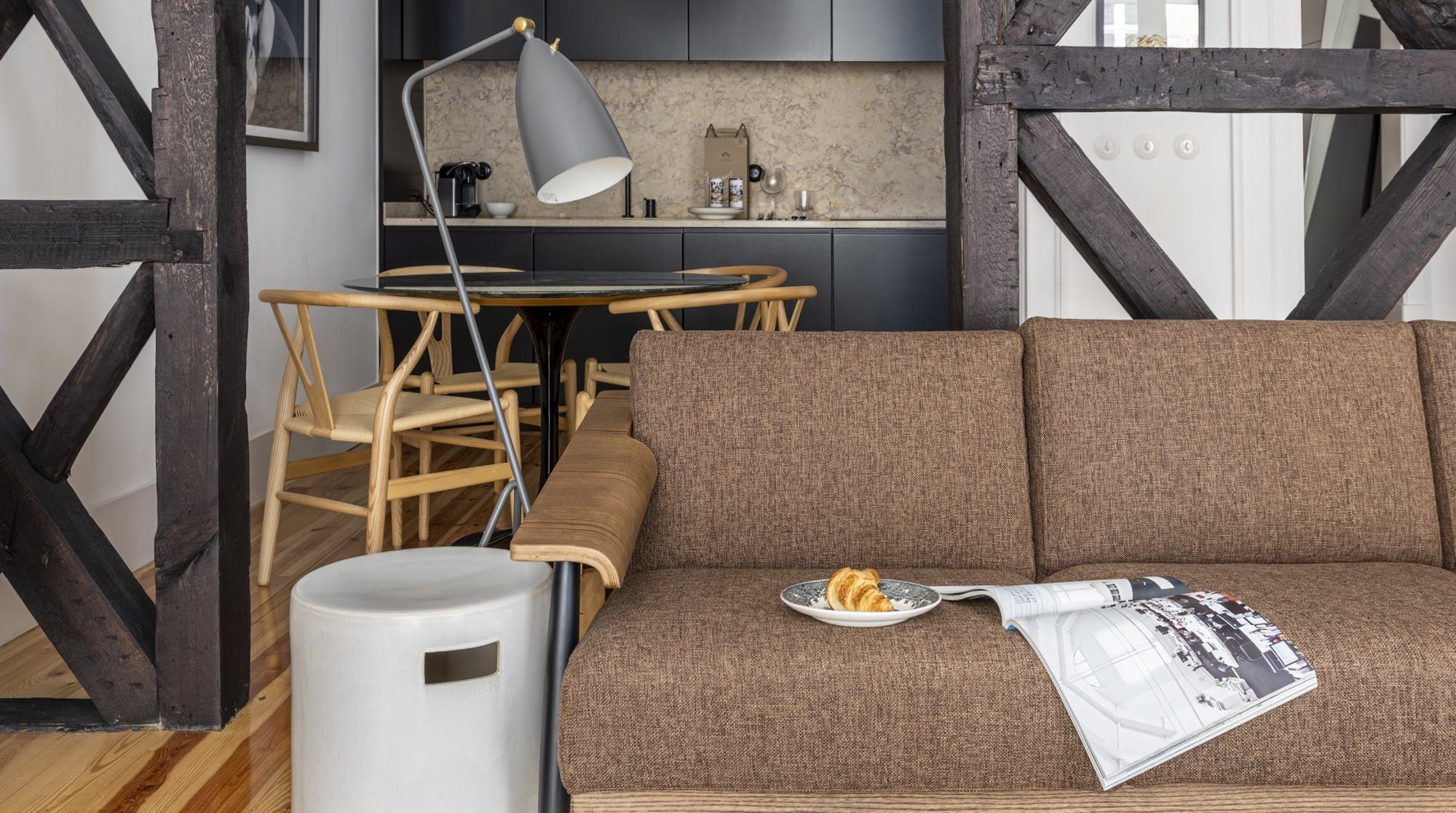 This beautifully bright apartment between Lisbon's Chiado and Alfama neighbourhoods has it all – a great location and a blend of modern styling and character features. Summing up this historic part of Lisbon perfectly, it's in a typical Pombalina building – freshly renovated with impeccable attention to detail. If local period architecture is of interest to you, you'll love the high, ornately decorated ceilings, the tall windows and the traditional narrow balcony with wrought iron railings. And it's not too hard to spot the building's defining feature – the Pombalina wooden cage built in to strengthen the stone buildings after the great earthquake of the 1750s. Bright and smartly designed, this charming home has been reimagined for the 21st century, with a cool black kitchen, mid-century modern furniture and tasteful wall art. Comfortable and welcoming, you'll spend your mornings sipping coffee, watching the street come to life from your balcony. The two bedrooms are pared-back yet elegantly dressed, while the two spa-like bathrooms with their rainfall showers are a treat to wake up to each morning. Outside of your home, both the Santa Justa Lift and Praça do Comércio are a seven-minute walk away, São Jorge Castle is walkable in eight and Lisbon Cathedral is a mere three minutes on foot from your door. With the Mercado da Baixa a six-minute stroll away too for fresh produce as well as countless restaurants, shops and bars in your neighbourhood, you've got everything you need for a fun, culture-filled stay.