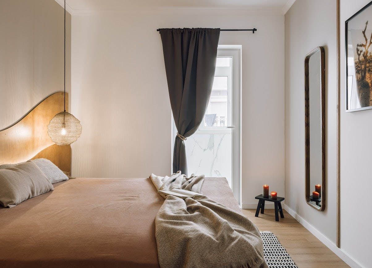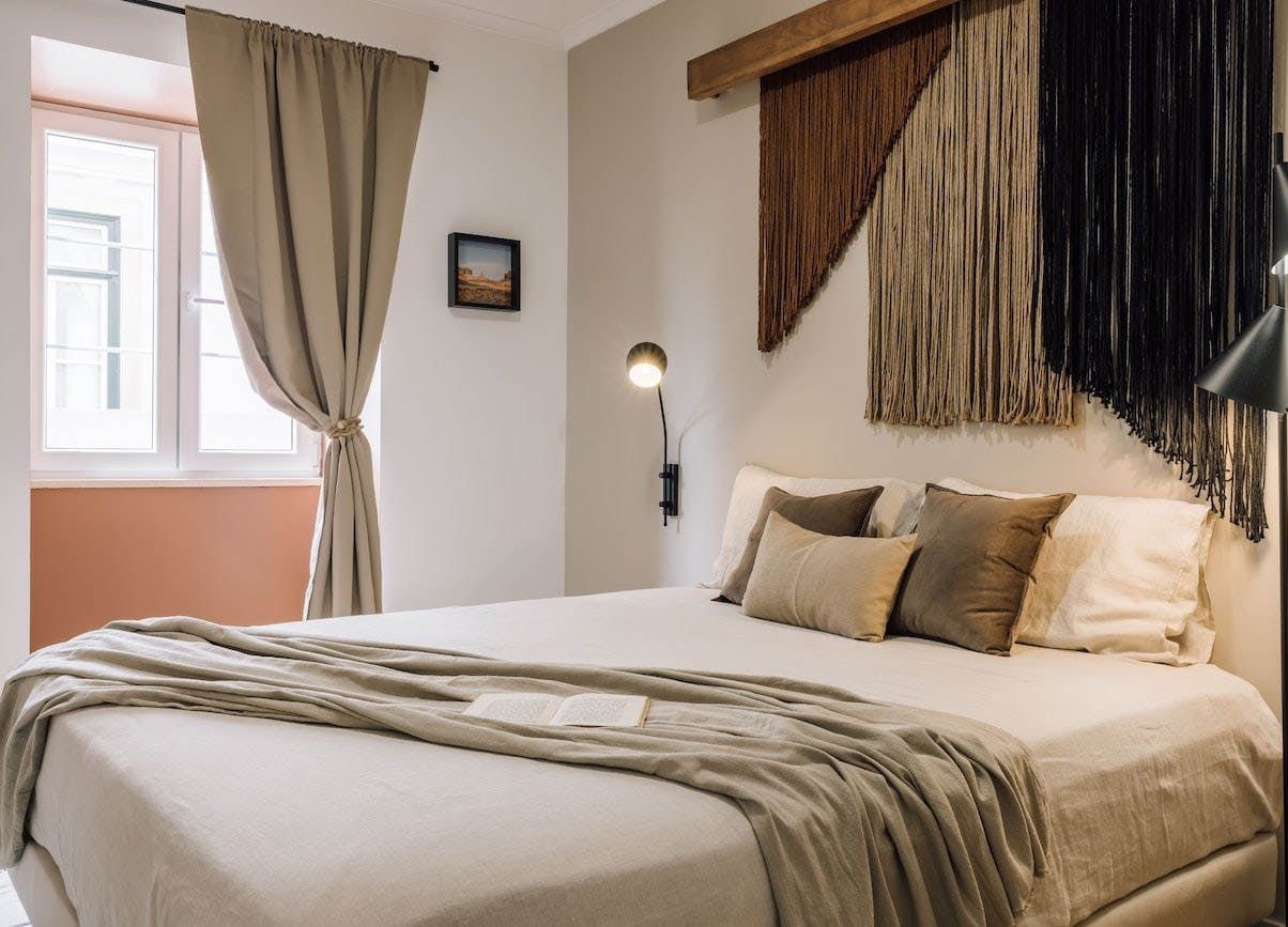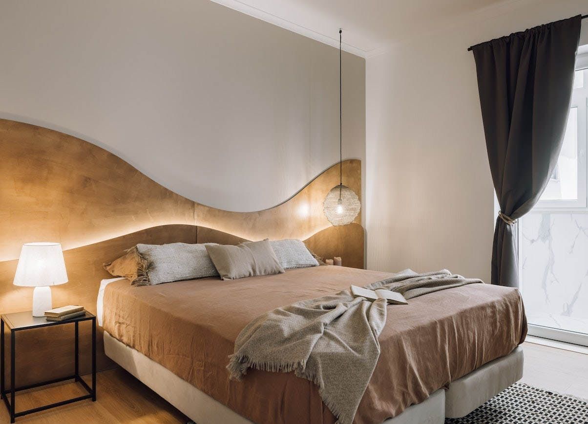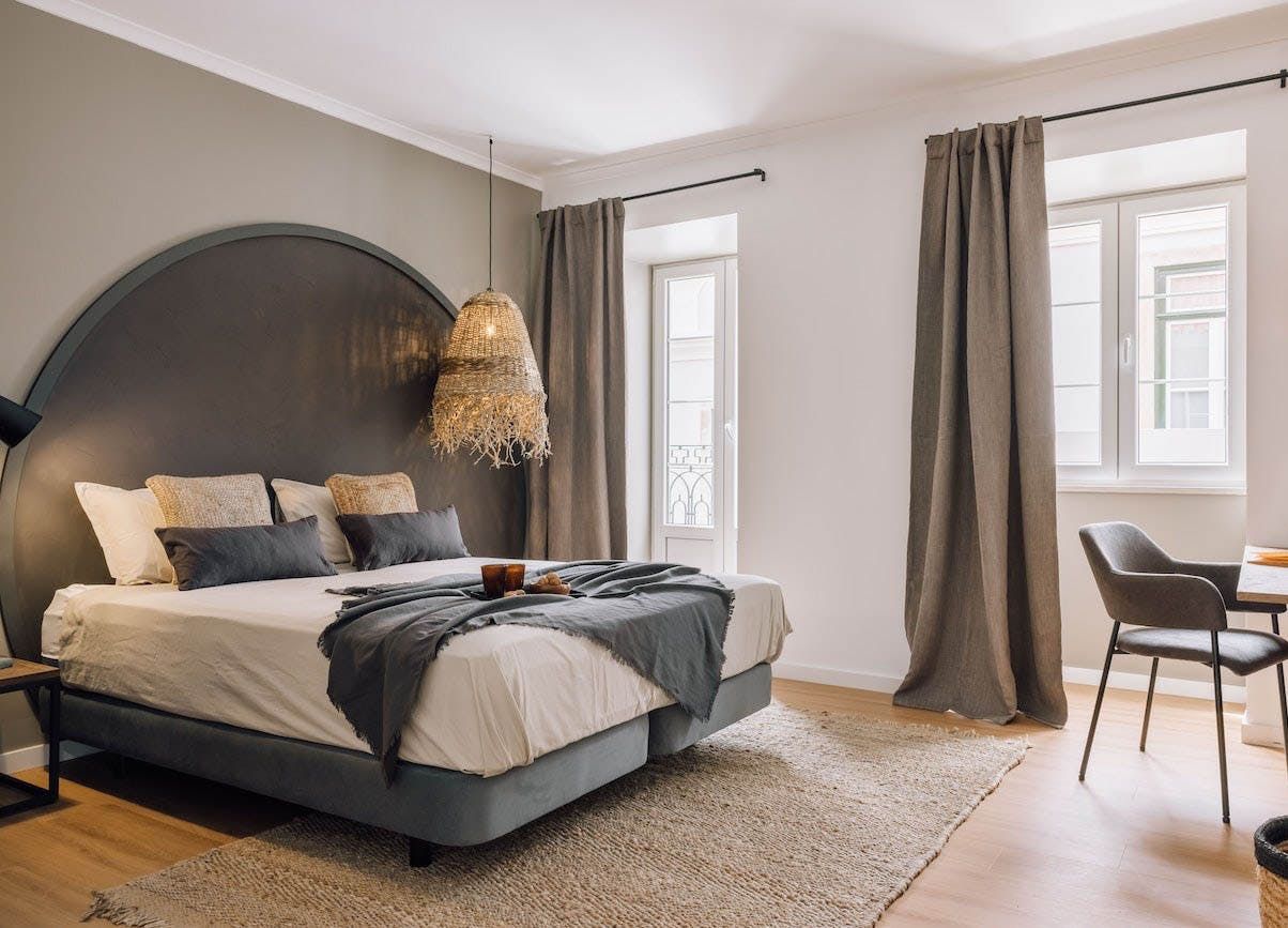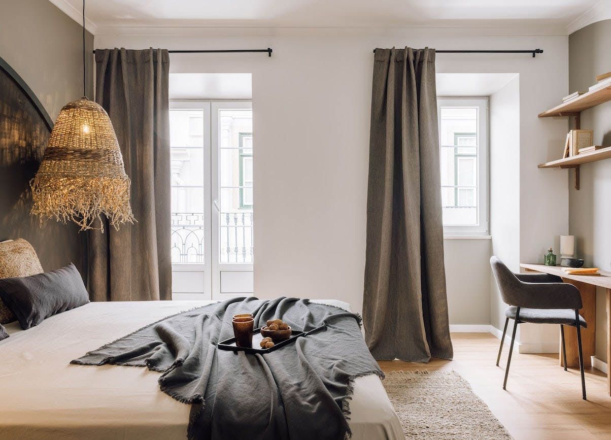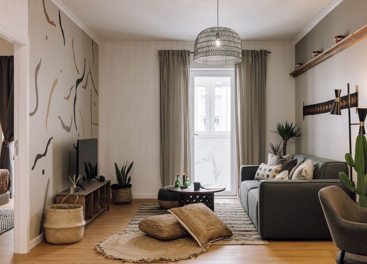 The open-concept living area is swathed in natural textures, rattan and wicker furnishings, and bespoke artworks. Open up the floor-to-ceiling windows as you fire off some project notes at your sleek desk before sharing pastéis de nata on the Juliet balcony. This is a tranquil space, with a plump sofa for sharing sangria and conversation and a stunning wooden dining table for enjoying memorable dinners under the ambient pendant lights. You’ll find the vinyl record player sets the tone for special gatherings, while the sanctuary-like bedrooms invite you into restful slumbers.