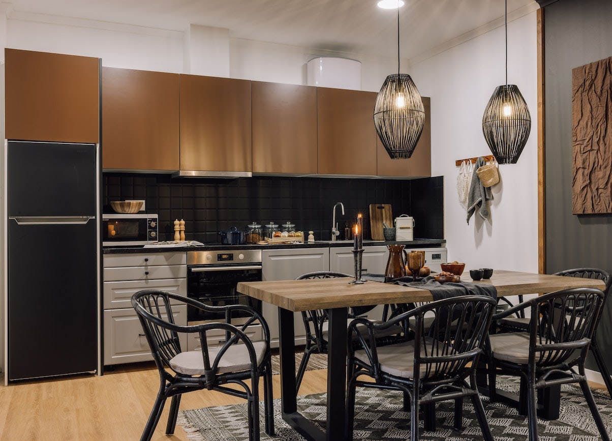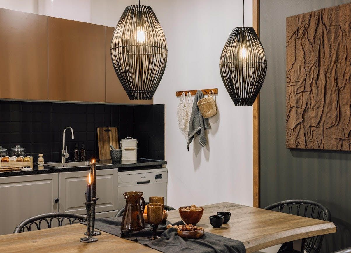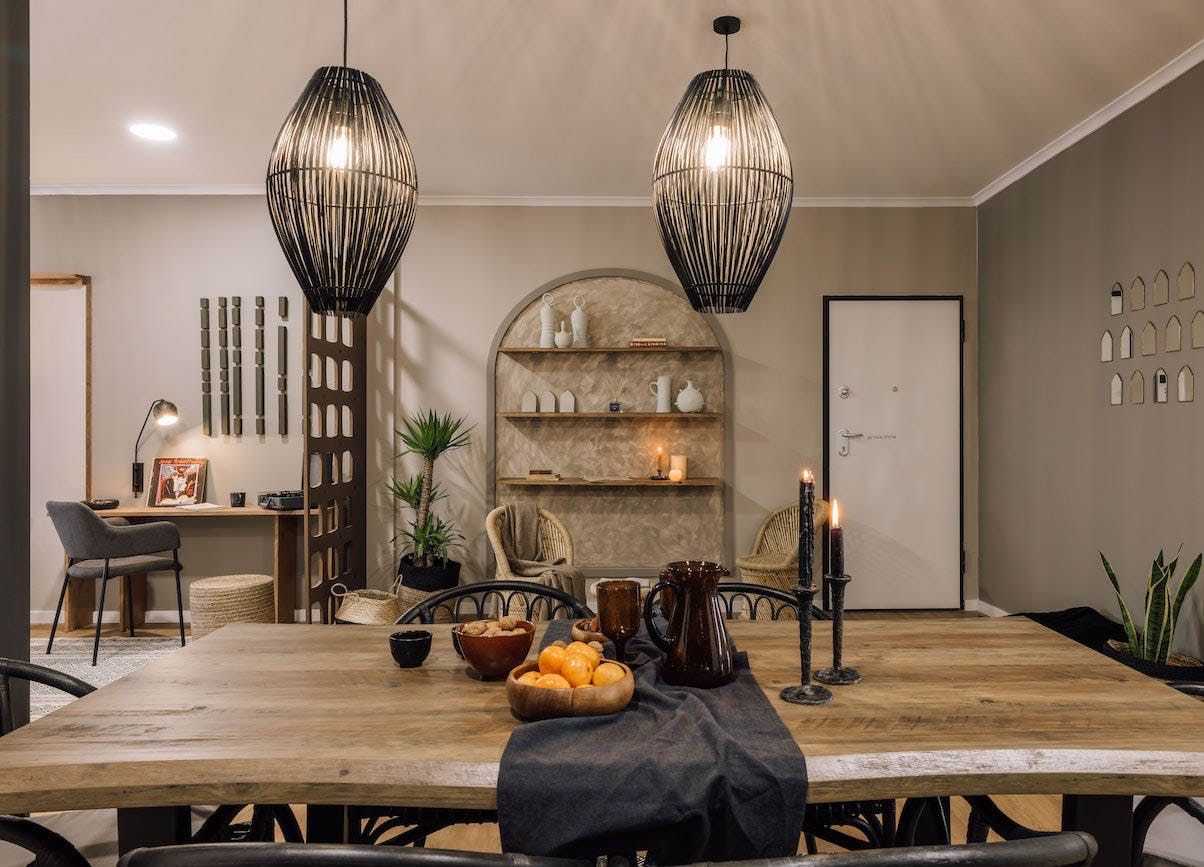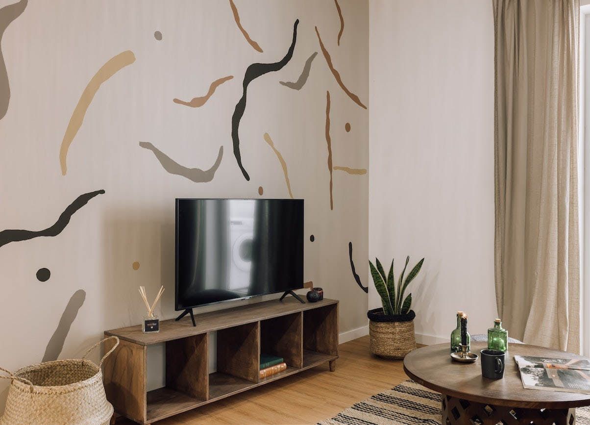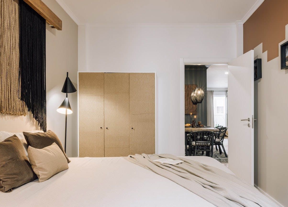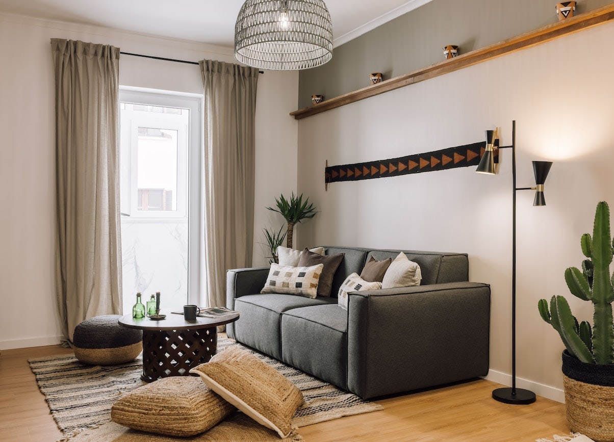 The open-concept living area is swathed in natural textures, rattan and wicker furnishings, and bespoke artworks. Open up the floor-to-ceiling windows as you fire off some project notes at your sleek desk before sharing pastéis de nata on the Juliet balcony. This is a tranquil space, with a plump sofa for sharing sangria and conversation and a stunning wooden dining table for enjoying memorable dinners under the ambient pendant lights. You’ll find the vinyl record player sets the tone for special gatherings, while the sanctuary-like bedrooms invite you into restful slumbers.
