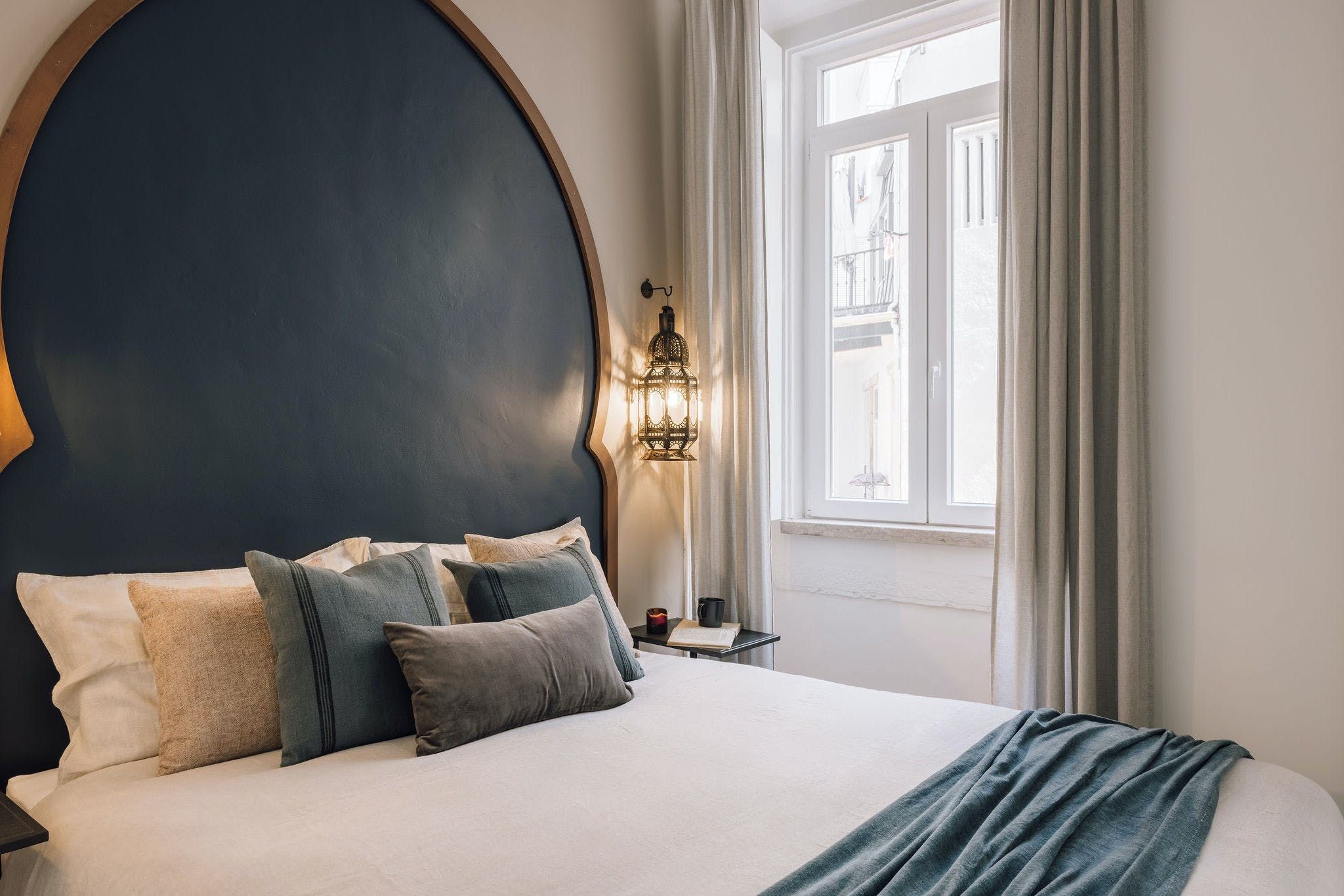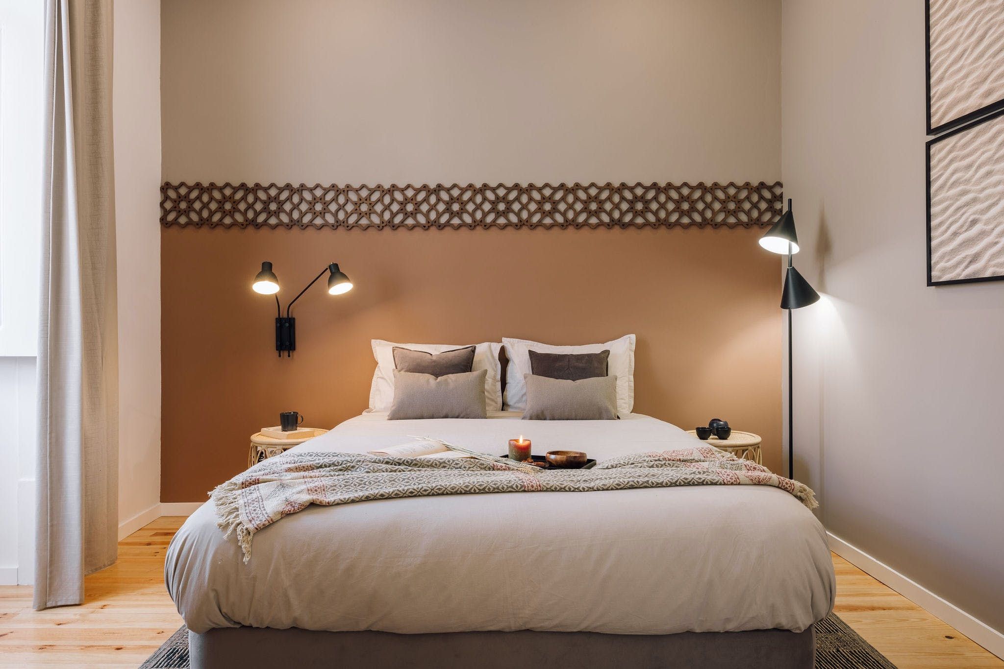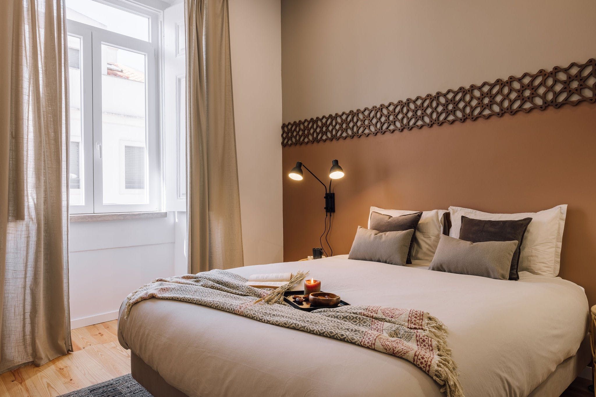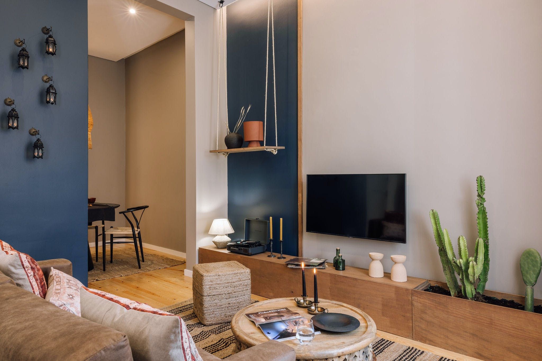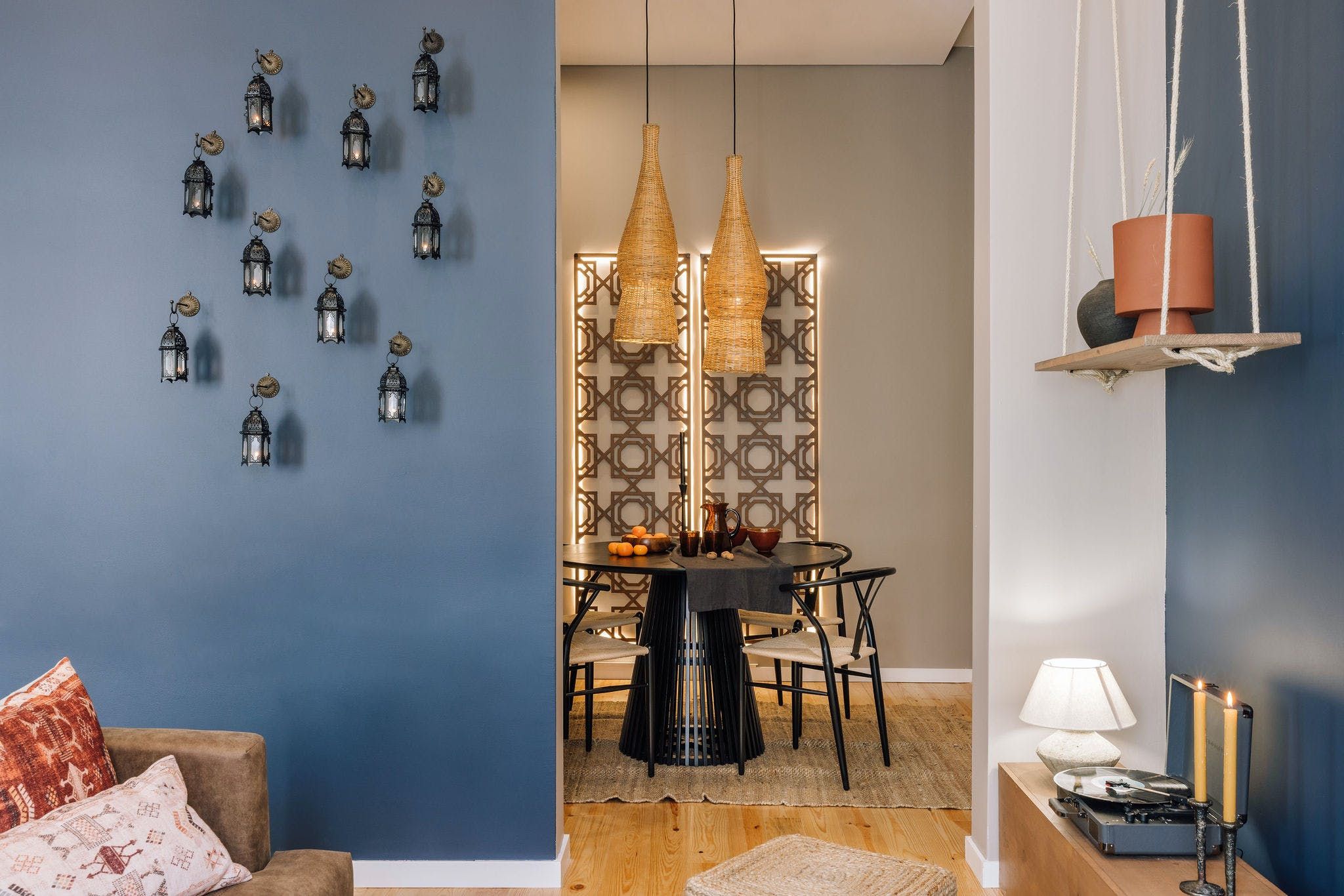 Back at this home, we love the Moroccan inspired flavour here. Think black metal lanterns and wooden carvings, as well as a rich blue and earthy colour palette – it's an atmospheric oasis. Open up the doors to the small balcony and let the fresh air in. Then, rustle up some chicken piri-piri in the modern kitchen, and afterwards, relax on the comfy sofa and have a few shots of ginja (sour cherry liqueur). There's a dedicated workstation, too, so you're covered if you need to work from home. This apartment is ideal for business professionals, a family, or two couples looking for a sought-after location.