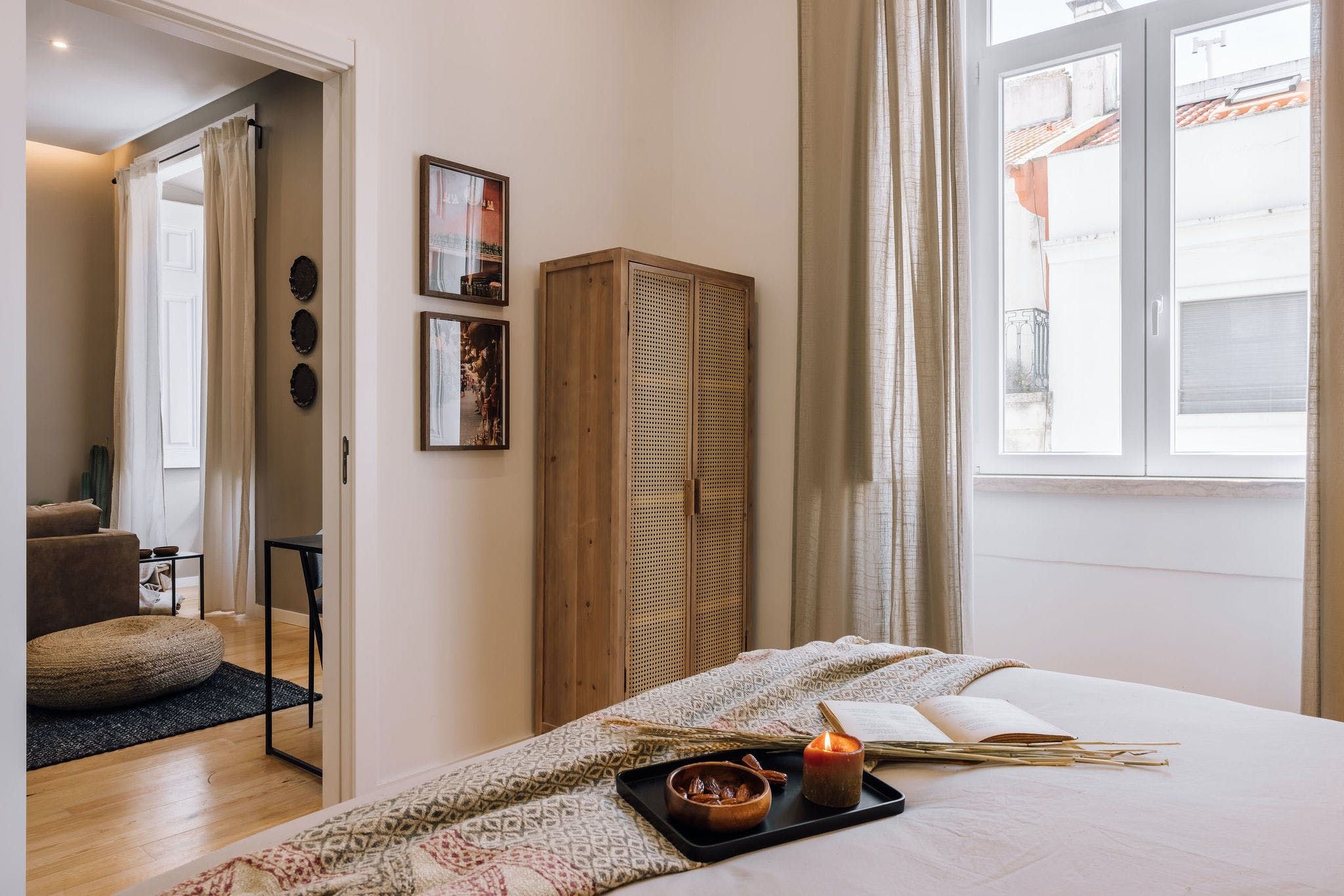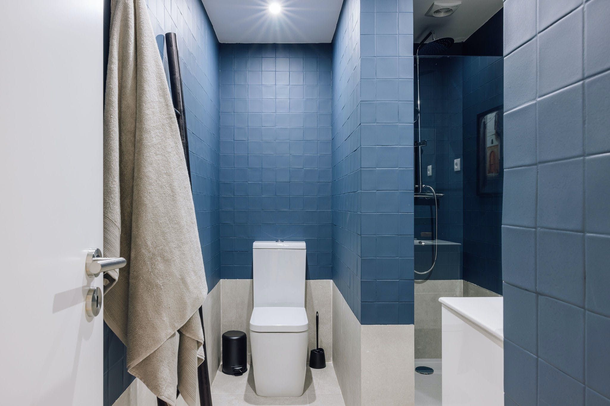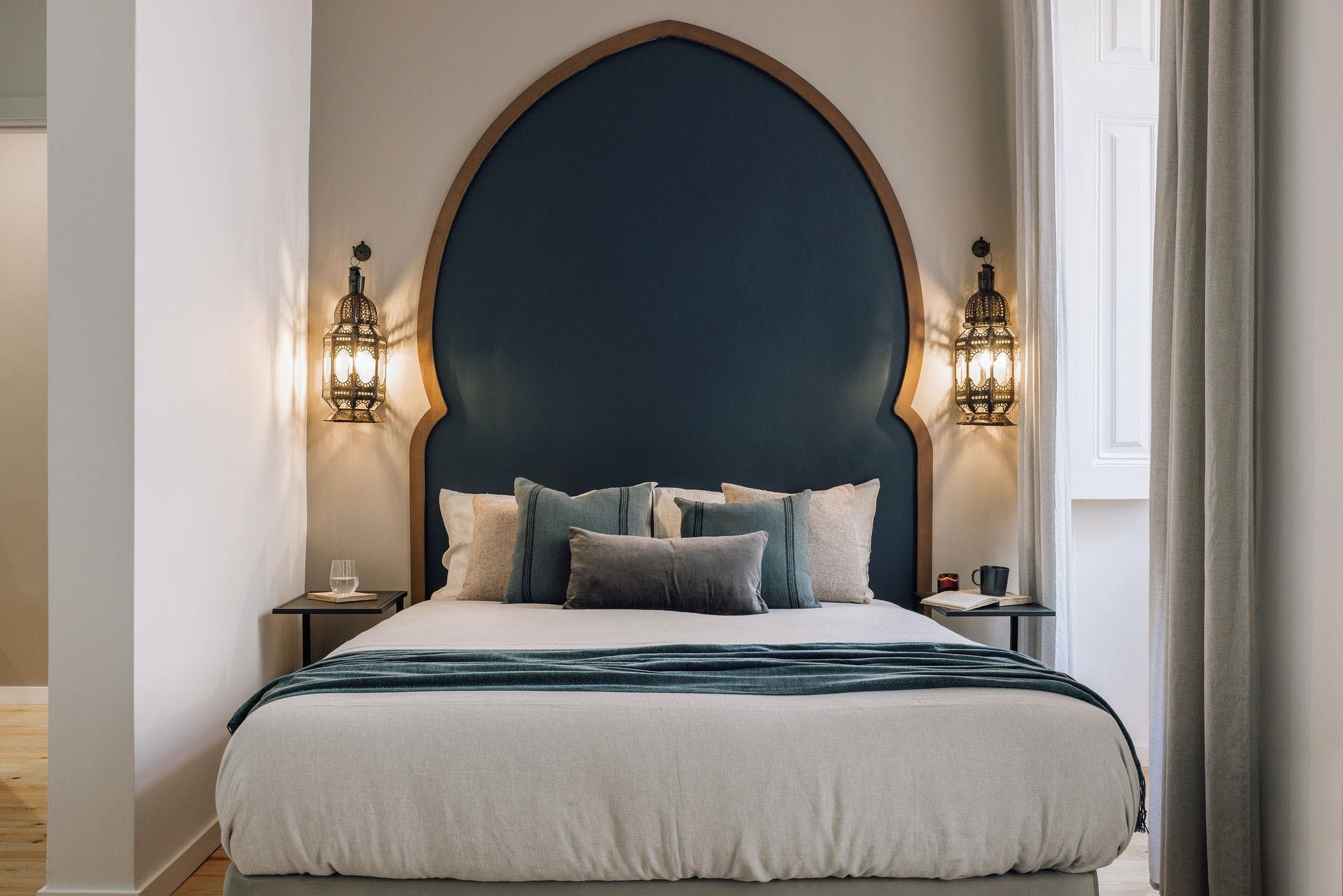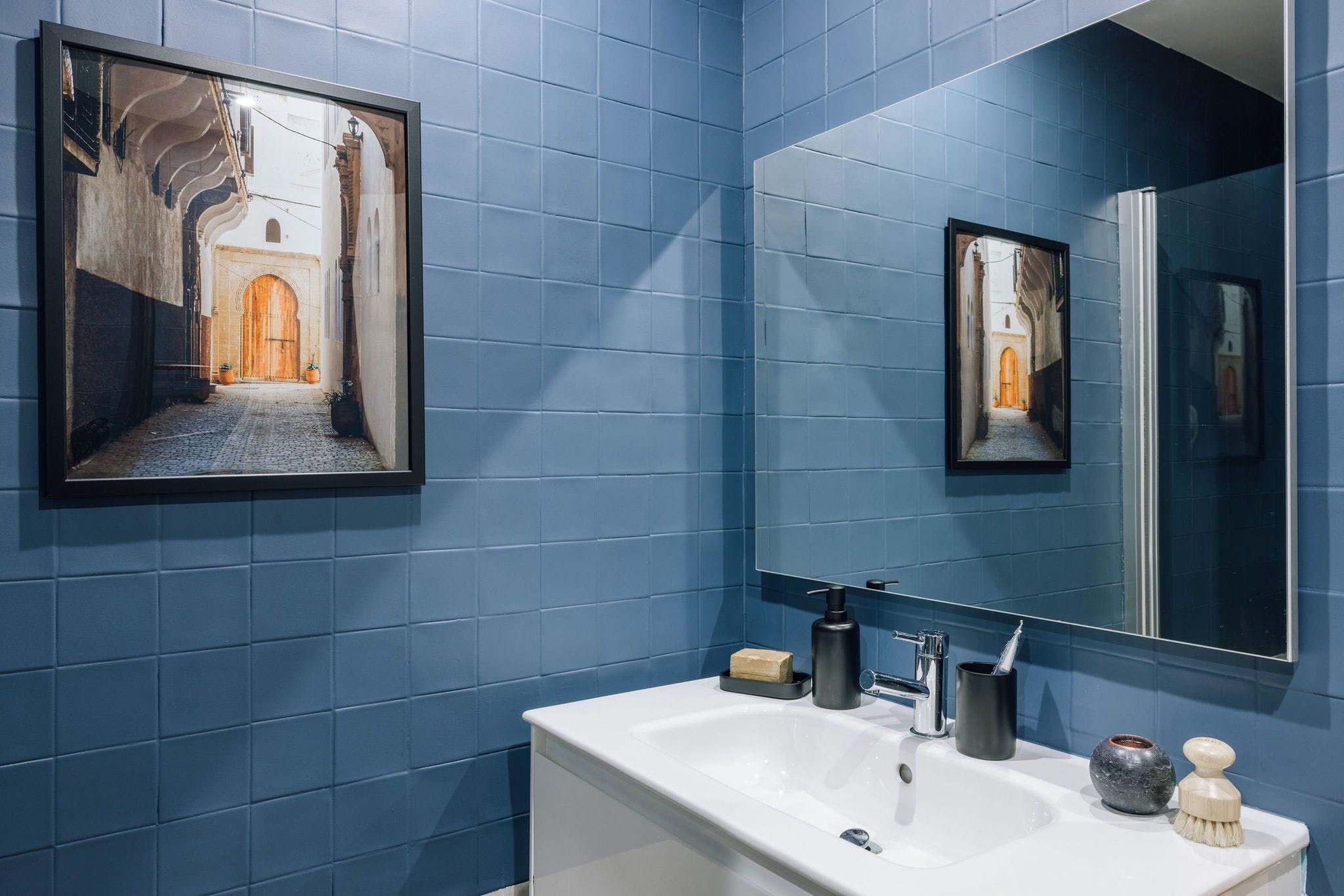 Back at this home, we love the Moroccan inspired flavour here. Think black metal lanterns and wooden carvings, as well as a rich blue and earthy colour palette – it's an atmospheric oasis. Open up the doors to the small balcony and let the fresh air in. Then, rustle up some chicken piri-piri in the modern kitchen, and afterwards, relax on the comfy sofa and have a few shots of ginja (sour cherry liqueur). There's a dedicated workstation, too, so you're covered if you need to work from home. This apartment is ideal for business professionals, a family, or two couples looking for a sought-after location.