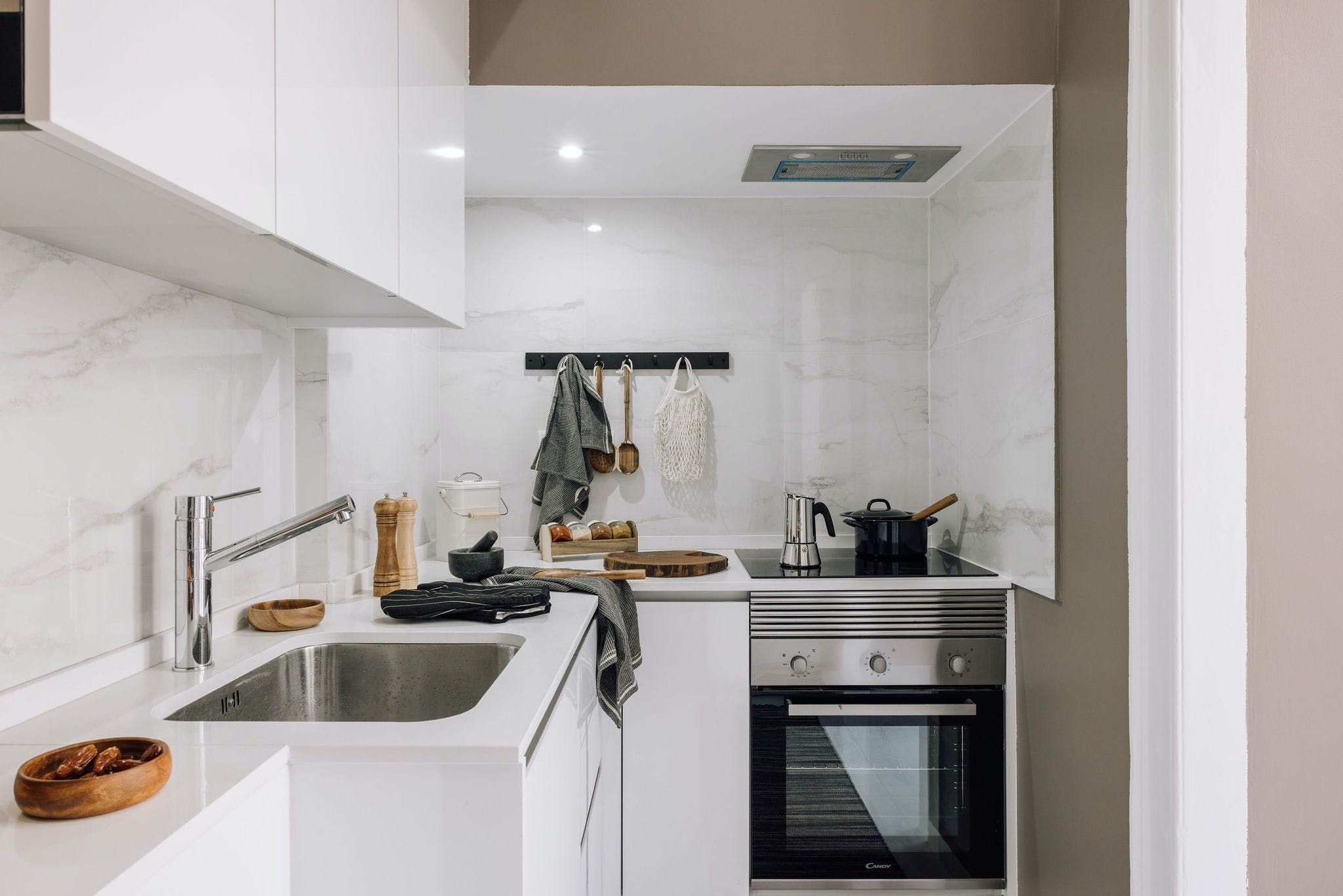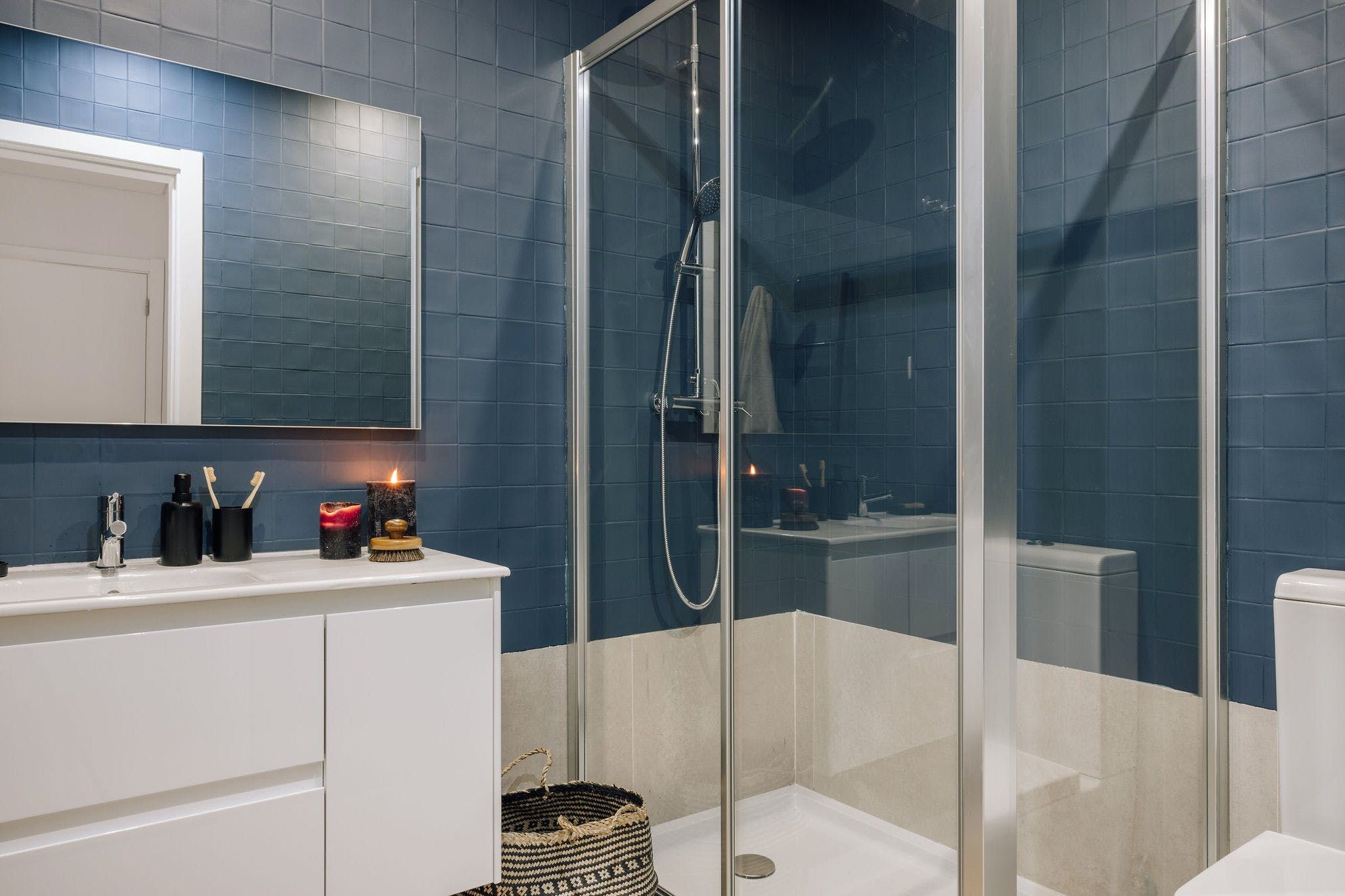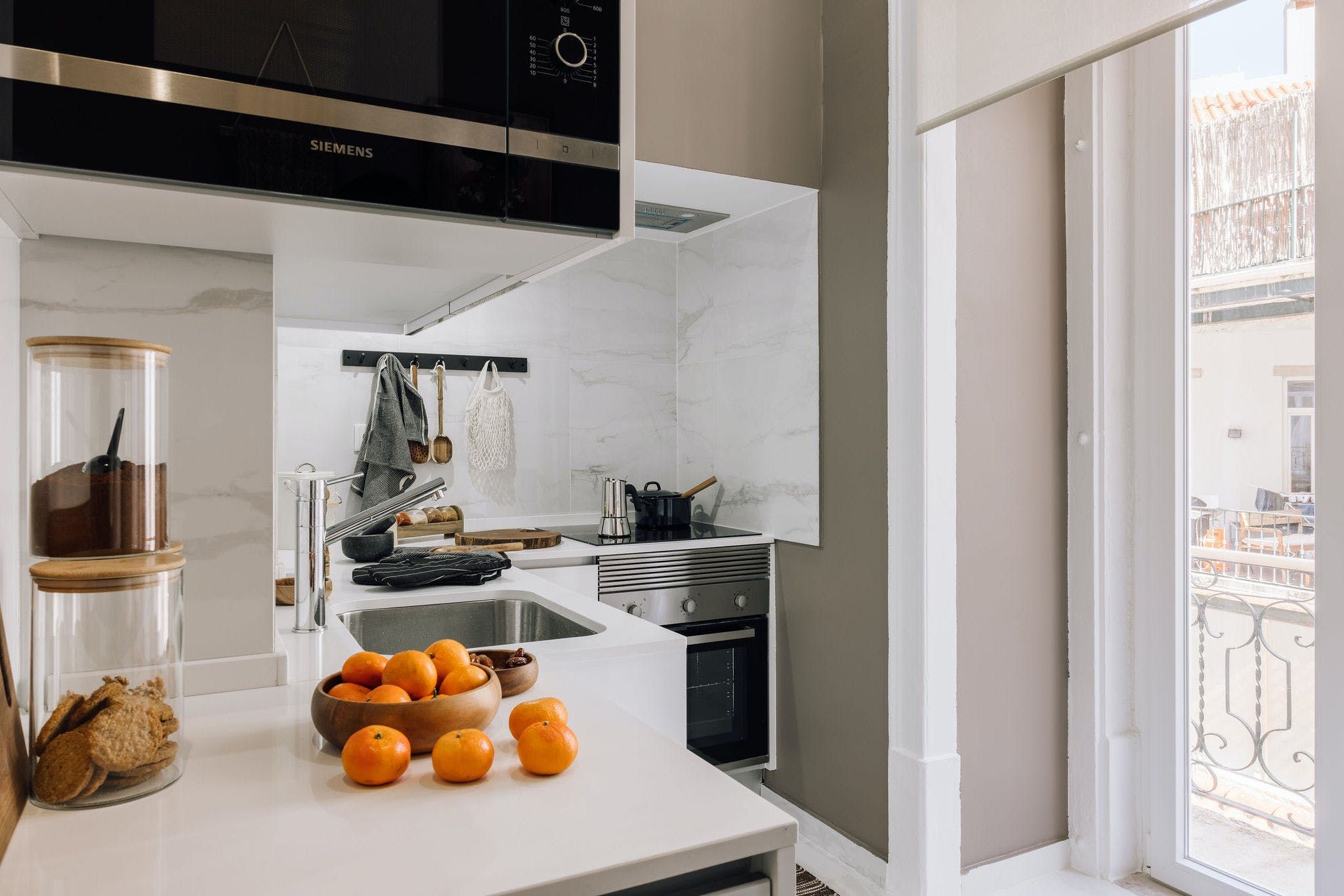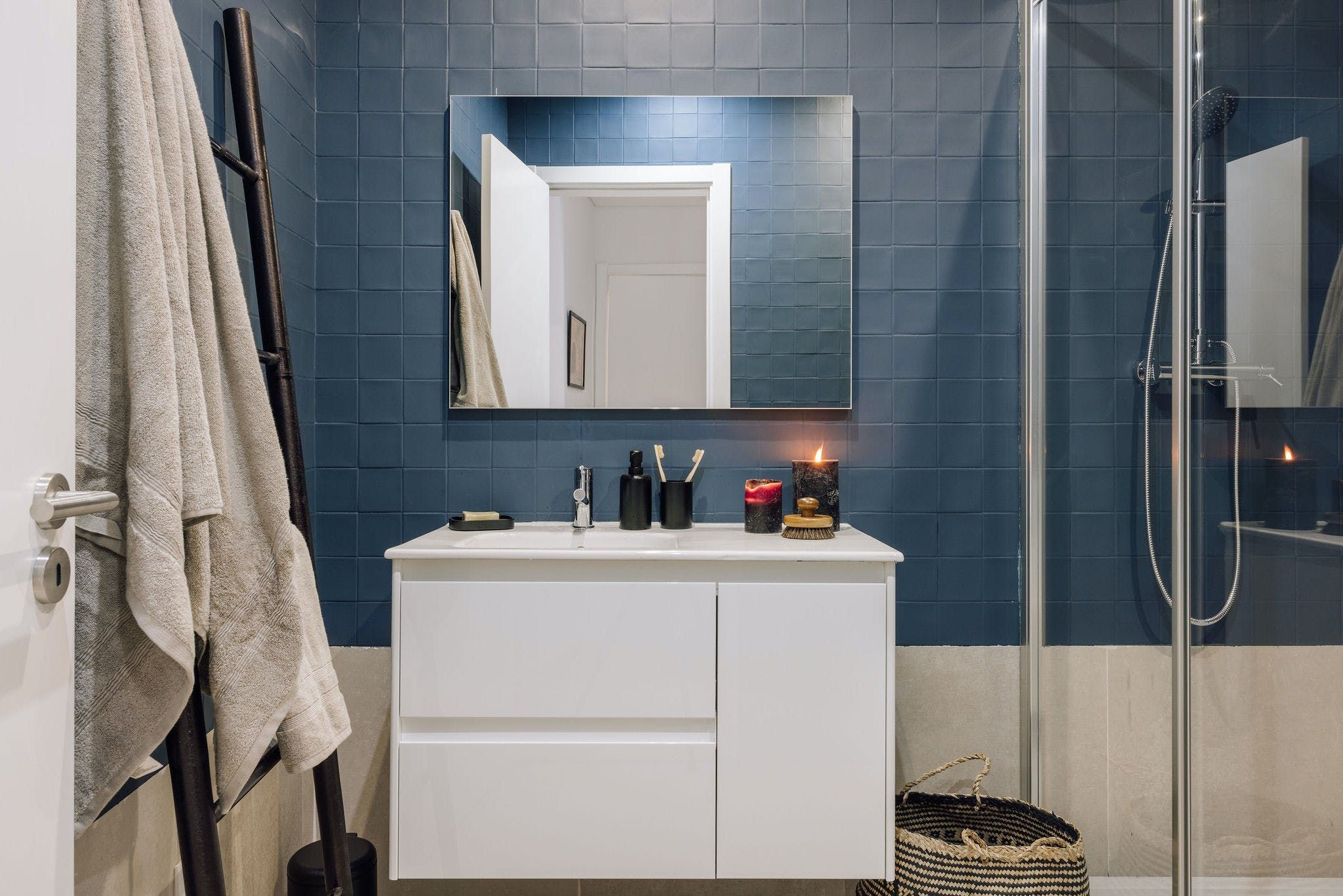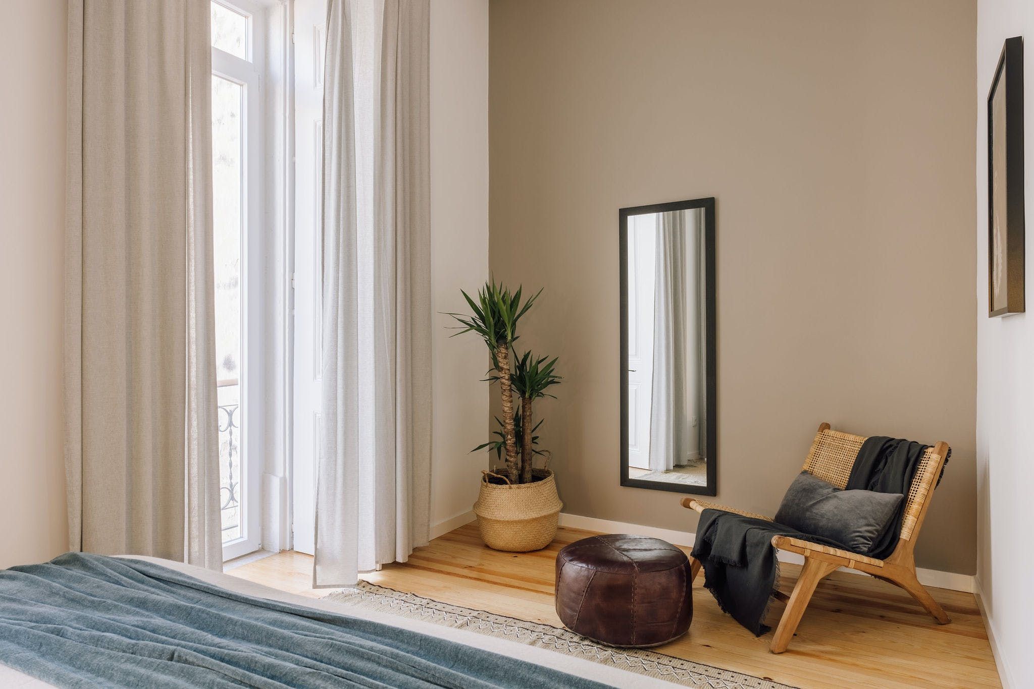 Back at this home, we love the Moroccan inspired flavour here. Think black metal lanterns and wooden carvings, as well as a rich blue and earthy colour palette – it's an atmospheric oasis. Open up the doors to the small balcony and let the fresh air in. Then, rustle up some chicken piri-piri in the modern kitchen, and afterwards, relax on the comfy sofa and have a few shots of ginja (sour cherry liqueur). There's a dedicated workstation, too, so you're covered if you need to work from home. This apartment is ideal for business professionals, a family, or two couples looking for a sought-after location.