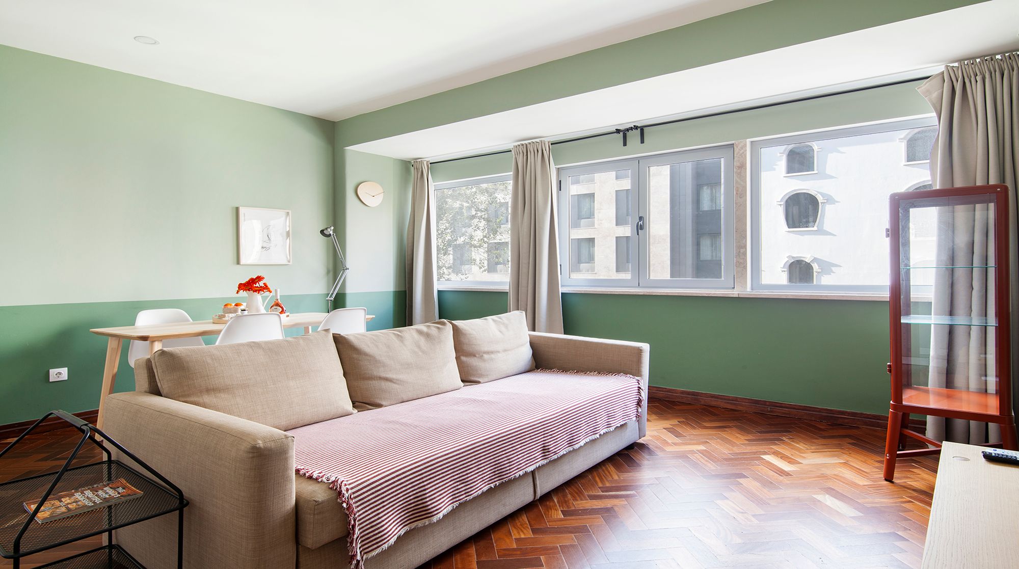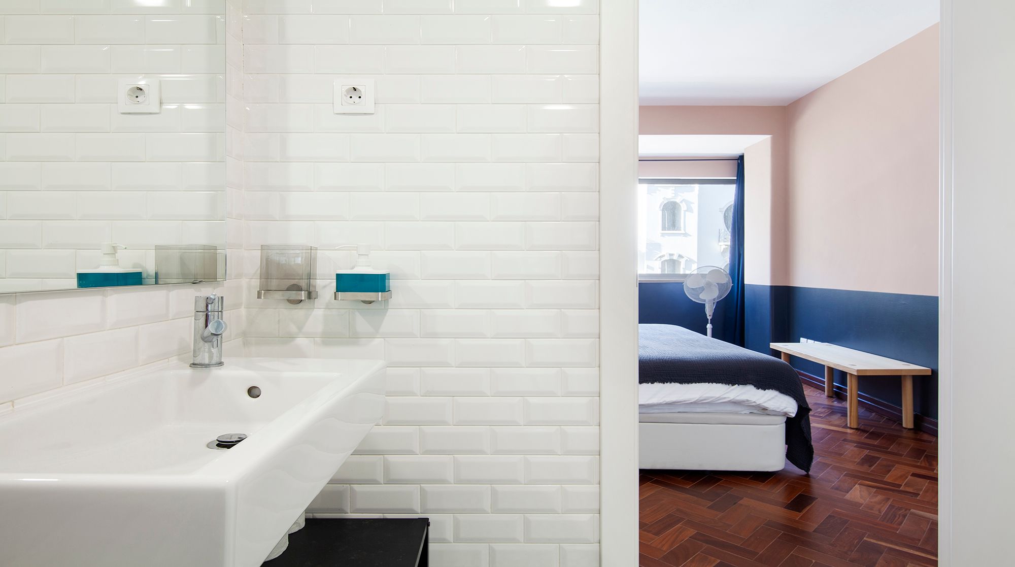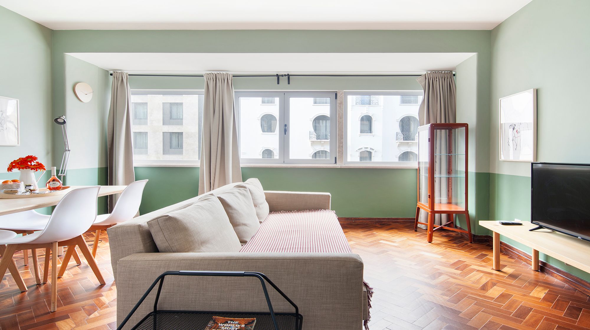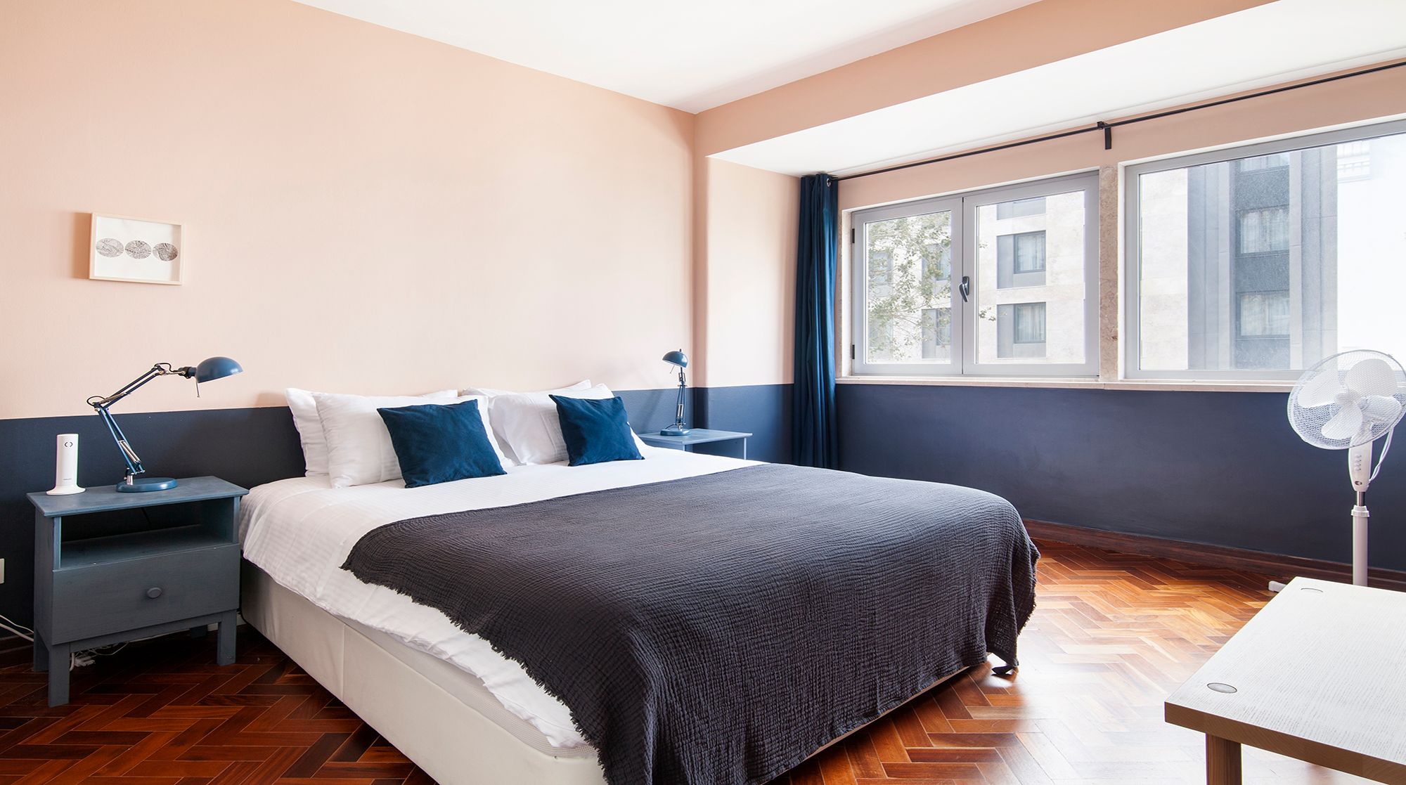 You’ll be just a nine-minute walk from Lisbon’s prime shopping destination – Avenida da Liberdade – but if you’d rather peruse the gardens than the shops, Parque Eduardo VII is an easy five-minute walk away and the perfect spot for morning strolls. Back at home, you’ll find a calming two-tone mint palette that complements the gorgeous herringbone floors. The furniture is simple and cosy, and the space gets plenty of light from the large front windows. We especially love the large communal courtyard, with an abundance of tables for alfresco meals or evening cocktails with friends. And when it’s time for bed, you’ll find the colour scheme shifts from mint to a sleepier navy, lulling you into peaceful dreams of the city.