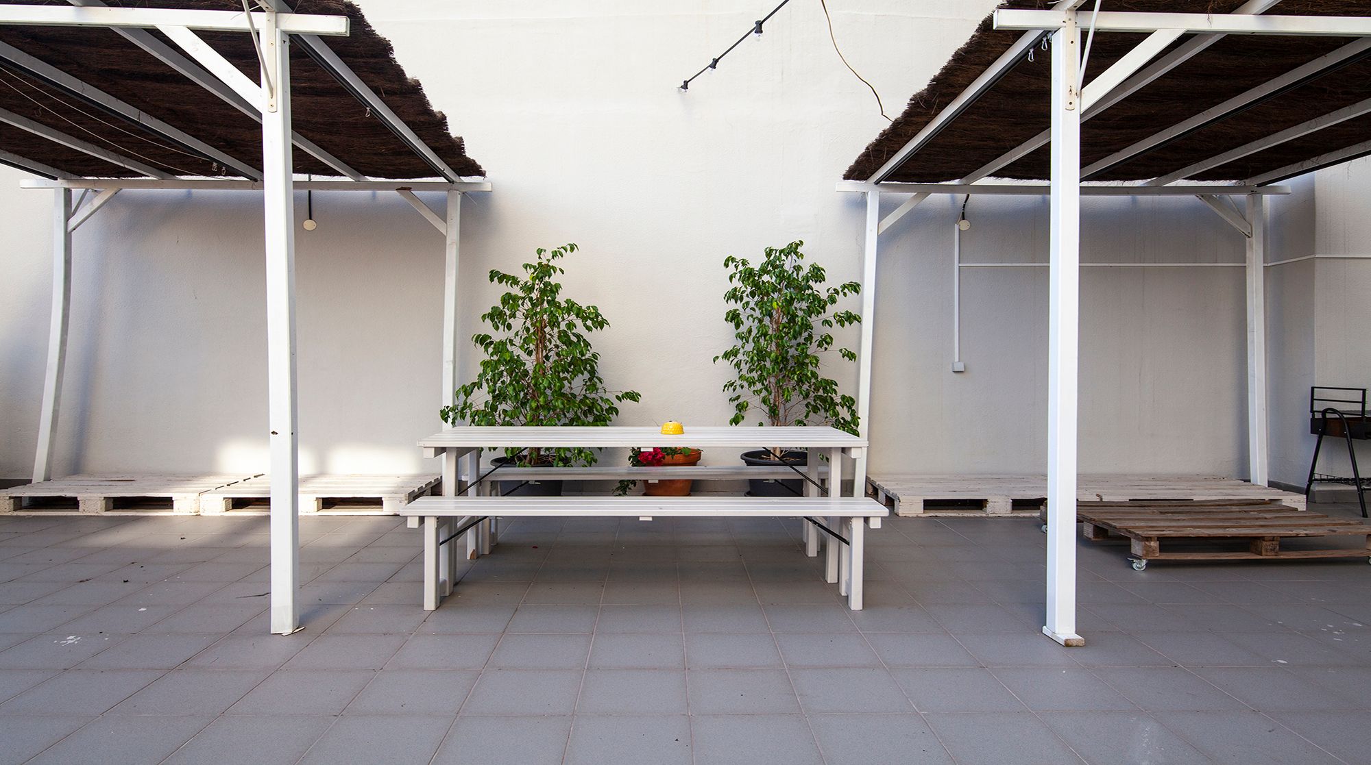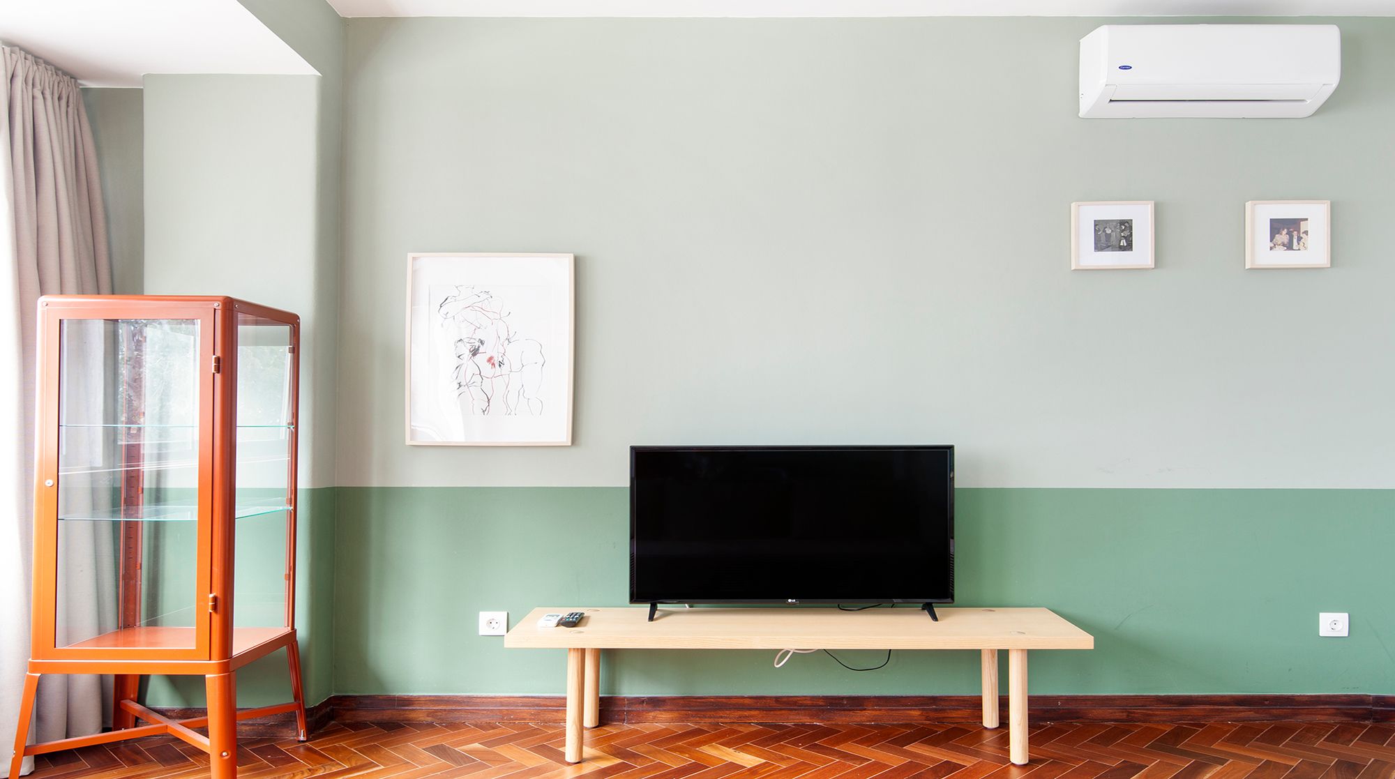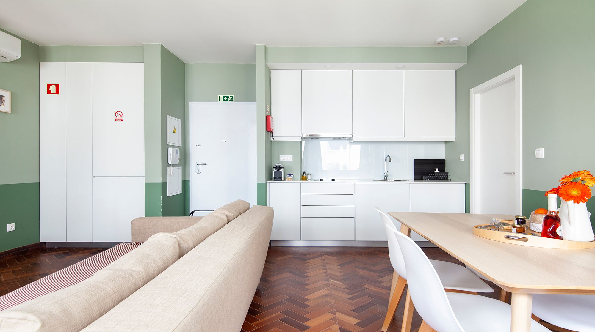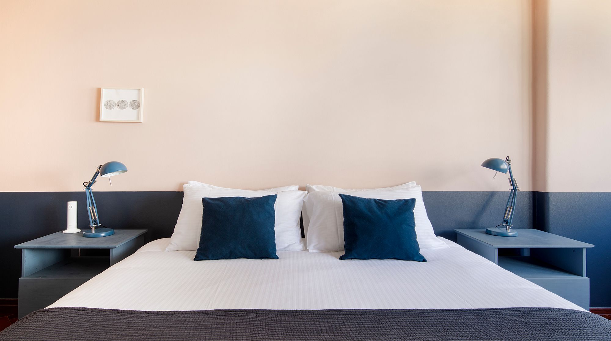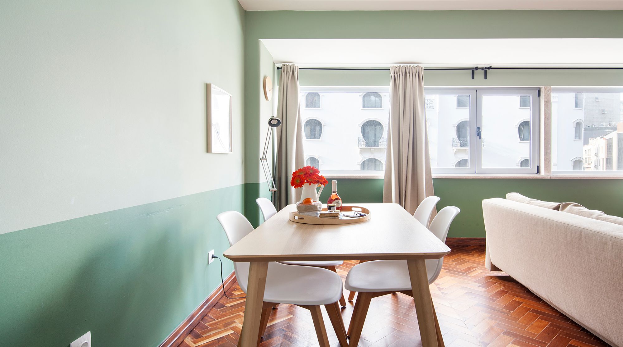 You’ll be just a nine-minute walk from Lisbon’s prime shopping destination – Avenida da Liberdade – but if you’d rather peruse the gardens than the shops, Parque Eduardo VII is an easy five-minute walk away and the perfect spot for morning strolls. Back at home, you’ll find a calming two-tone mint palette that complements the gorgeous herringbone floors. The furniture is simple and cosy, and the space gets plenty of light from the large front windows. We especially love the large communal courtyard, with an abundance of tables for alfresco meals or evening cocktails with friends. And when it’s time for bed, you’ll find the colour scheme shifts from mint to a sleepier navy, lulling you into peaceful dreams of the city.