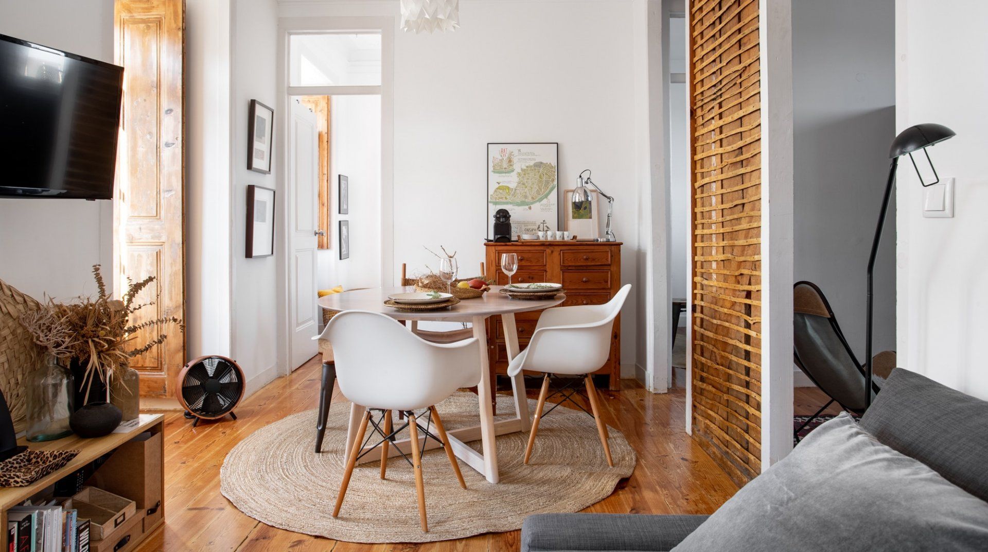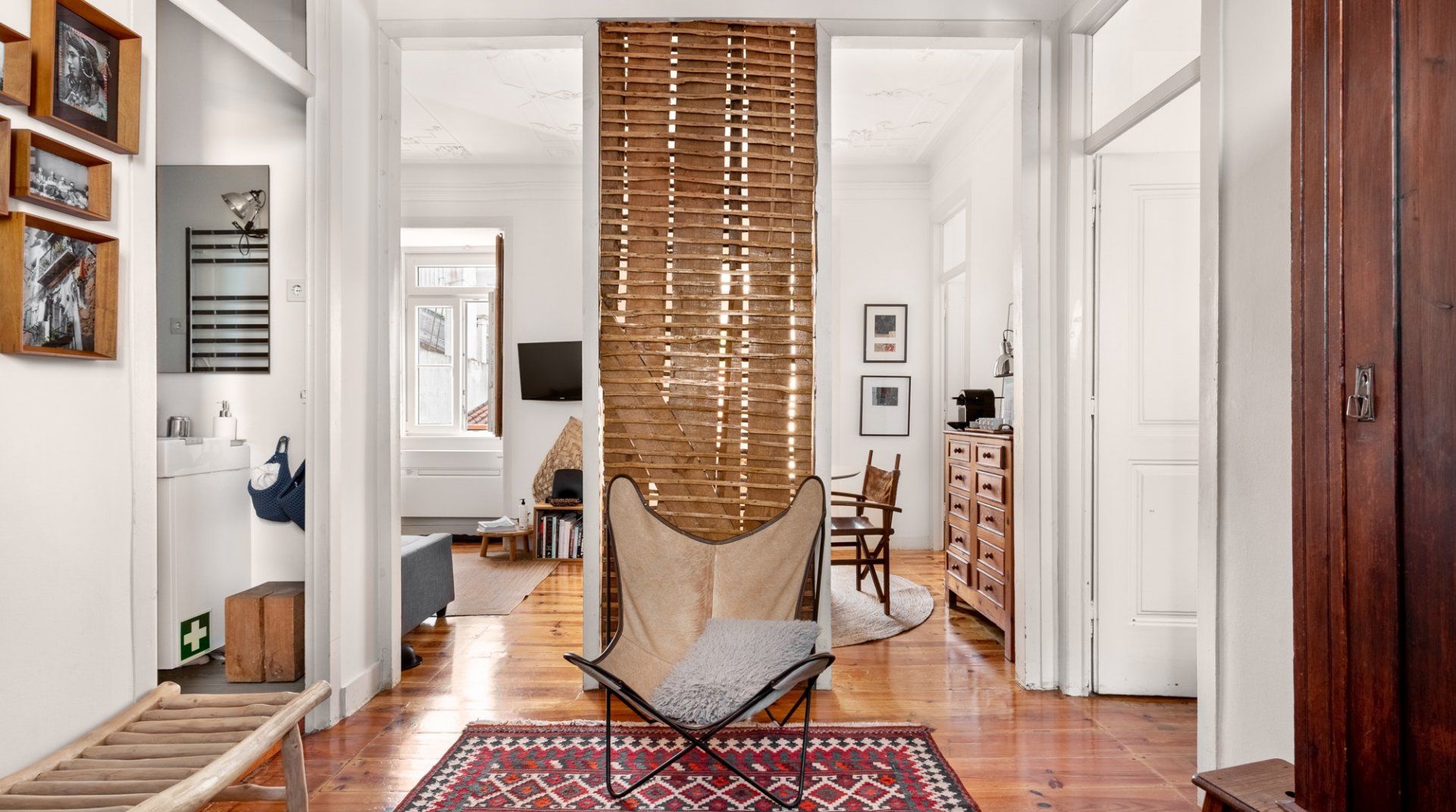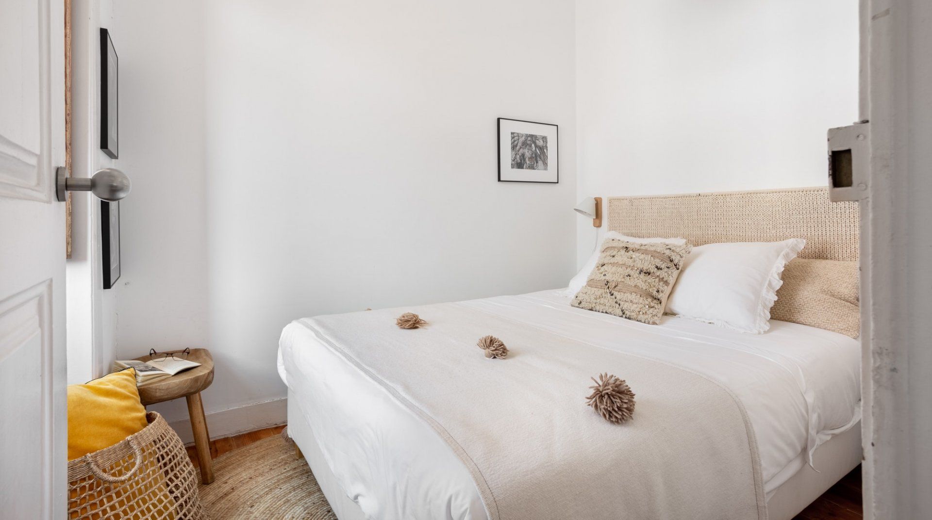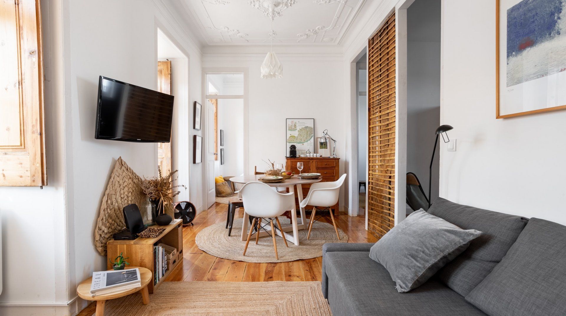 Housed in a historic building in Lisbon’s peaceful, hilly Lapa neighbourhood, this bright apartment is the ideal base for those looking to experience a more local side of the city. Inside, wood floors, corniced ceilings and French doors leading onto a Juliet balcony create an elegant first impression, while the laid-back bohemian furnishings make you instantly feel welcome and relaxed. We love the sunny dining area here, perfect for starting mornings off over breakfast as the breeze flows through the doors, and the cosy kitchen area with its blackboard wall. The bedrooms feel soothing in their neutral, natural tones, while the large windows give way to views of the Tagus River and the city's emblematic red rooftops. . When you’re not relaxing at home, go out and explore your surroundings. You’re just a ten-minute walk from the beautiful Estrela Gardens, while a twenty-minute stroll will take you to the famous Time Out Market Lisboa. You’re also just a twenty-minute walk from the bohemian Bairro Alto district, where cobblestone streets house centuries-old houses, vivid street art and traditional Fado bars that wait to be discovered.