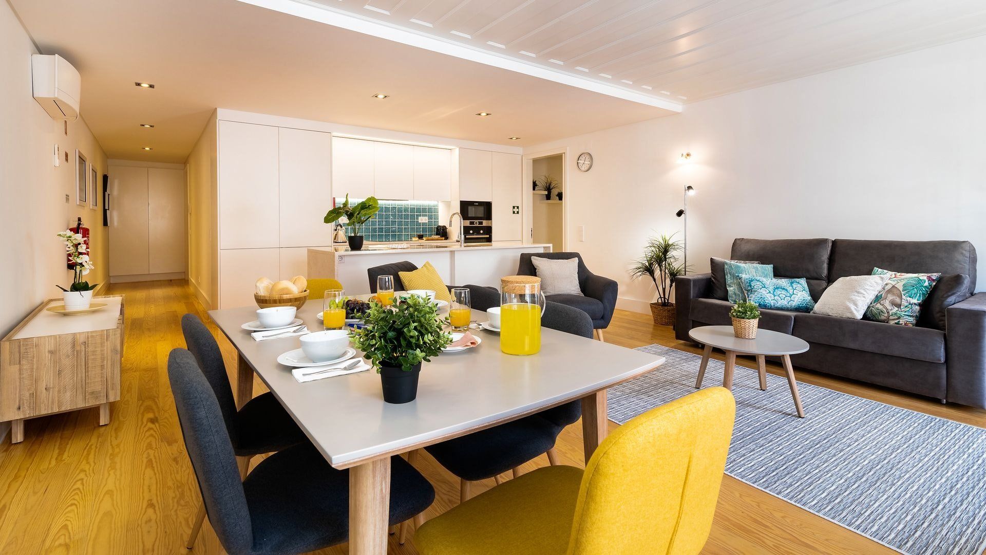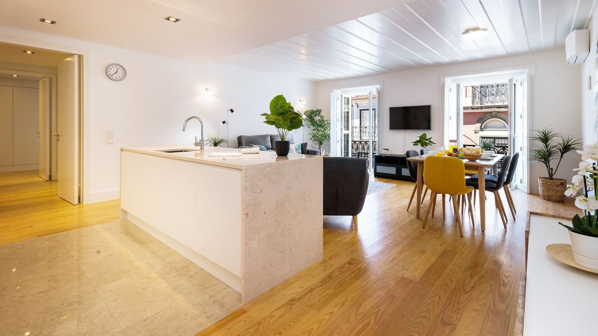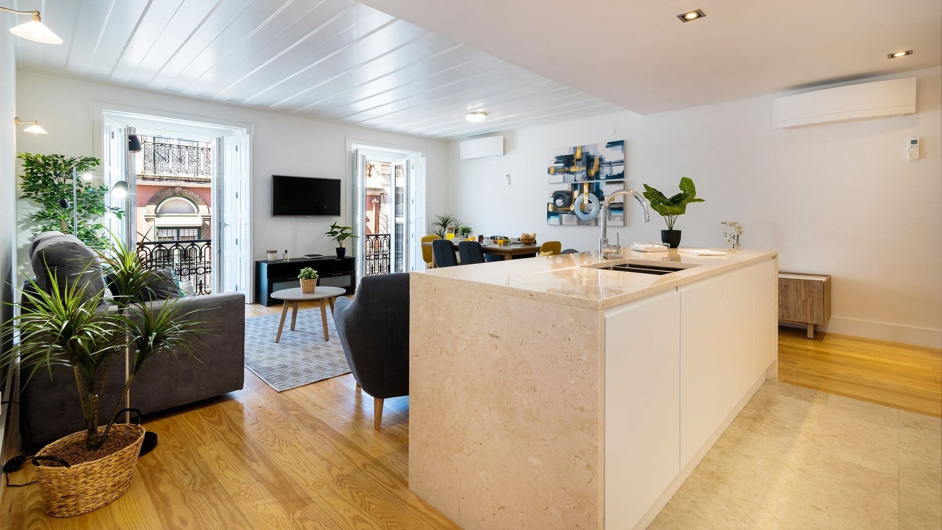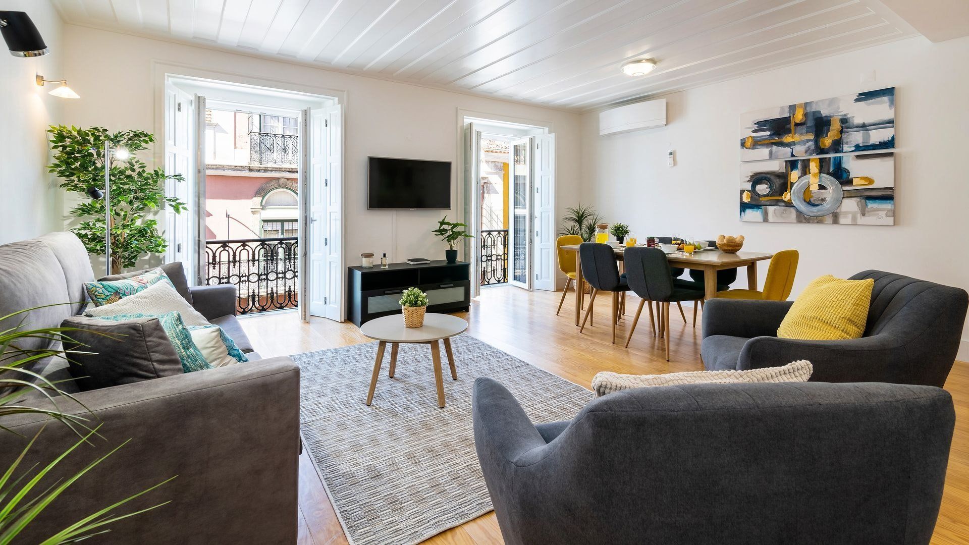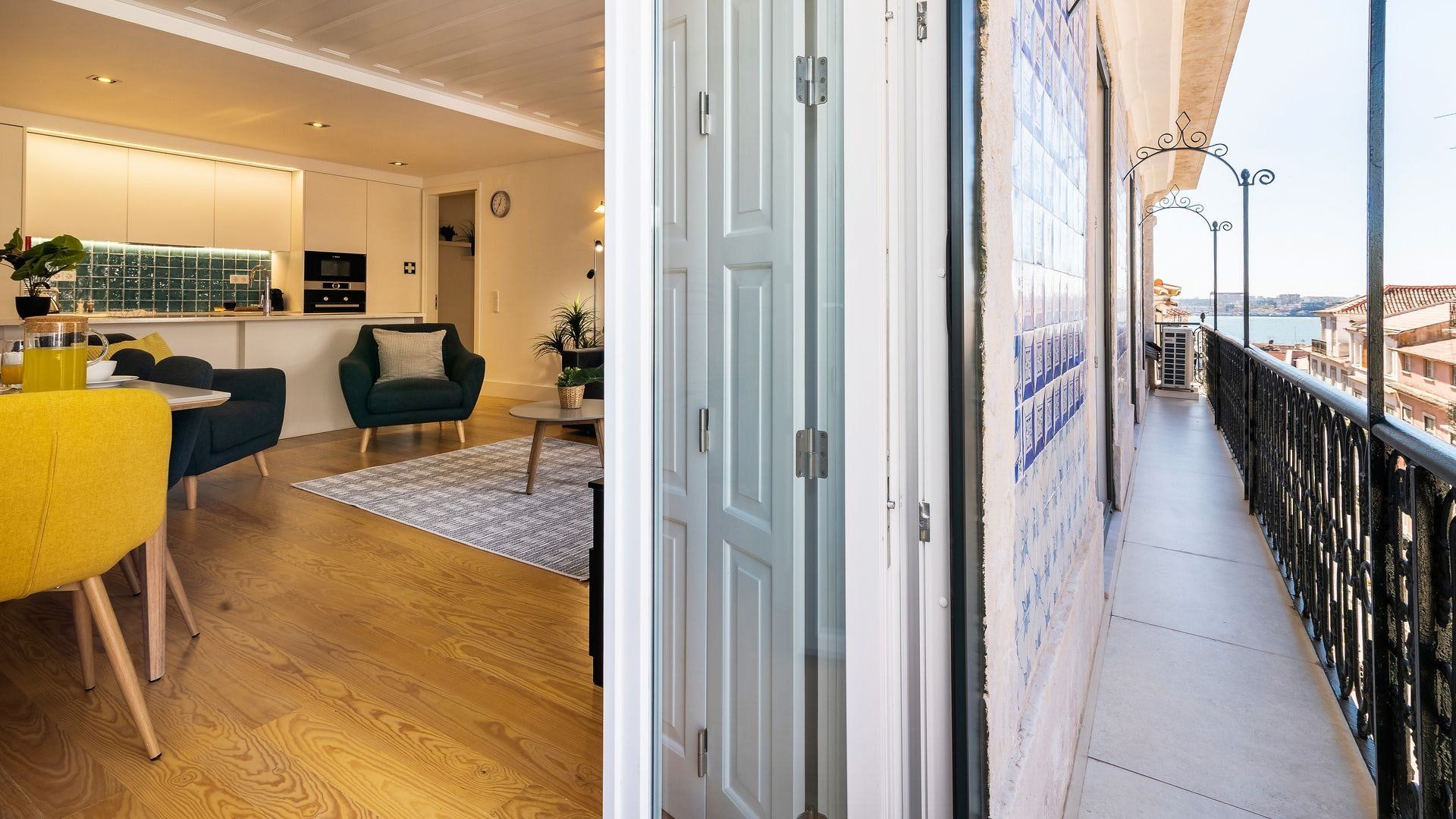 Take in the fabulous views over sought-after Chiado and the River Tagus with a glass of rosé wine when you stay at this home – we love the traditional tiles out here on the balcony. Inside, there are warm wood floors, window shutters, modern artworks and an array of plants creating a stylish interior. Two sets of French doors allow light to flood in, and there's plenty of entertaining space in the large open plan living area for your family or friends.
