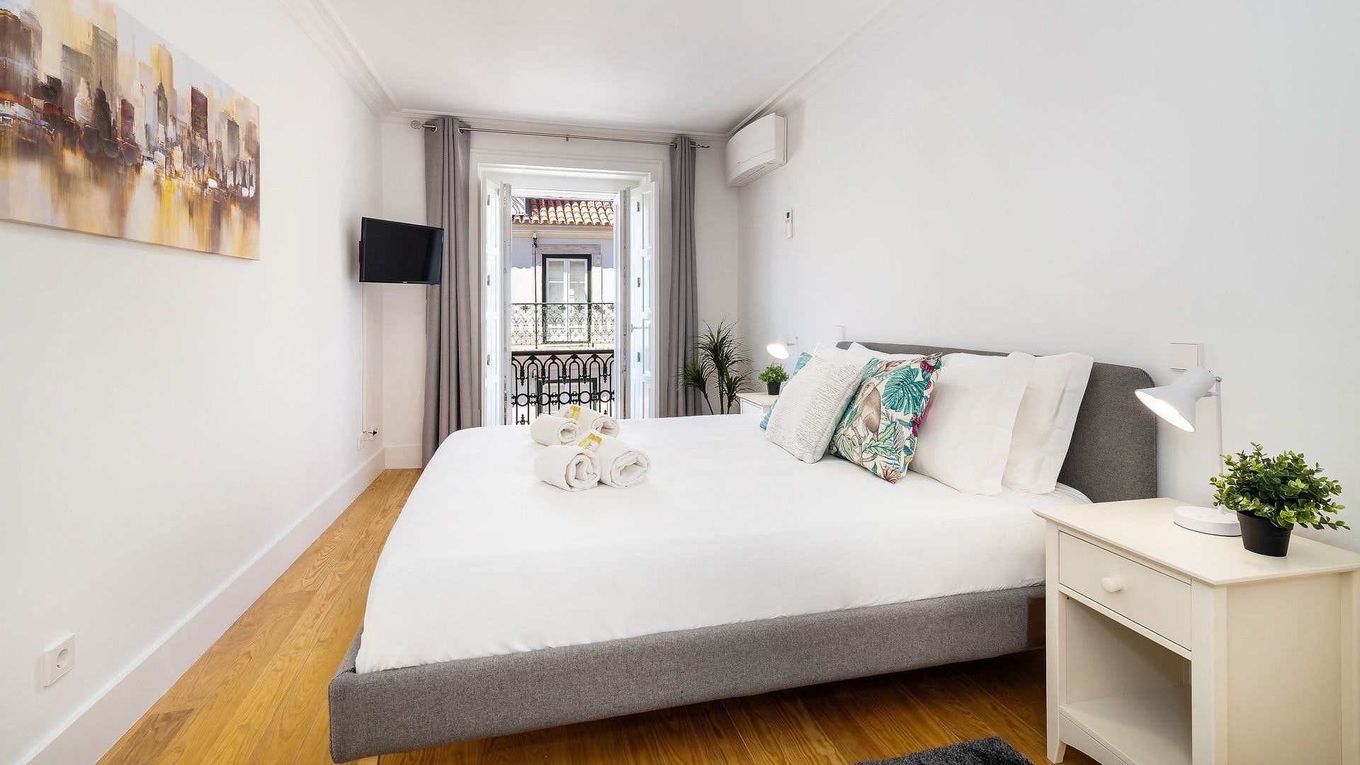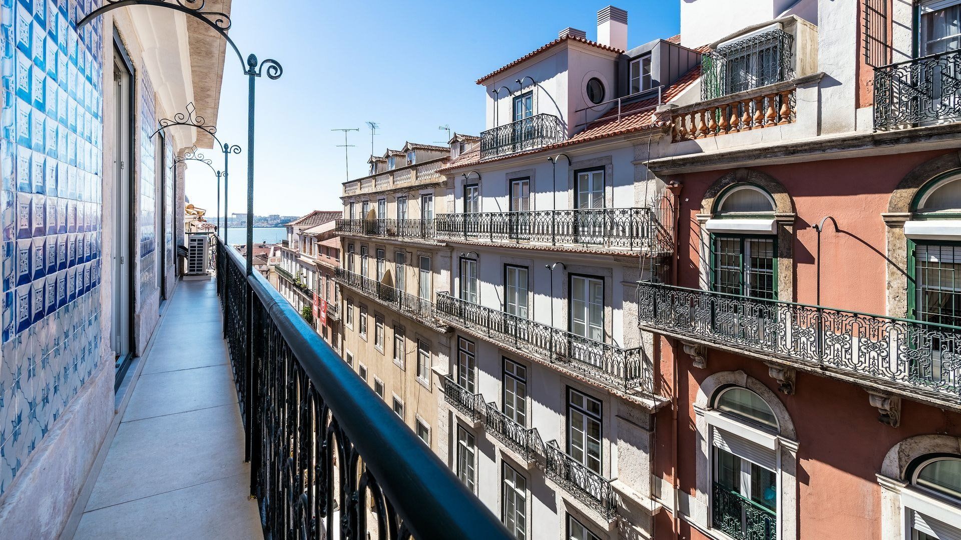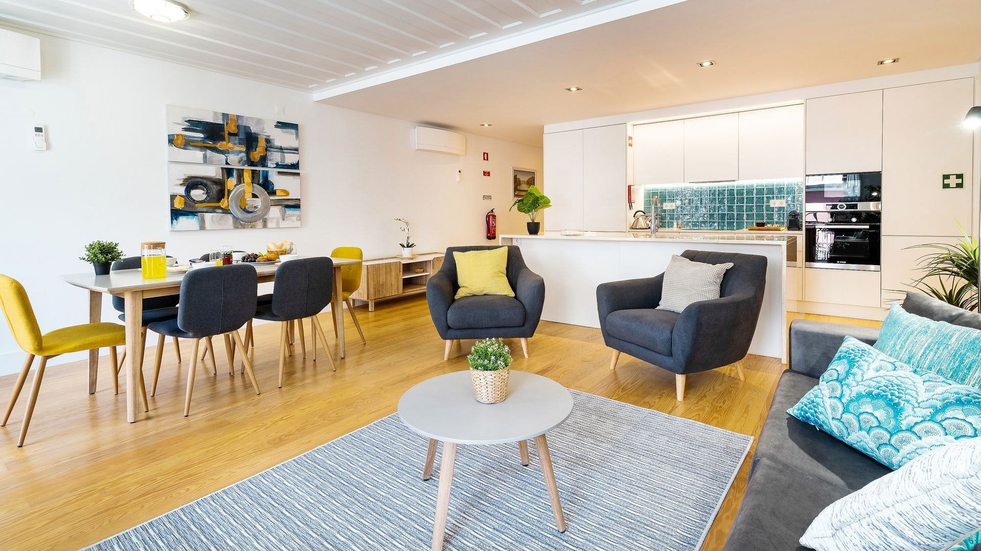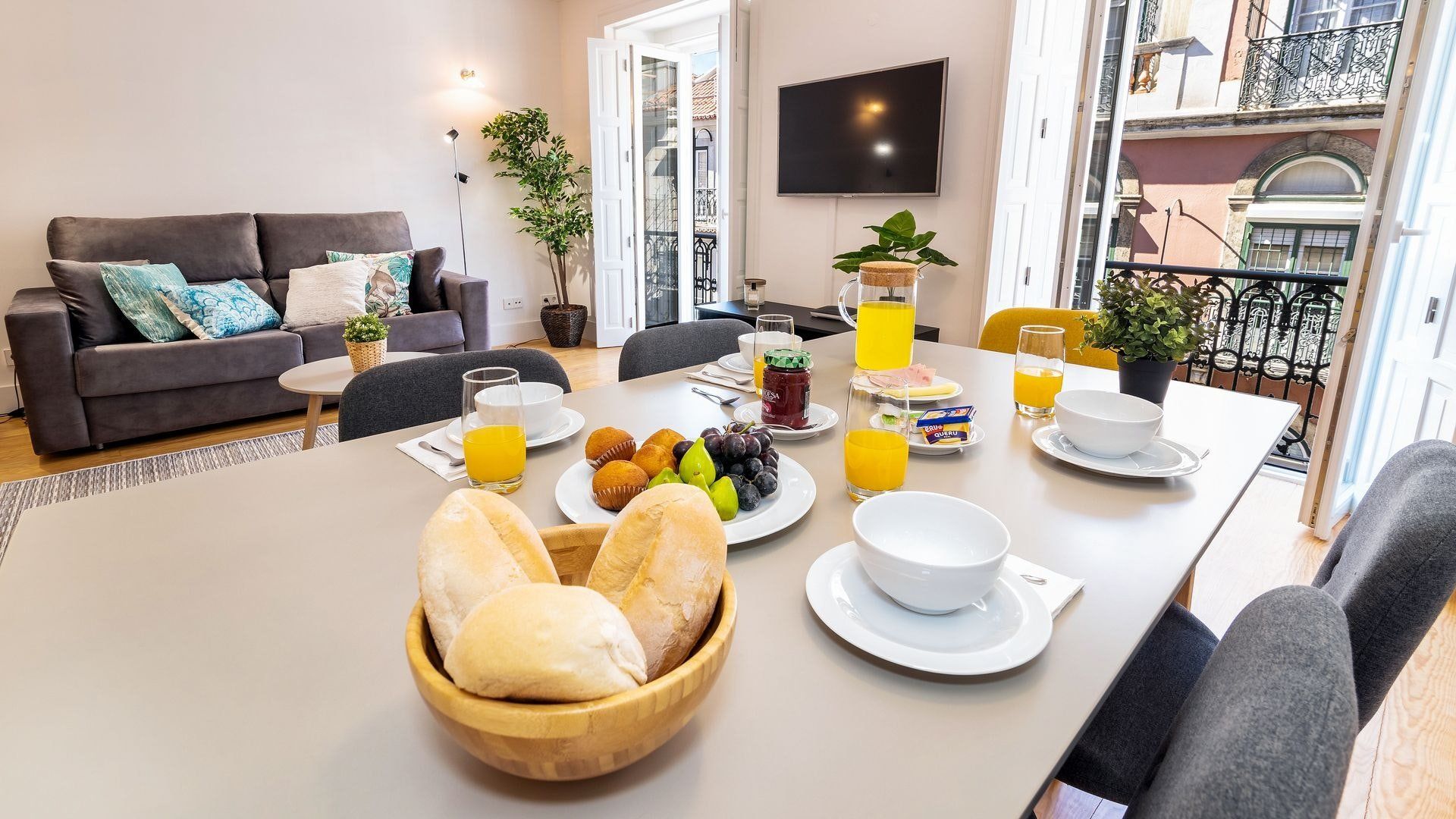 Take in the fabulous views over sought-after Chiado and the River Tagus with a glass of rosé wine when you stay at this home – we love the traditional tiles out here on the balcony. Inside, there are warm wood floors, window shutters, modern artworks and an array of plants creating a stylish interior. Two sets of French doors allow light to flood in, and there's plenty of entertaining space in the large open plan living area for your family or friends.