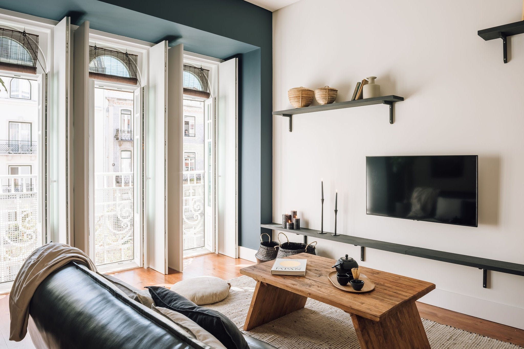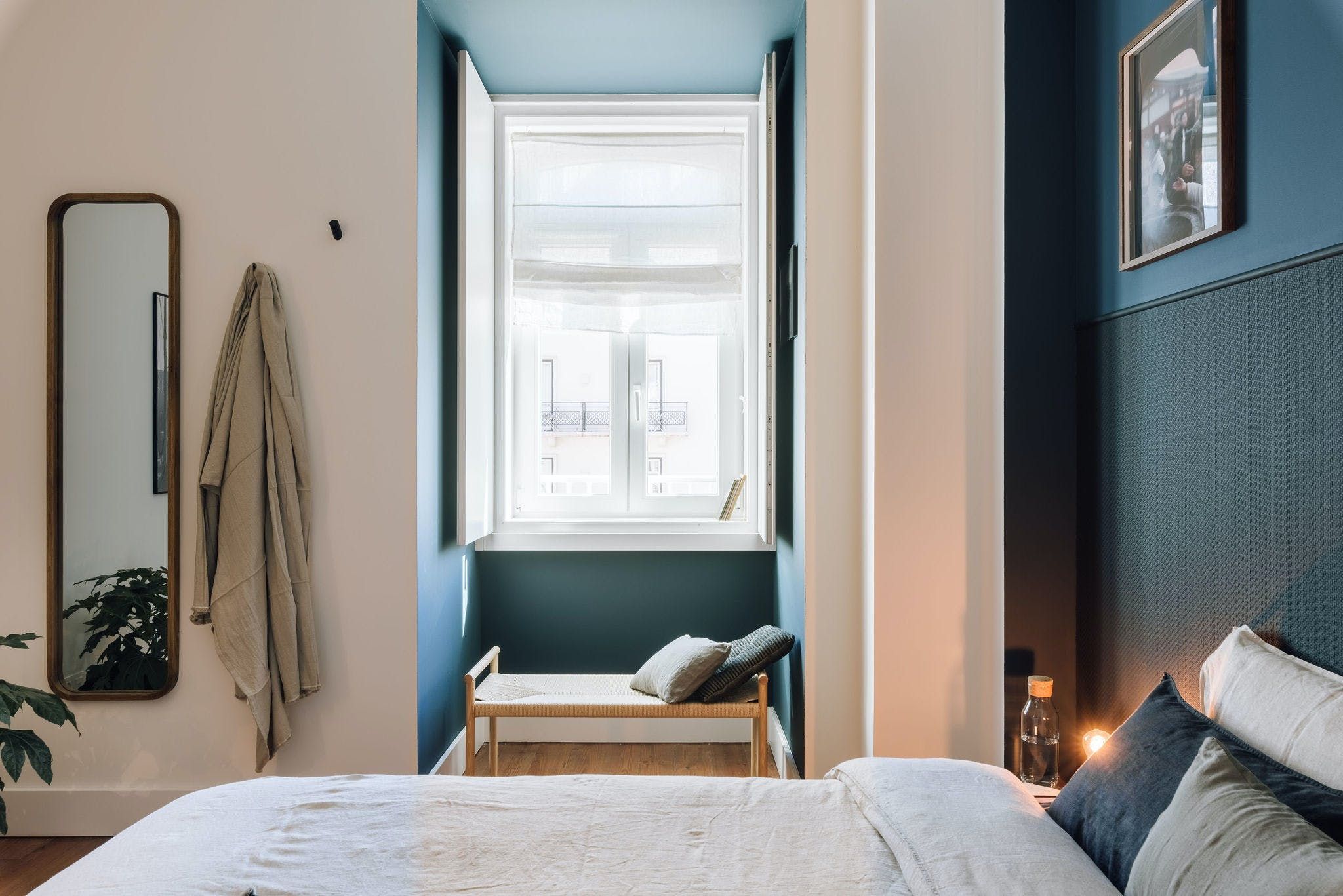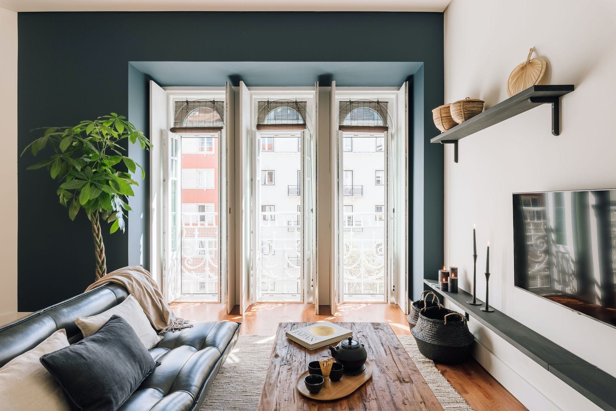 Inspired by the serene beauty of mountain landscapes, this bright apartment just a fourteen-minute walk from Avenida da Liberdade provides a calm and relaxing stay away from the crowds. Cool mineral tones set the scene in the main room, with a trio of French doors giving way to the stunning white Juliet balconies. Start mornings perched here with your coffee and a fresh pasteis de nata while people-watching from your privileged position, or enjoy a glass of wine as you watch the hustle and bustle at twilight. We love the contemporary bohemian decor in this home, from the rattan ornaments to the wooden furnishings and houseplants that lend the whole space an elegant laid-back vibe. There’s a desk nook should you need to catch up on work, while the bedroom beckons a blissful night’s sleep and a cosy wake-up with its bright window seat – ideal for cosying up with a good book. Factor in your access to the building's communal swimming pool and you have everything you need for a dreamy city stay. Outside of your home, the wonderfully manicured Parque Eduardo VII is an eight-minute walk away, the Saúde Museum is an eleven-minute stroll and bustling Rossio Square is twenty-four minutes on foot from your door.