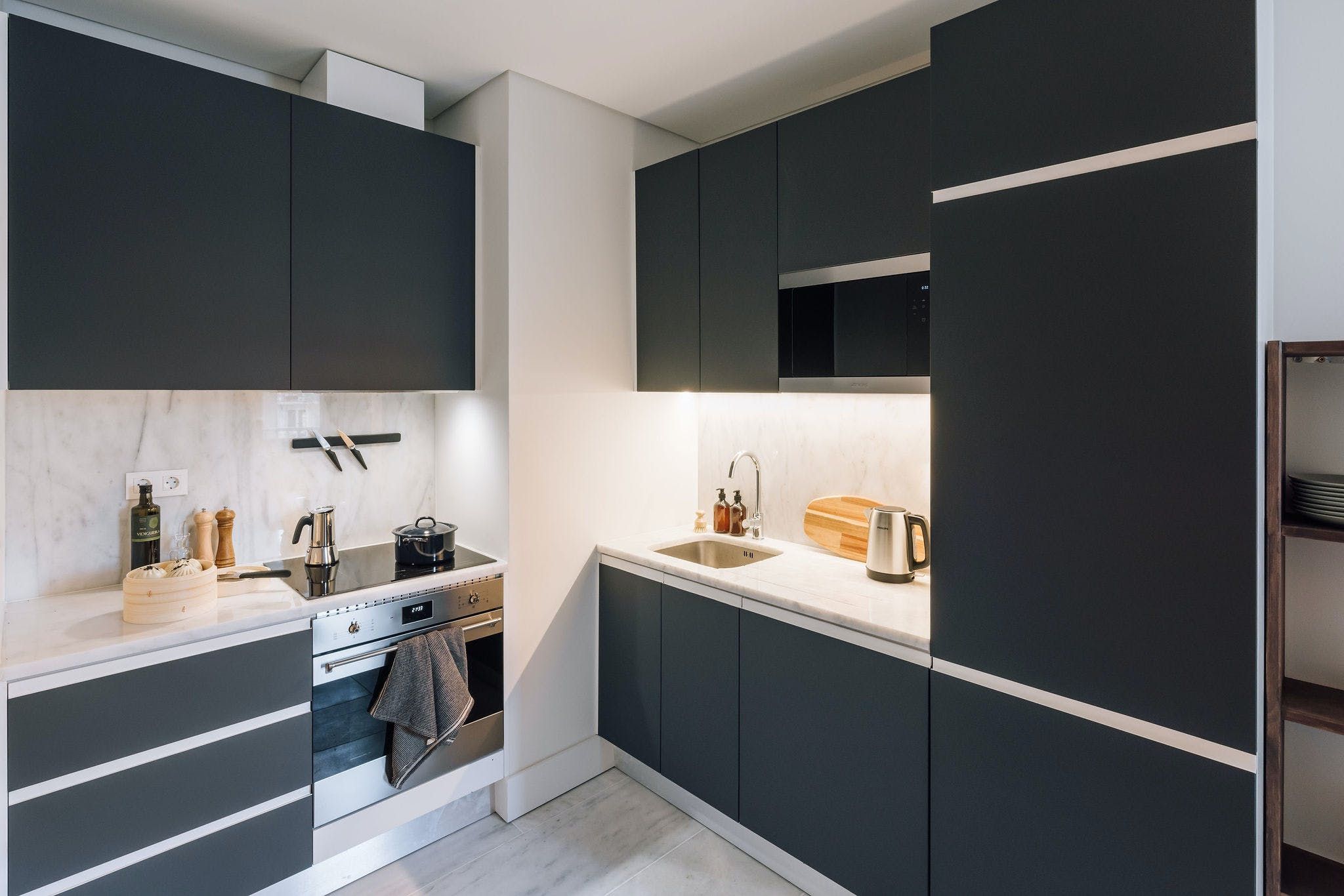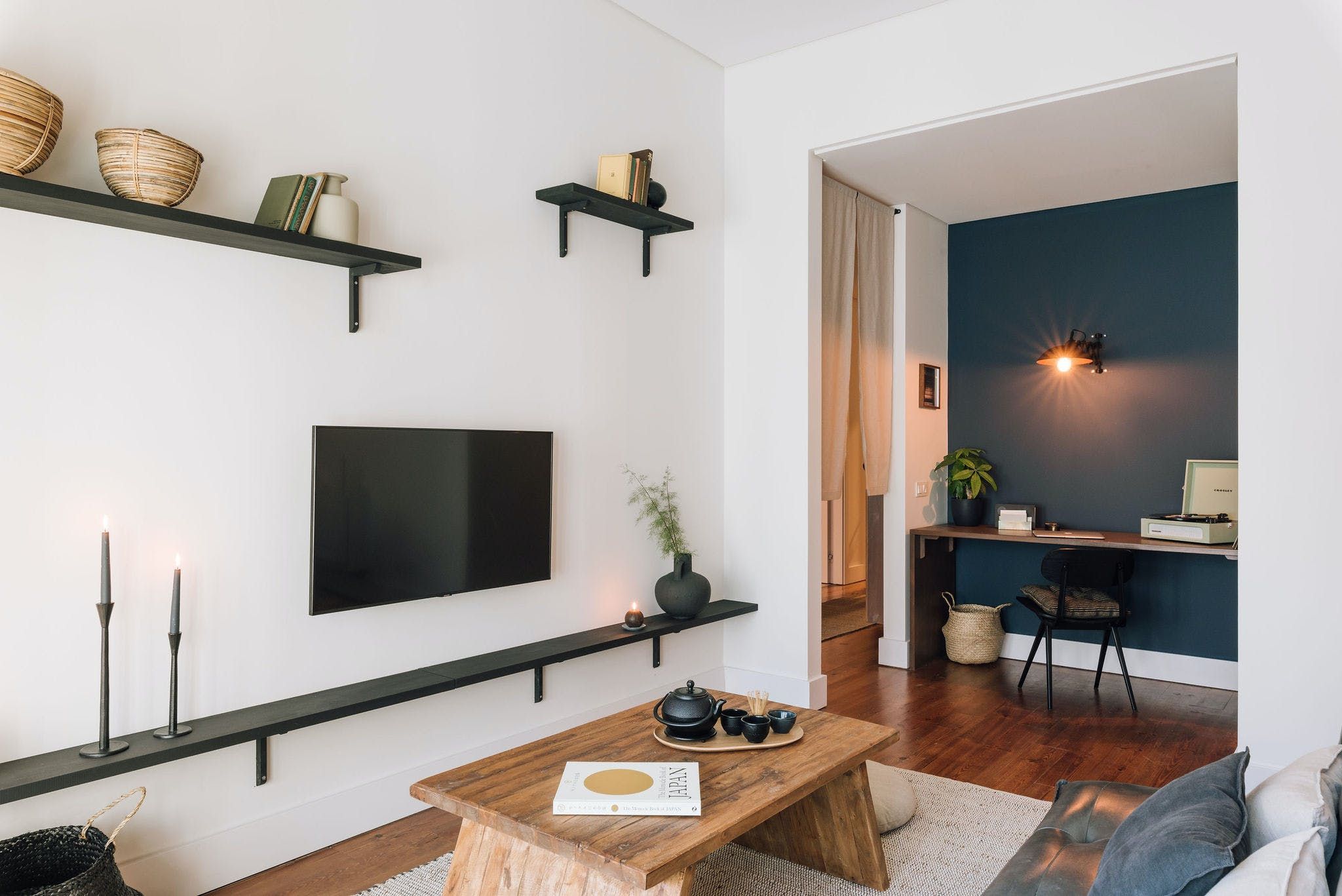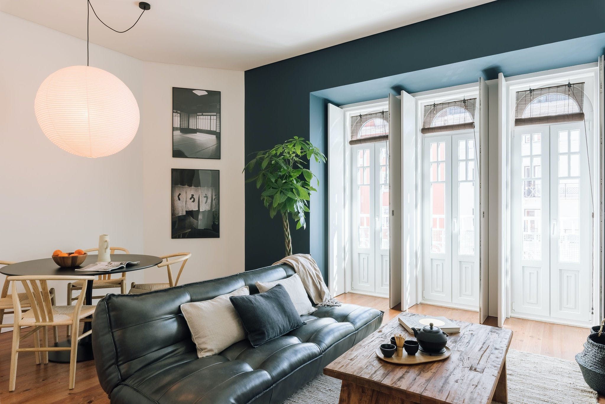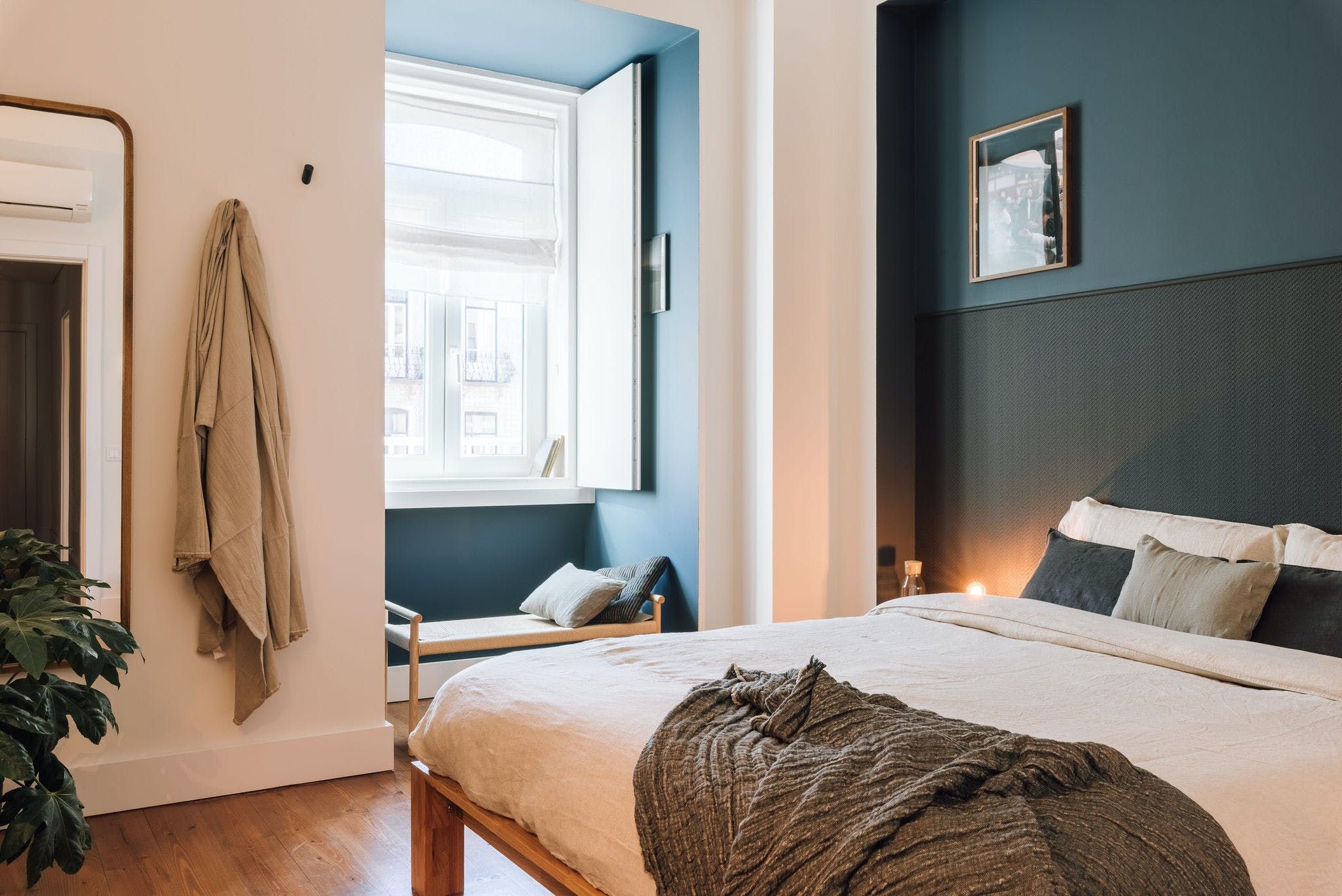 Inspired by the serene beauty of mountain landscapes, this bright apartment just a fourteen-minute walk from Avenida da Liberdade provides a calm and relaxing stay away from the crowds. Cool mineral tones set the scene in the main room, with a trio of French doors giving way to the stunning white Juliet balconies. Start mornings perched here with your coffee and a fresh pasteis de nata while people-watching from your privileged position, or enjoy a glass of wine as you watch the hustle and bustle at twilight. We love the contemporary bohemian decor in this home, from the rattan ornaments to the wooden furnishings and houseplants that lend the whole space an elegant laid-back vibe. There’s a desk nook should you need to catch up on work, while the bedroom beckons a blissful night’s sleep and a cosy wake-up with its bright window seat – ideal for cosying up with a good book. Factor in your access to the building's communal swimming pool and you have everything you need for a dreamy city stay. Outside of your home, the wonderfully manicured Parque Eduardo VII is an eight-minute walk away, the Saúde Museum is an eleven-minute stroll and bustling Rossio Square is twenty-four minutes on foot from your door.