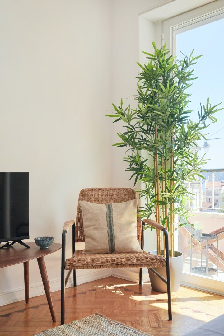 Inside, the decor is modern with a boho touch, the walls decorated with rattan ornaments and the whole space bathed in light thanks to the floor-to-ceiling windows.