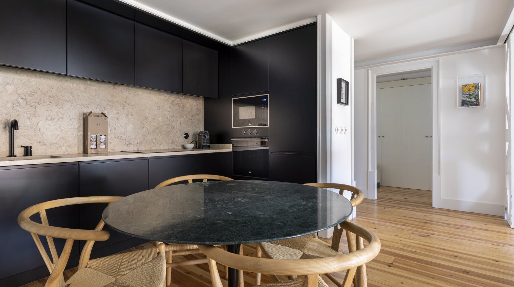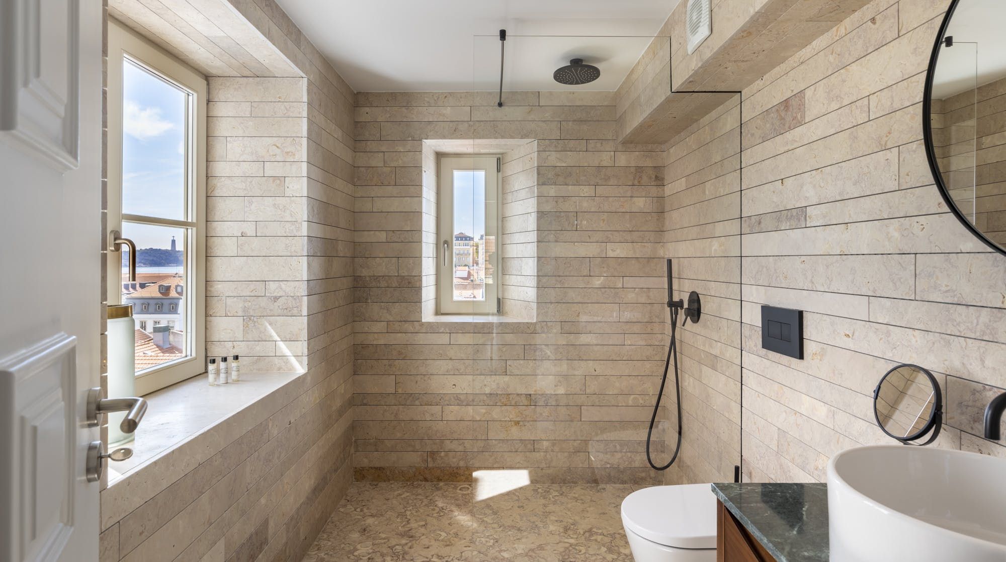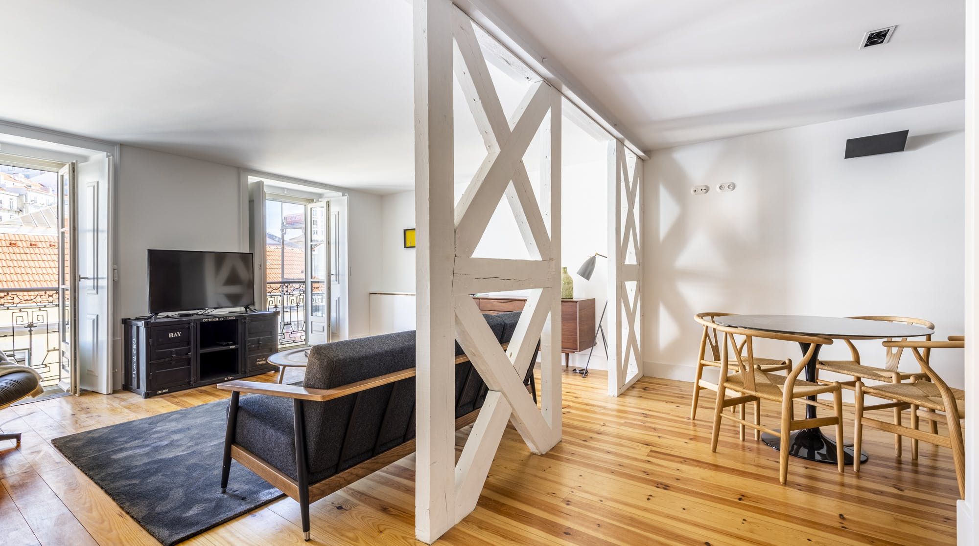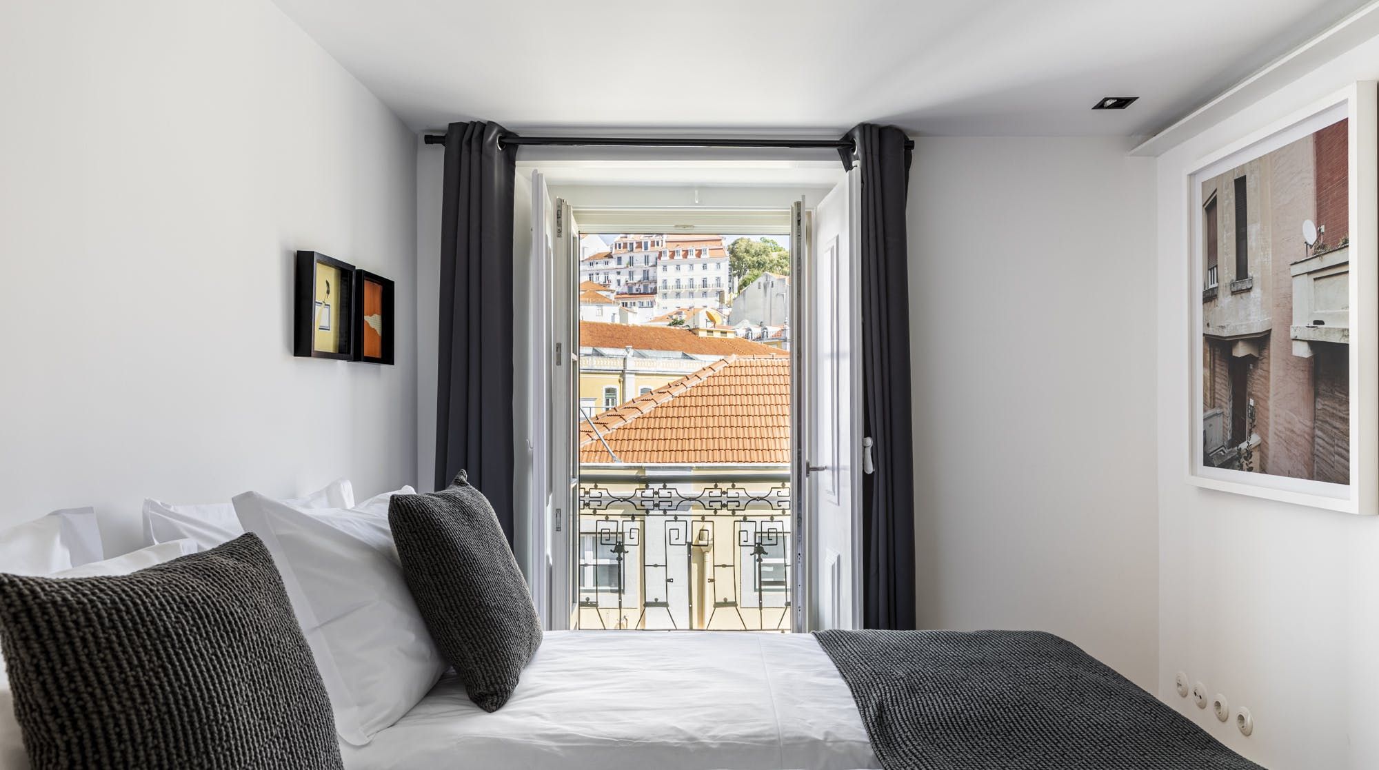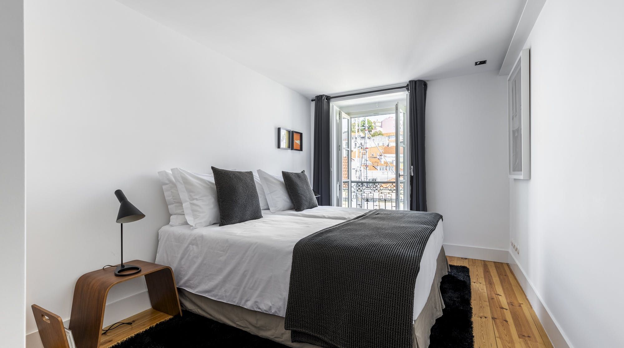 Freshly renovated, this beautiful apartment is the kind of Lisbon home we daydream about. In a period building typical of this ancient part of the city, it's been lovingly brought into the 21st century by owners who clearly care about the quality of the finish. The characteristic Pombalina wooden cage of the stone building shows itself in the open-plan living space. Invented after the great earthquake of the 1750s, it's an architectural structure to ensure stability. It also happens to look really cool. You may also spot some other historic features in the home – an old salting trough in one of the bathrooms, a huge stone fireplace in a bedroom and antique recovered tiles made into large panels that adorn the corridors. At the same time, it's a smart, modern home with luxurious furnishings, and an on-trend black and marble kitchen. We love the views over Lisbon's rooftops from the balcony too. When you're ready to explore you'll be a five-minute walk to Praça do Comércio, which opens up to the Tagus river. The stylish neighbourhood of Chiado is a ten-minute walk away, as are the Ribeira Market and Campo das Cebolas.