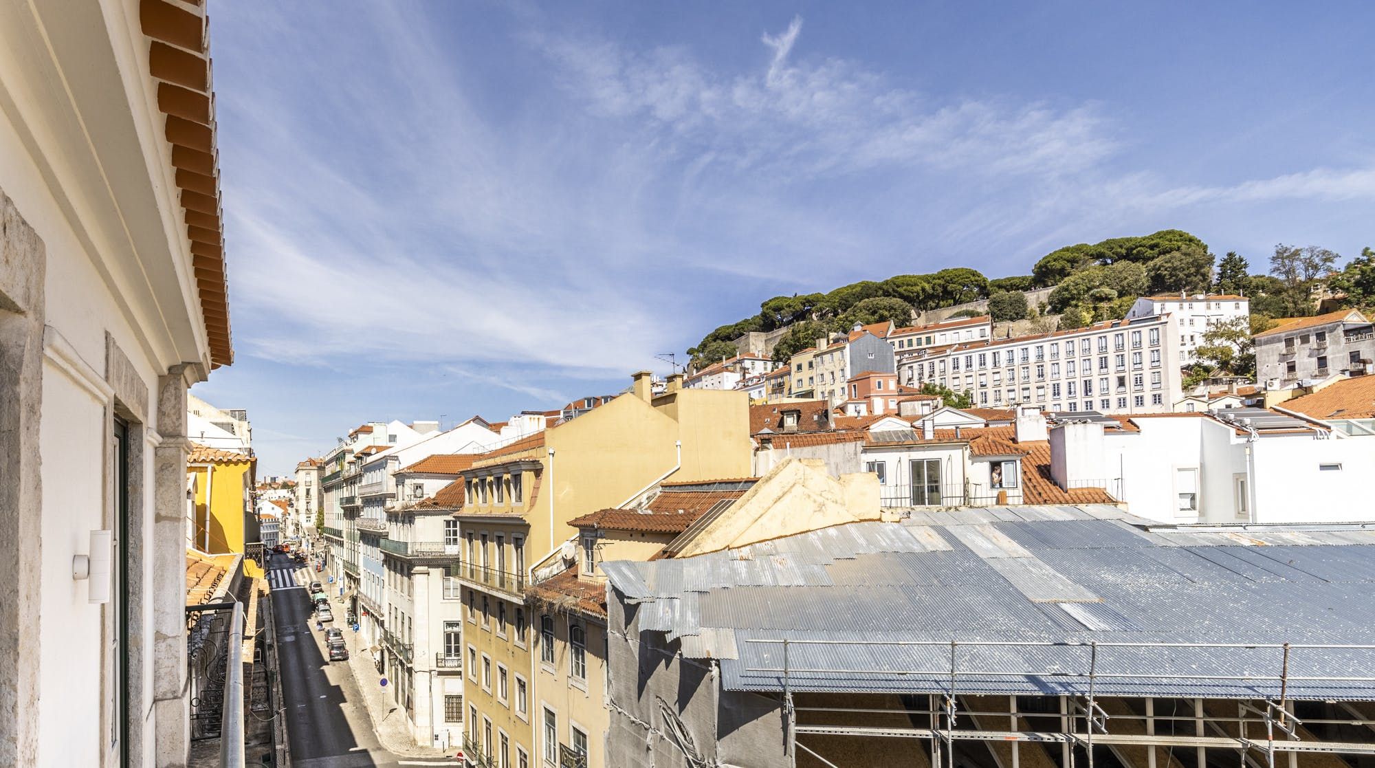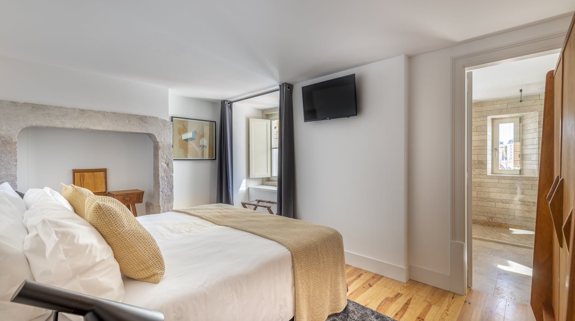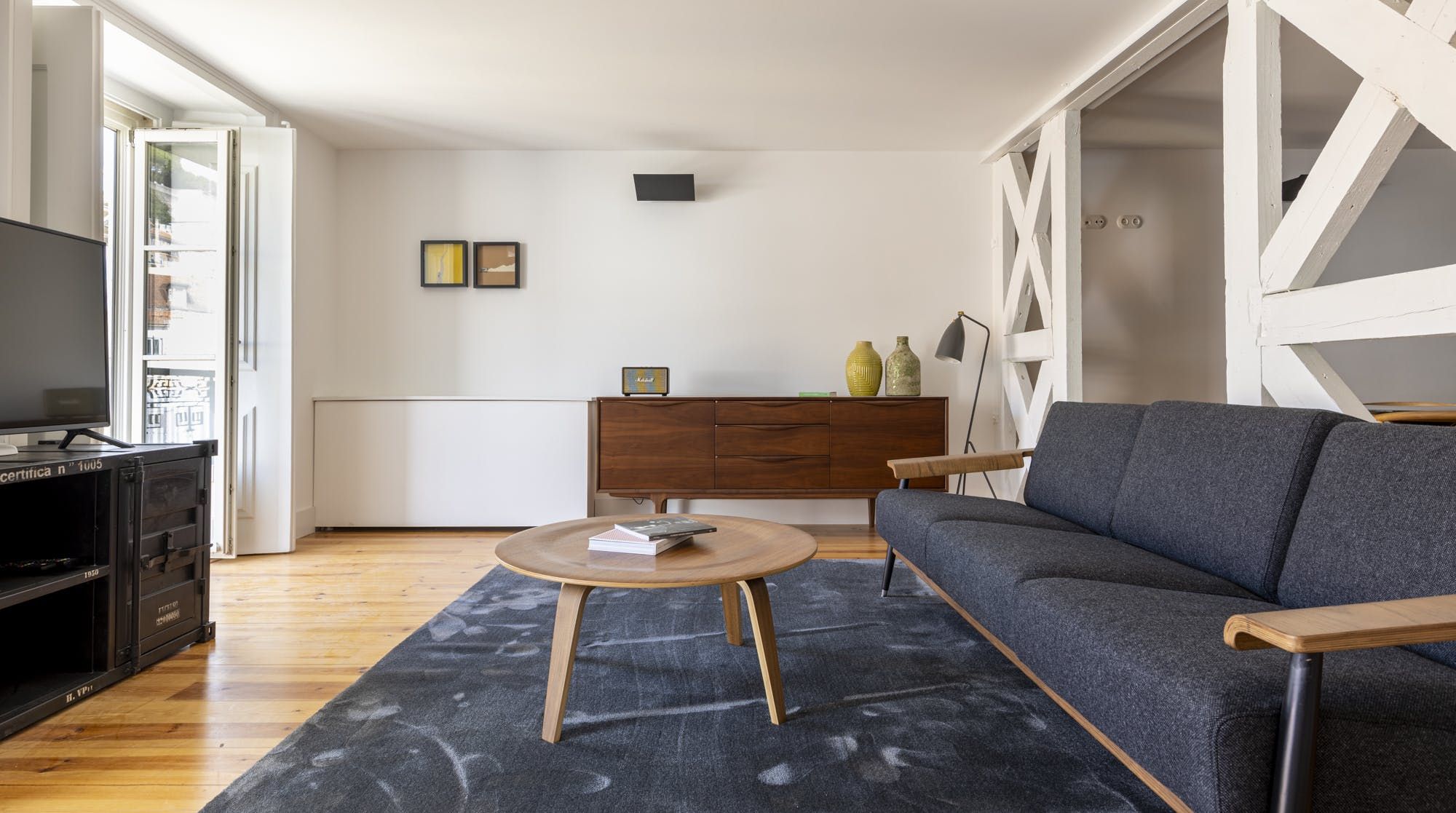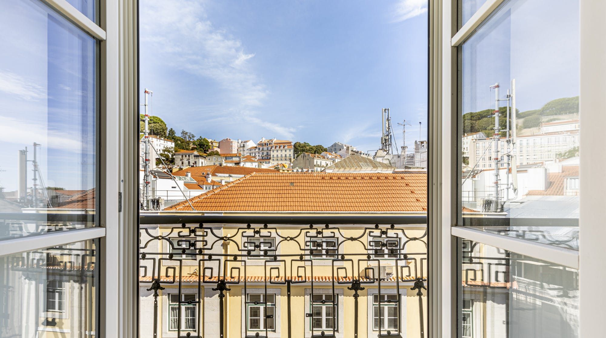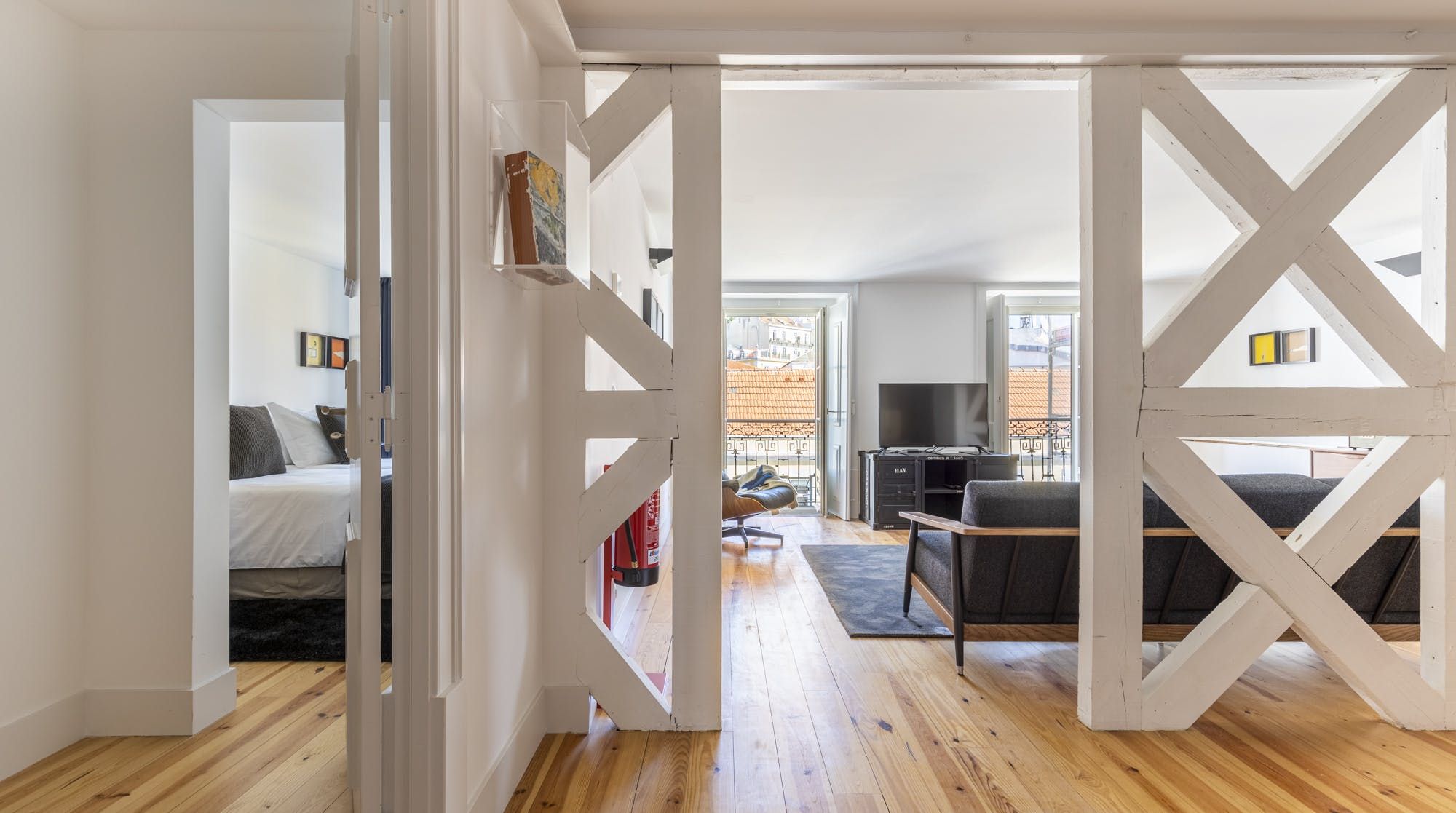 Freshly renovated, this beautiful apartment is the kind of Lisbon home we daydream about. In a period building typical of this ancient part of the city, it's been lovingly brought into the 21st century by owners who clearly care about the quality of the finish. The characteristic Pombalina wooden cage of the stone building shows itself in the open-plan living space. Invented after the great earthquake of the 1750s, it's an architectural structure to ensure stability. It also happens to look really cool. You may also spot some other historic features in the home – an old salting trough in one of the bathrooms, a huge stone fireplace in a bedroom and antique recovered tiles made into large panels that adorn the corridors. At the same time, it's a smart, modern home with luxurious furnishings, and an on-trend black and marble kitchen. We love the views over Lisbon's rooftops from the balcony too. When you're ready to explore you'll be a five-minute walk to Praça do Comércio, which opens up to the Tagus river. The stylish neighbourhood of Chiado is a ten-minute walk away, as are the Ribeira Market and Campo das Cebolas.