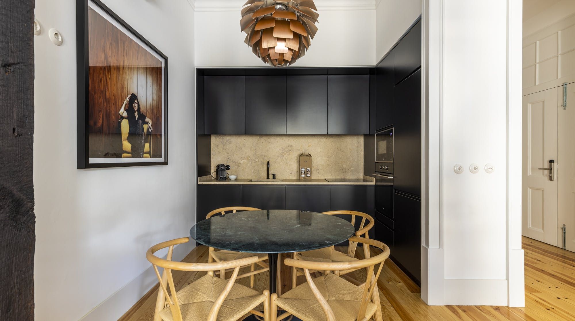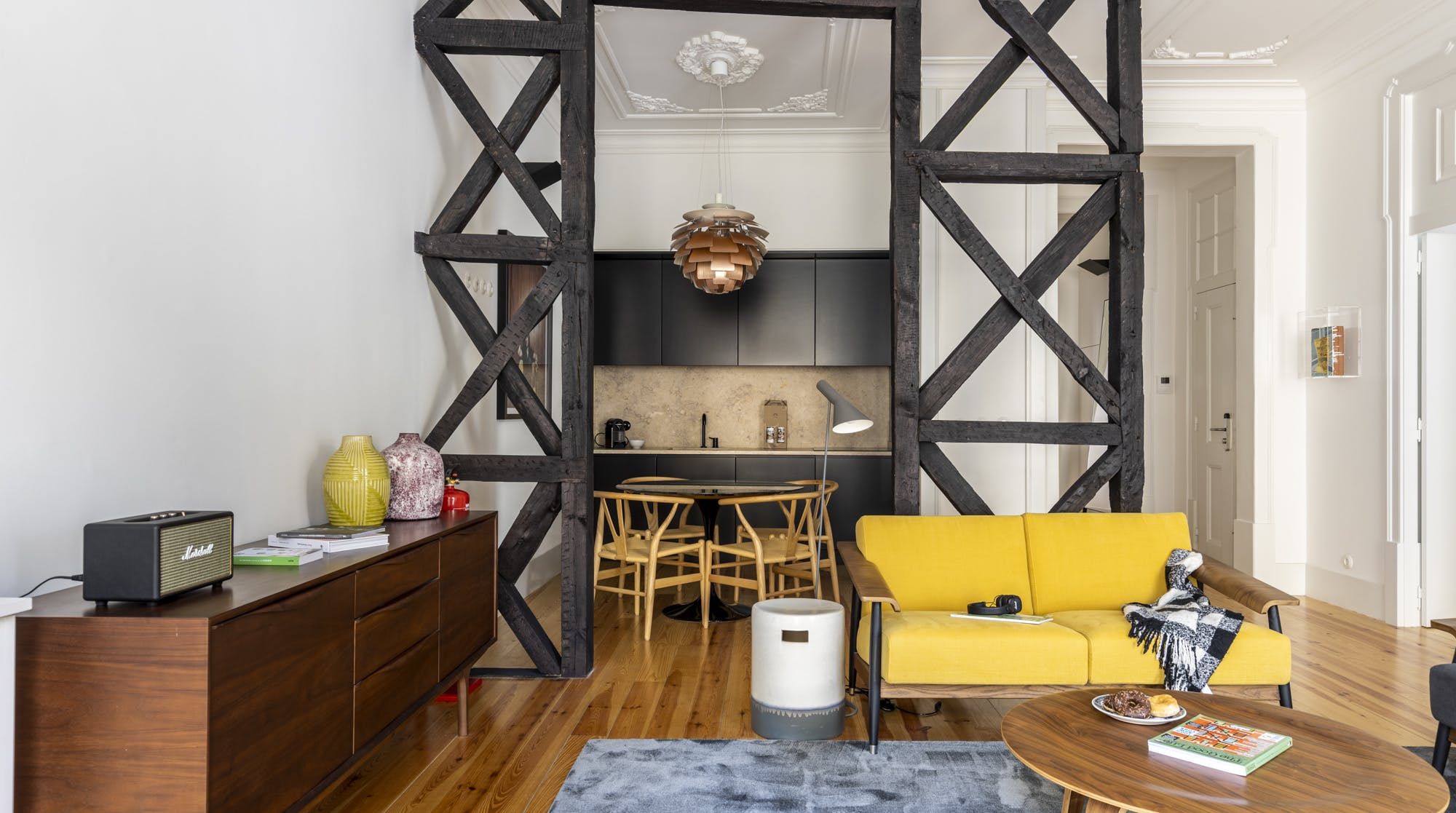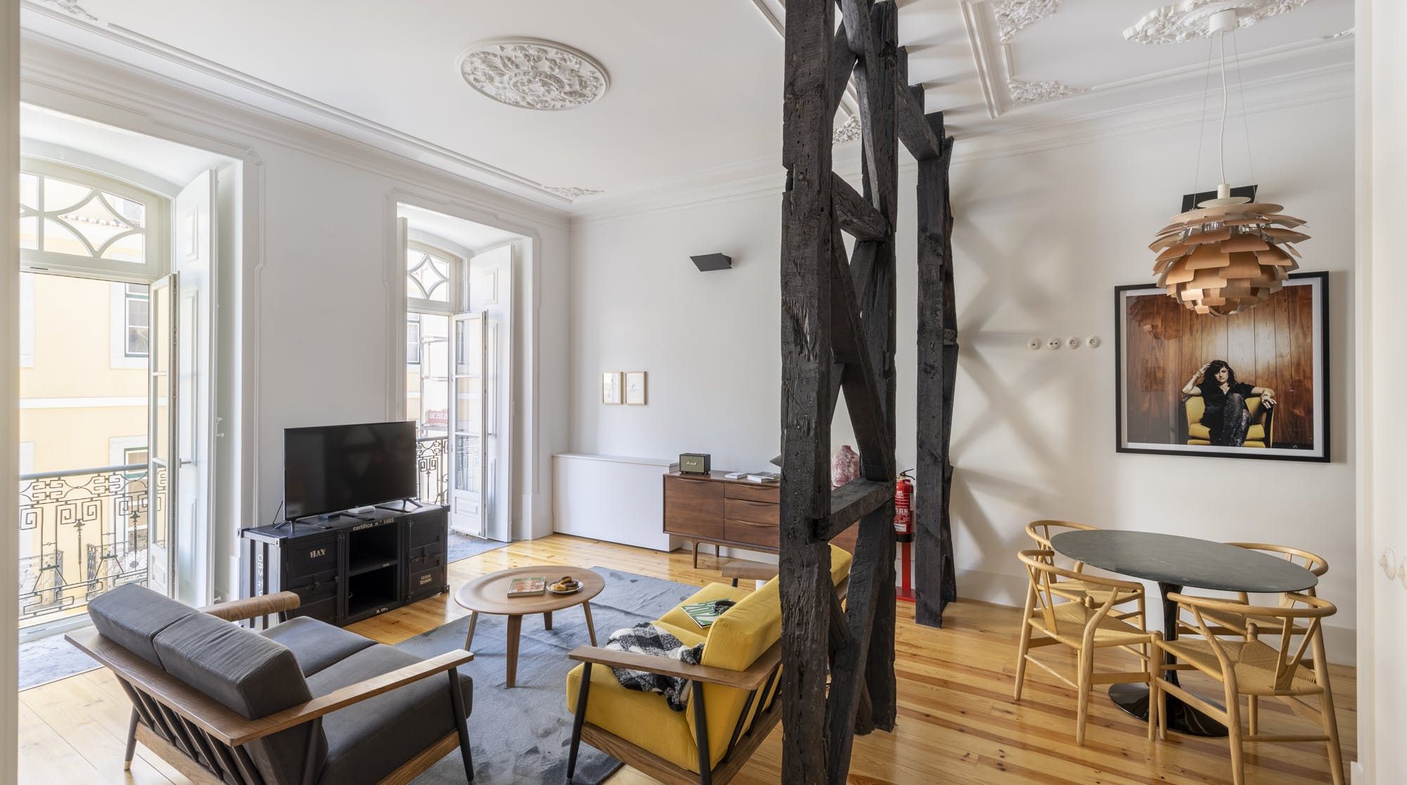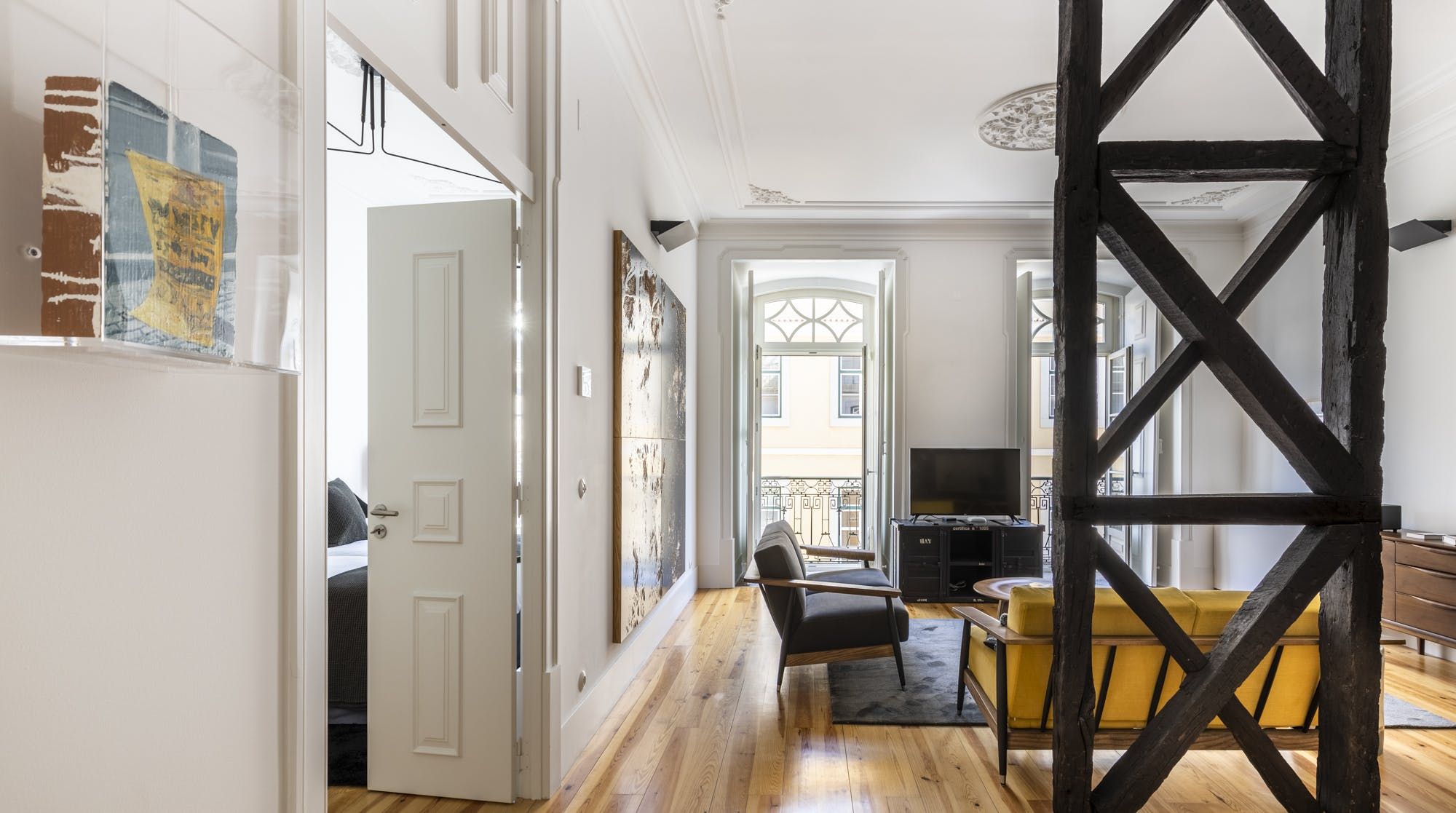 In this Baixa location – also known as Pombalina Downtown – it’s no surprise that you can find some of the finest examples of traditional architecture in the city. Of course, this apartment is no exception. Only a four-minute walk to Lisbon Cathedral, and six to the bustling, harbour-facing square, Praça do Comércio, this renovated building is no less impressive than its local surroundings. We love the care and attention to detail that has gone into this apartment, which retains the building's original architectural features, as well as reusing debris from historic earthquakes. The beautiful timber structures that you’ll notice right away in the lounge are typical of the pombalina style and practicalities. Some antique tiles, recovered from the 1755 disaster, have been made into panels that adorn the corridors. It's not all about the history here though – there are plenty of modern touches too. You’ll have an array of contemporary art to peruse, as well as Bluetooth speakers and a sleek, charcoal-coloured kitchen. After exploring every corner of this elegant home, pour a glass of vinho verde and take in the views from the French doors of the ornate Juliet balcony.