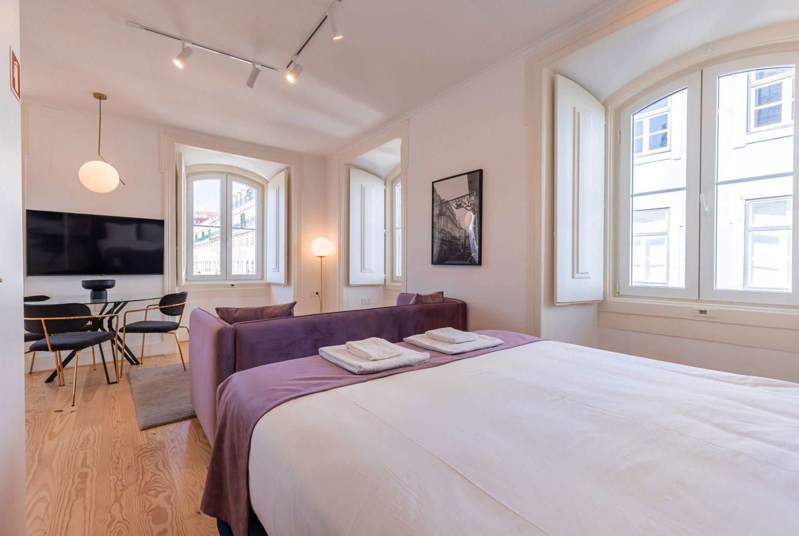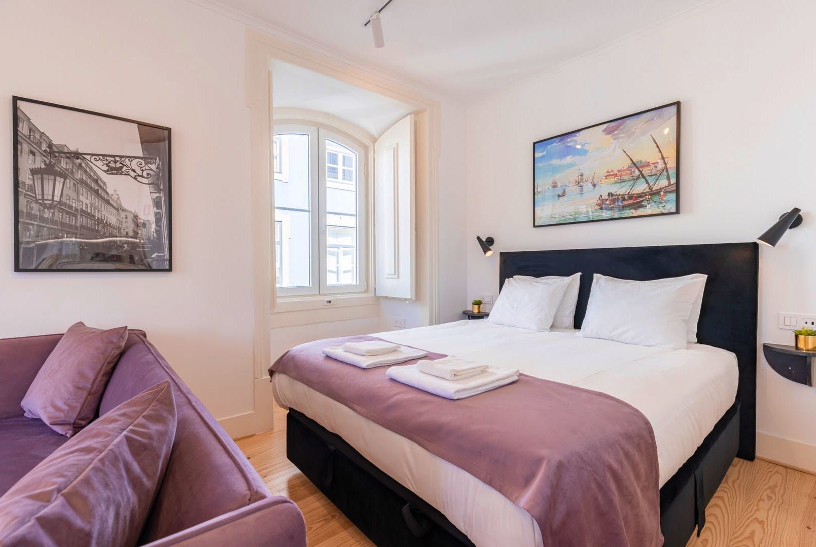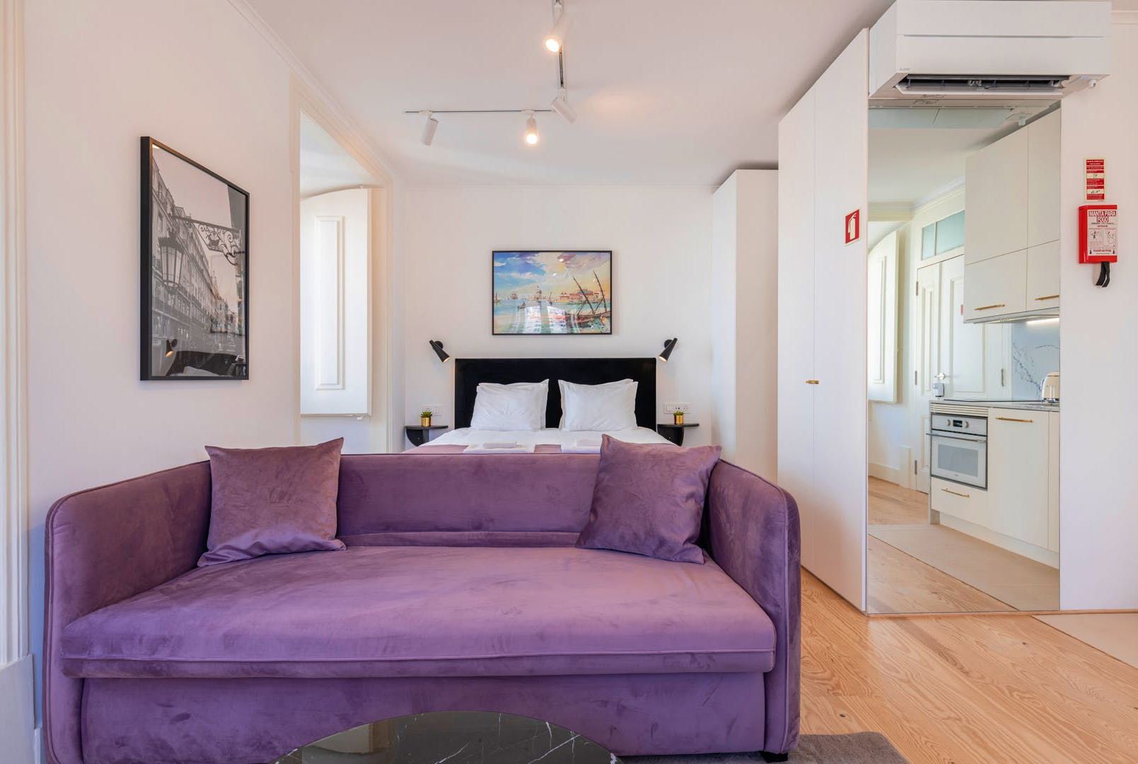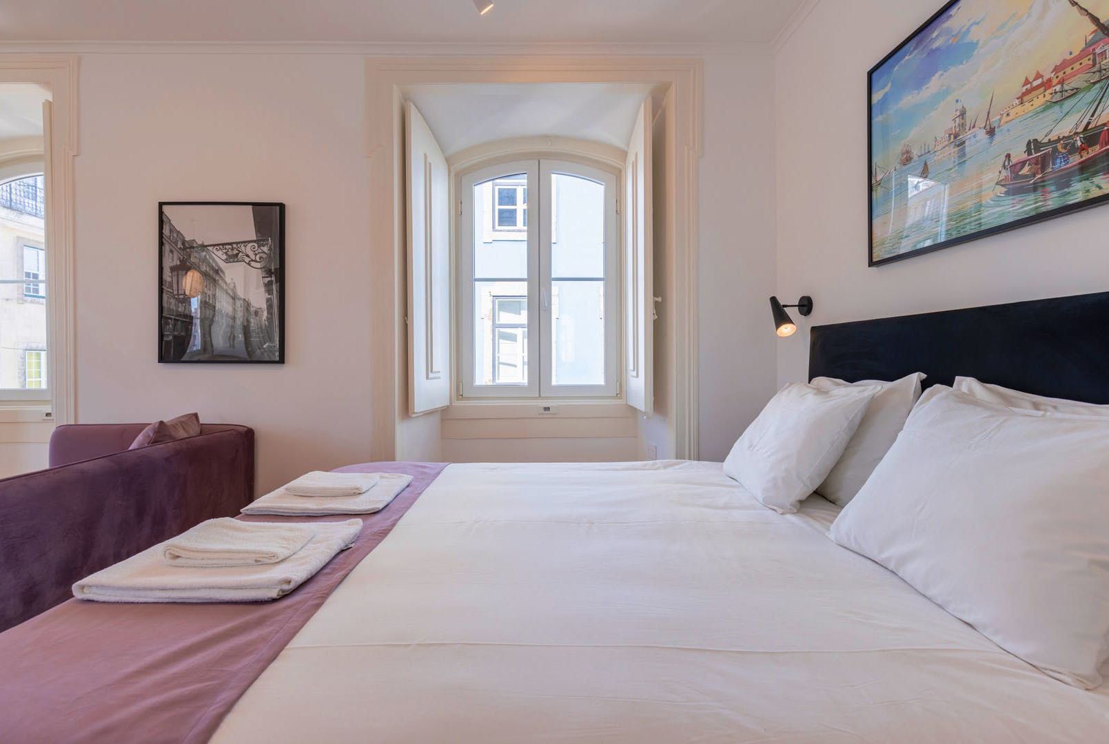 We should, first of all, give a shout-out to this studio home's address. It's within walking distance of the Santa Justa Elevator, the vibrant district of Bairro Alto and the São Jorge Castle. So, that's the location – what about the apartment? Well, it's lovely and bright, and there's room for a sofa and dining table. The kitchen is compact, but it has an oven and hob, so you can cook some Portuguese cuisine. We love the views out over Praça da Figueira and the surrounding pastel-hued houses, too.