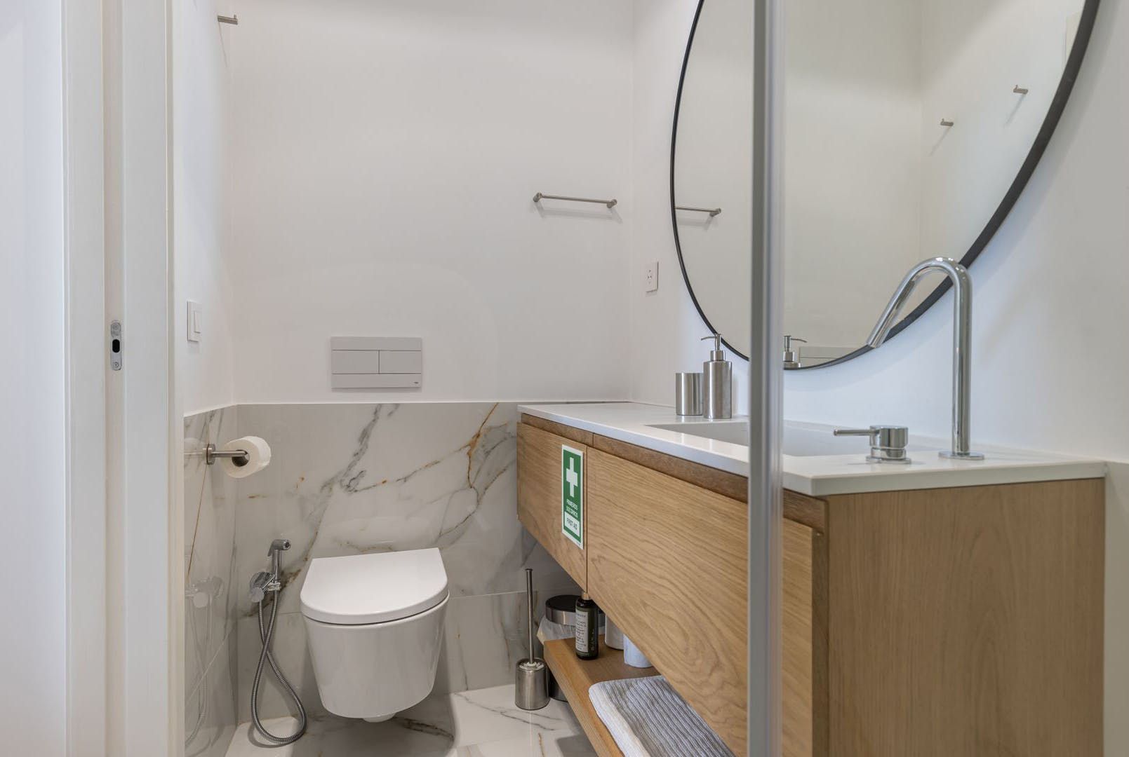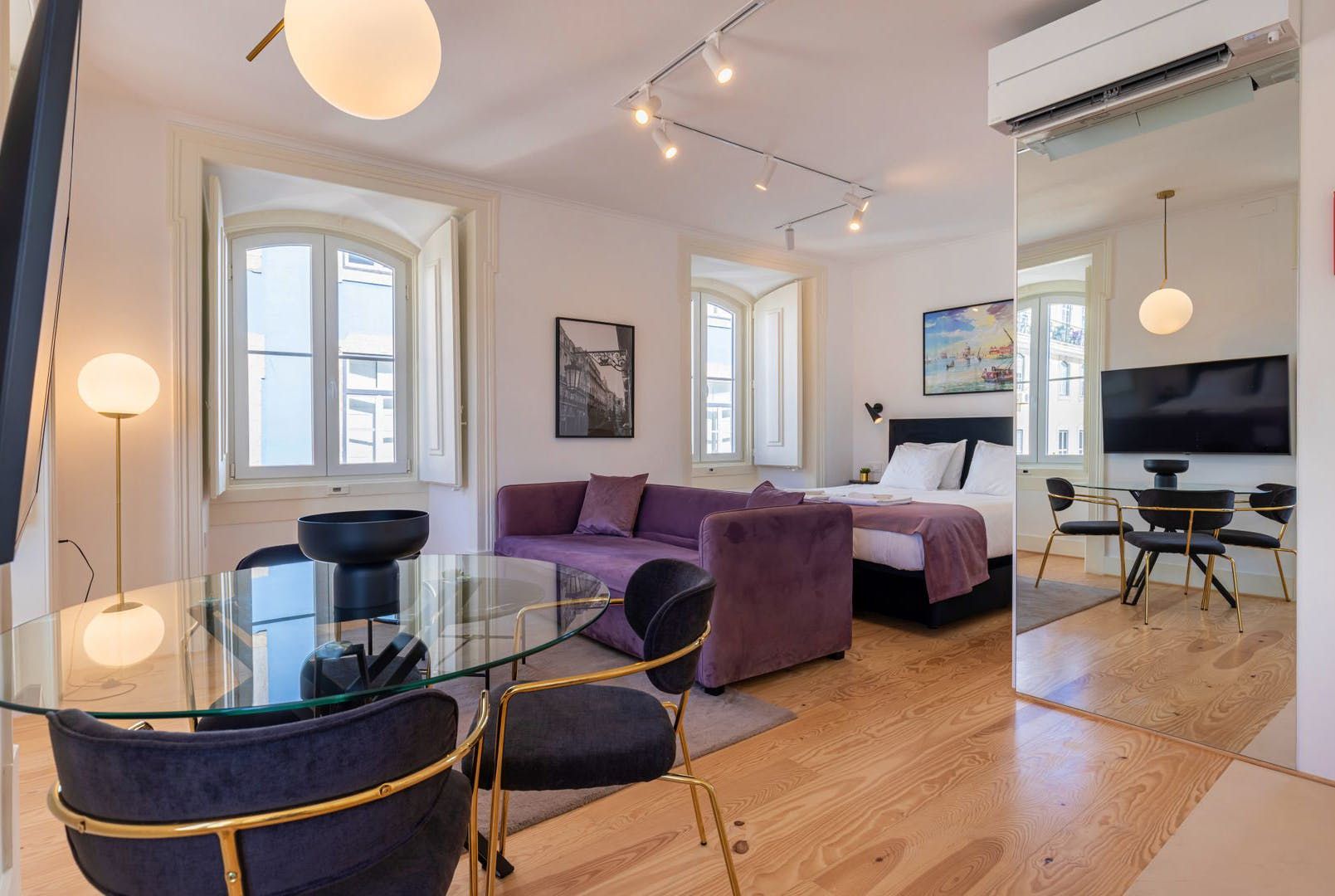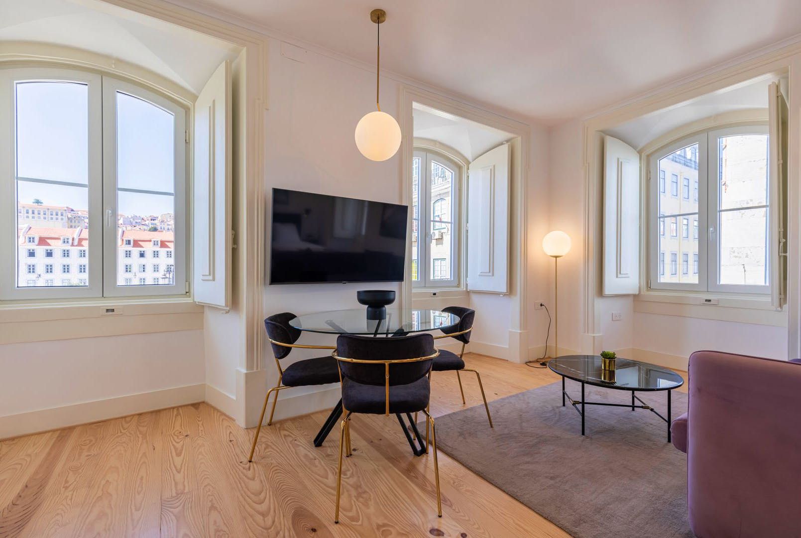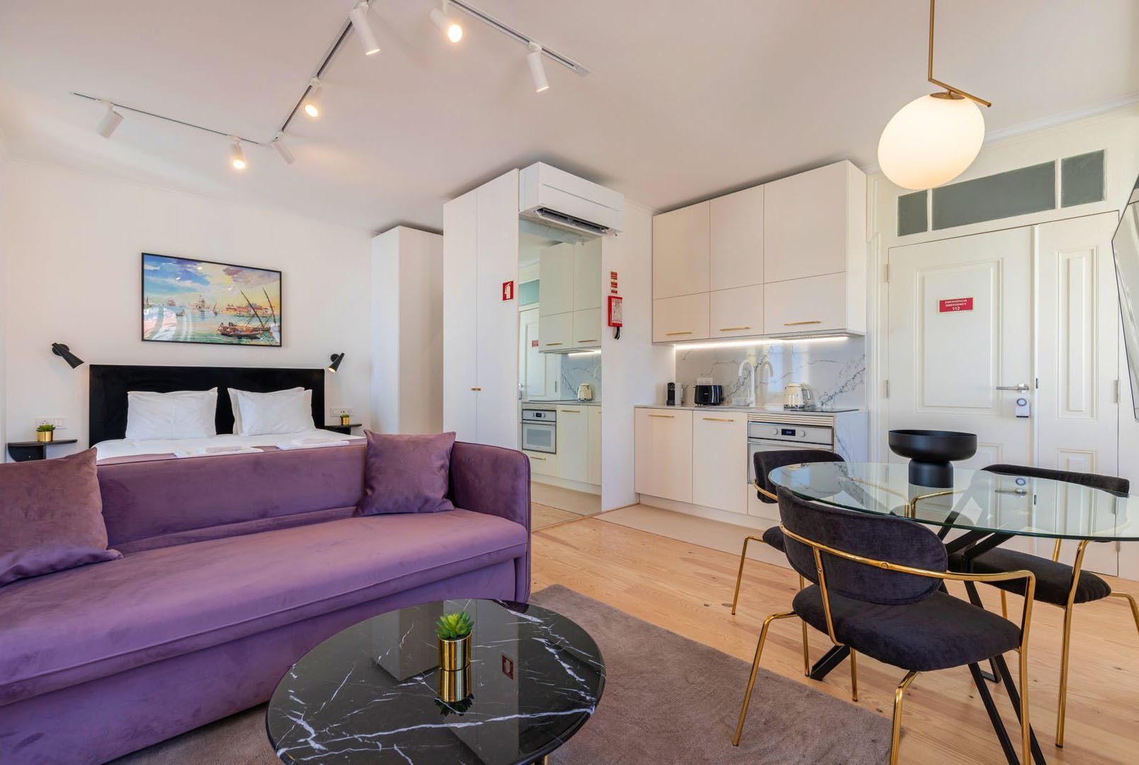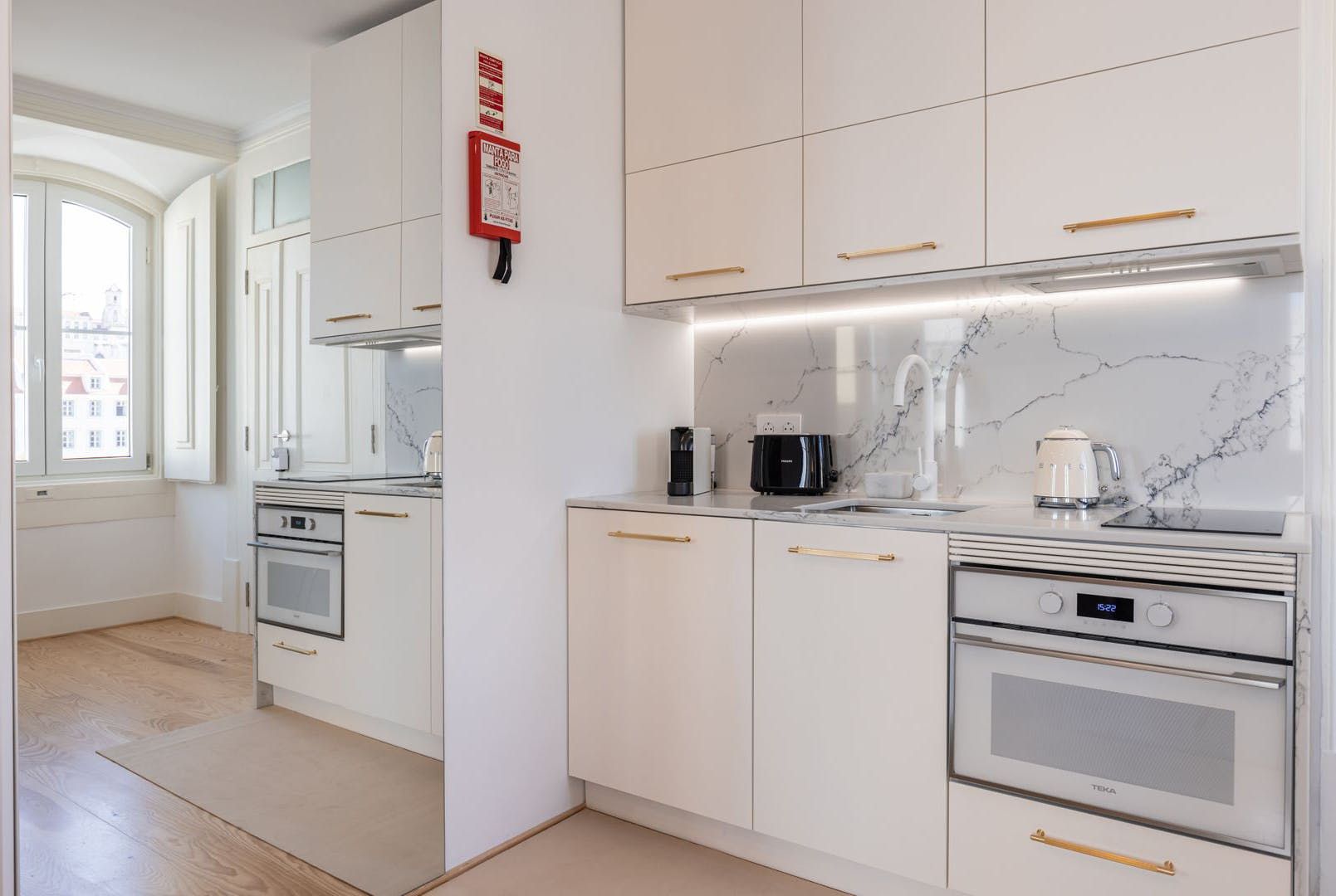 We should, first of all, give a shout-out to this studio home's address. It's within walking distance of the Santa Justa Elevator, the vibrant district of Bairro Alto and the São Jorge Castle. So, that's the location – what about the apartment? Well, it's lovely and bright, and there's room for a sofa and dining table. The kitchen is compact, but it has an oven and hob, so you can cook some Portuguese cuisine. We love the views out over Praça da Figueira and the surrounding pastel-hued houses, too.