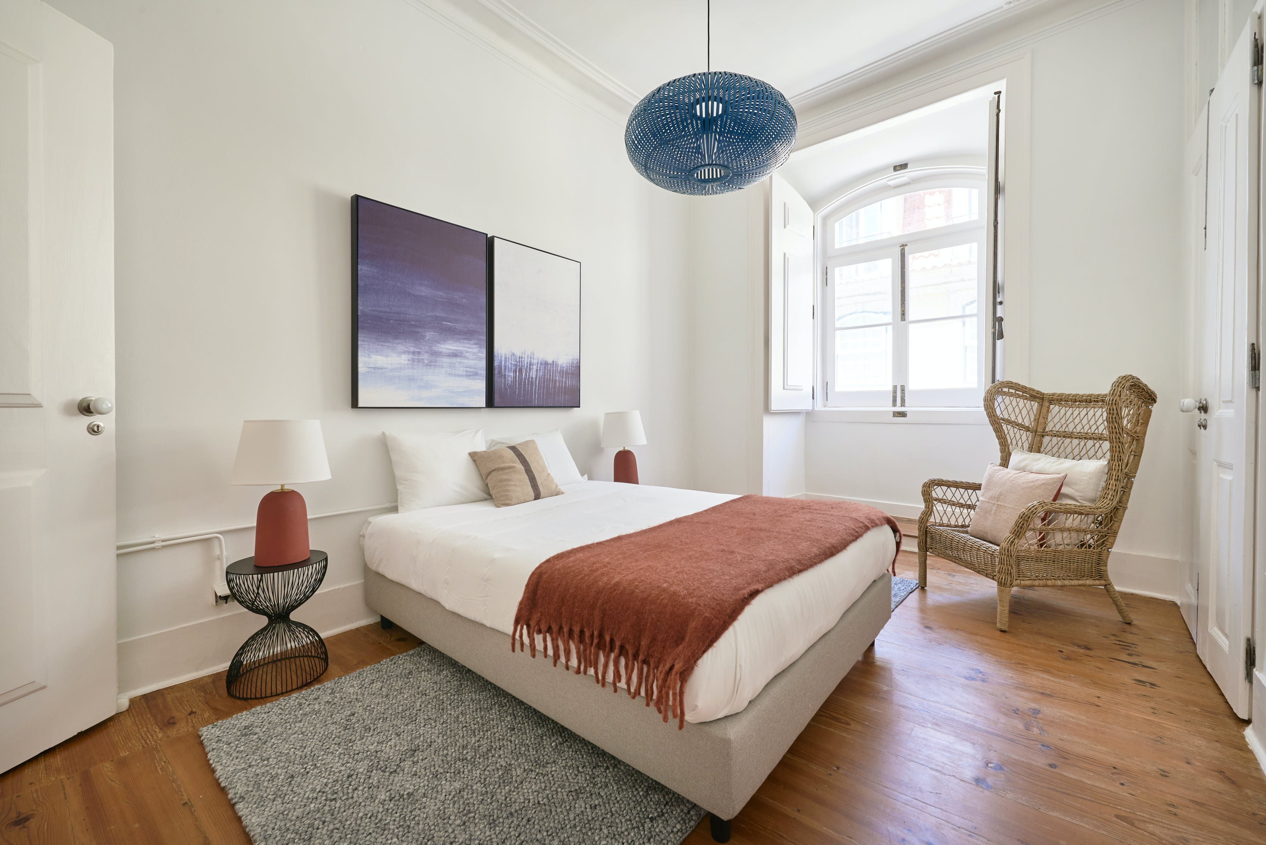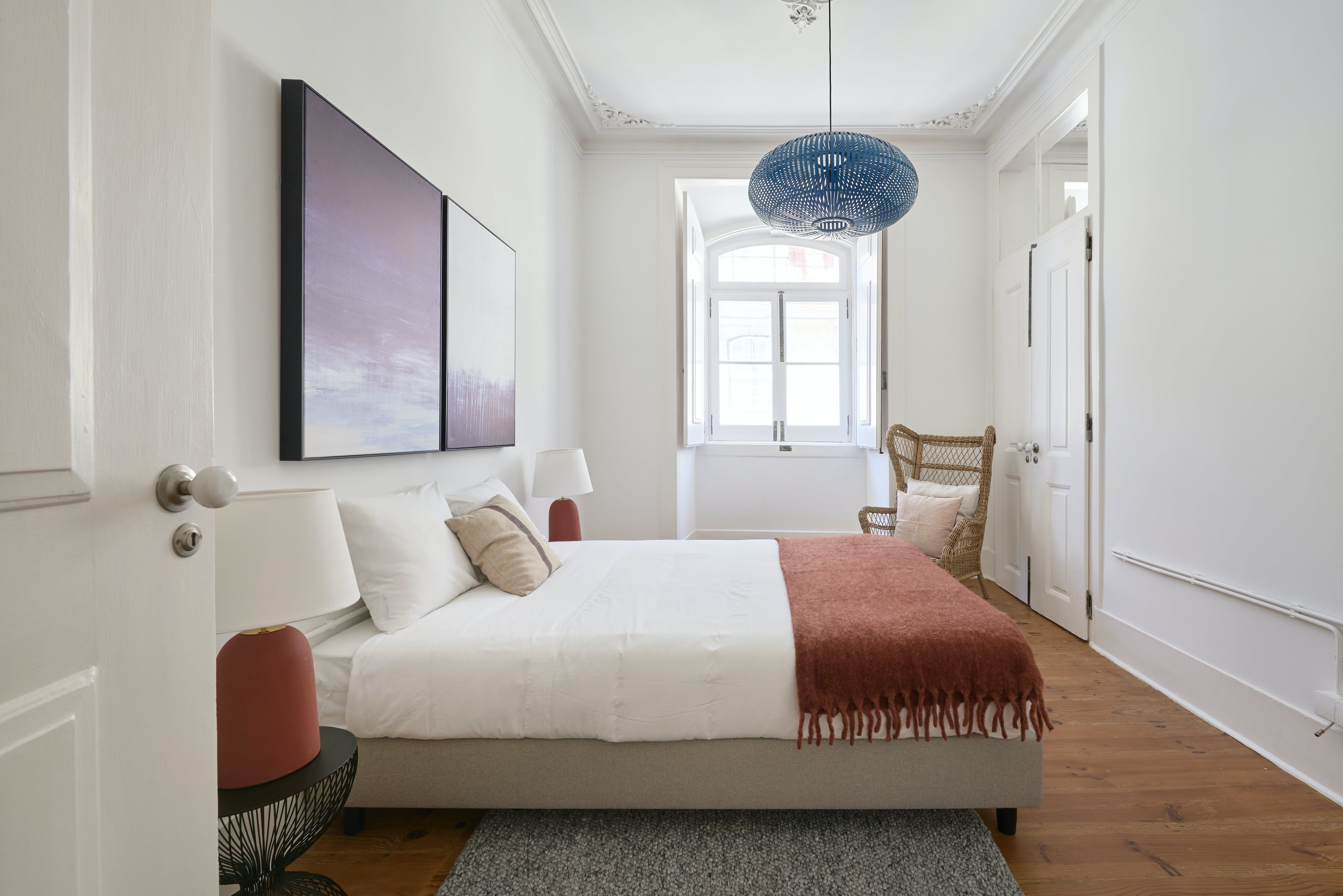 Inside, tall corniced ceilings and wood floors make a stately impression, with an earthy-toned contemporary decor that feels both chicly bohemian and wonderfully Portuguese. We love the large arched windows that let in plenty of sunlight, as well as the views of bustling Pink Street below.