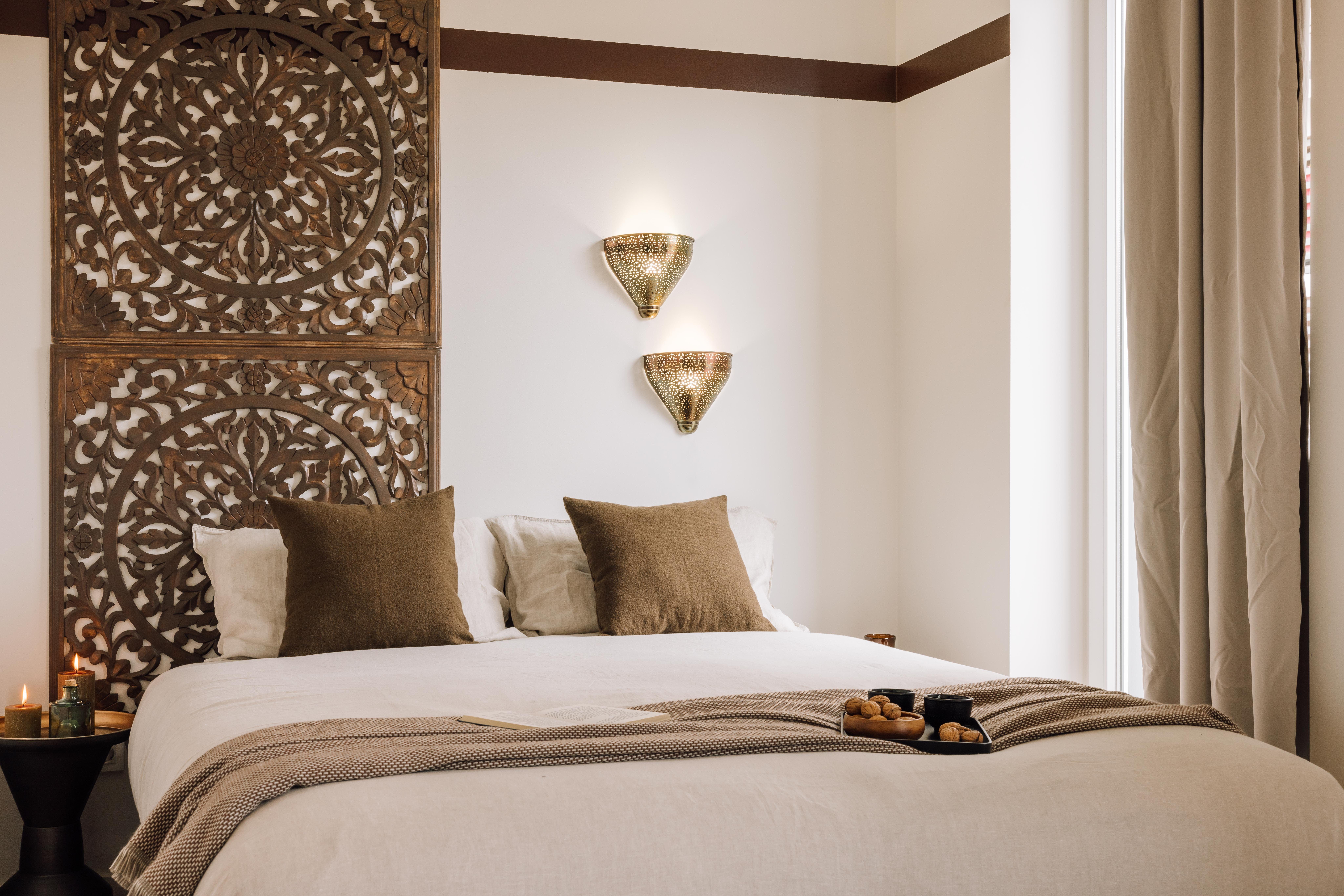 The balcony overlooking the streets provides natural light which enhances the rugged, earthy tones. Notice Saharan details infused into the authentically Portuguese interior.