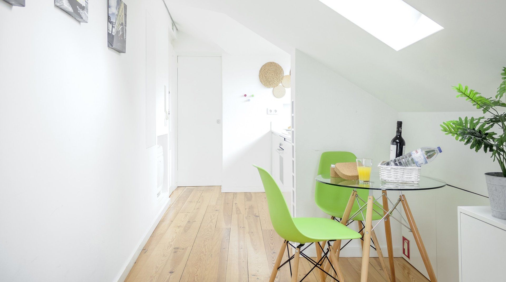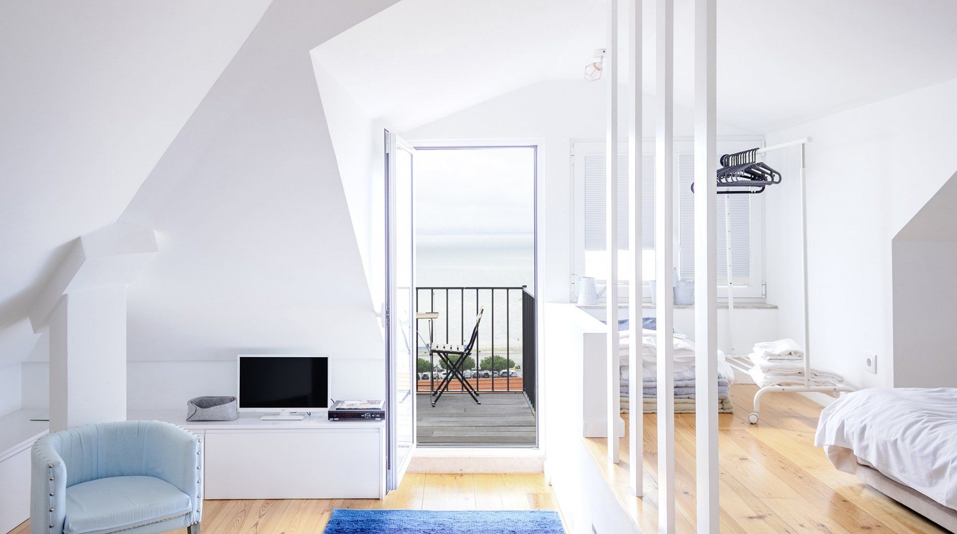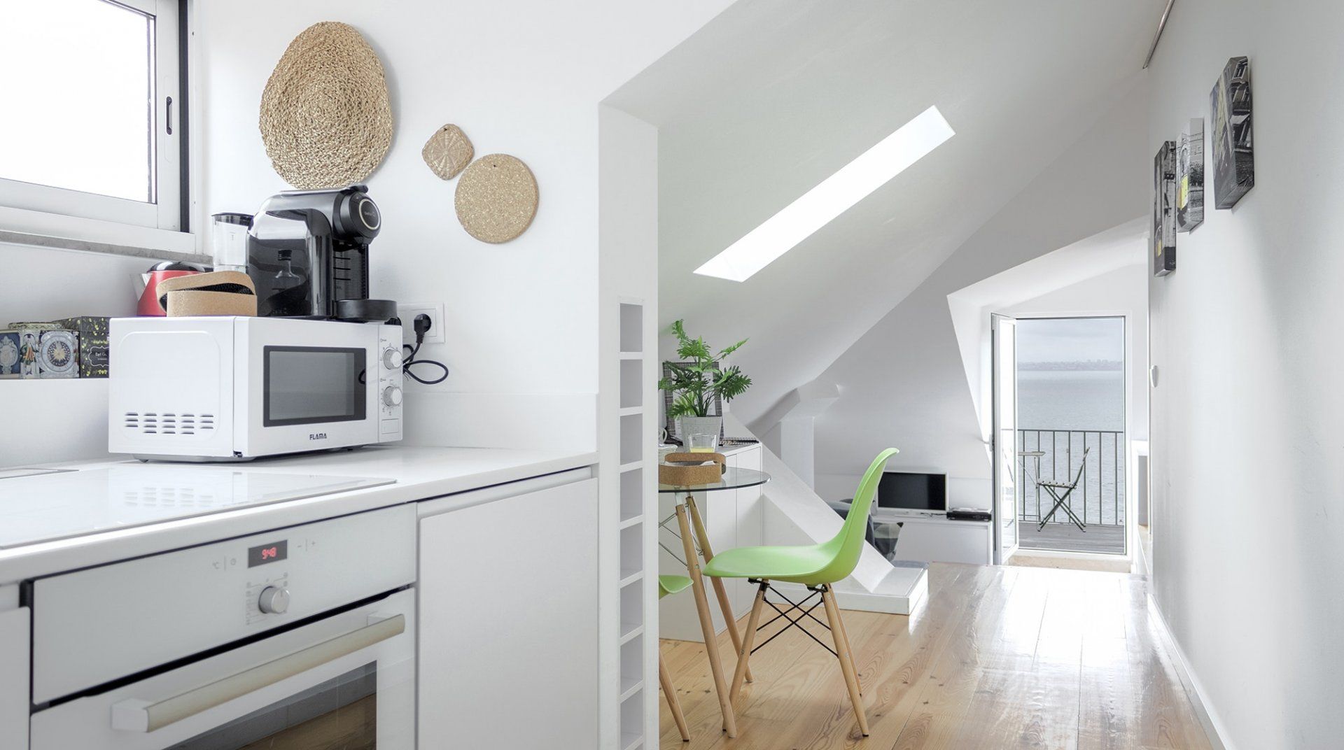 The view of this compact fourth-floor flat is its trump card. From the kitchen window and balcony, raised above the neighbouring roofs, you look out to the Tejo River. Set over two floors this studio-like home (there are no separate bedrooms) is a good base to explore the Alfama neighbourhood – as one of Lisbon’s oldest districts, its maze of cobbled streets lead to a number of historic attractions like the Castle and Se Cathedral. The home might be small, but its abundance of skylights and stunning view provide a bright and calm environment.