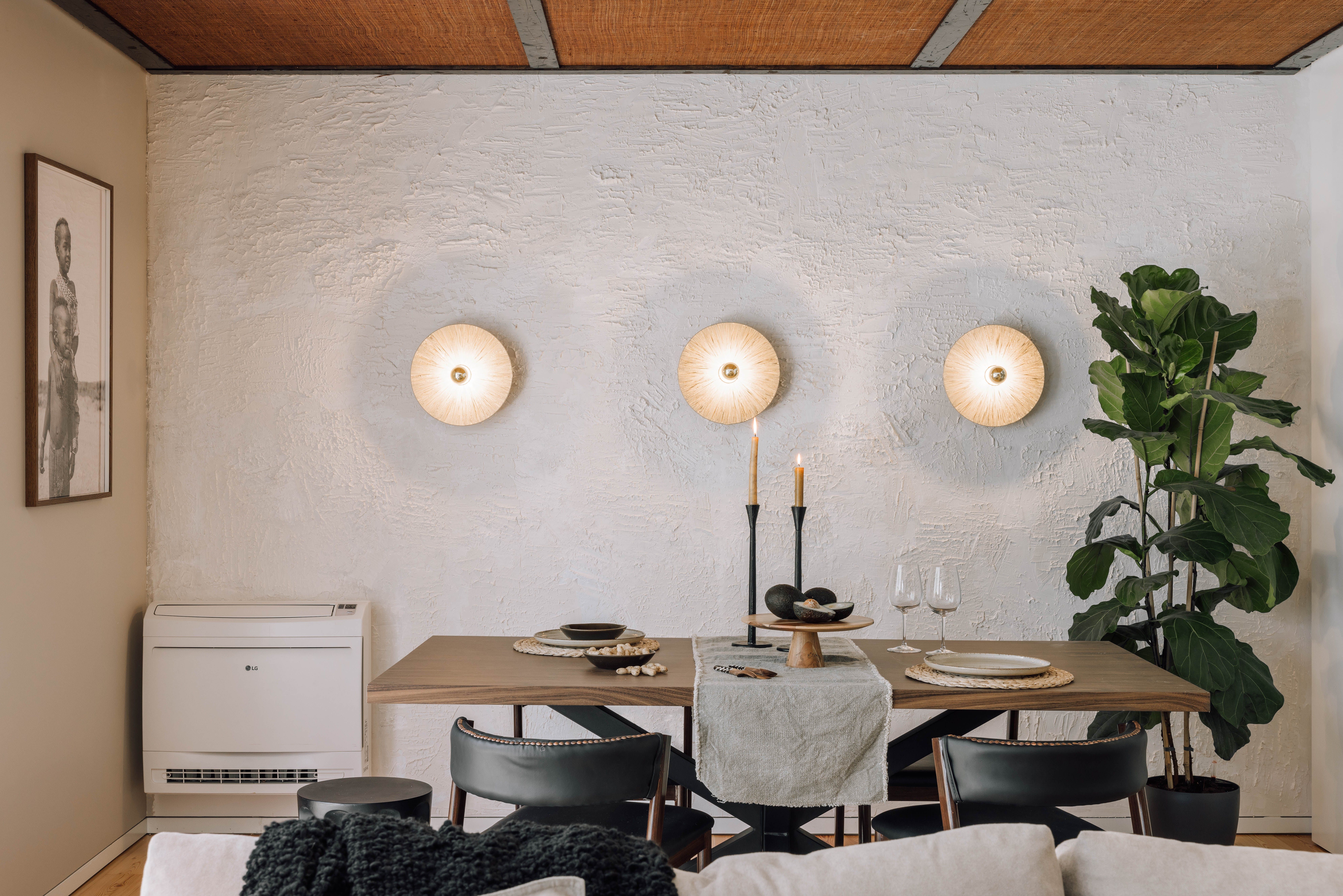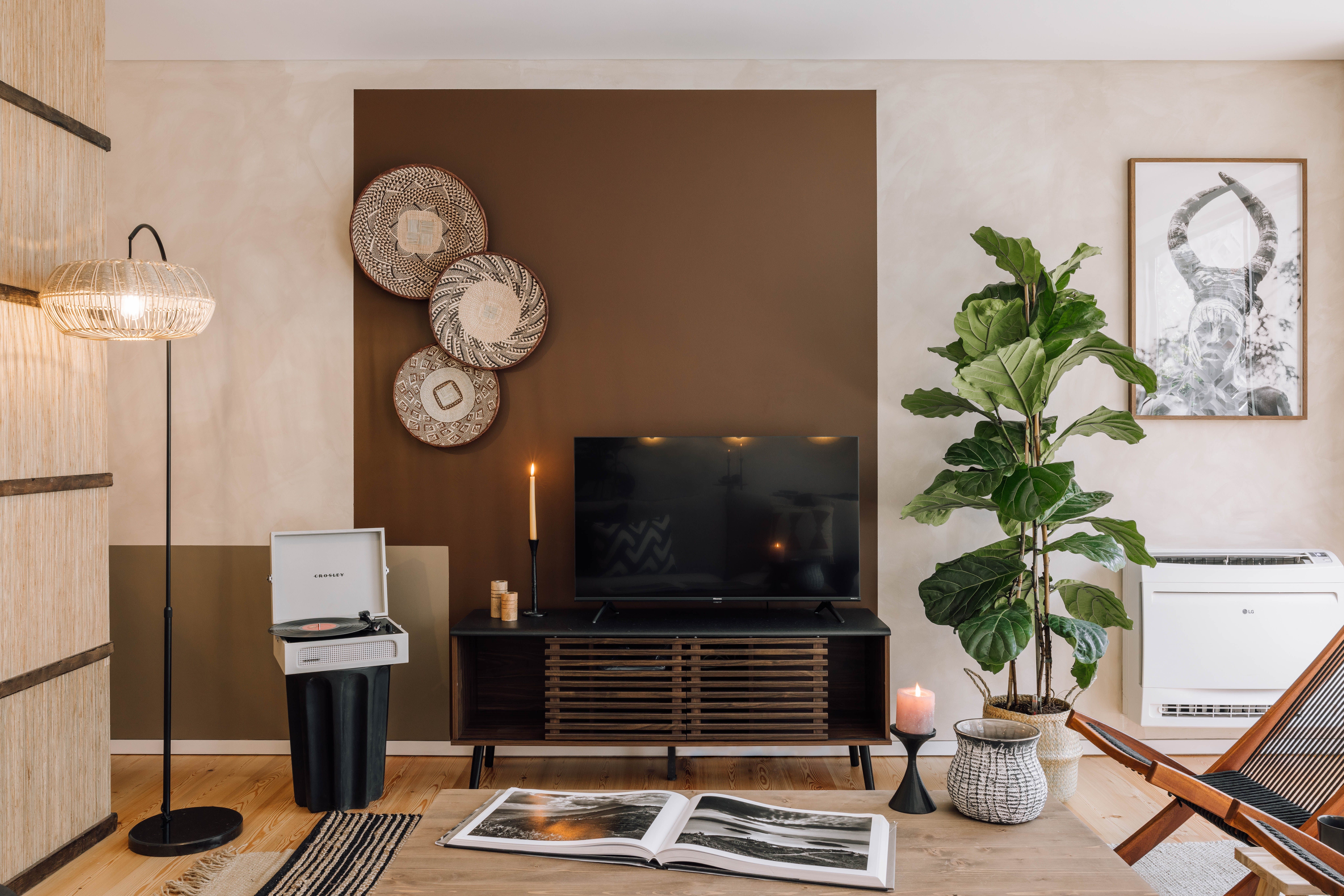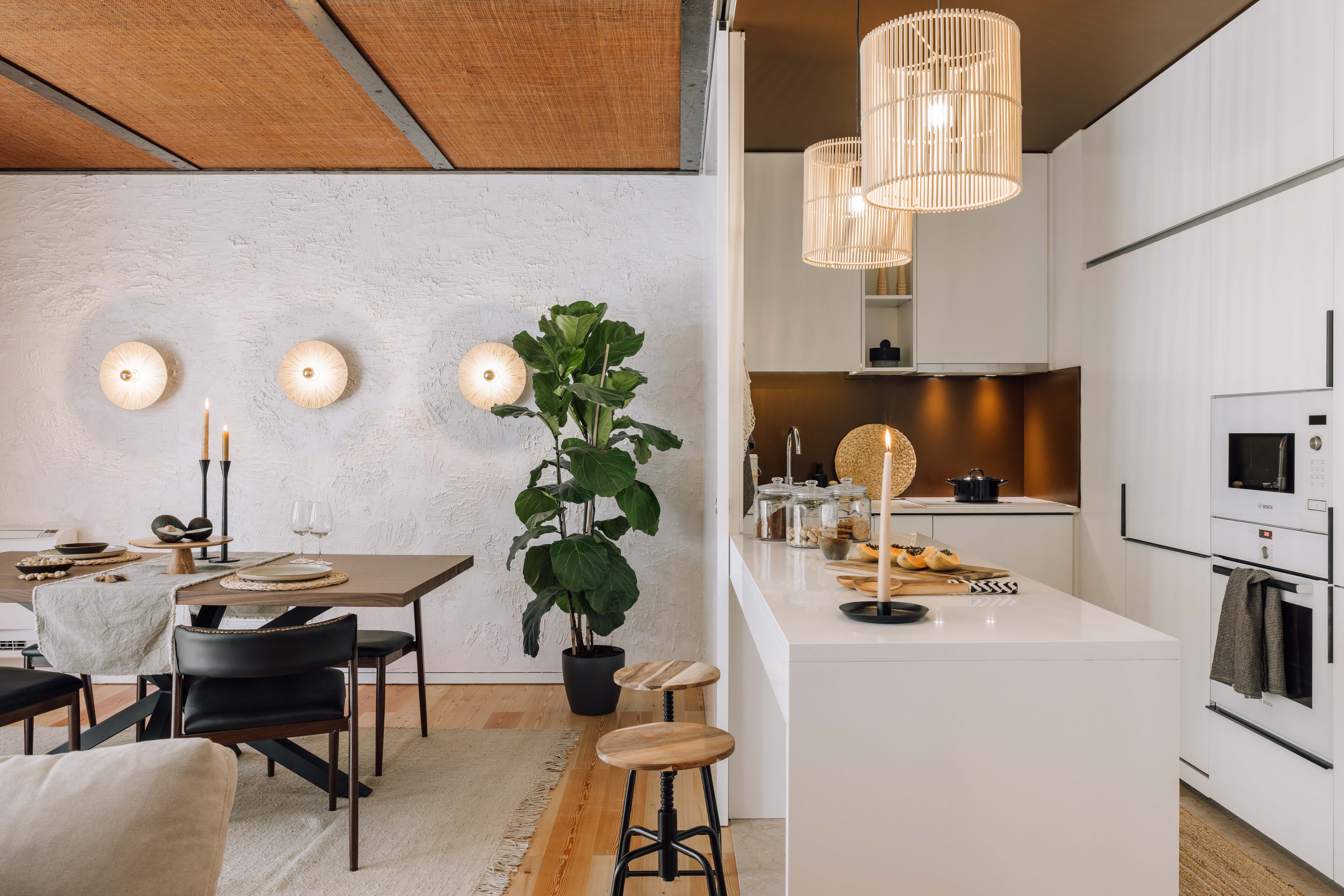 This home welcomes you with a light-filled interior which evokes exotic jungle themes, with sleek furnishings, wood elements and unique art pieces. Kick back and relax in the comfy living room where a plush sofa awaits you. Enjoy an evening of Netflix and wine or pop on a record and chill out in the company of your loved ones. If you don’t feel like eating out, there’s a well-equipped kitchen here, which will make rustling up something delicious a work of moments. Gather everyone around the wooden dining table and savour the feast.