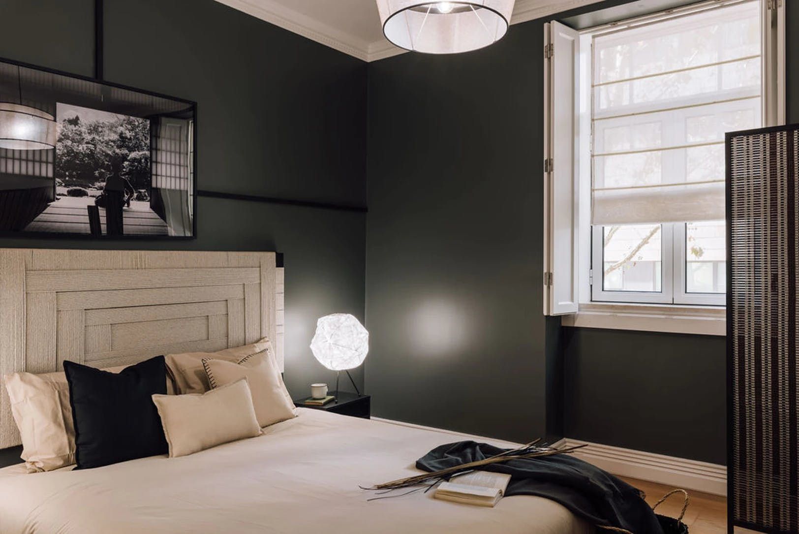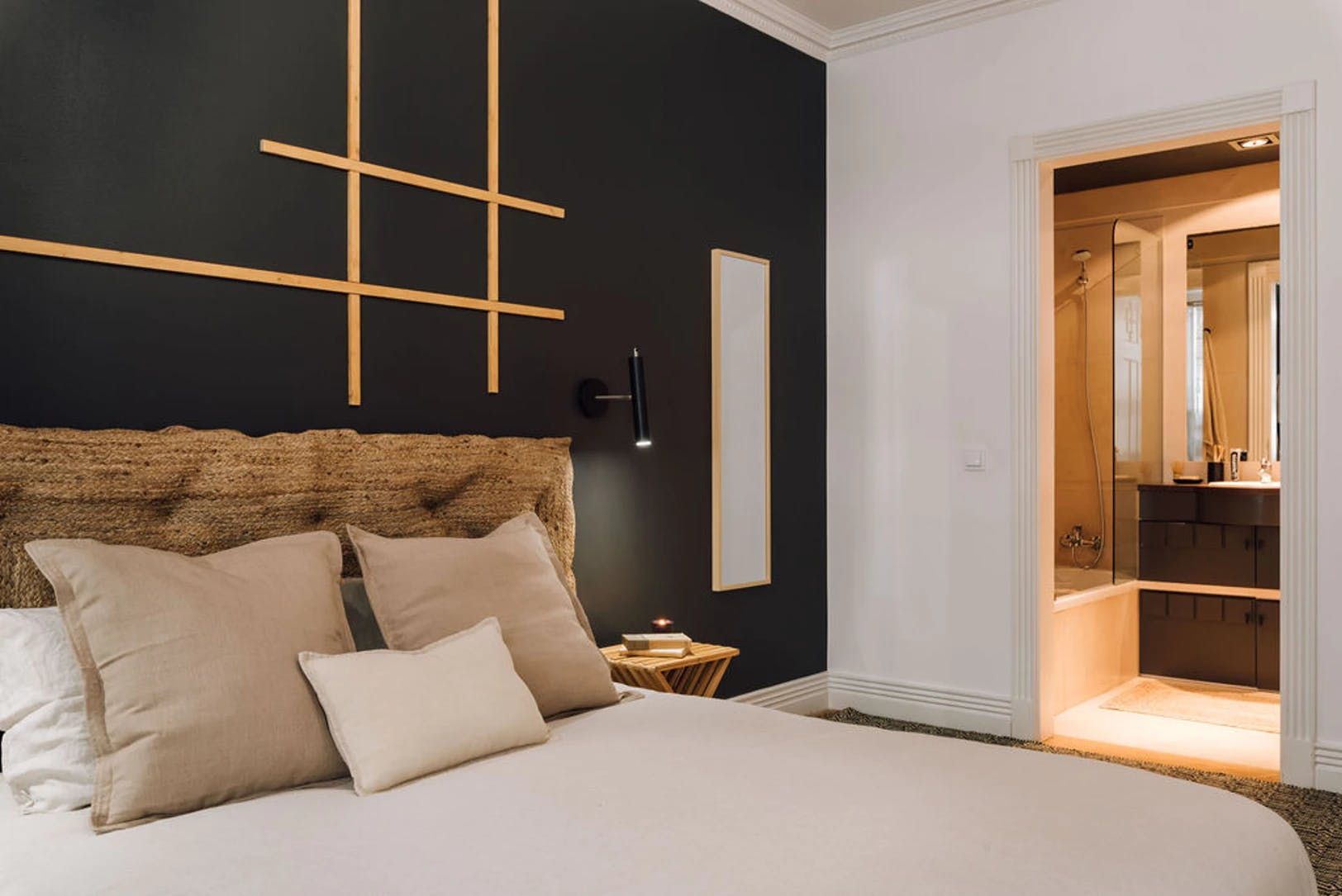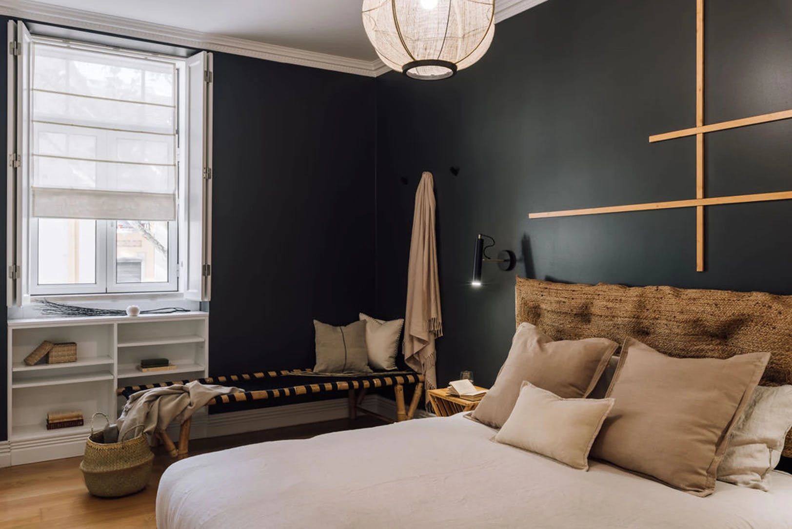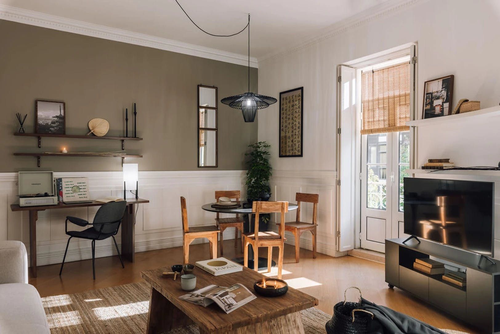 Elegant, modern and with a distinctly Japanese-inspired feel, this beautiful apartment just outside Parque Eduardo VII in Lisbon’s Santo António neighbourhood provides a wonderfully peaceful base. Paying homage to the serenity of mountain landscapes, the home’s design focuses on mellow, natural colour palettes, soft furnishings and wooden accents to create a wholly peaceful space in which to unwind. We love the delicate hanging fabric above the sofa and the bamboo shades on the French doors. Open these up to reveal three charming balconies overlooking a leafy boulevard – the ideal spot for morning coffees and glasses of wine at sunset. There’s a desk in the living room too should you need to catch up on work and a record player to get soirées around the dining table off on the right beat. The two bedrooms, meanwhile, are equally soothing, providing dreamy canvases for a blissful night’s sleep thanks to their warm, dark palettes and comfortable beds. Outside of your home, Avenida da Liberdade’s high-end shops are a ten-minute walk away, Parque Eduardo VII is walkable in eight and Bairro Alto’s cobblestone streets – lined with traditional restaurants and Fado bars – are fifteen minutes away by bus.