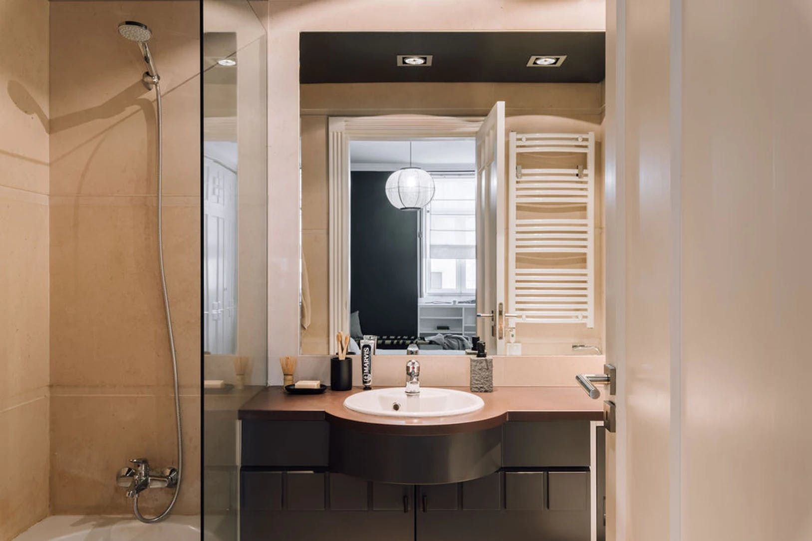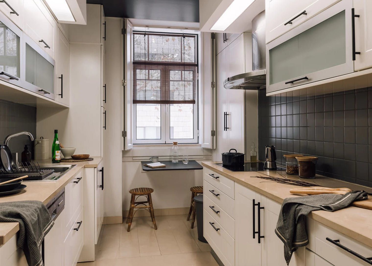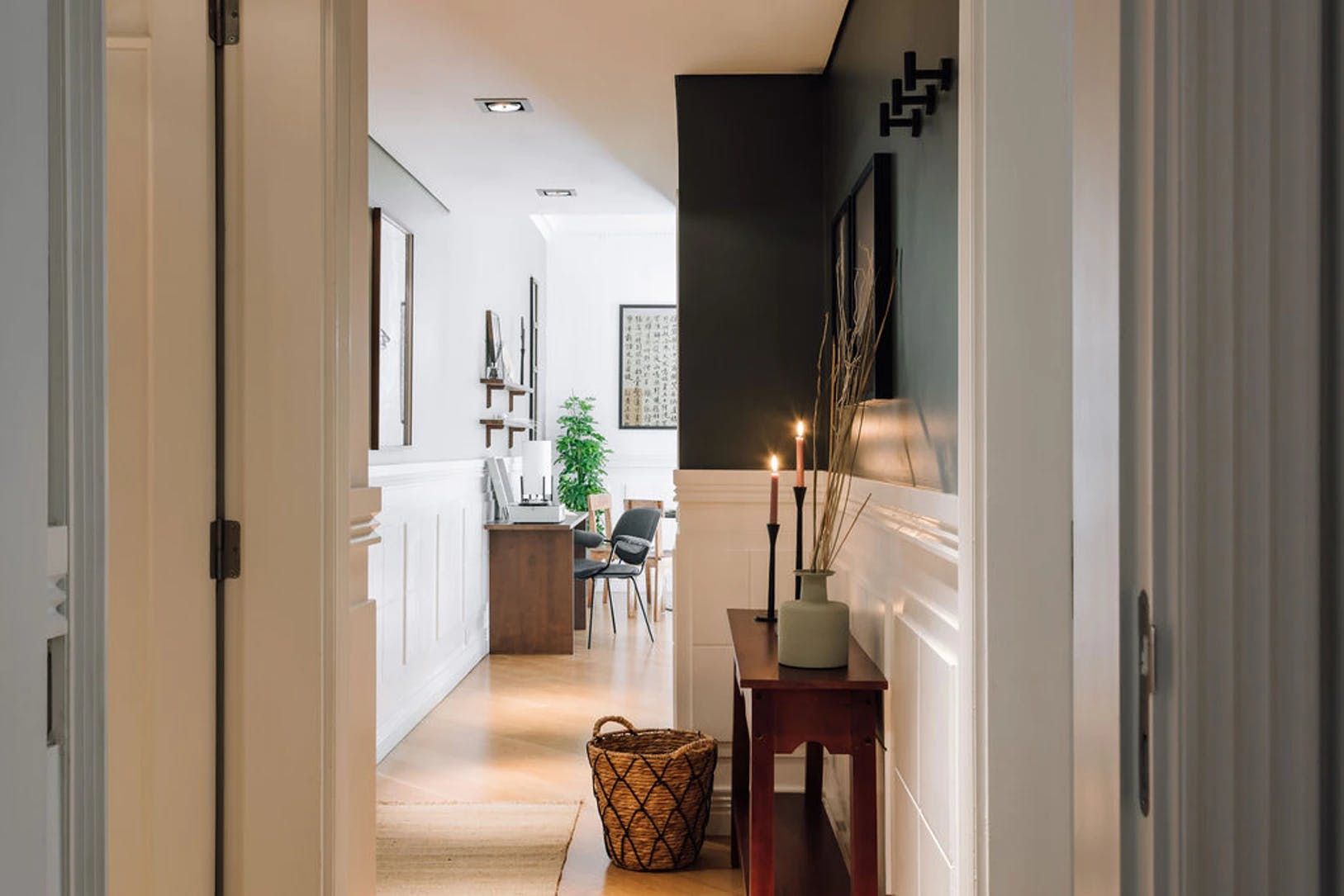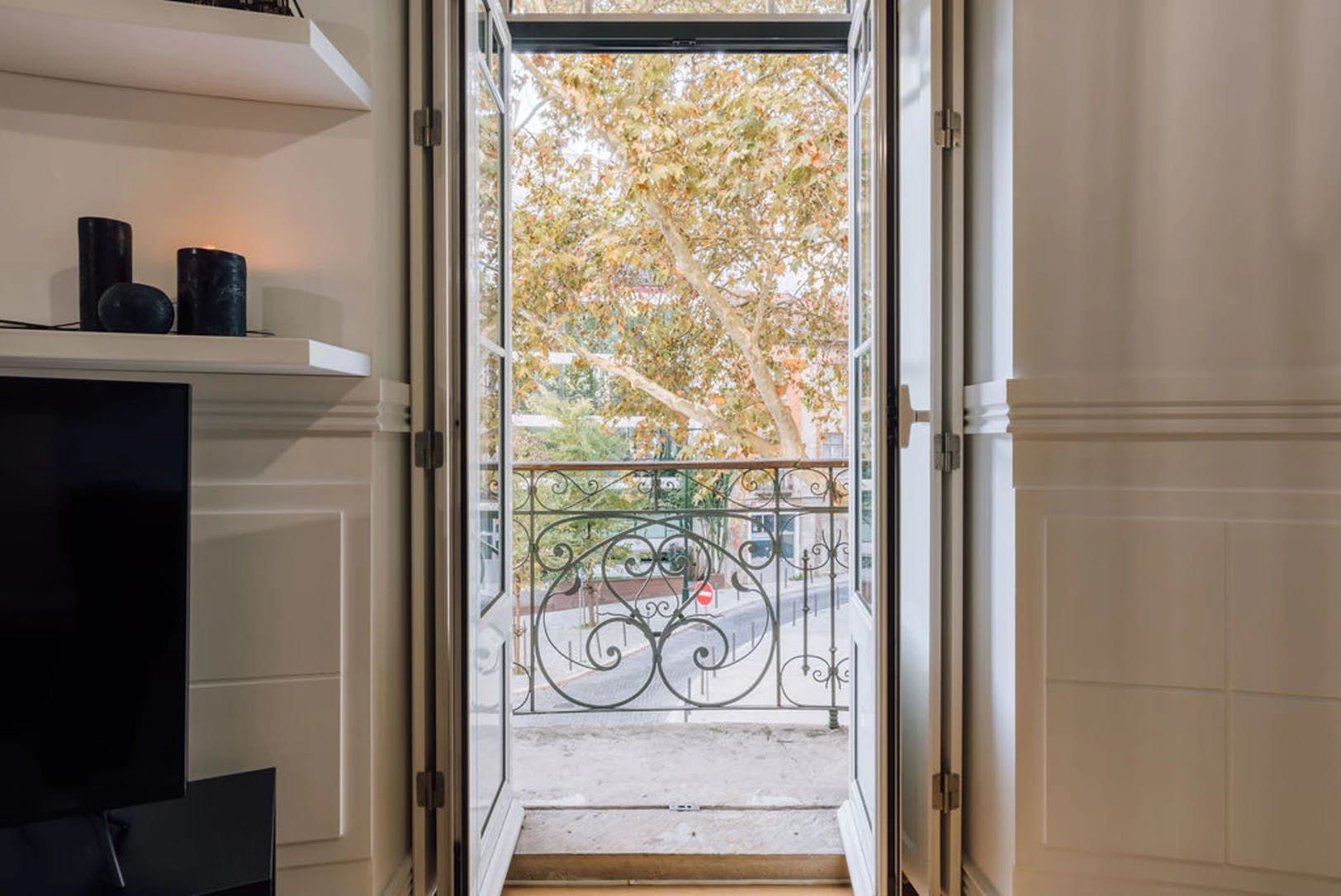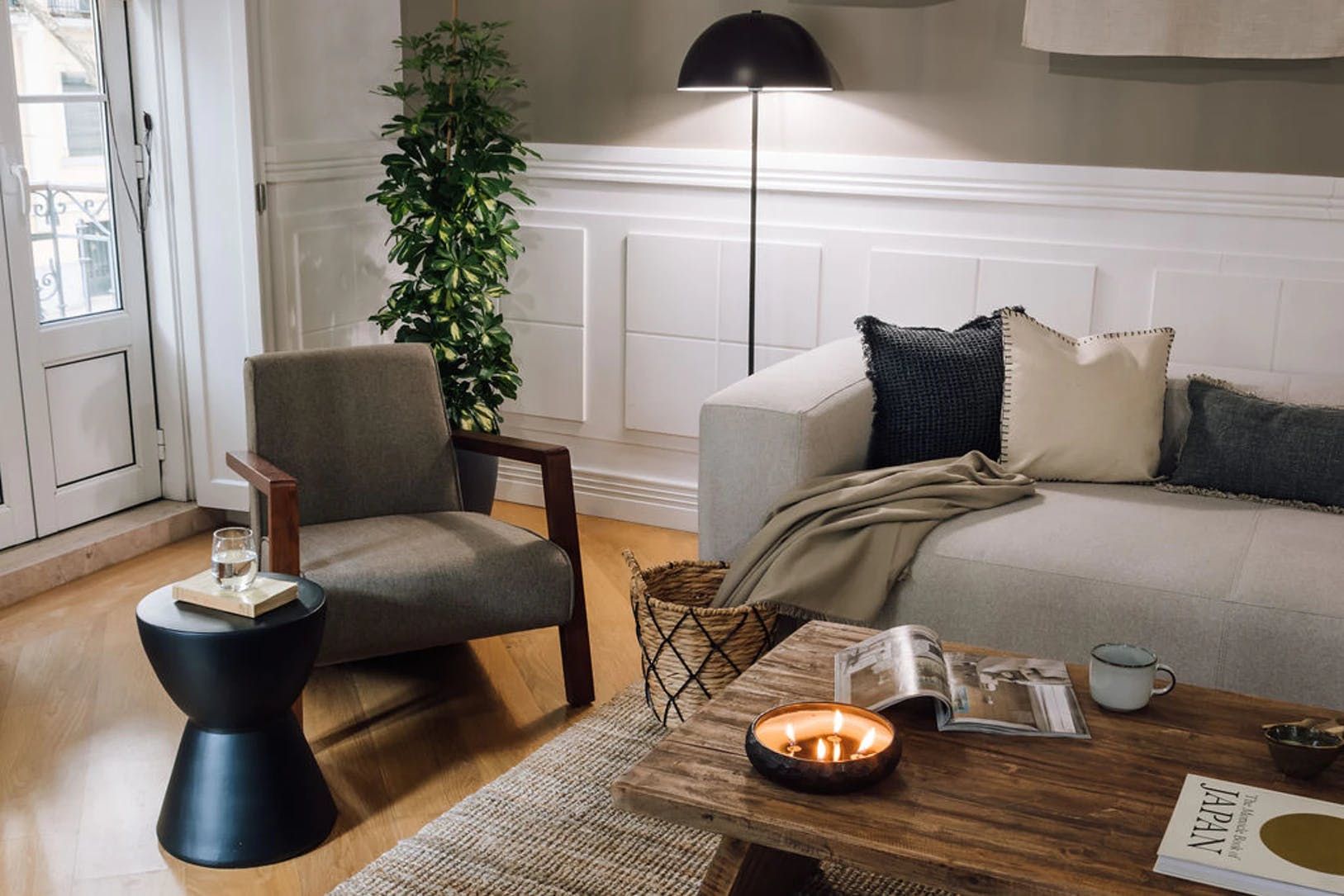 Elegant, modern and with a distinctly Japanese-inspired feel, this beautiful apartment just outside Parque Eduardo VII in Lisbon’s Santo António neighbourhood provides a wonderfully peaceful base. Paying homage to the serenity of mountain landscapes, the home’s design focuses on mellow, natural colour palettes, soft furnishings and wooden accents to create a wholly peaceful space in which to unwind. We love the delicate hanging fabric above the sofa and the bamboo shades on the French doors. Open these up to reveal three charming balconies overlooking a leafy boulevard – the ideal spot for morning coffees and glasses of wine at sunset. There’s a desk in the living room too should you need to catch up on work and a record player to get soirées around the dining table off on the right beat. The two bedrooms, meanwhile, are equally soothing, providing dreamy canvases for a blissful night’s sleep thanks to their warm, dark palettes and comfortable beds. Outside of your home, Avenida da Liberdade’s high-end shops are a ten-minute walk away, Parque Eduardo VII is walkable in eight and Bairro Alto’s cobblestone streets – lined with traditional restaurants and Fado bars – are fifteen minutes away by bus.