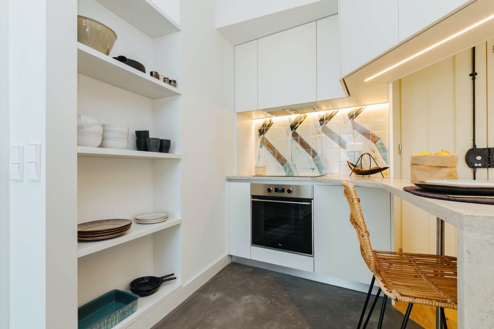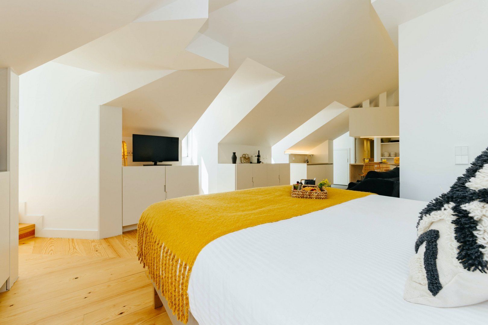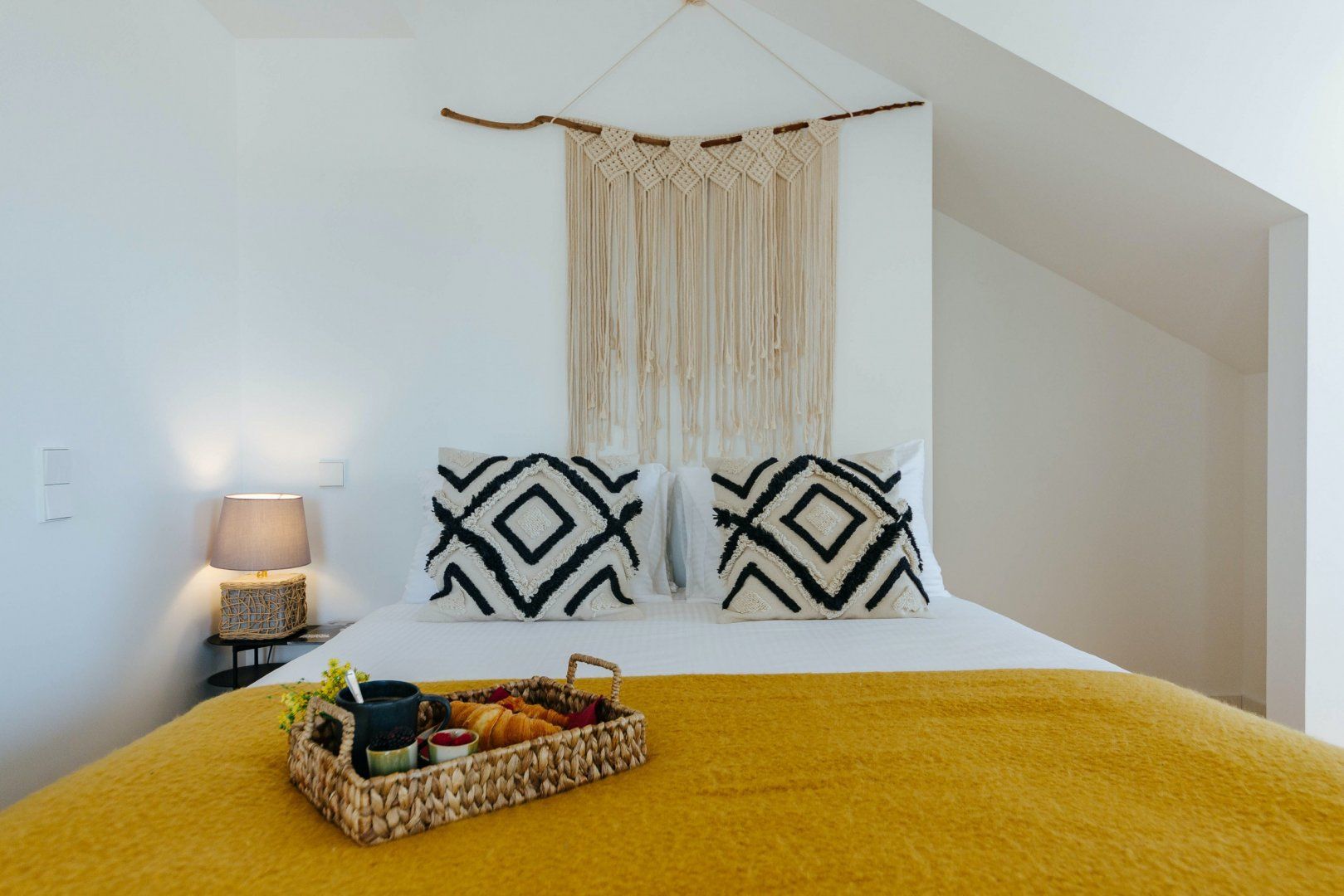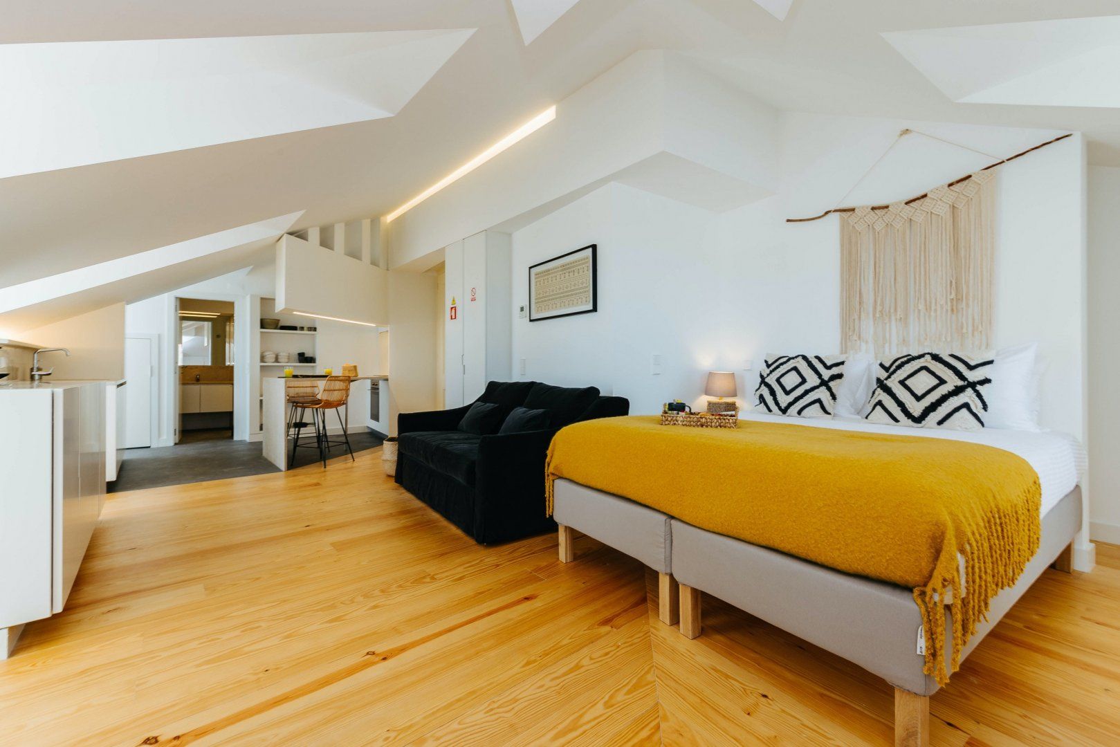 Stepping inside, you'll be greeted by boho-chic interiors, with mustard-yellow decor, macrame wall fittings and wood floors creating a calming space to call home. Cook up tasty meals in the traditionally azulejo-tiled kitchenette, treat yourself to an indulgent soak in the bathtub, and map out the day's plans on the plush sofa.