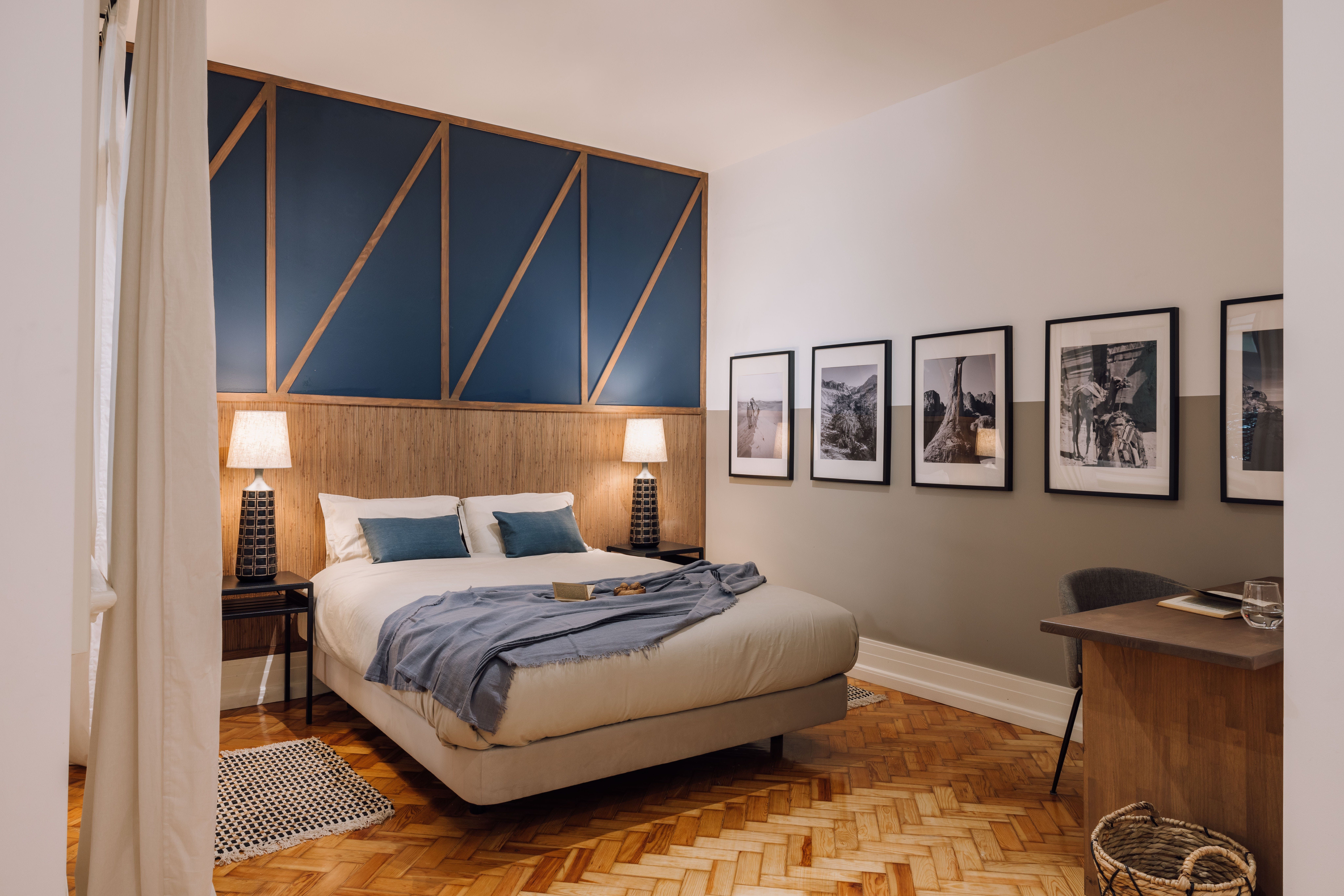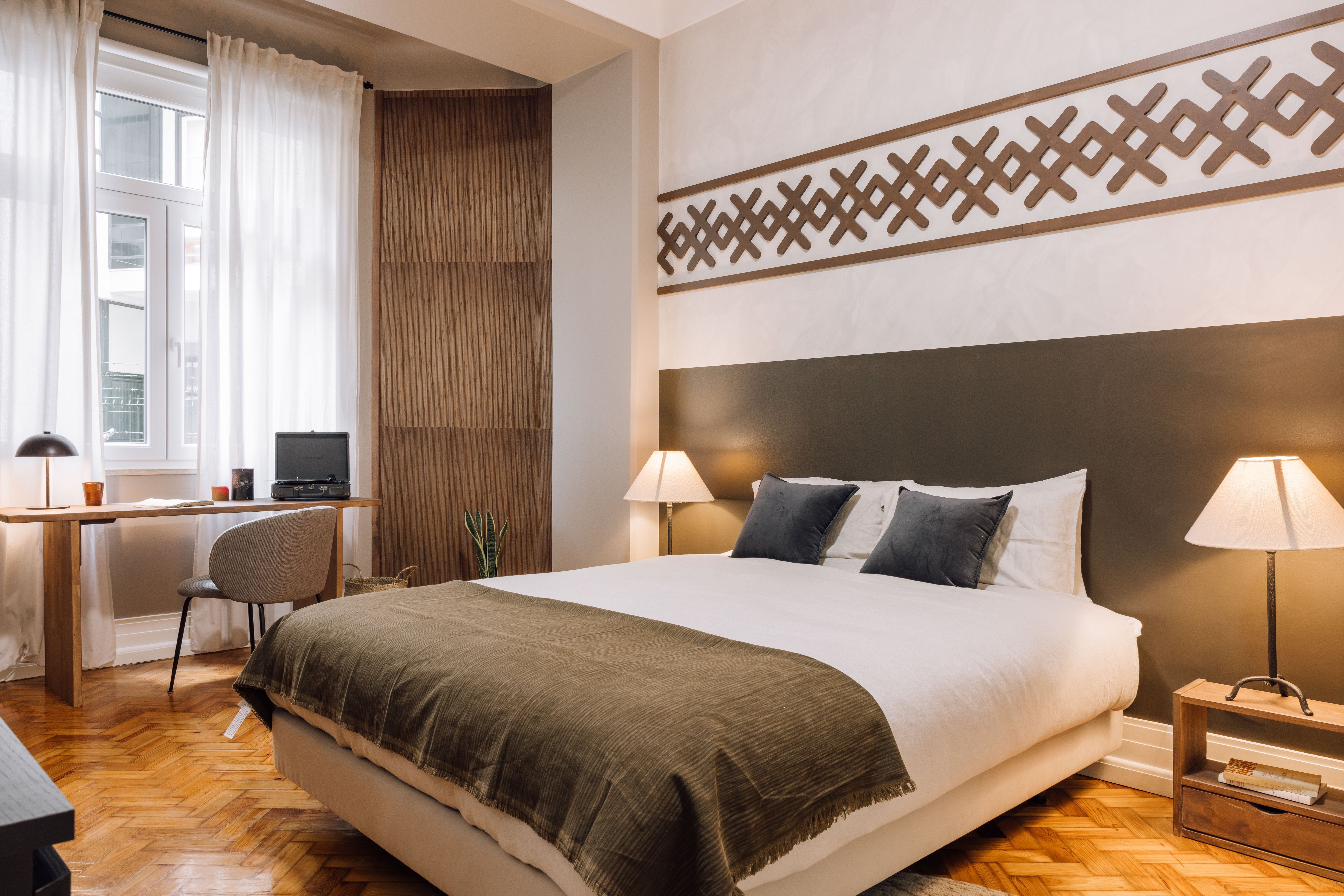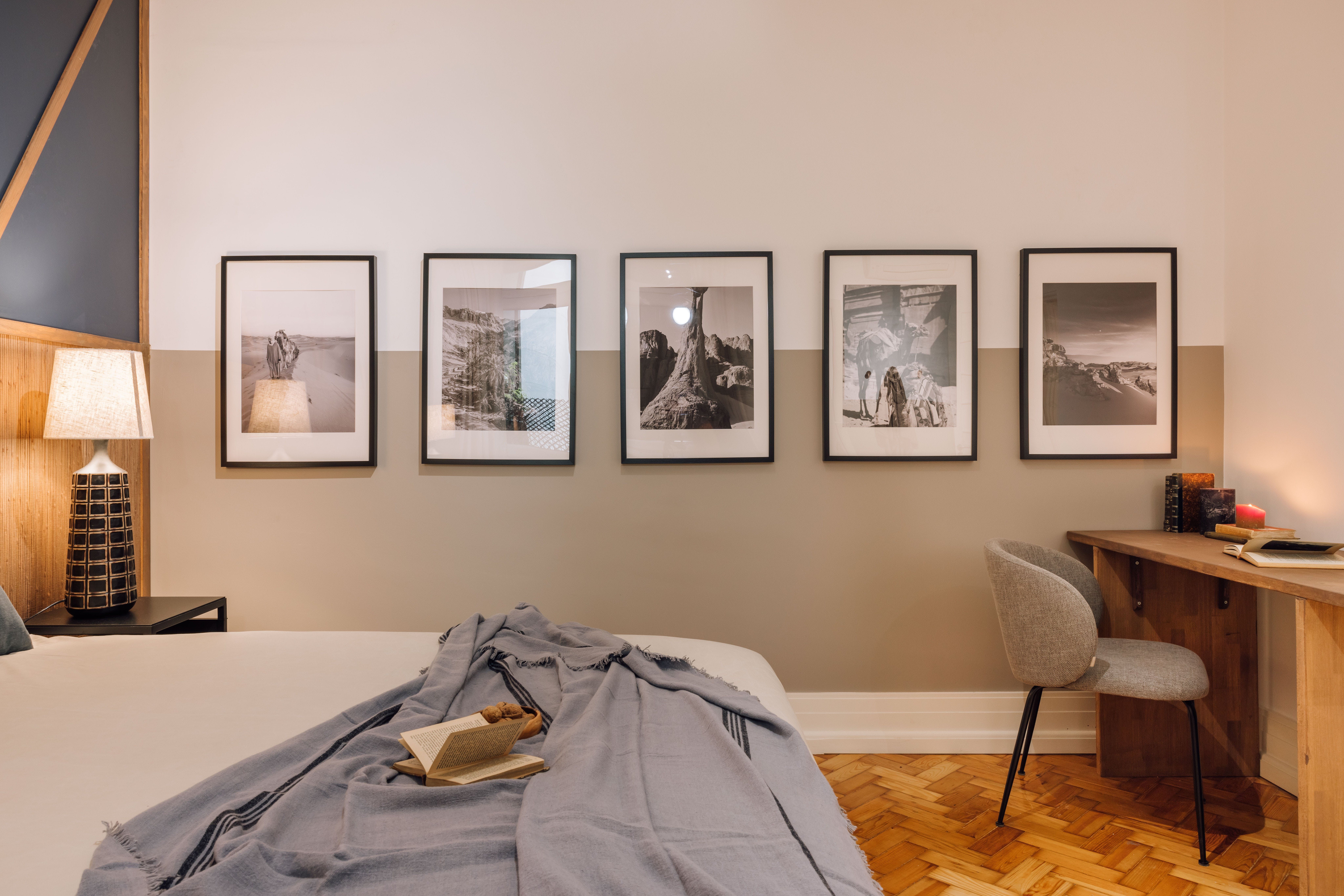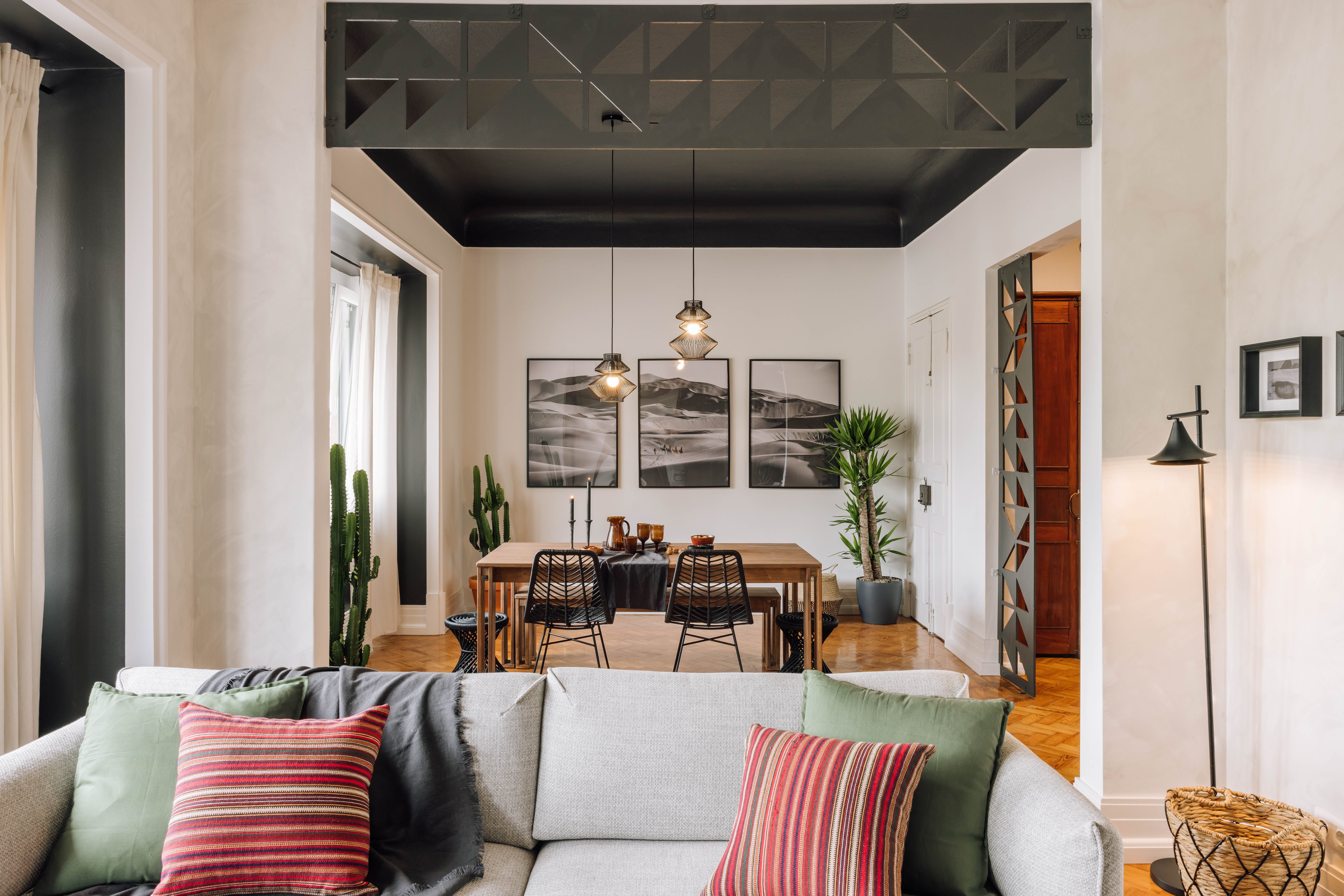 The cacti are a welcoming feature alongside the sharp angles of the dining table and a desert triptych on the wall. Metal partitions with right-angled triangle cut-outs, black bamboo dining chairs, and a glass dining nook feel far from typical Portuguese interiors. Sip your morning coffee in this conservatory-like space, followed by fresh fruit juice on your private terrace at lunch, and a few glasses of douro on the sofa in the evening.