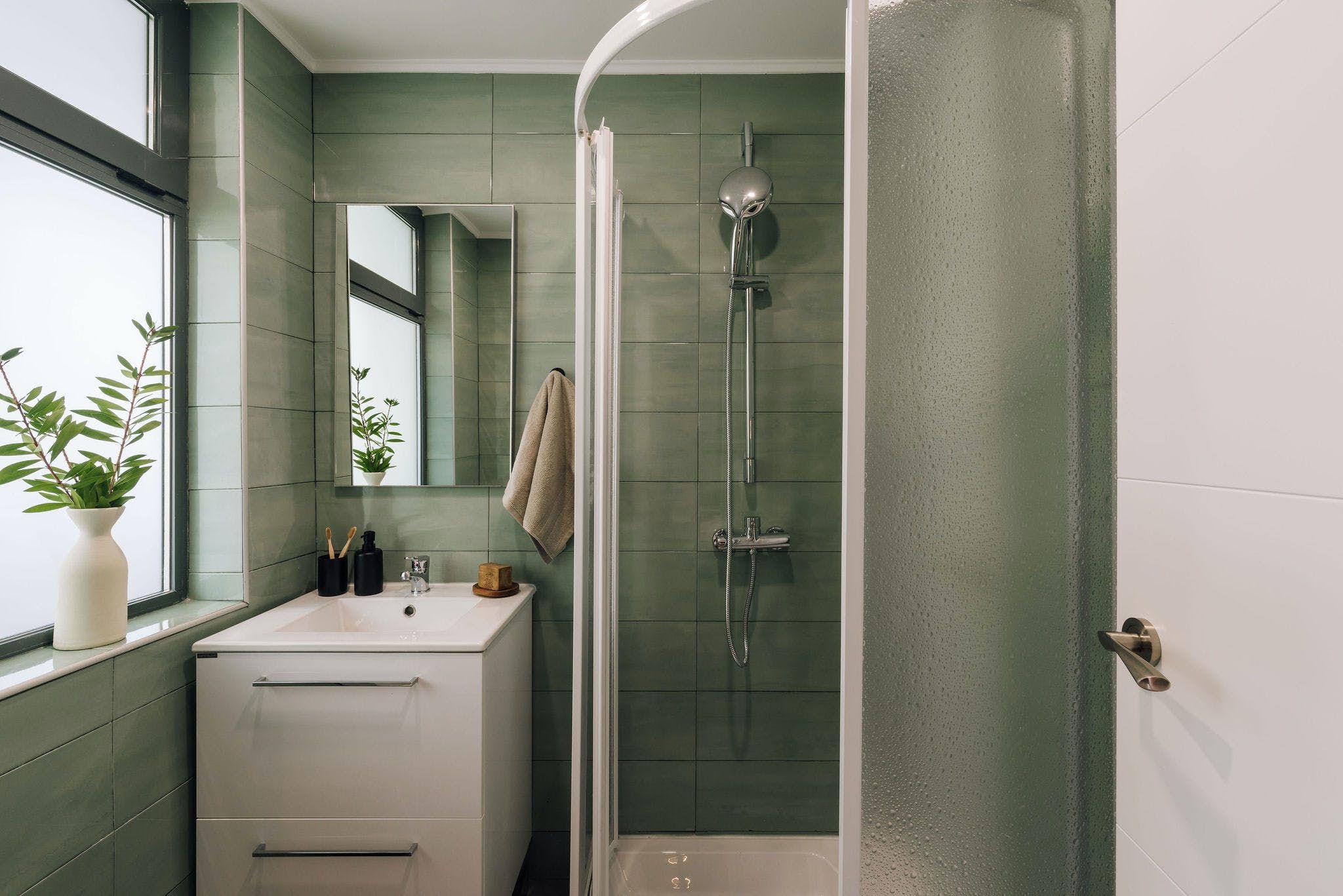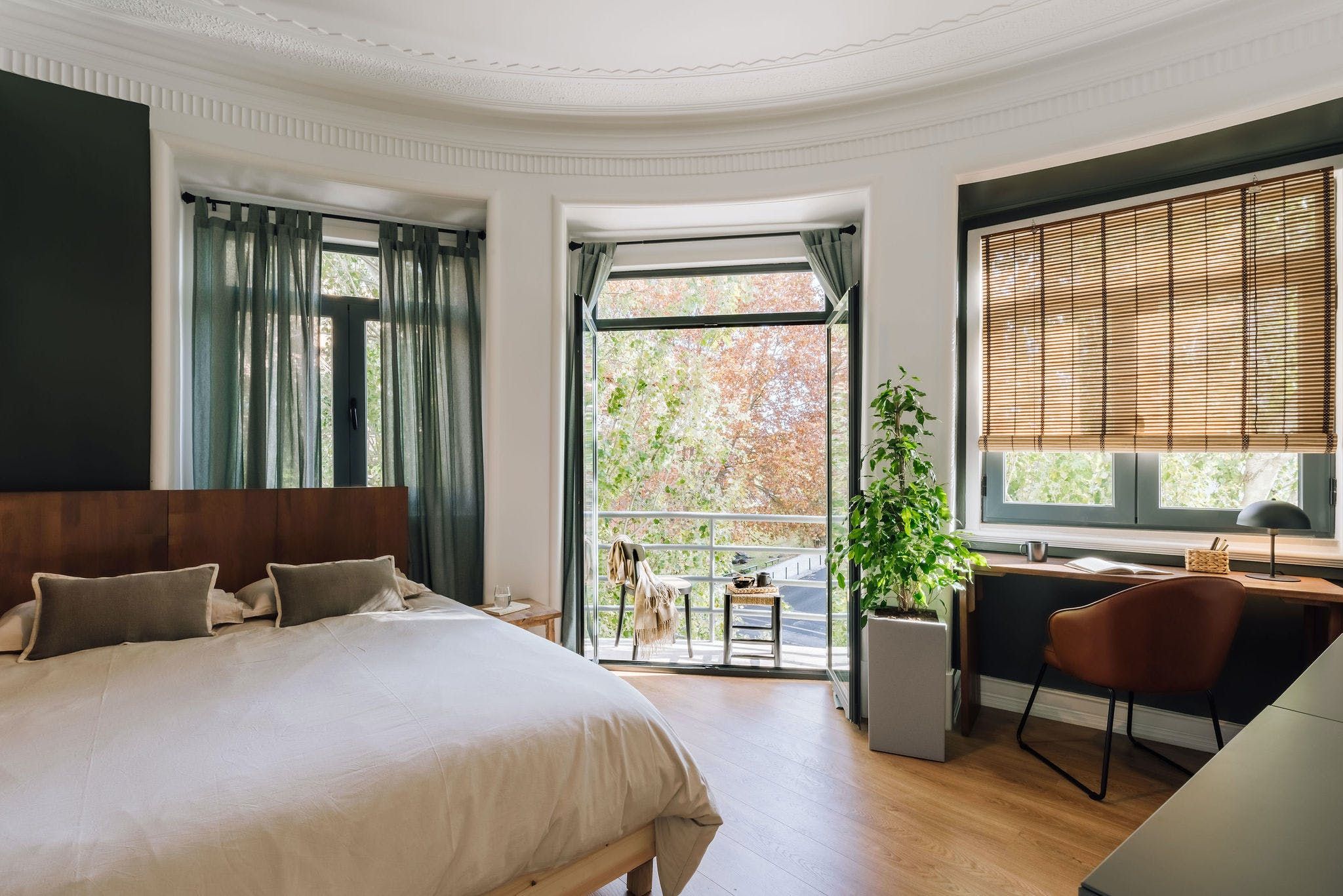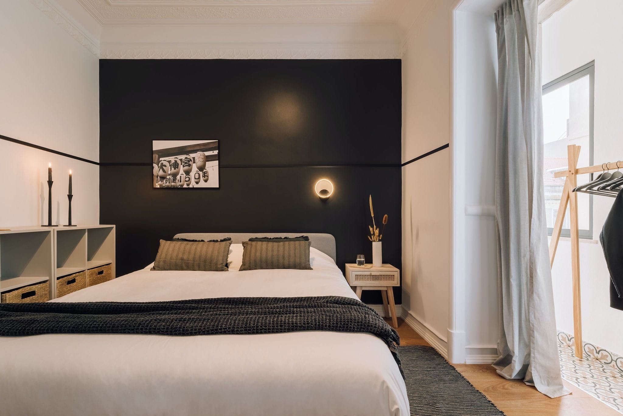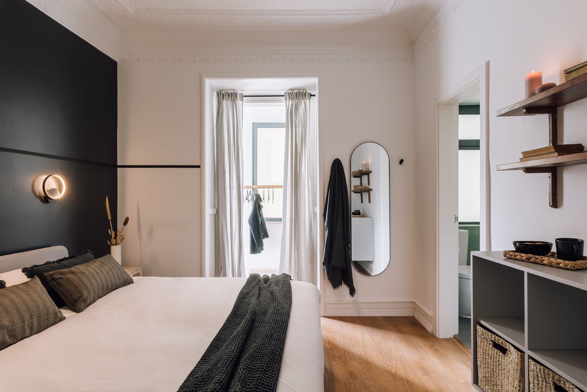 Perched in a residential spot in the heart of sunny Lisbon, this stylish apartment features both an on point location and impeccable design details. As you arrive inside the space, you'll be welcomed by the home's contemporary interiors that contrast different textures to create a soothing space from which you can relax in style. However, it's the finer details of this place that allow it to stand out from the rest, from the custom neon light to the matte finish feature walls and optimal dedicated desk space – the space goes above and beyond to serve its guests with a pleasing experience. We particularly love the colour palette of the calming peppermint bathroom – it provides the perfect place to pamper yourselves after an active day of discovering the city. Enjoy the just as green leafy neighbourhood from the privacy of one of the home's balconies, or better still, set off on an adventure to explore Lisbon's on foot or via the world-renowned public tramway? You'll be positioned just a thirty-minute walk away from the centre of town or an even quicker fifteen minutes away by public transport.