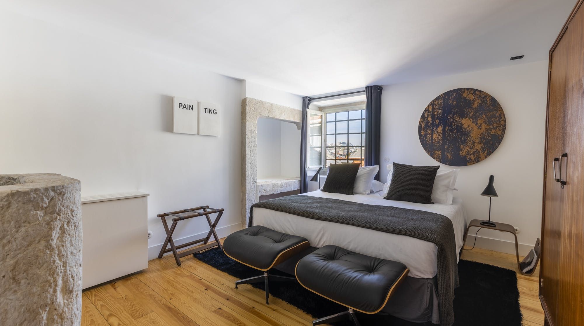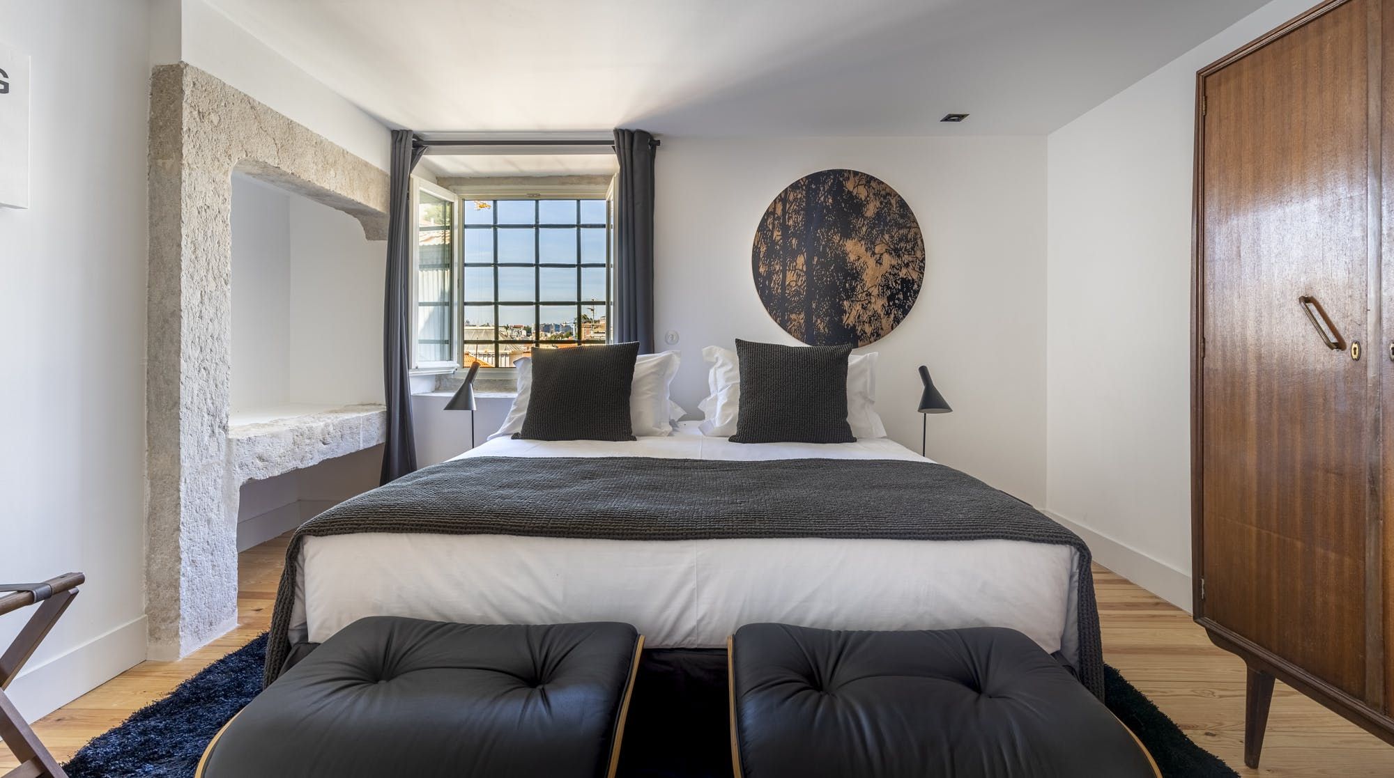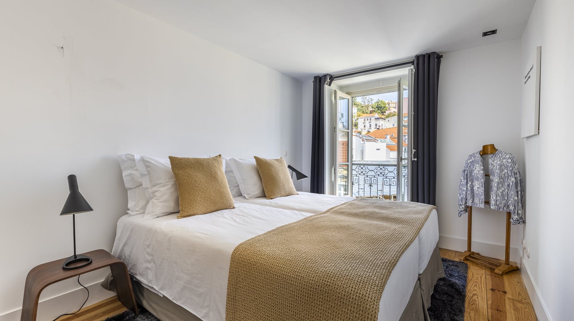 Touches of mid-century and matt black finishes fuse perfectly with its historic surroundings, including the restored stone in the bedroom and the antique wooden salting chests. Beautiful wrought-iron Juliette balconies bathe the apartment in natural light and reveal impressive views of the city, River Tagus and São Jorge Castle in the distance. It's the perfect spot to perch with your morning coffee as you hatch plans for the day ahead.