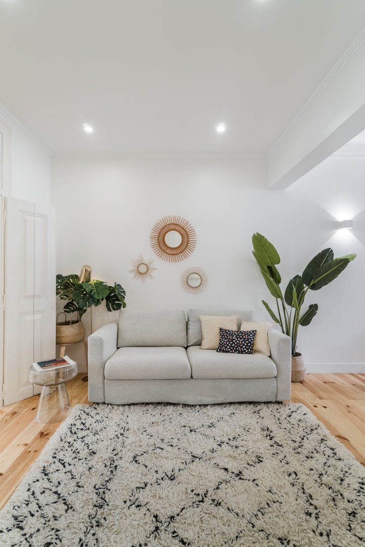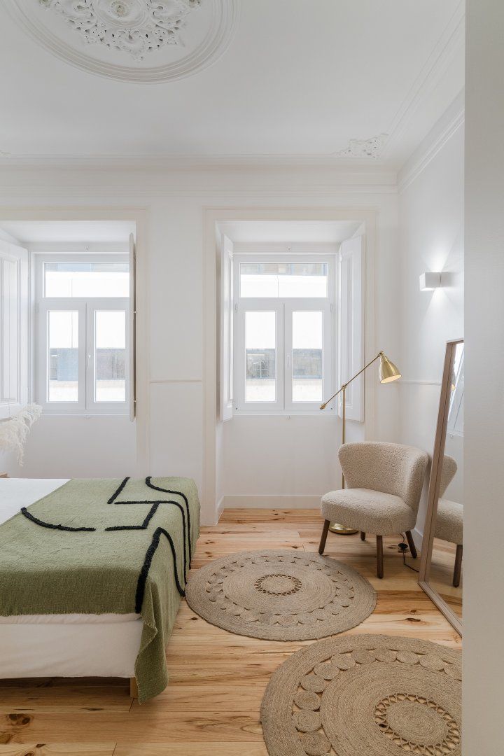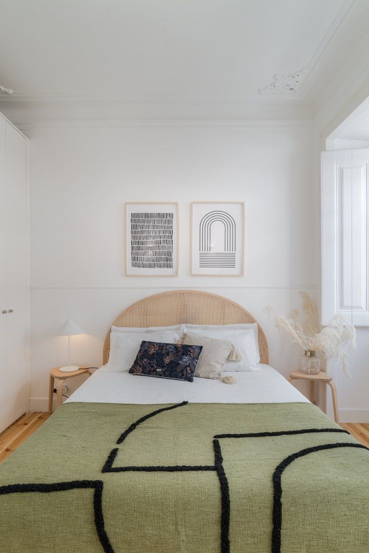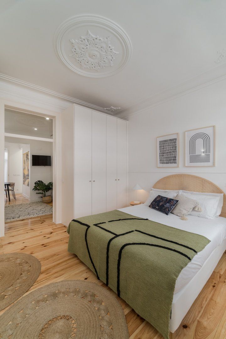The home itself is defined by tall windows that invite the natural light to sweep through every room, ornate-corniced ceilings, and contemporary soft furnishings, giving the place a sense of modernist charm. The stunning dining room features a large table and a large-scale artwork creating an idyllic environment for intimate dinners with the produce you picked up from the Lx Rural Farmers Market on Sunday. The walled courtyard with adjoining conservatory is a picture of calm, with its cosy chairs, rattan accents and tropical plants – spend afternoons here with the new book you picked up from Ler Devagar, a few steps from your apartment. Minimal and breezy but totally inviting, this place is brought to life by statement light fixtures, graphic throws and thoughtful touches.