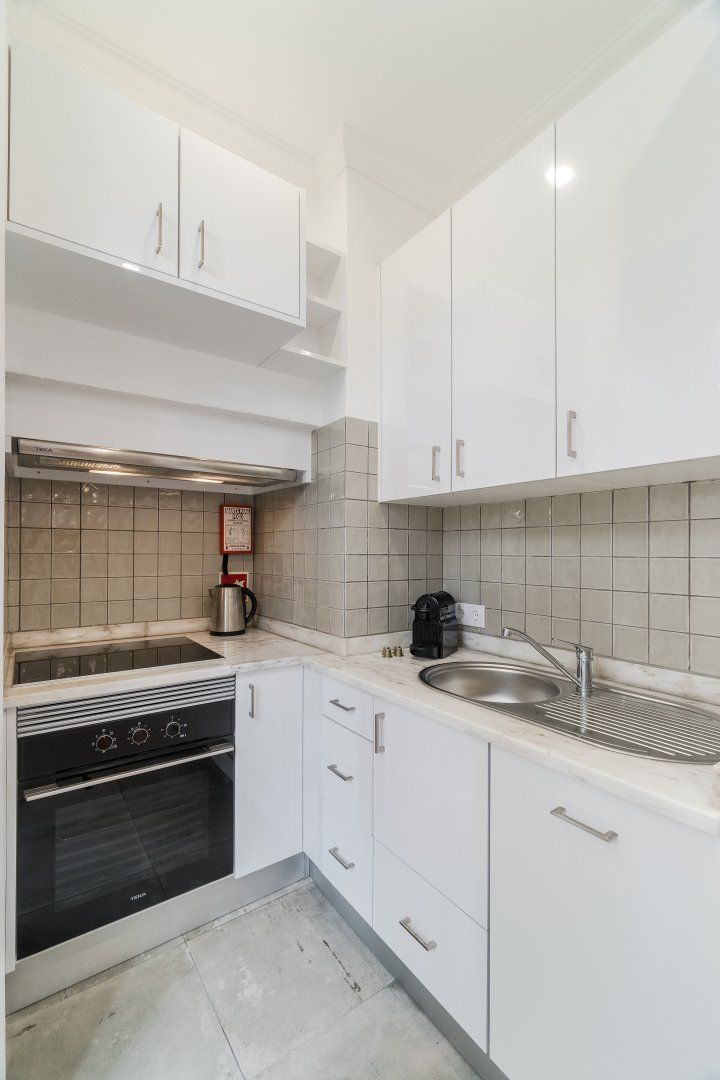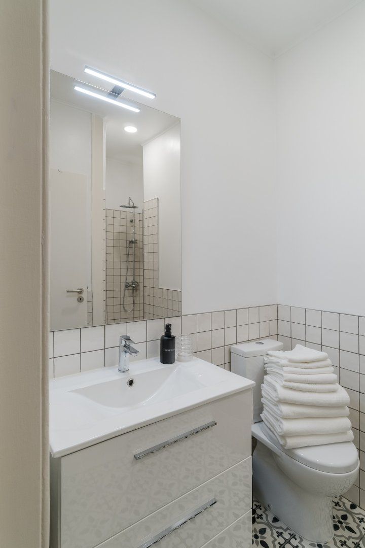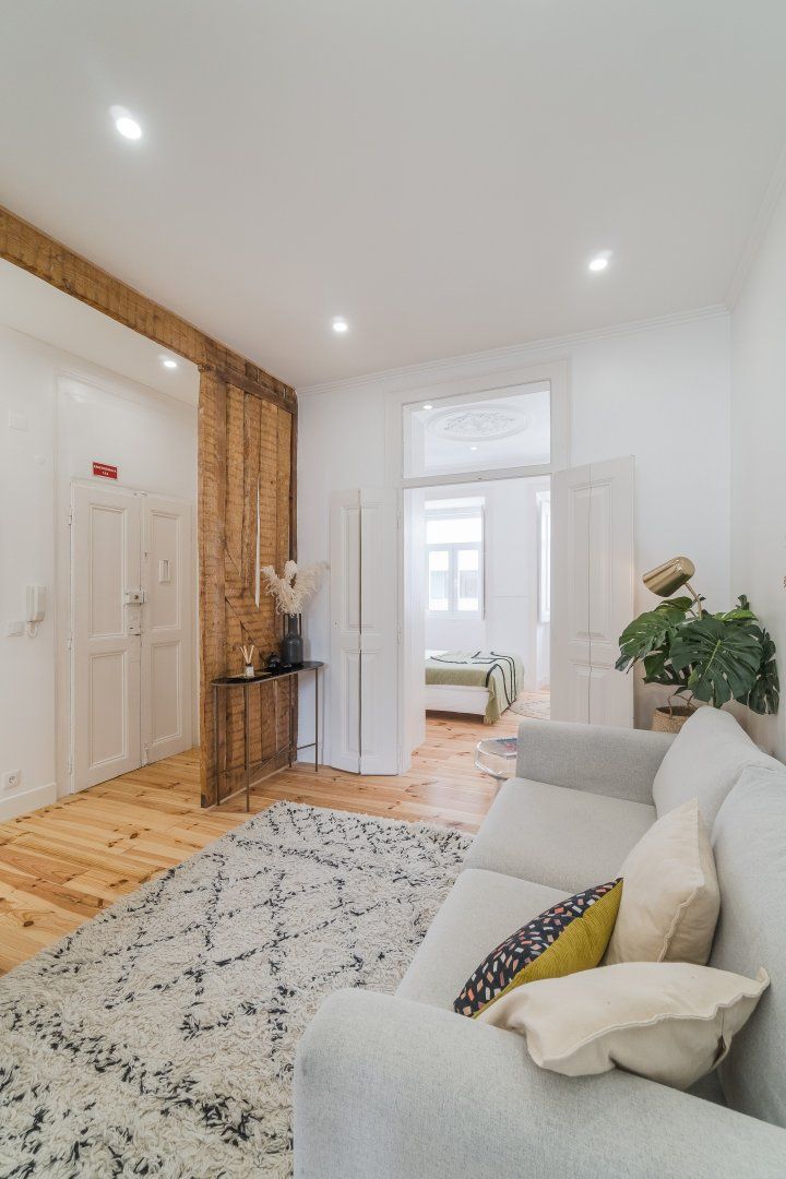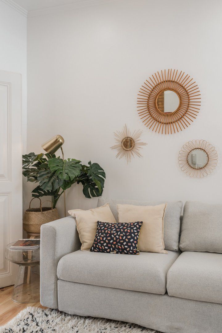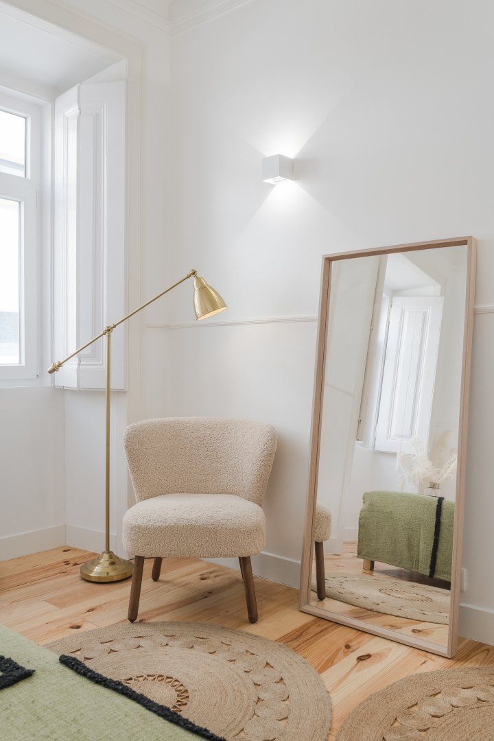 The home itself is defined by tall windows that invite the natural light to sweep through every room, ornate-corniced ceilings, and contemporary soft furnishings, giving the place a sense of modernist charm. The stunning dining room features a large table and a large-scale artwork creating an idyllic environment for intimate dinners with the produce you picked up from the Lx Rural Farmers Market on Sunday. The walled courtyard with adjoining conservatory is a picture of calm, with its cosy chairs, rattan accents and tropical plants – spend afternoons here with the new book you picked up from Ler Devagar, a few steps from your apartment. Minimal and breezy but totally inviting, this place is brought to life by statement light fixtures, graphic throws and thoughtful touches.