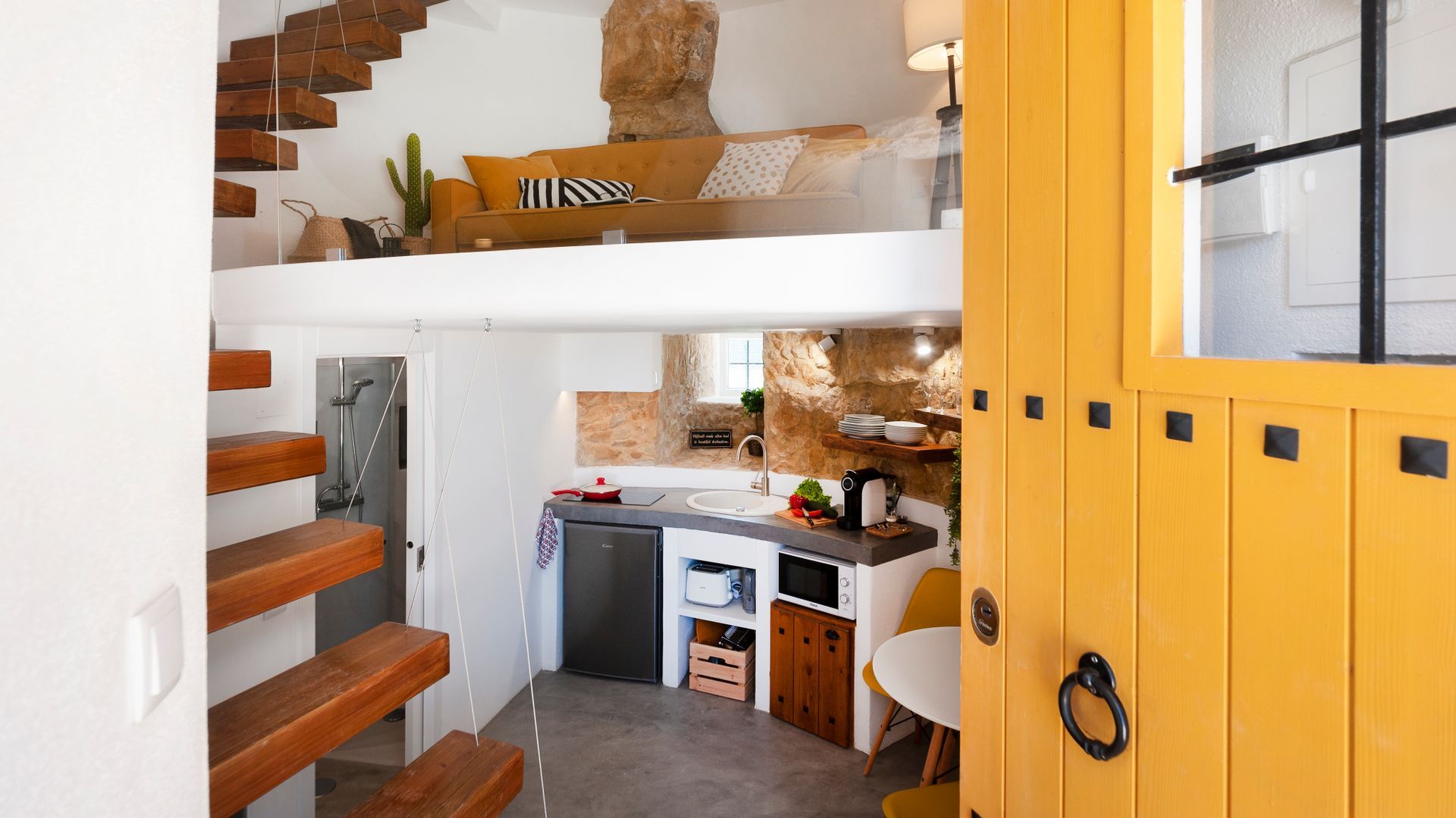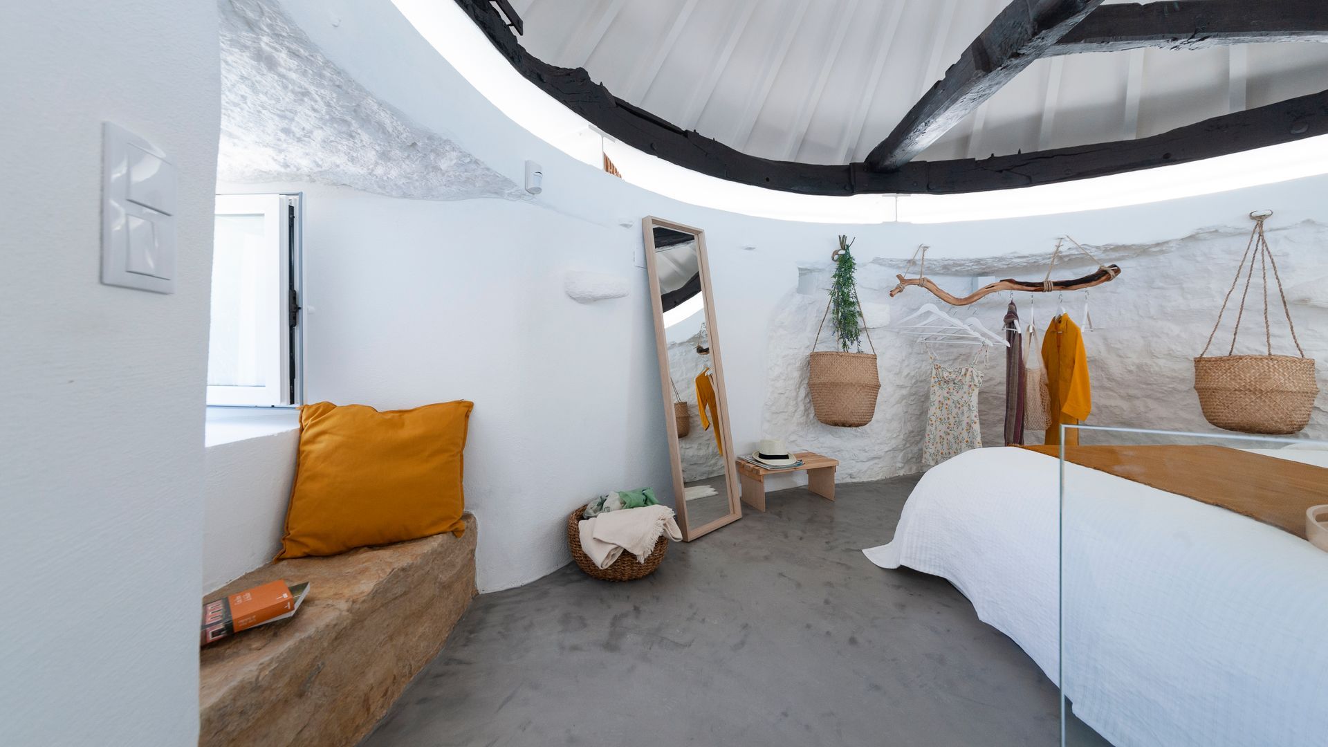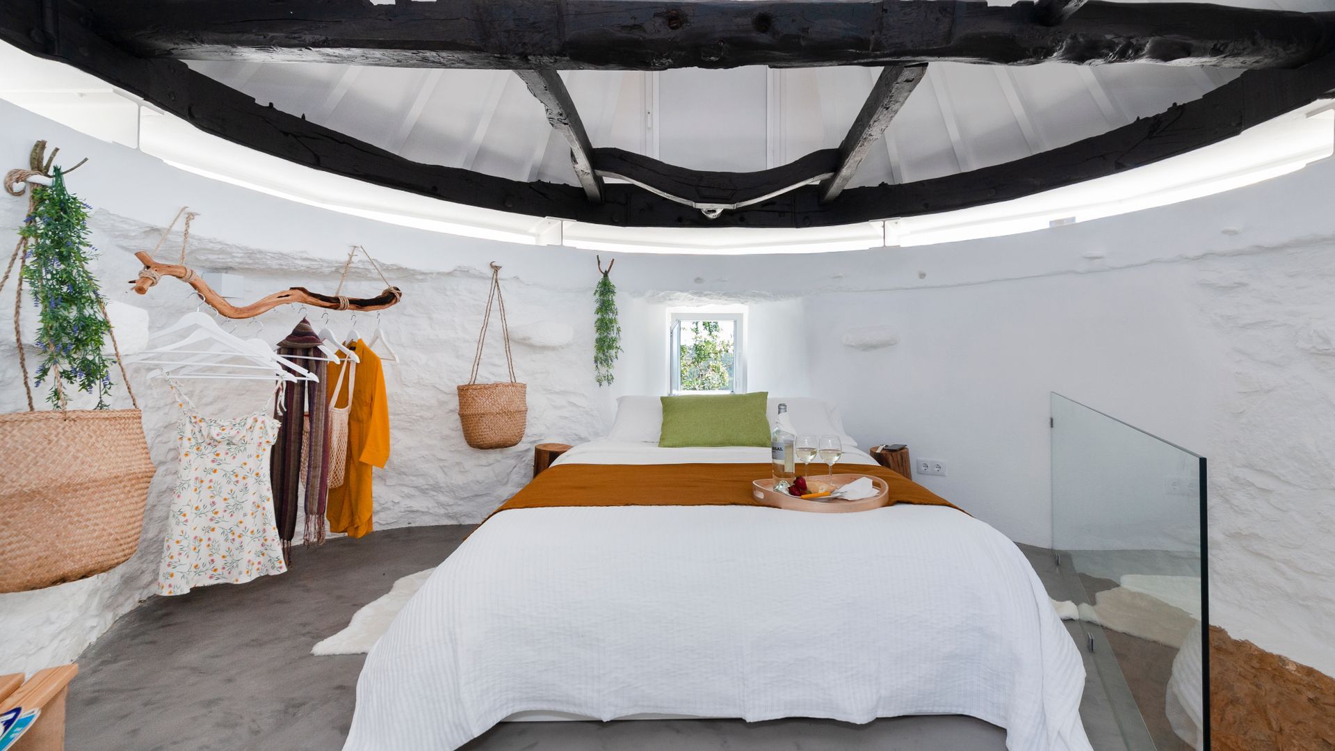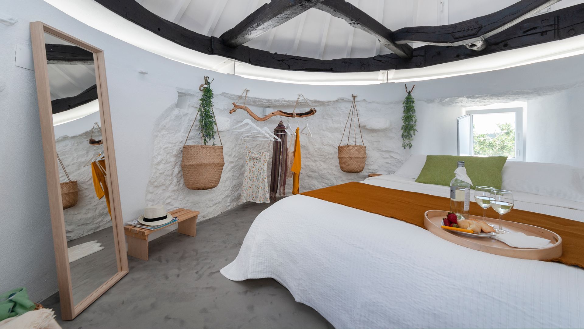 On the ground floor you'll find a little kitchen, with all you'll really need to cook light meals at home, and a bathroom where – somehow – the owners have managed to plumb the tap into part of the building's exposed rock wall itself. Floating stairs carry you up to the living room level, where a third guest could sleep on a comfy sofa bed. And then it's up to the star of the show – the bedroom. With the top of the windmill and all its internal beams as a ceiling, this magical room feels as though its floating on top of the building. And it is, kind of. A narrow window goes right round the whole room, allowing you to see out from every angle.