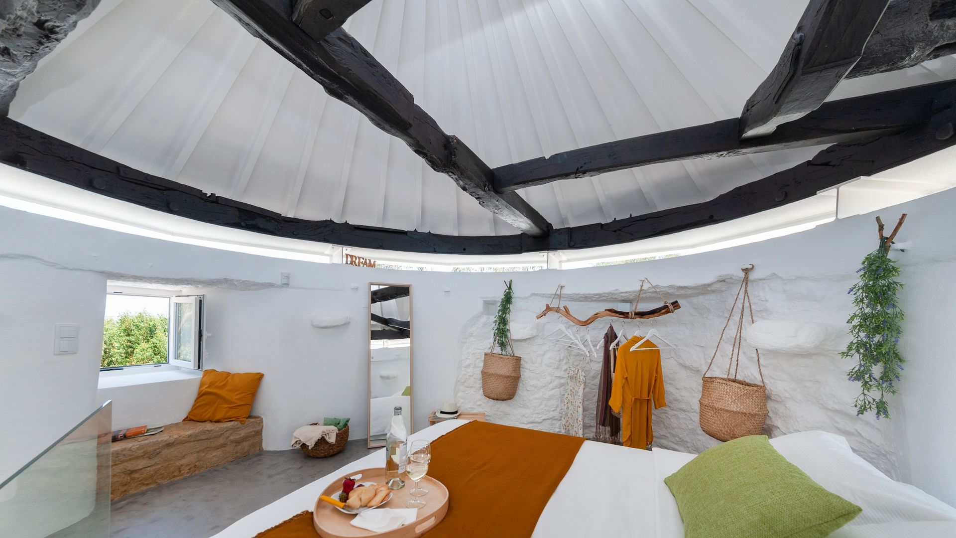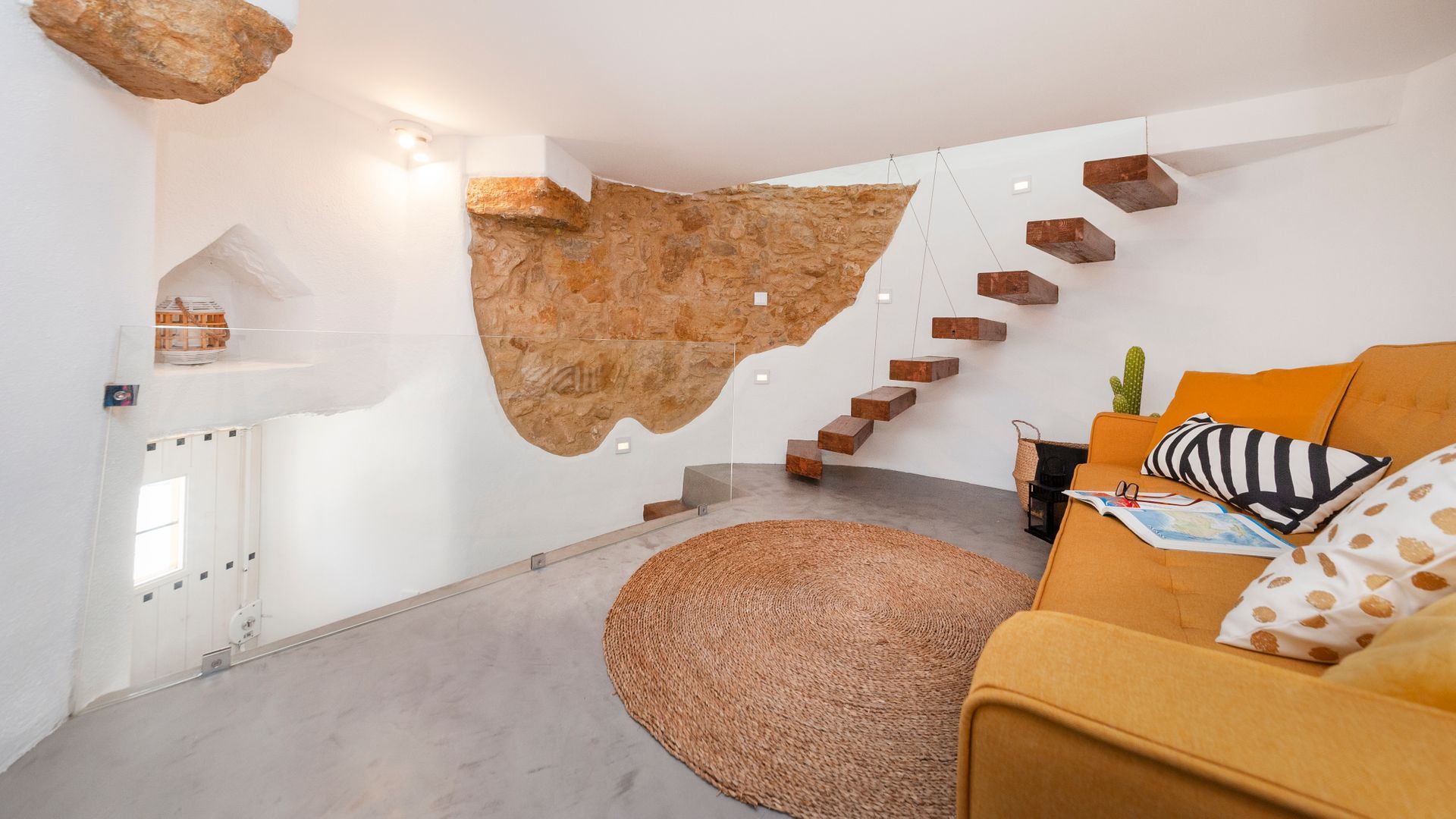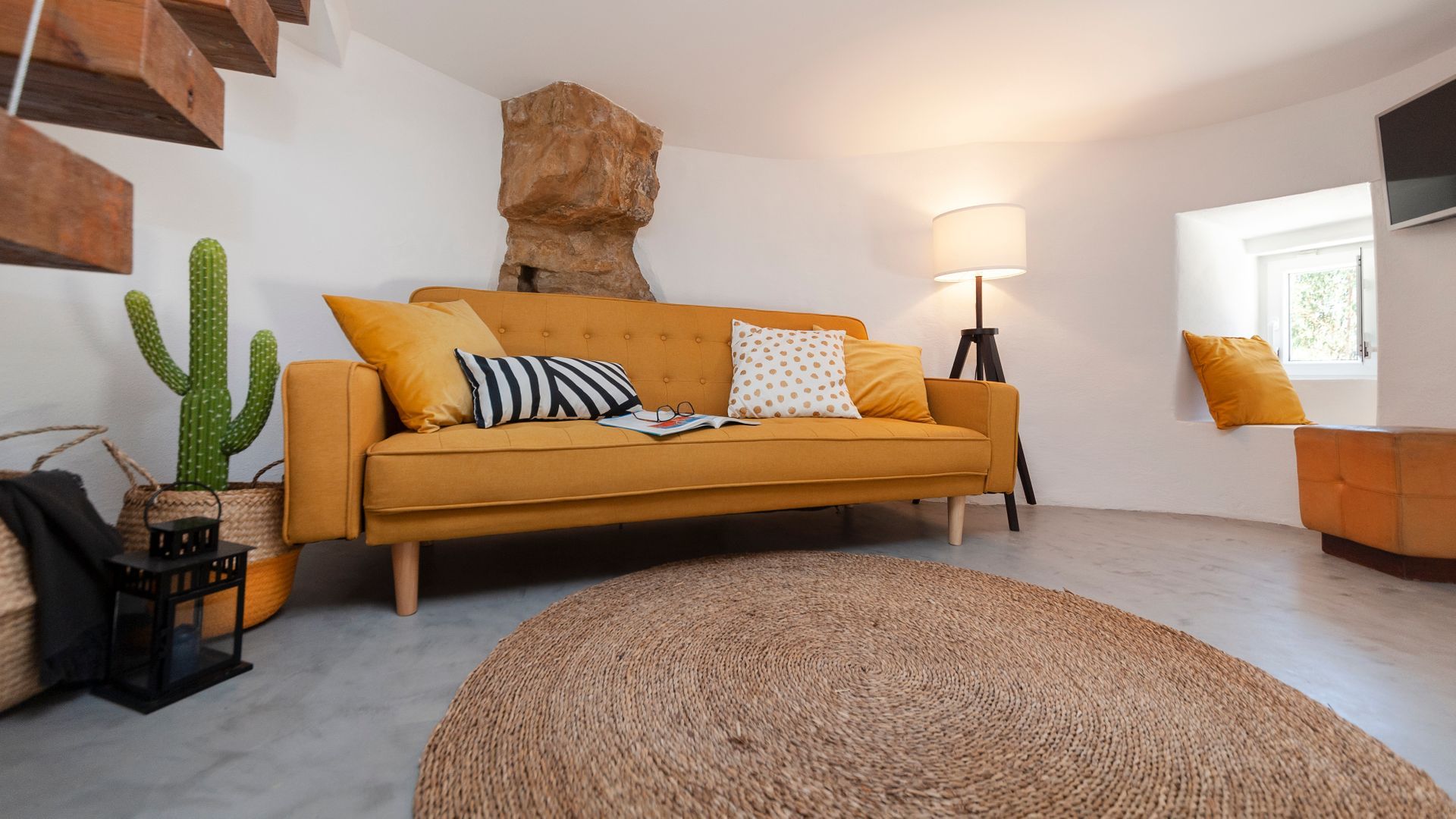 On the ground floor you'll find a little kitchen, with all you'll really need to cook light meals at home, and a bathroom where – somehow – the owners have managed to plumb the tap into part of the building's exposed rock wall itself. Floating stairs carry you up to the living room level, where a third guest could sleep on a comfy sofa bed. And then it's up to the star of the show – the bedroom. With the top of the windmill and all its internal beams as a ceiling, this magical room feels as though its floating on top of the building. And it is, kind of. A narrow window goes right round the whole room, allowing you to see out from every angle.