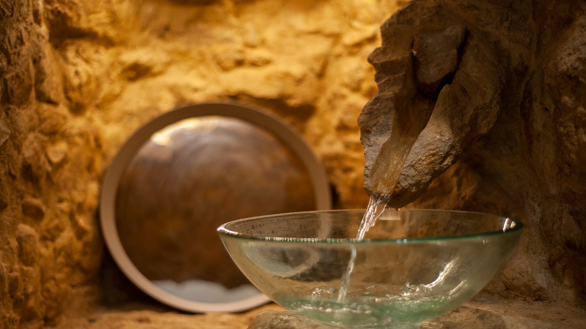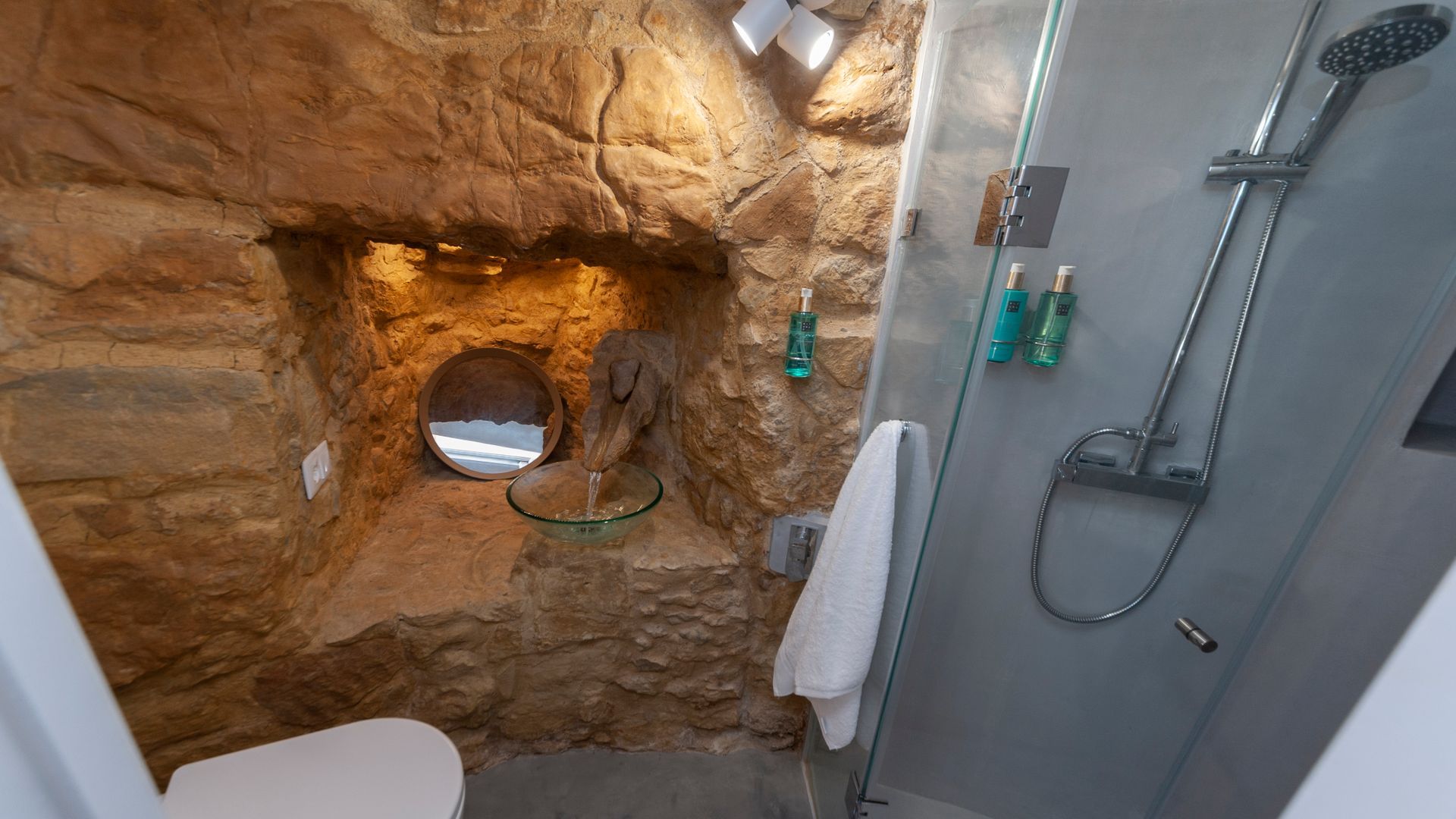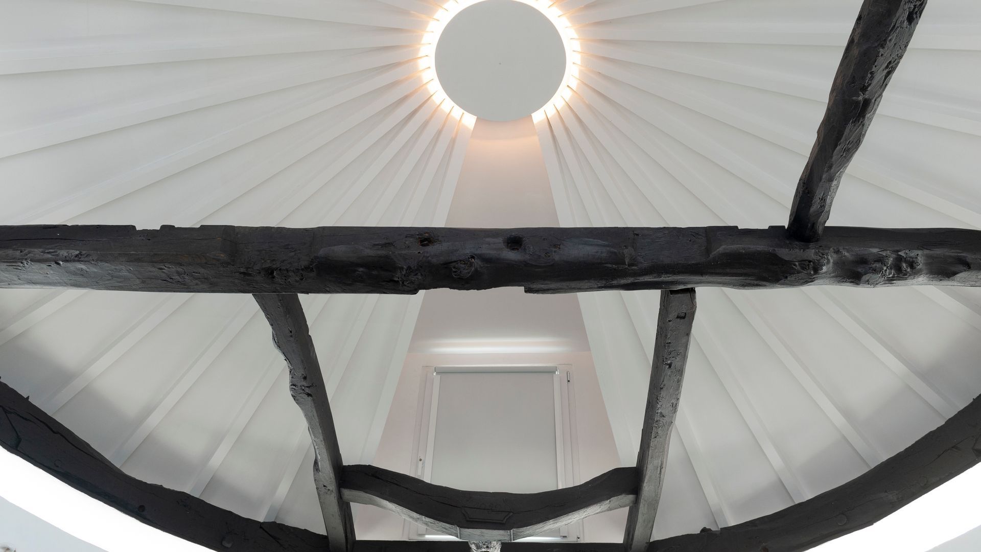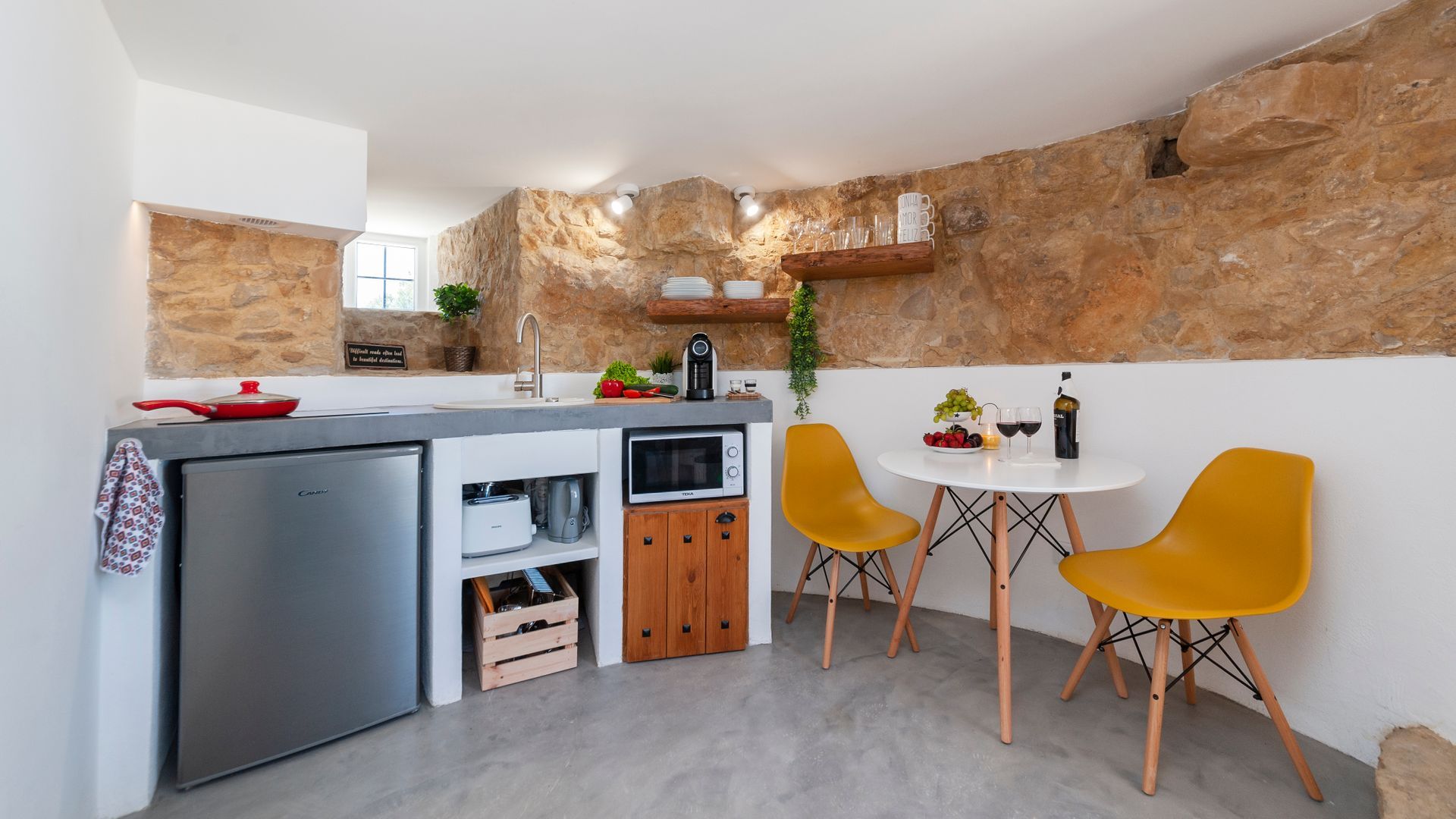 On the ground floor you'll find a little kitchen, with all you'll really need to cook light meals at home, and a bathroom where – somehow – the owners have managed to plumb the tap into part of the building's exposed rock wall itself. Floating stairs carry you up to the living room level, where a third guest could sleep on a comfy sofa bed. And then it's up to the star of the show – the bedroom. With the top of the windmill and all its internal beams as a ceiling, this magical room feels as though its floating on top of the building. And it is, kind of. A narrow window goes right round the whole room, allowing you to see out from every angle.