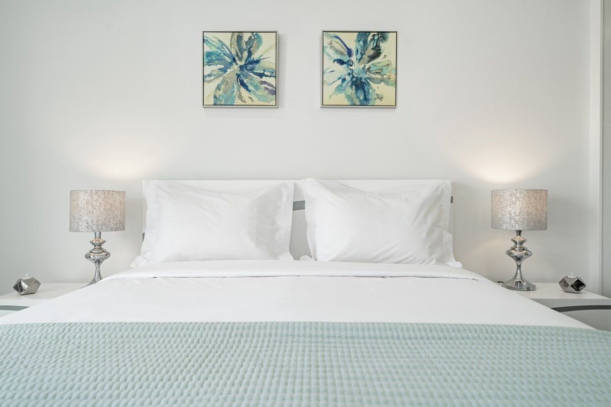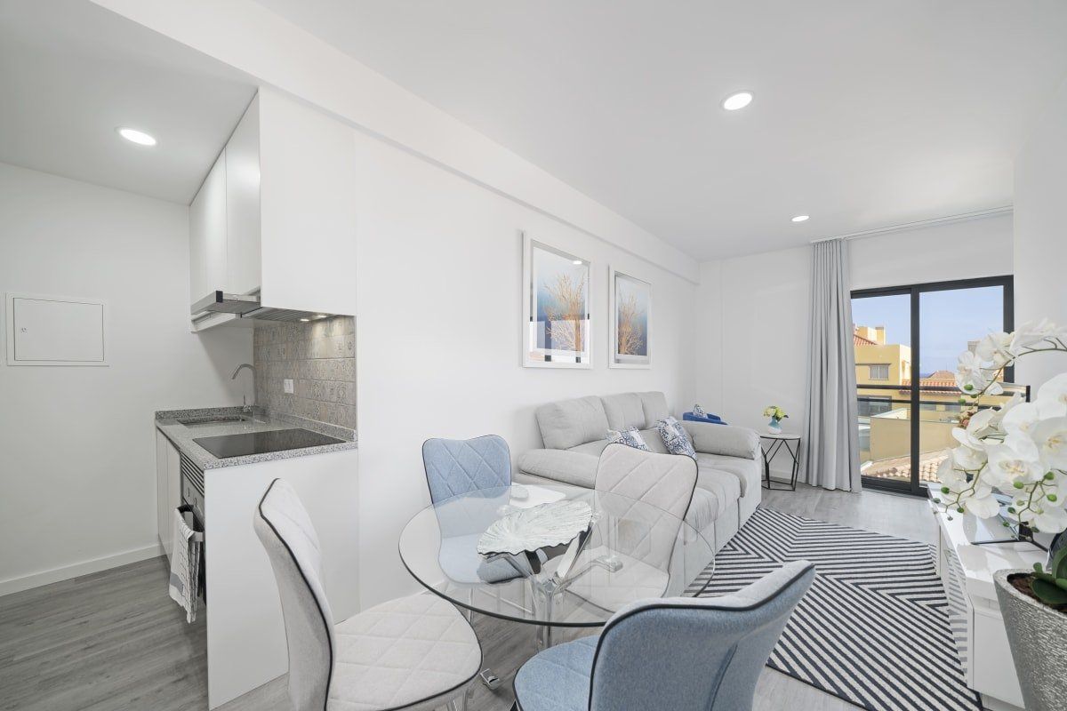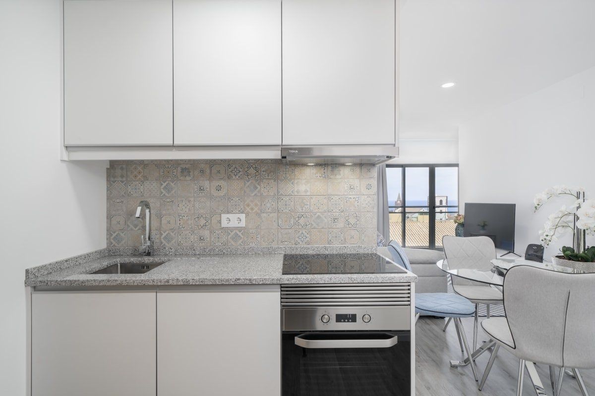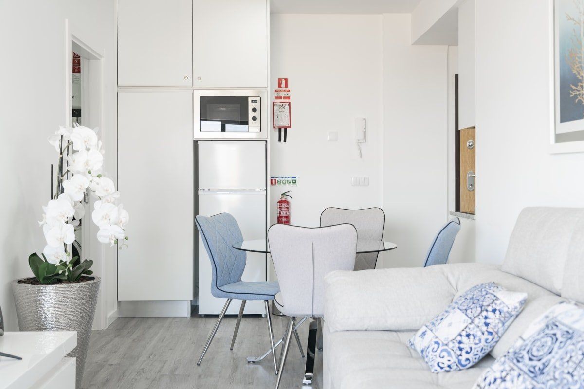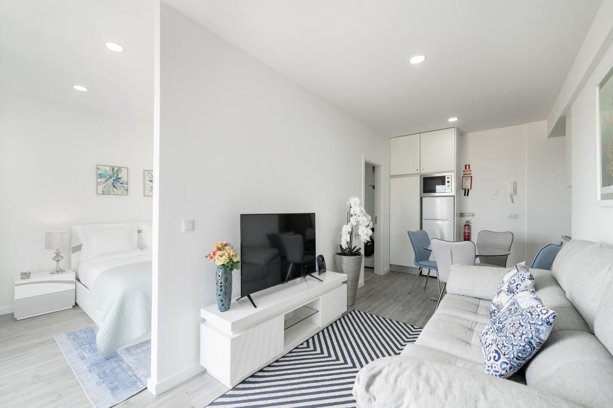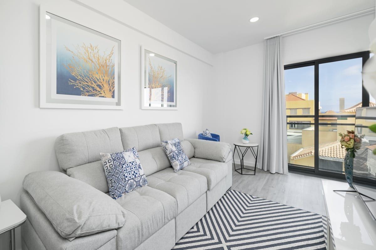 Light and bright, this stylish studio apartment is just the ticket for a Funchal getaway. With its soothing coastal colour palette of blues, greens and greys, this pad radiates laid-back living, and the view of the Cathedral of Funchal from the large window is icing on the cake. Wake up each morning to sunlight streaming into the apartment before tucking into a coffee and a pastry at the snug dining table. Then, head out for a day of sightseeing – you're just a ten-minute walk from Old Town's charming cobblestoned streets, picturesque merchant houses and painted front doors. Pick up some flowers from the Mercado dos Lavradores, stroll along the harbour or take a cable car ride over the city. In the evenings, grab dinner at a local restaurant and sip Poncha – a famous Madeiran drink made with sugar cane rum, honey and lemon – as the sun goes down over the ocean. When your feet are tired from the day's adventures, come home and unwind on the sofa before getting a good night's sleep in the comfortable bed.