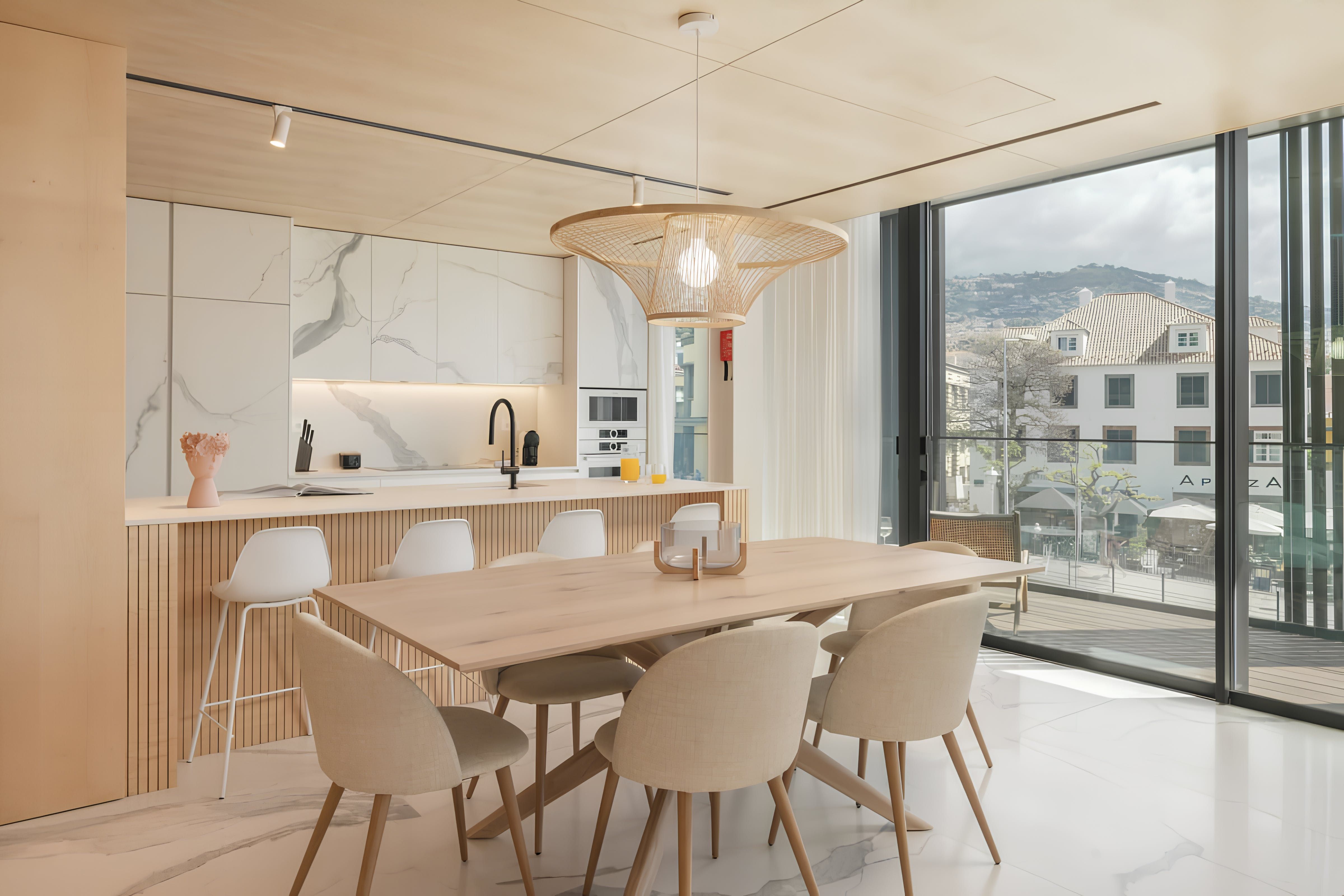 This stunning apartment is the perfect place to stay for a city vacation in Madeira. The apartment is located in the heart of Funchal, just steps from the Mercado dos Lavradores and the lively nightlife. The apartment features three spacious suites, each with a private shower, a living room, dining room, open-space kitchen island, guest toilet and a separate laundry room. The balconies offer captivating views of the city and the rooftop swimming pool offers a relaxing place to soak up the sun.